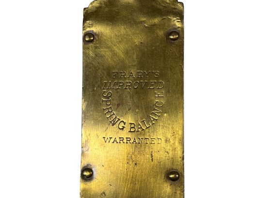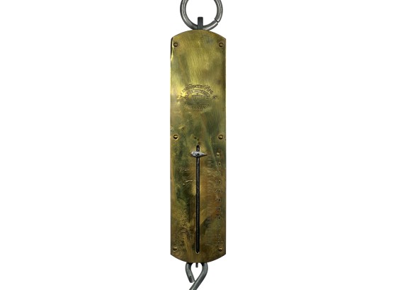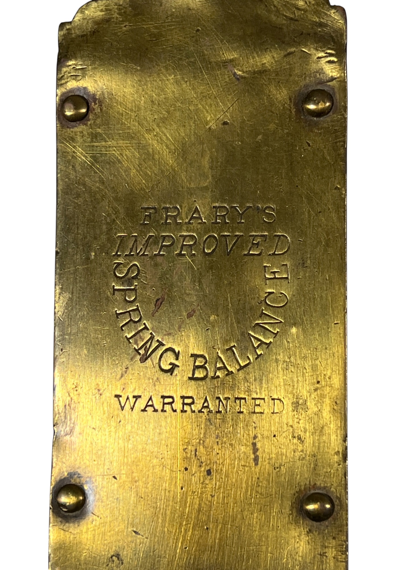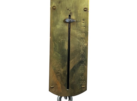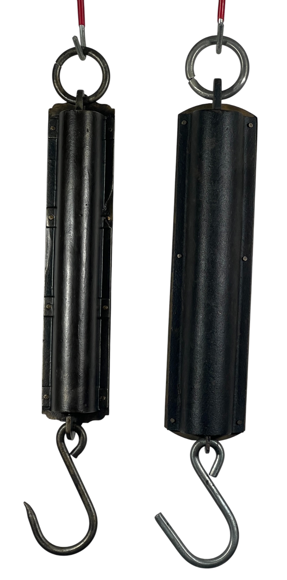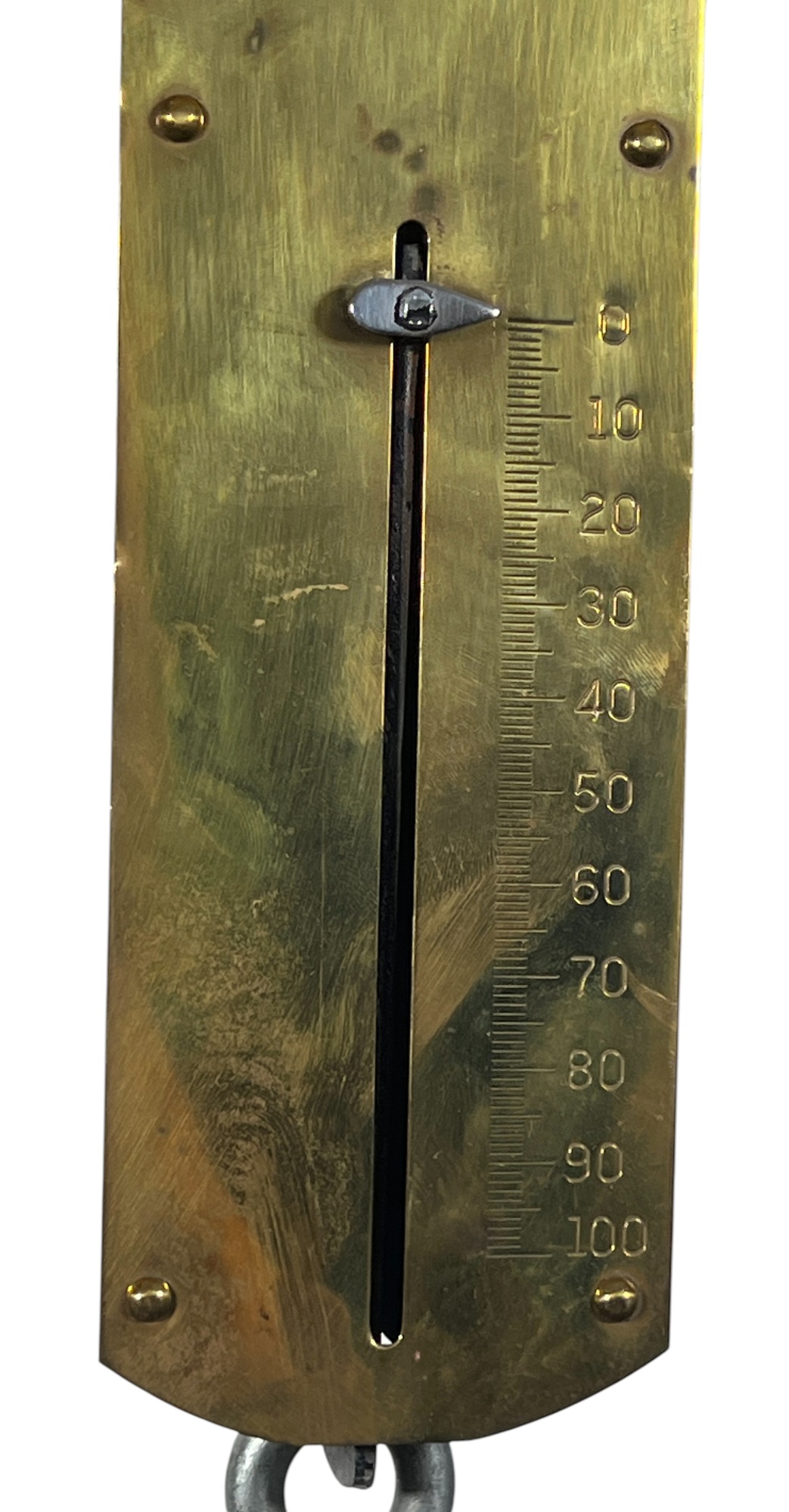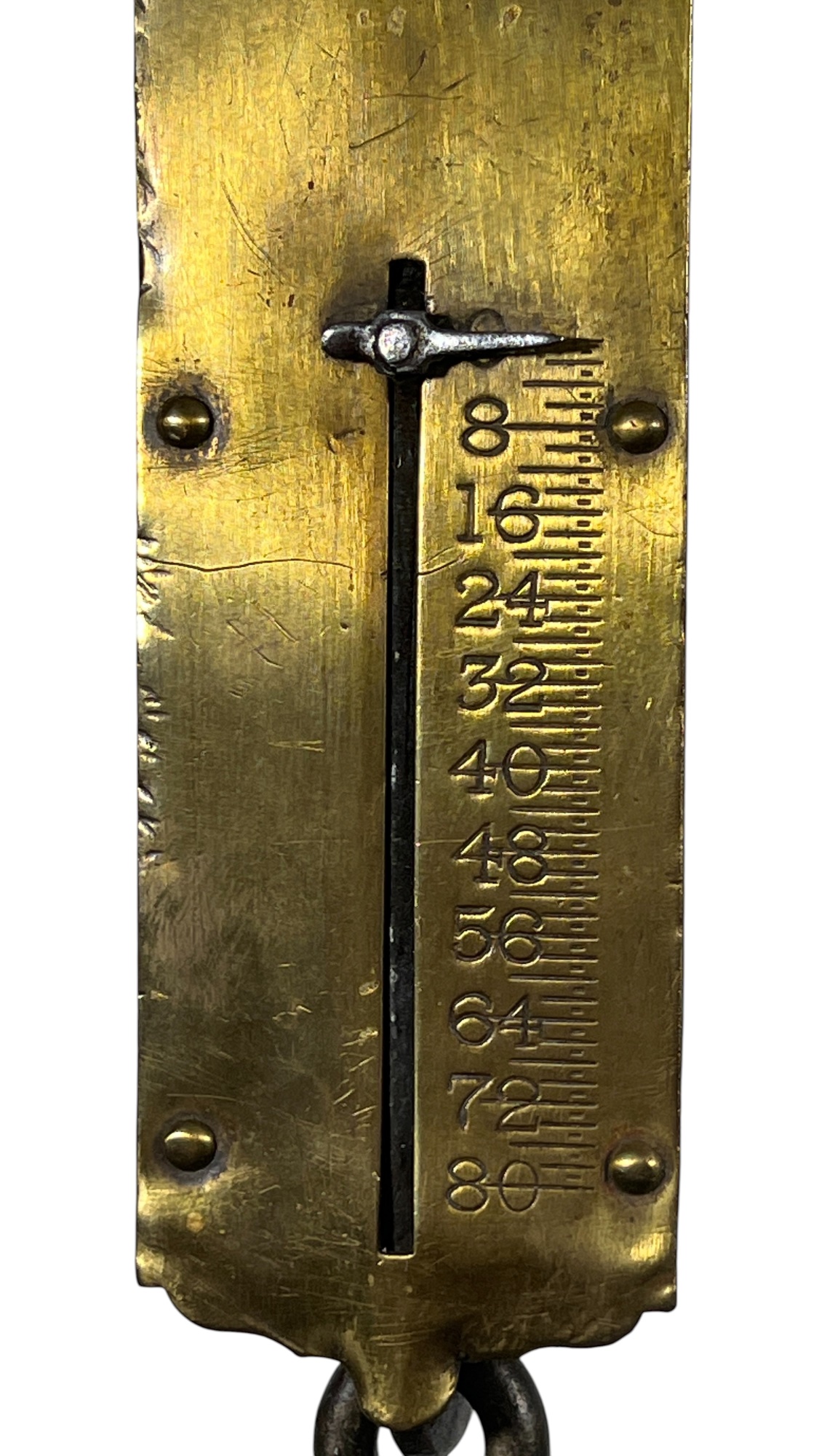 Frary's (80) pound brass & iron spring scale and Penn Scale Mfg. (100) pound brass & iron spring scale. 17 1/2 x 2 3/4 inches. Condition: Good. Temp No 8814