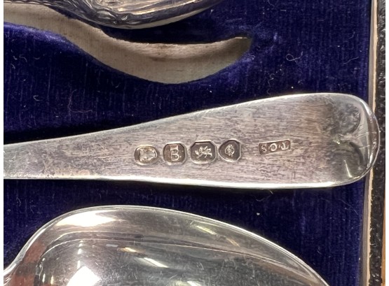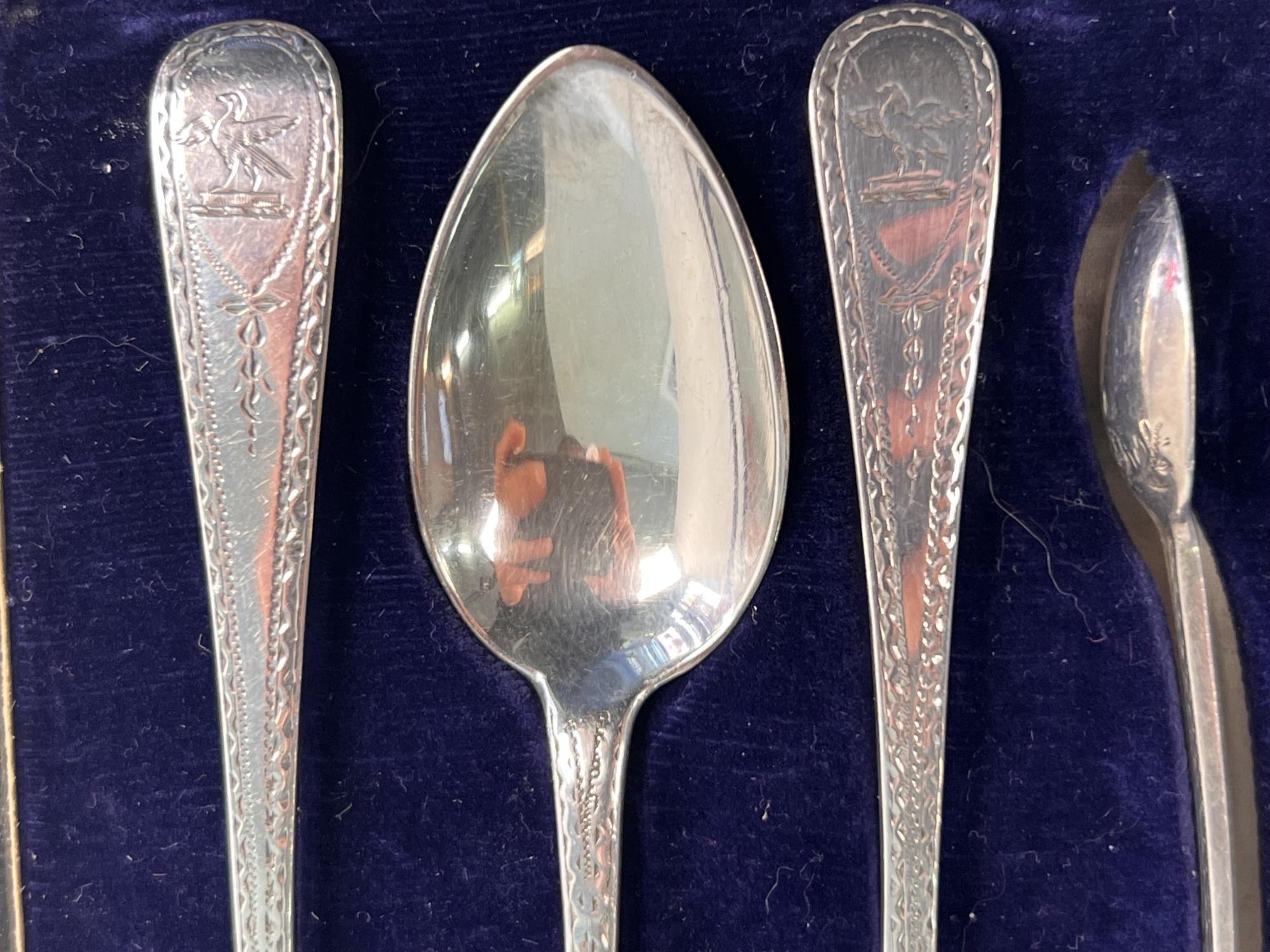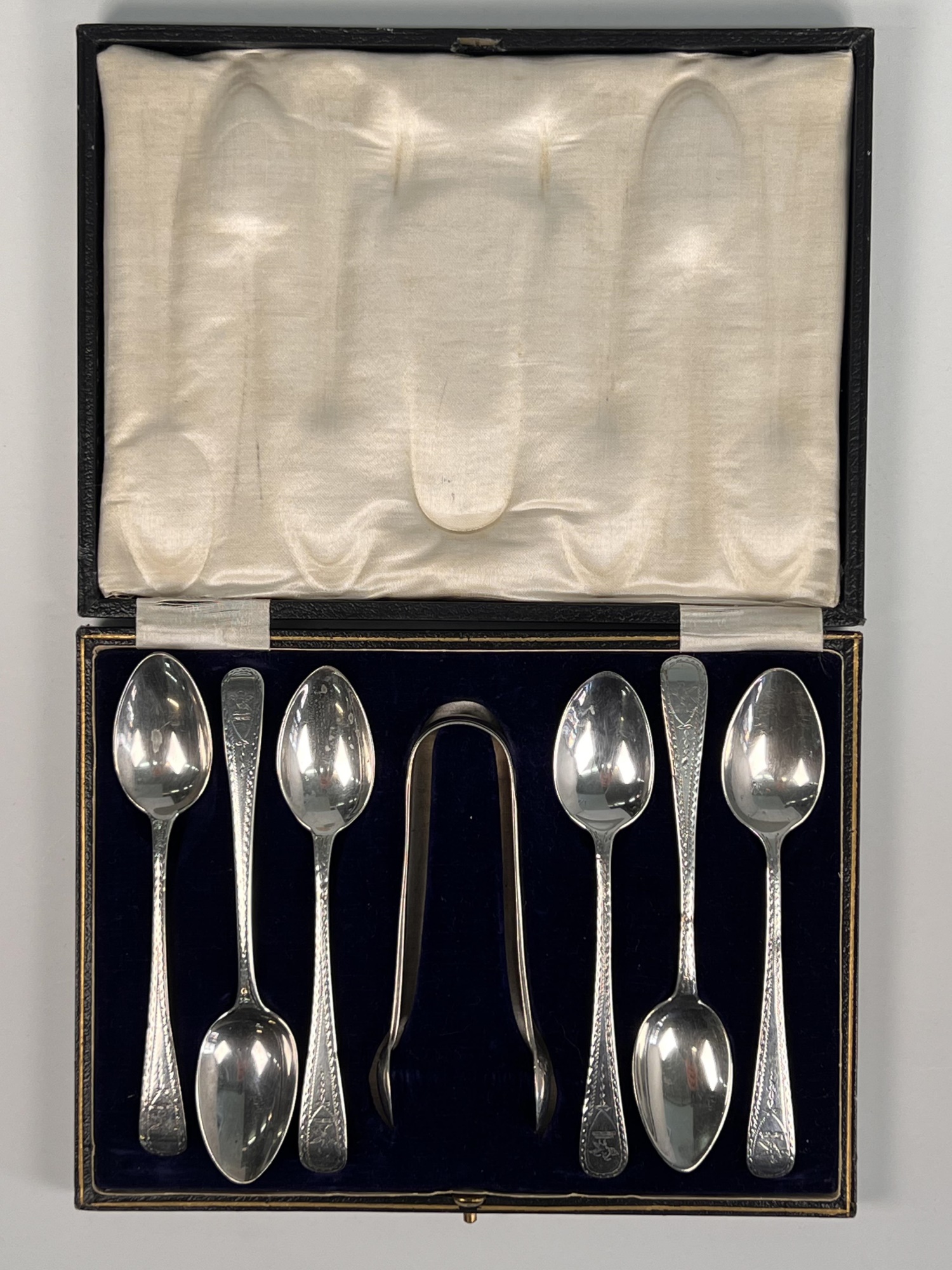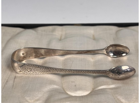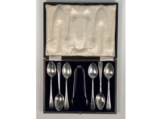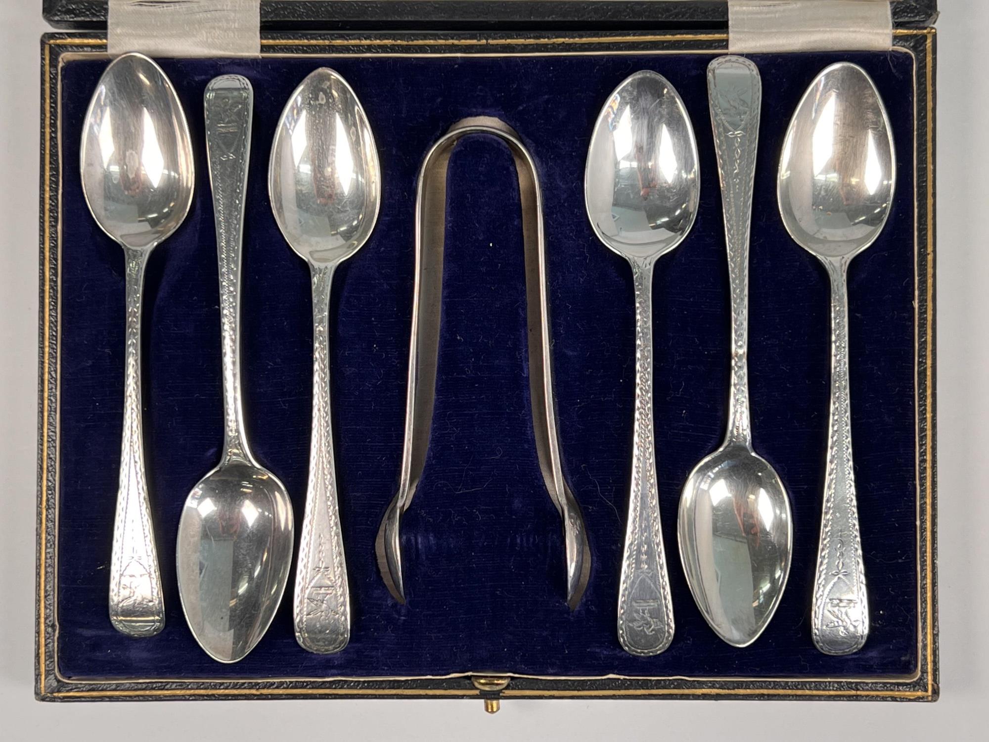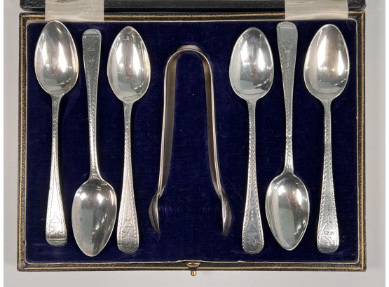 Cased set of (6) (19th c) English sterling silver tea spoons and matching tongs. Spoons 5 3/8" long. 3.91 OZT