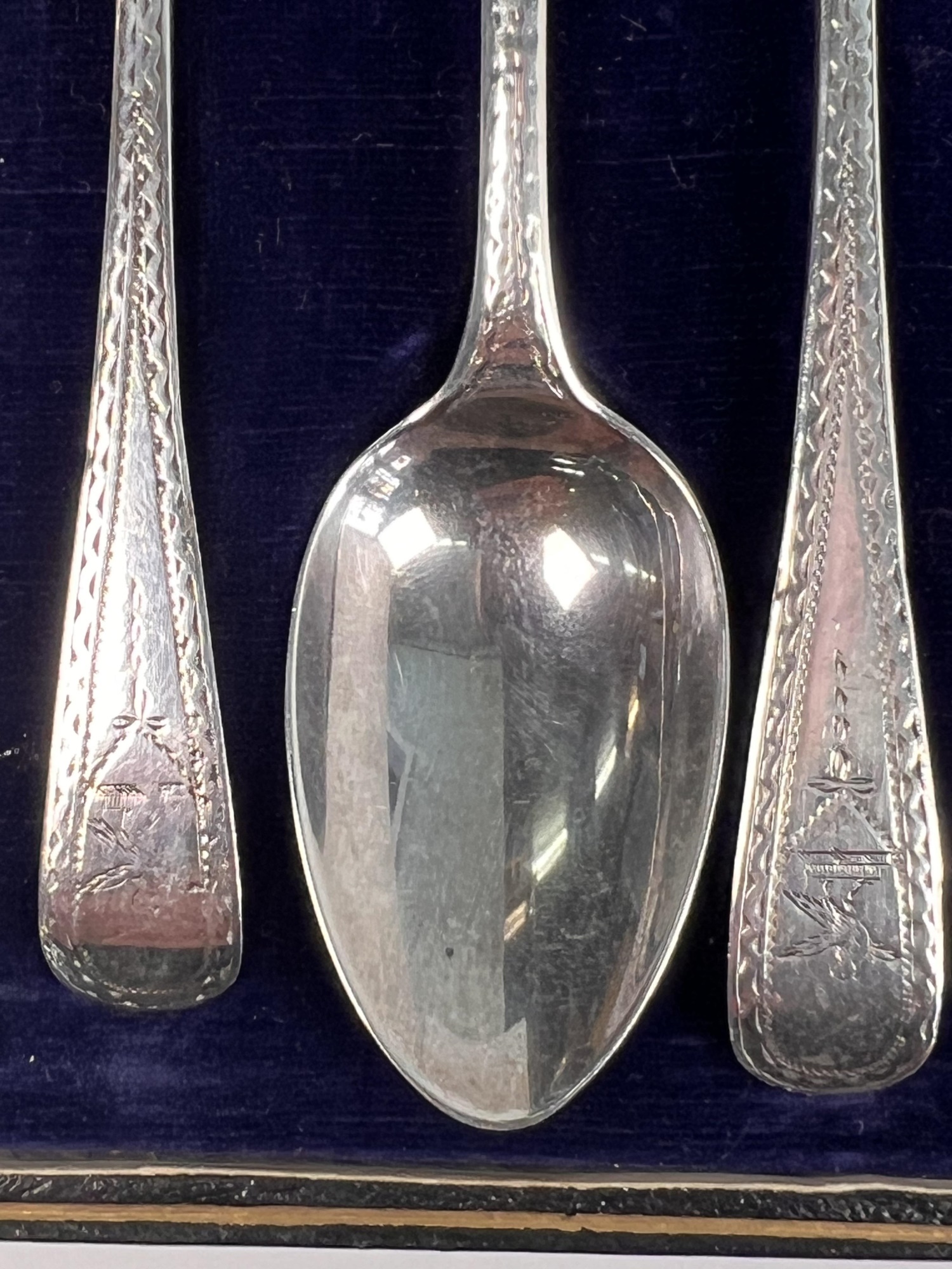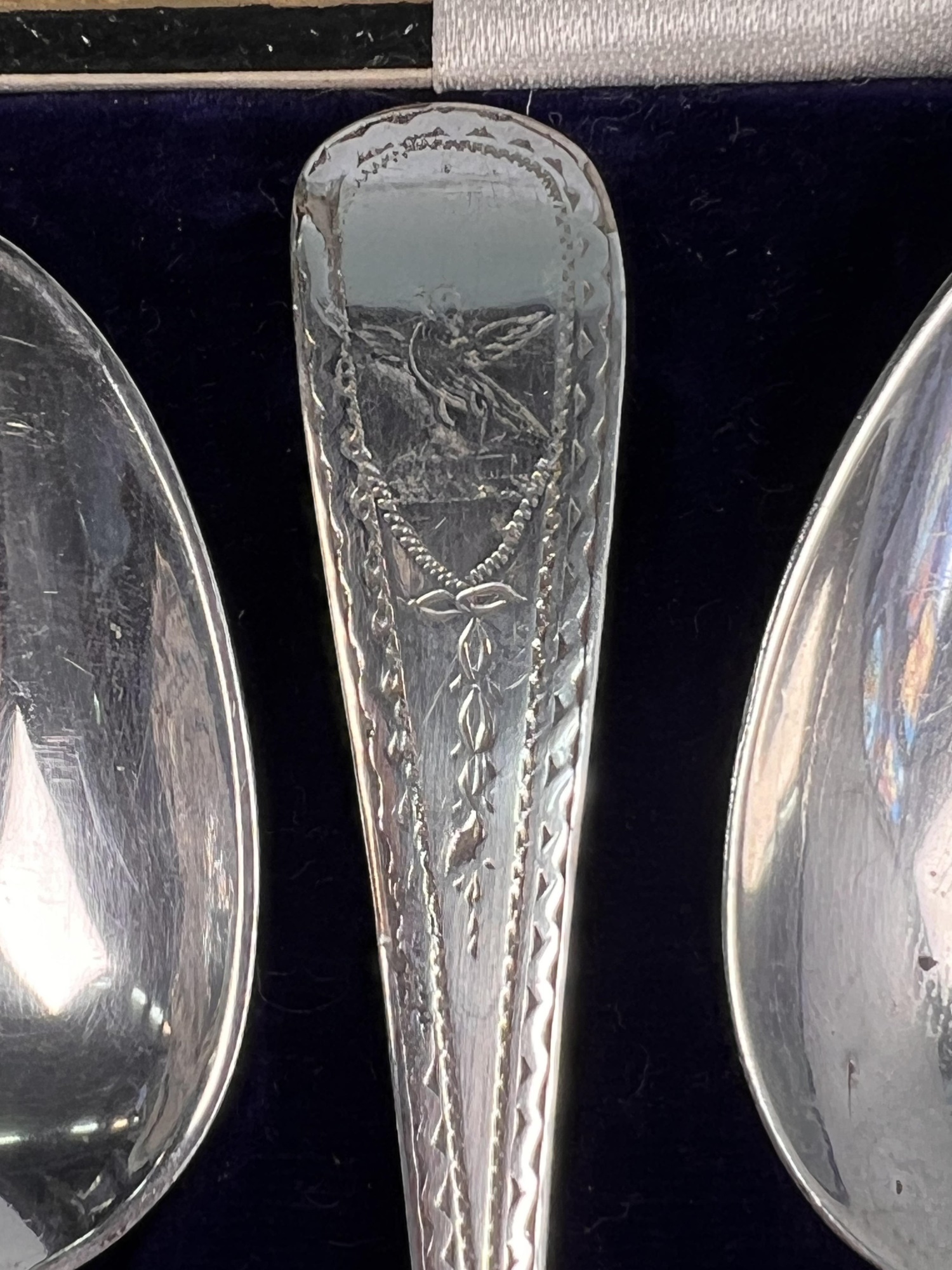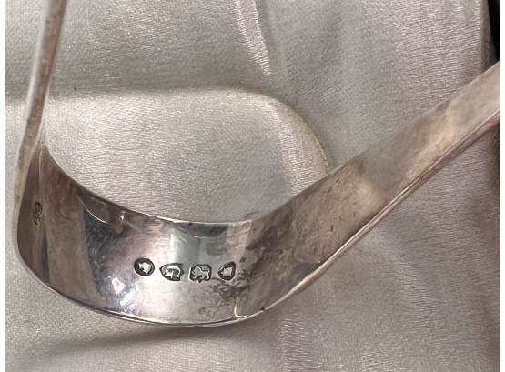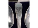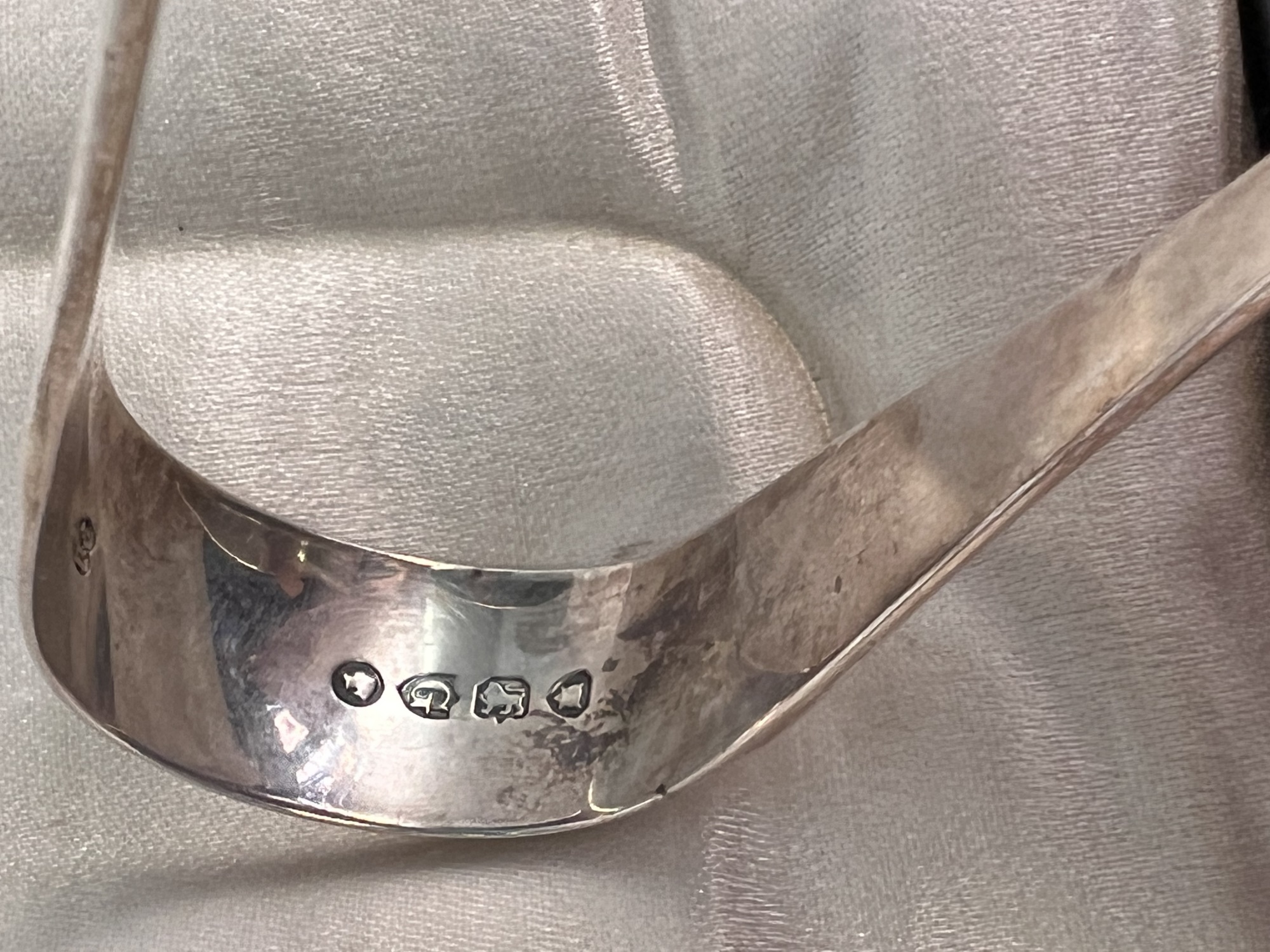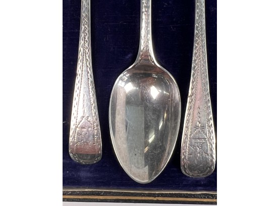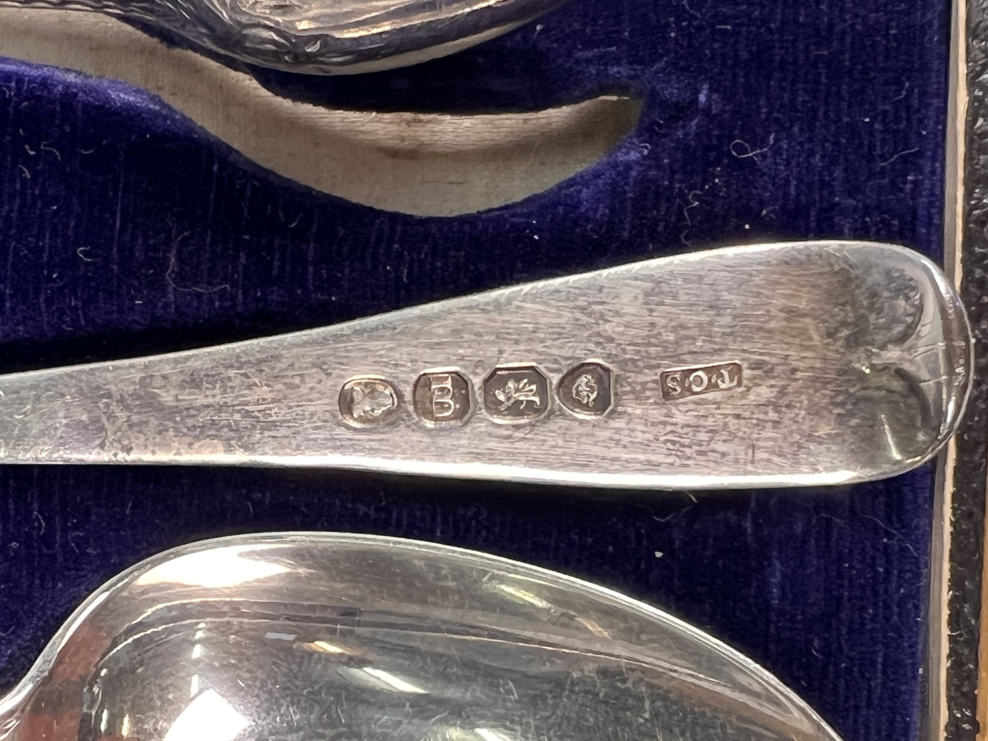 Cased set of (6) (19th c) English sterling silver tea spoons and matching tongs. Spoons 5 3/8" long. 3.91 OZT