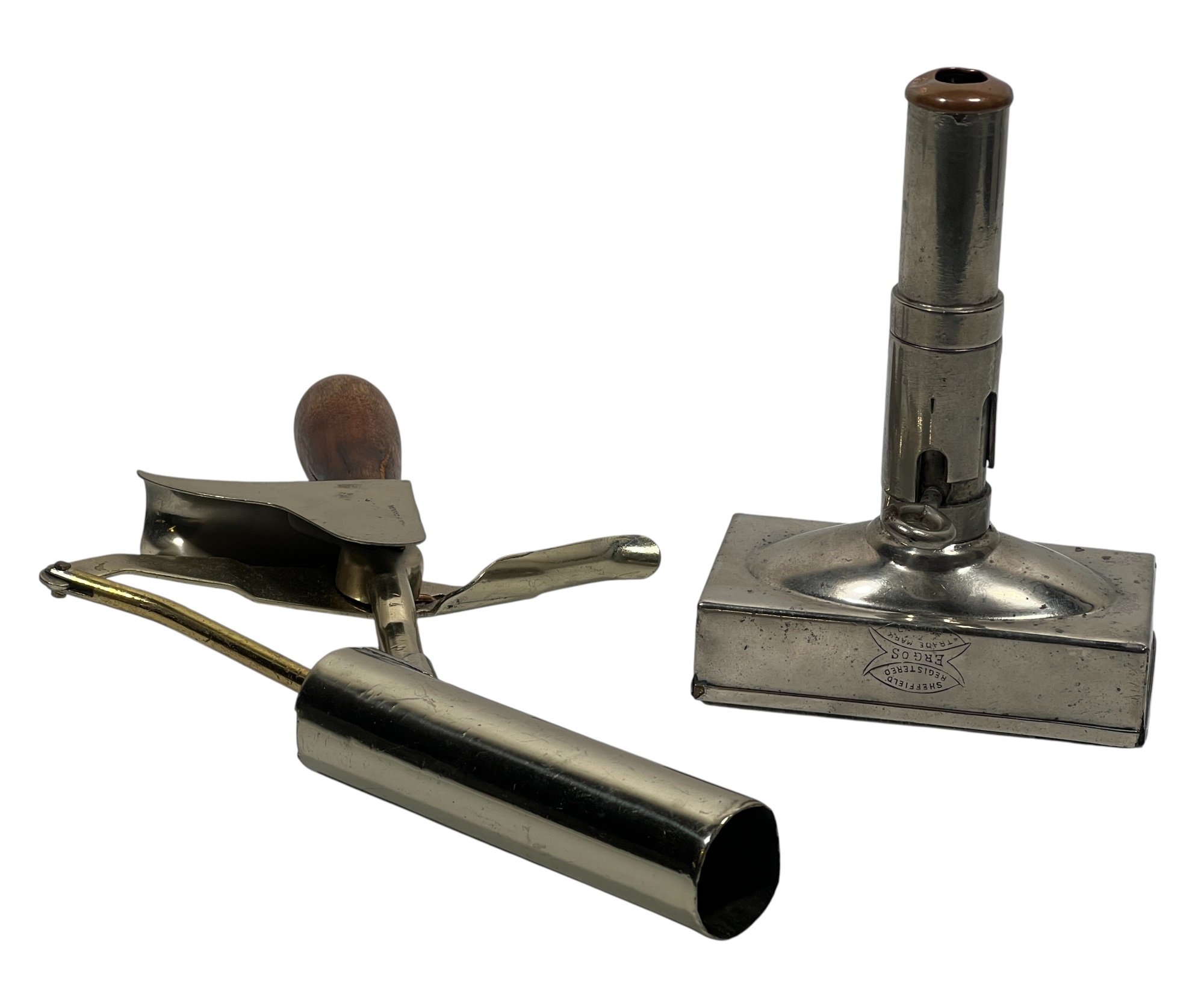 Ergos silver plate ice cream wafer maker along with an ice cream plunger scoop. 5 1/4 x 3 3/4 x 1 1/2 inches. Condition: Good. Temp No 8710