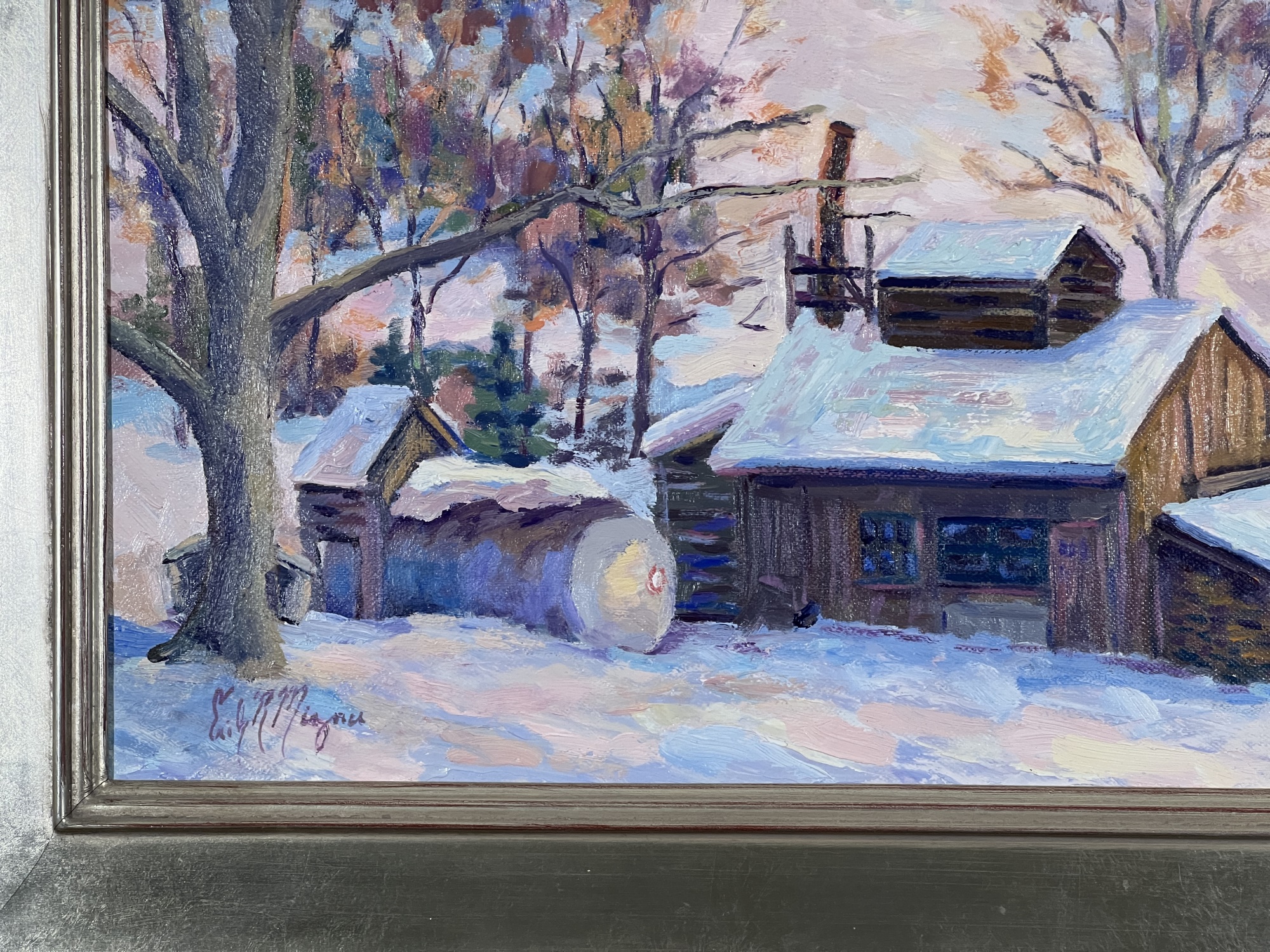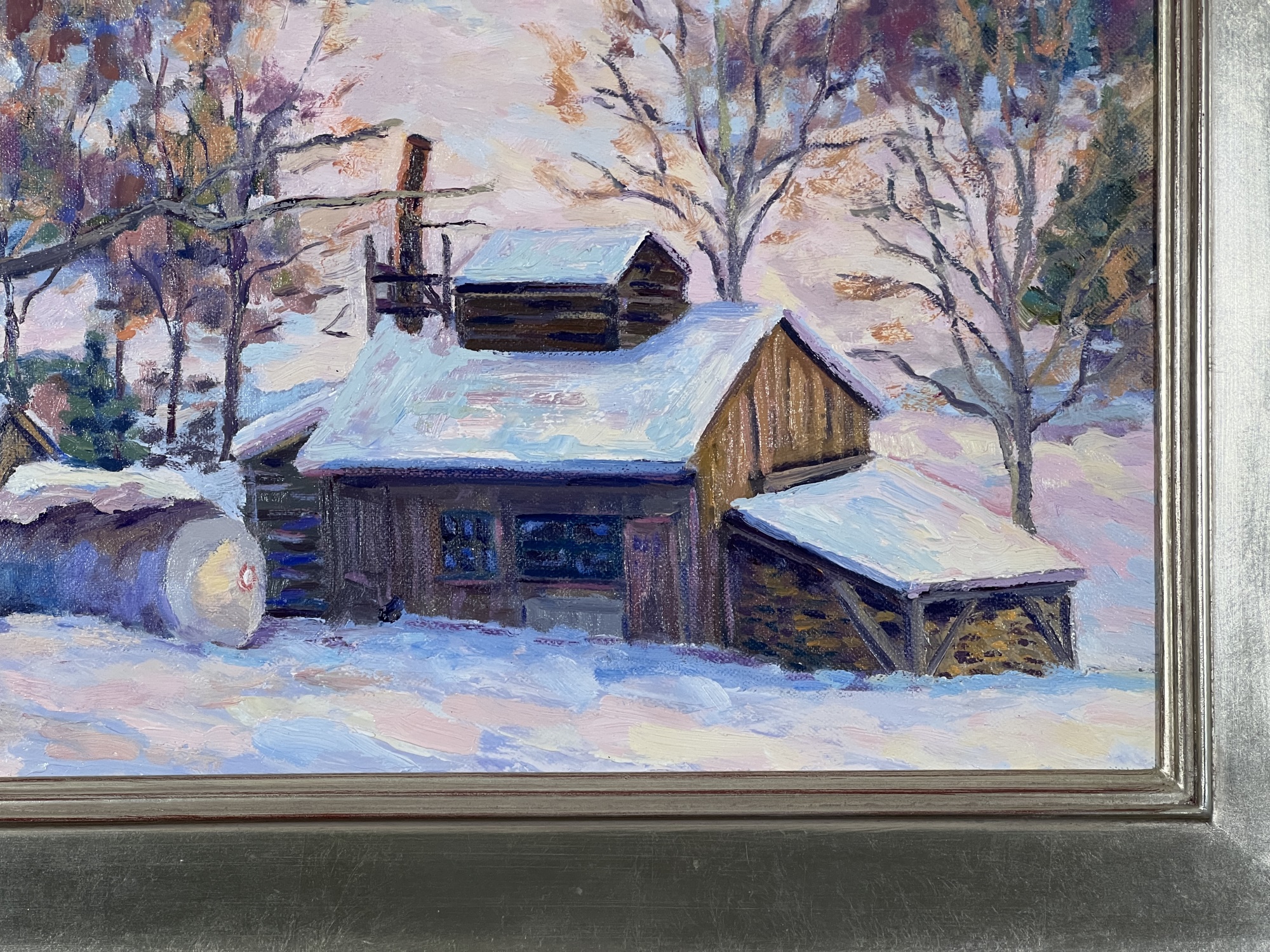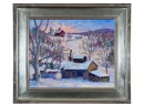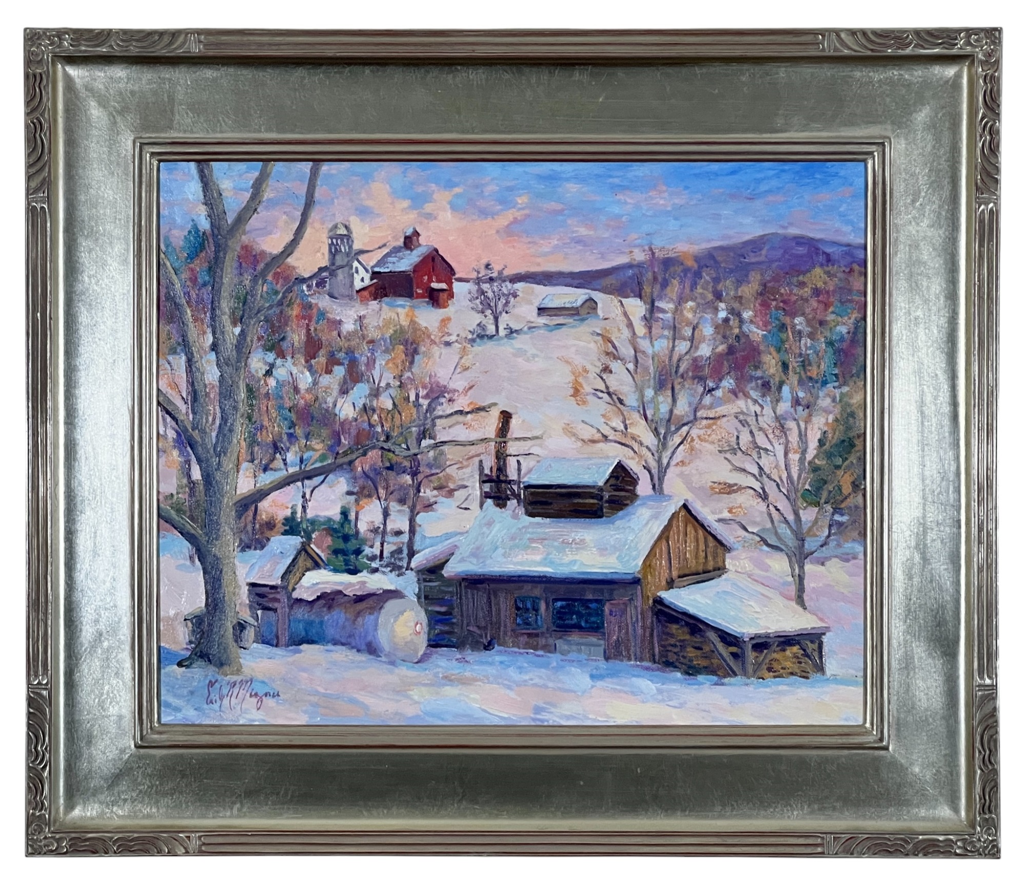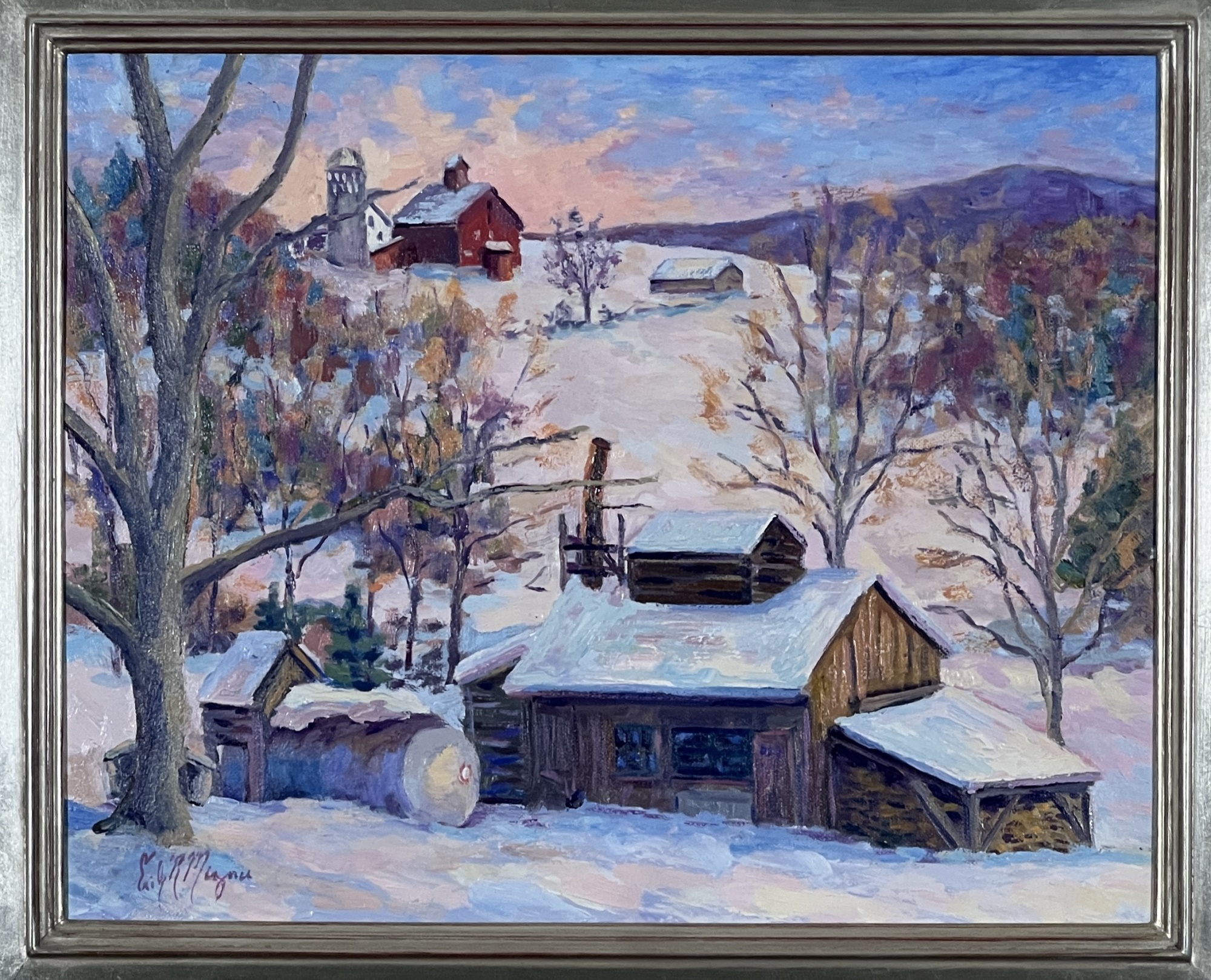 "Waiting for the Sap - Fletcher, VT", oil on canvas 16 x 20 inches, signed lower left, titled & signed second time verso, housed in a nice carved & silver gilt frame. 22 3/4 x 26 3/4 inches overall. Condition: Good.