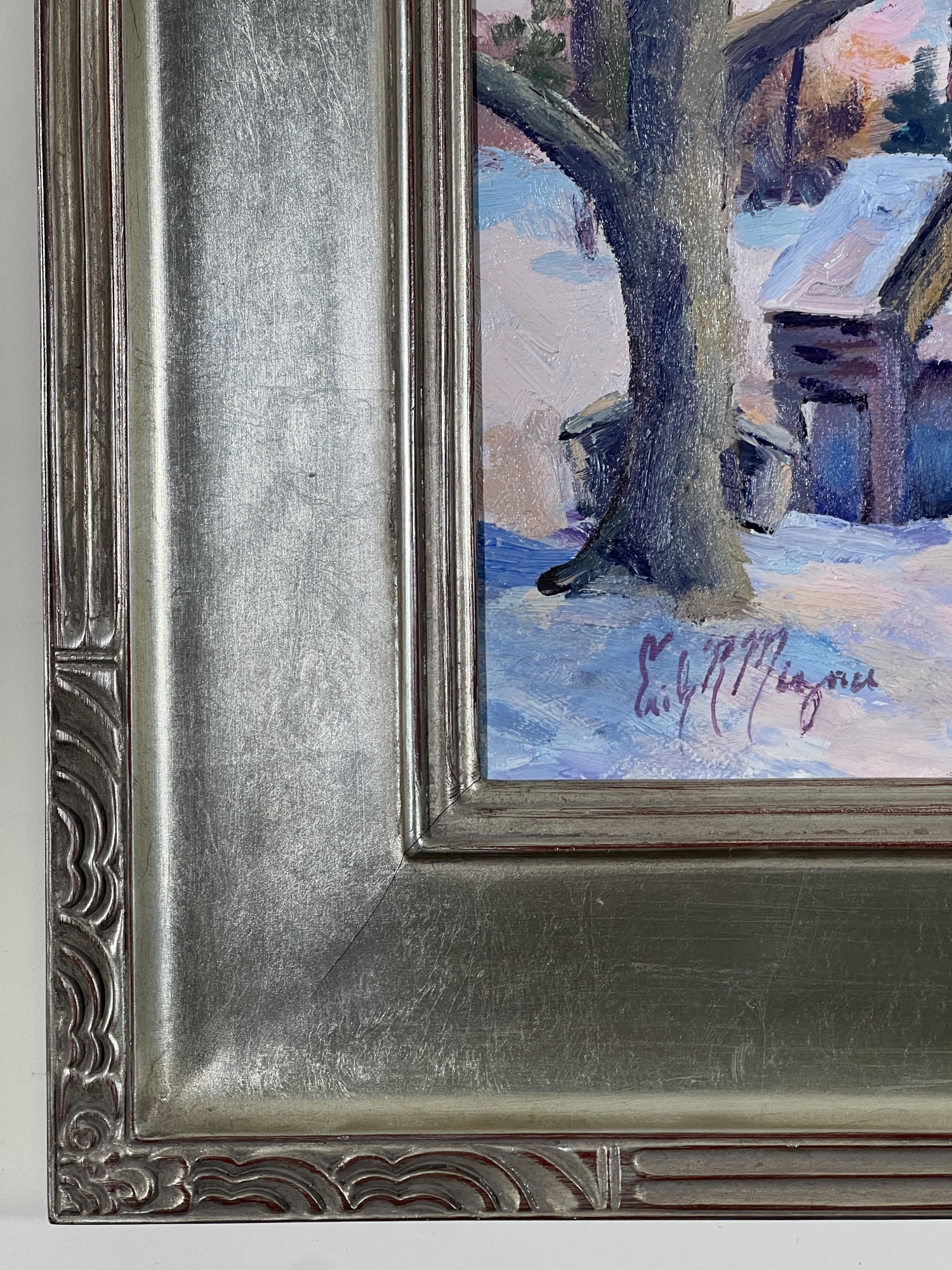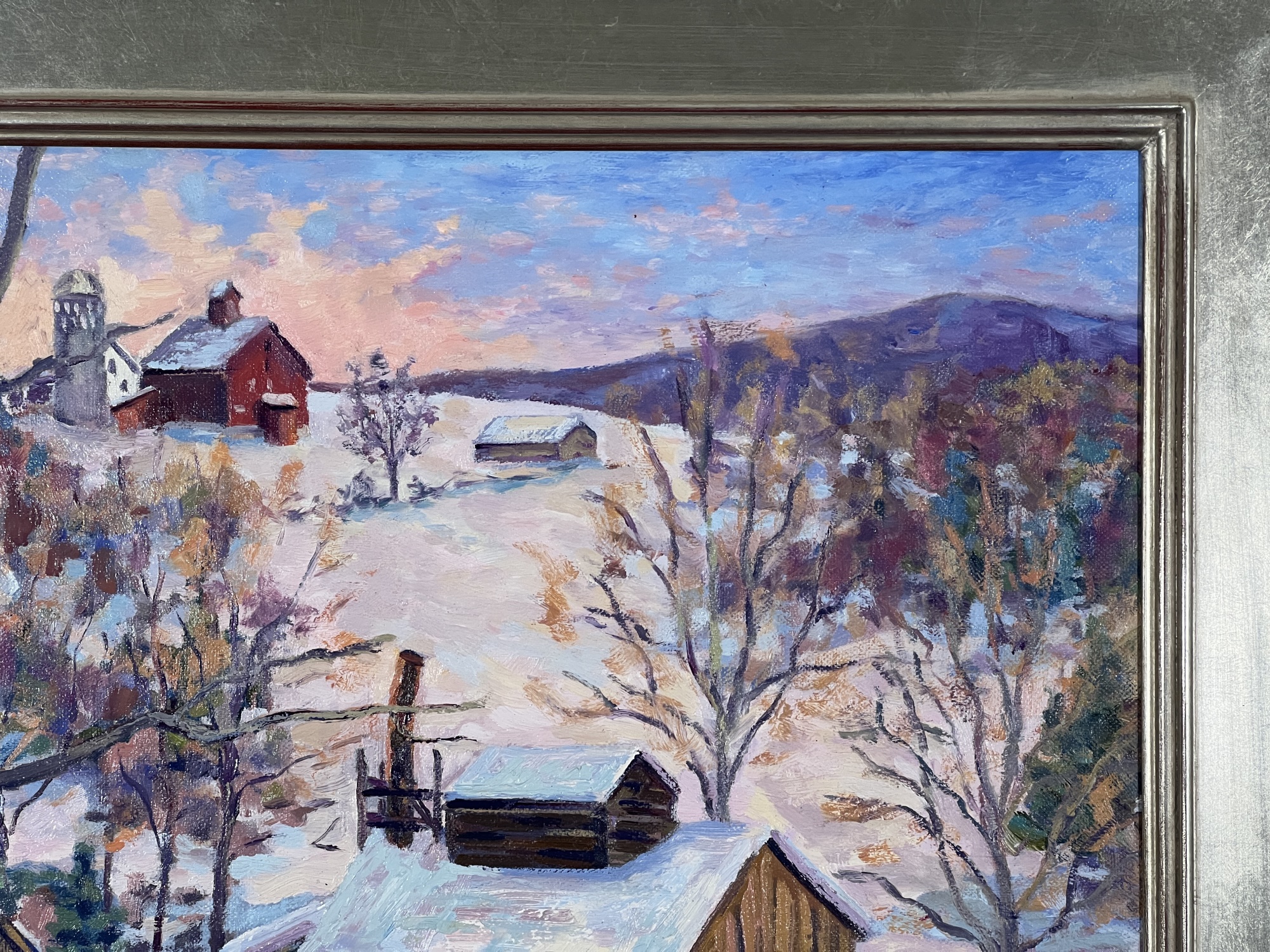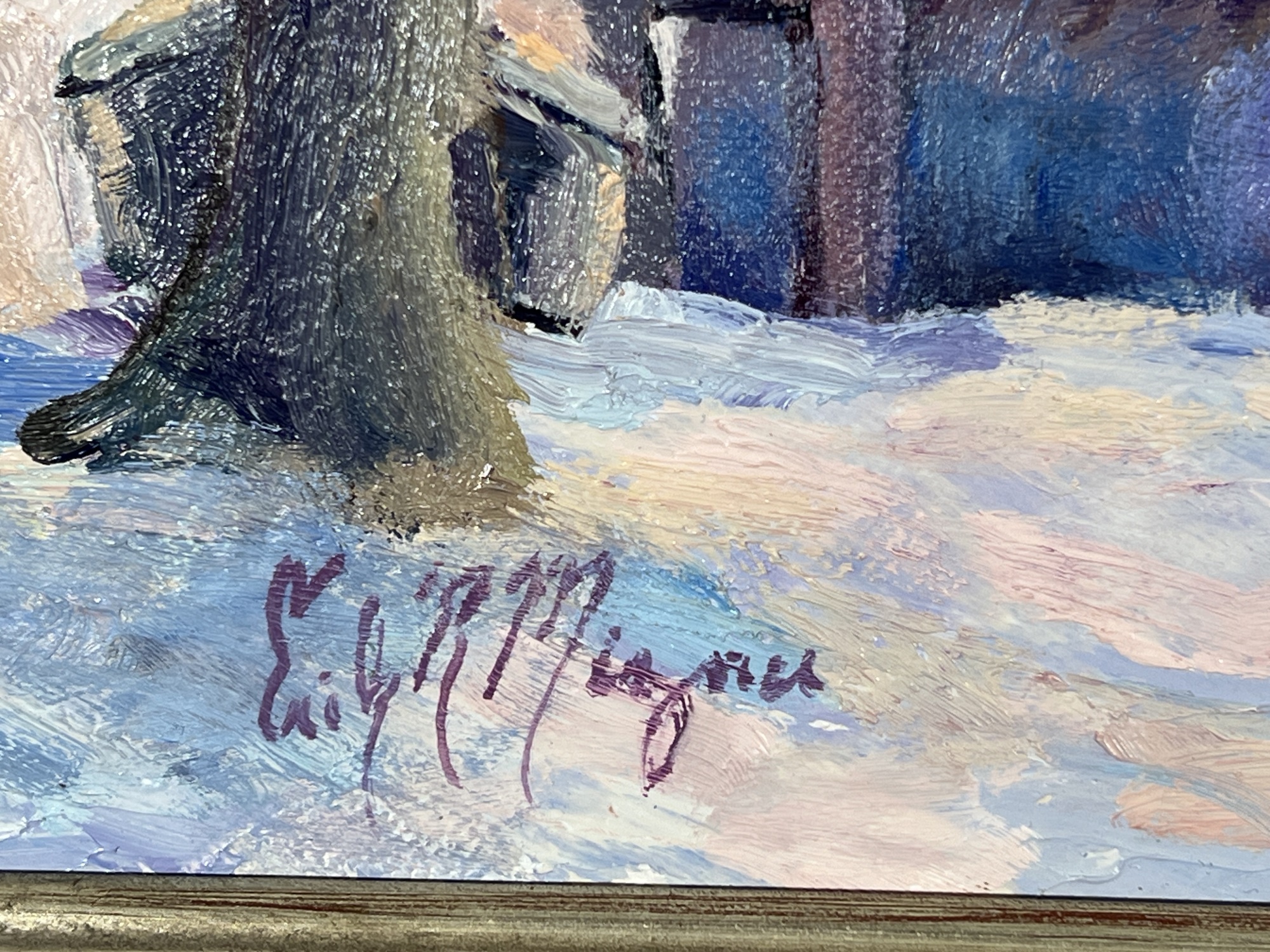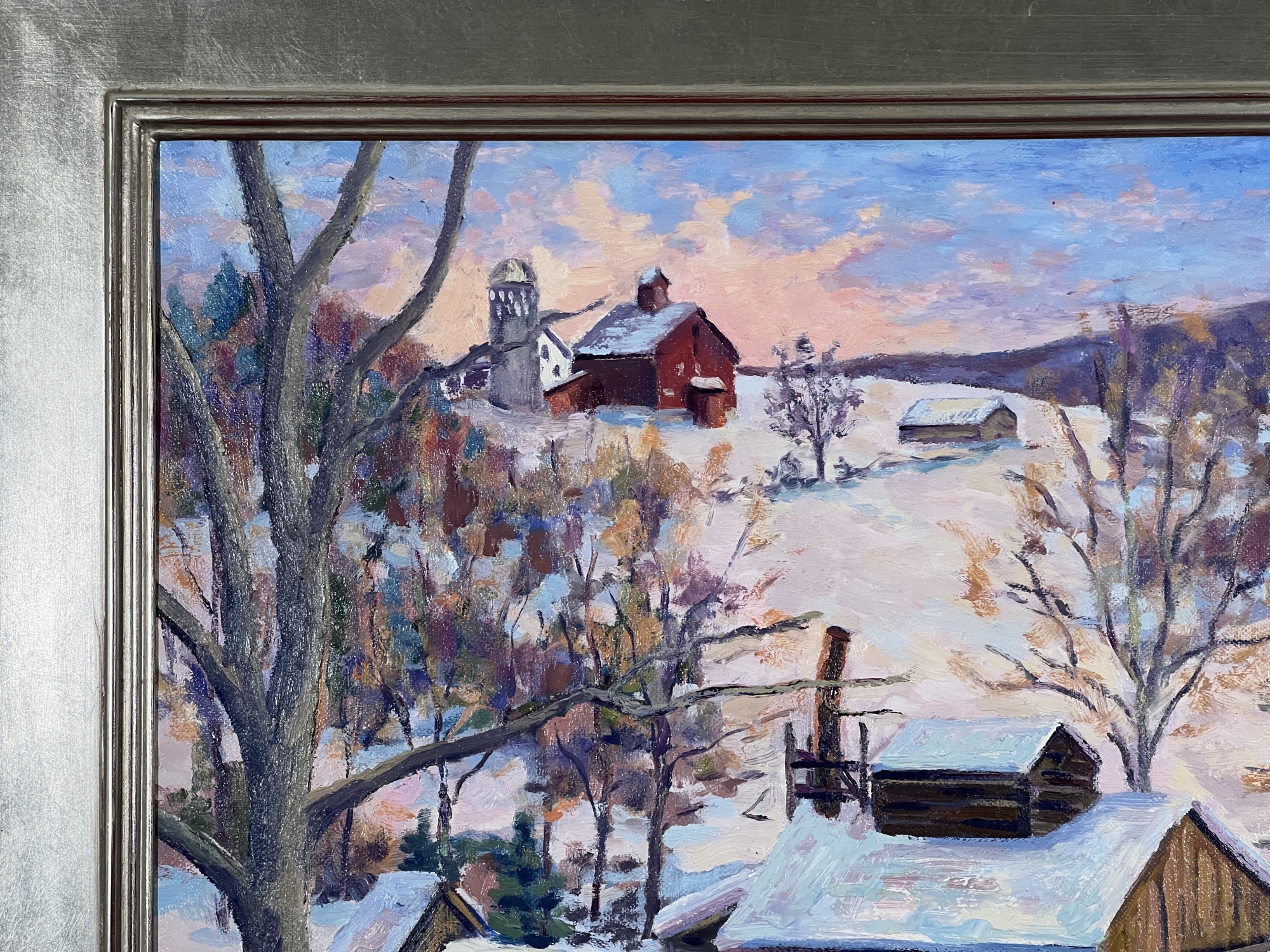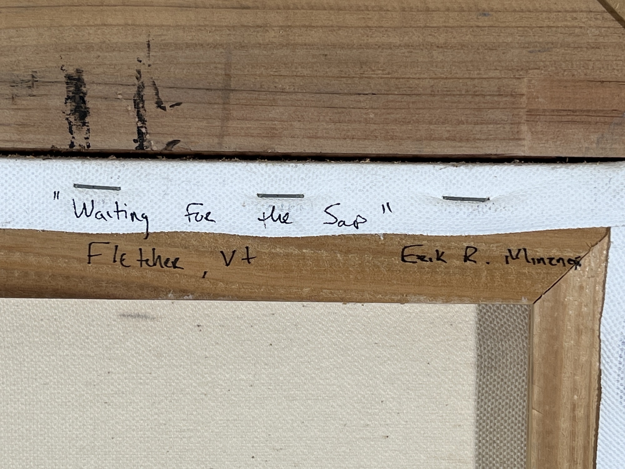 "Waiting for the Sap - Fletcher, VT", oil on canvas 16 x 20 inches, signed lower left, titled & signed second time verso, housed in a nice carved & silver gilt frame. 22 3/4 x 26 3/4 inches overall. Condition: Good.
