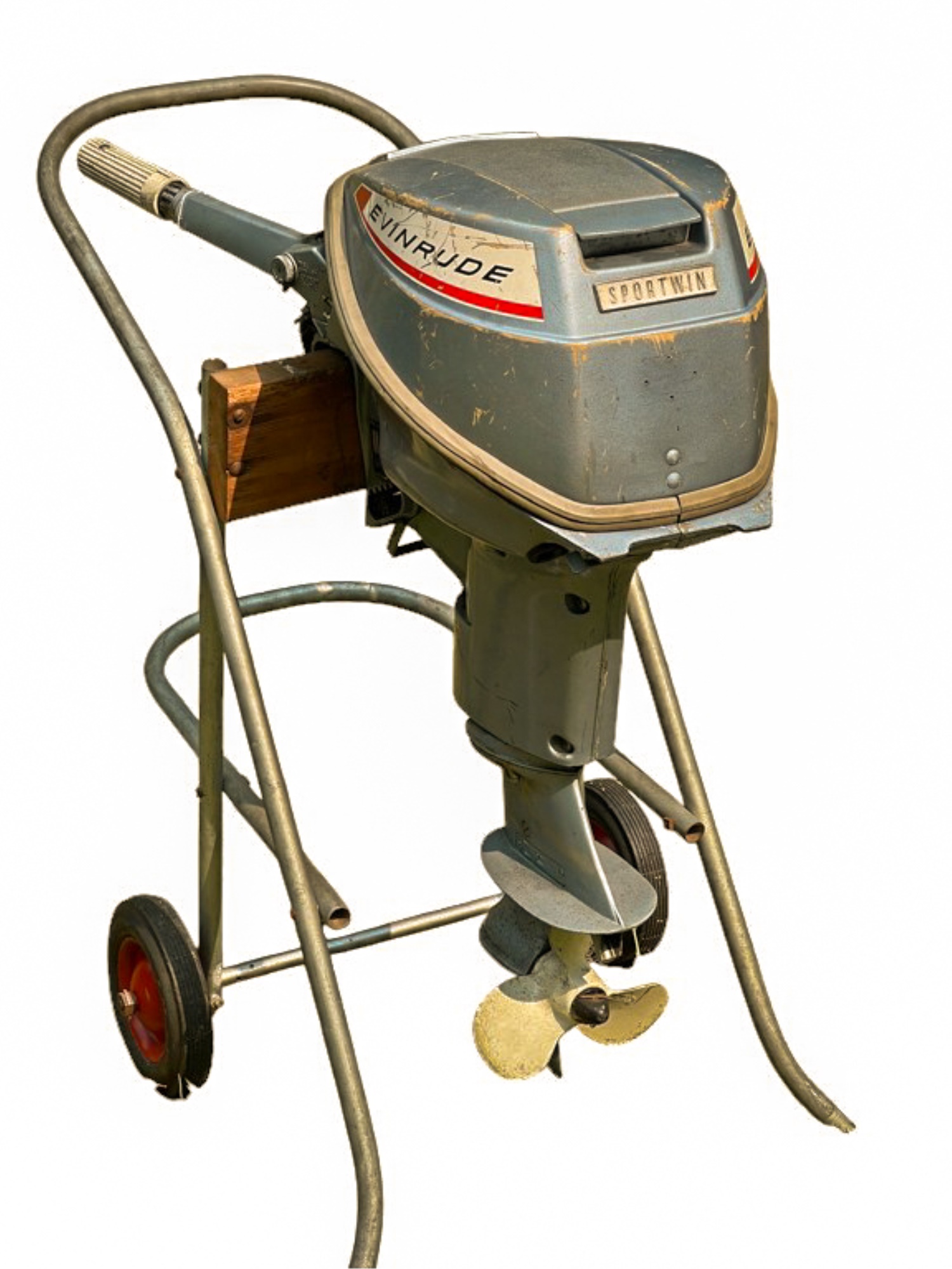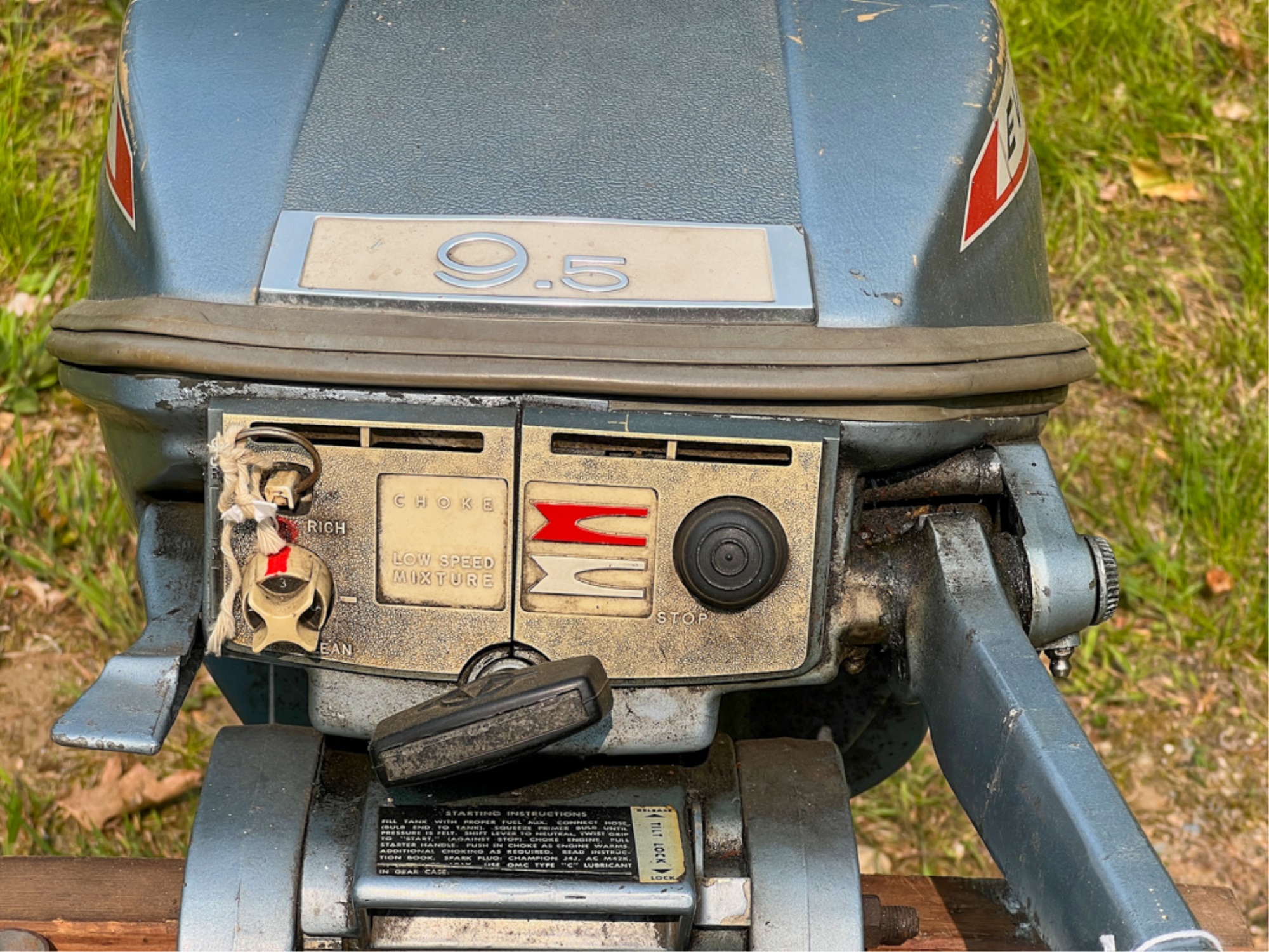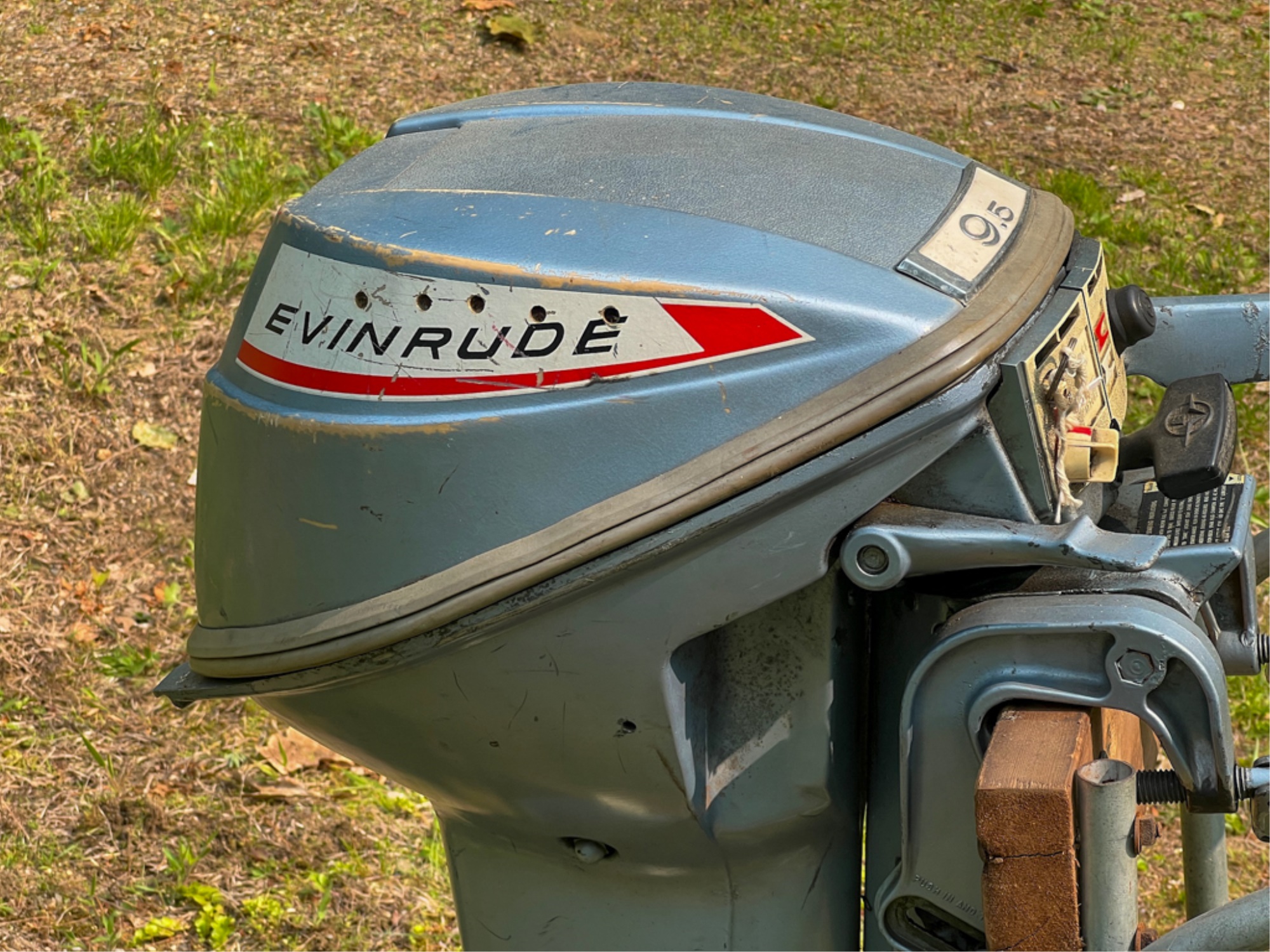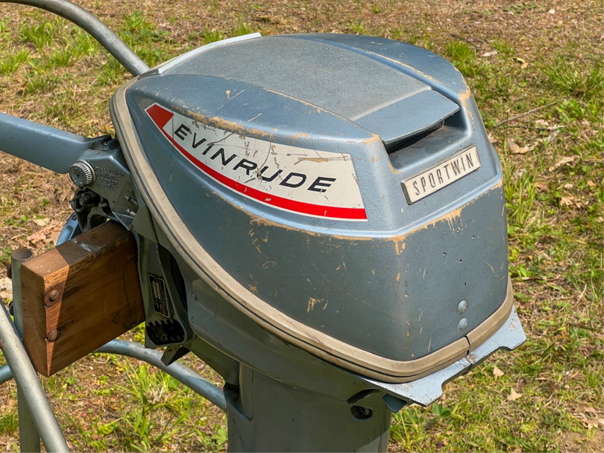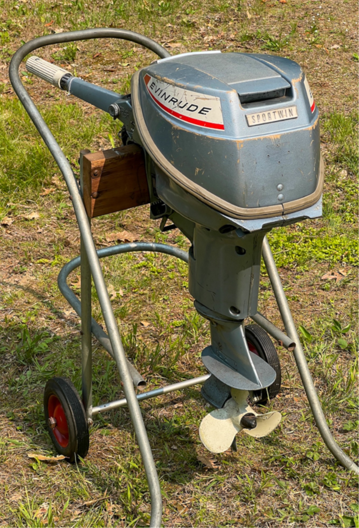 Evinrude "Sporttwin" 9.5 HP outboard motor model no. 9722B. 35 x 13 x 26 inches. Condition: Untested, maintained, & stored in a dry, enclosed shed. Temp No 4089