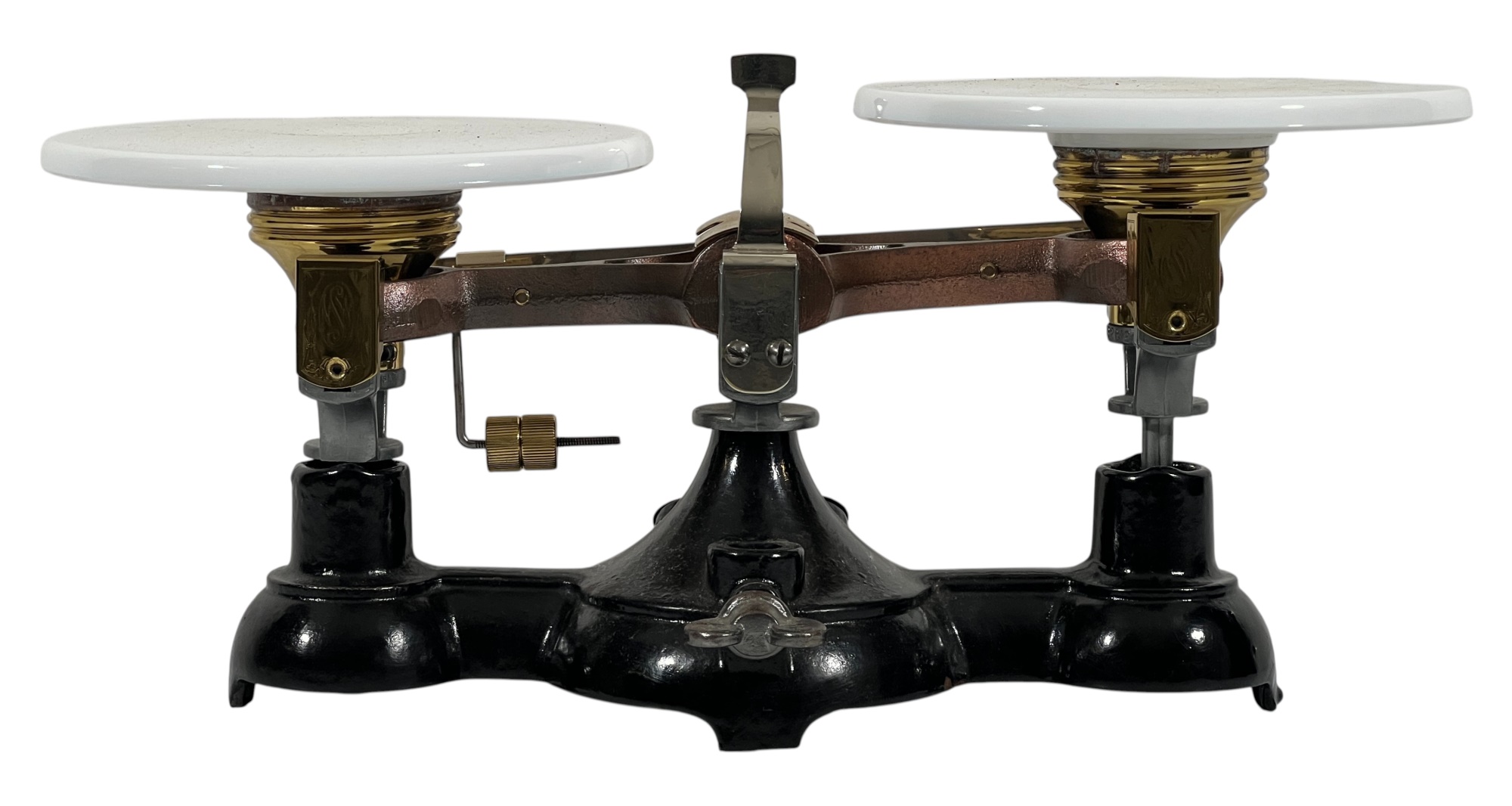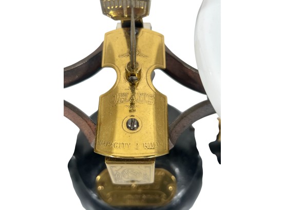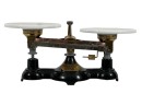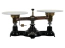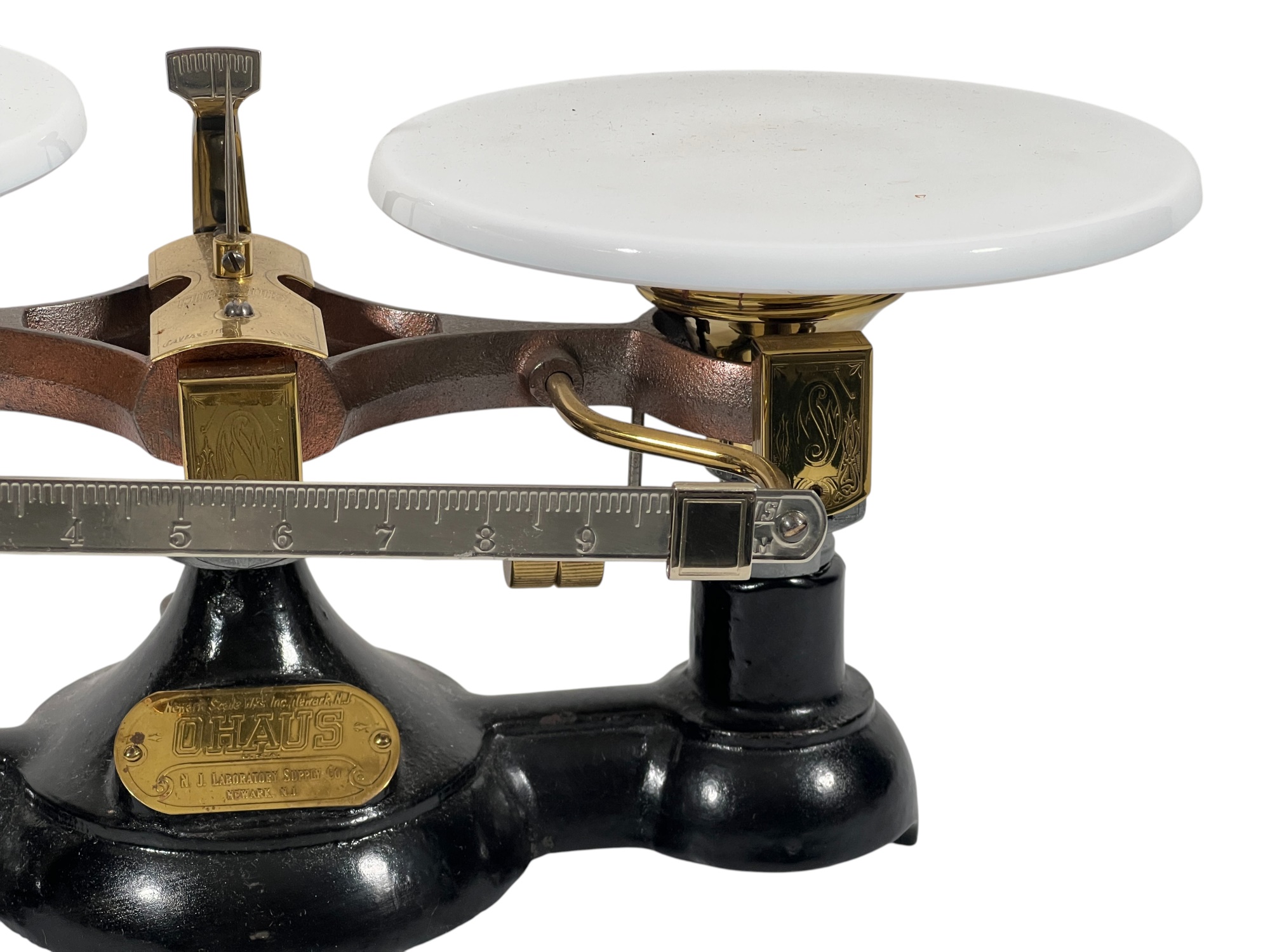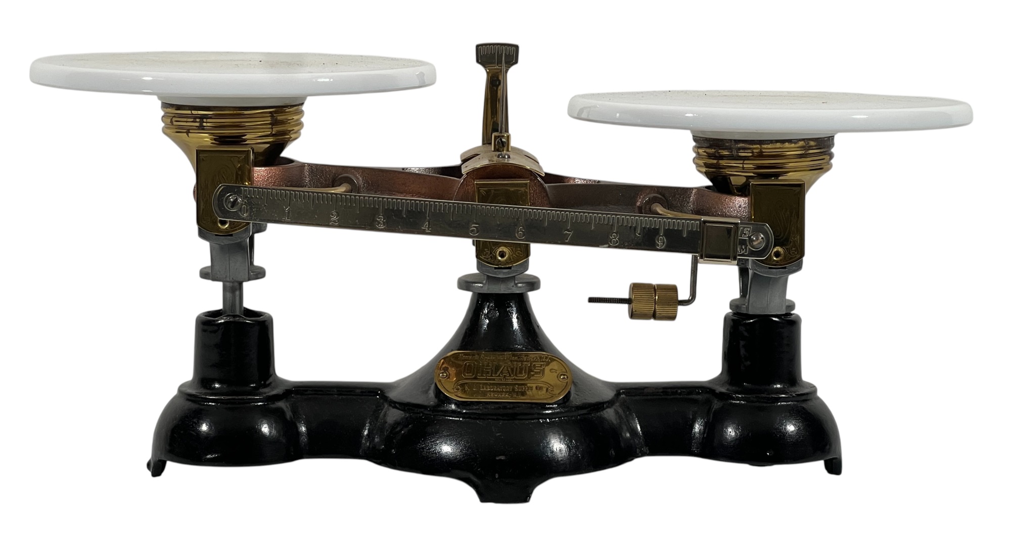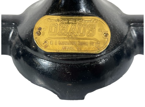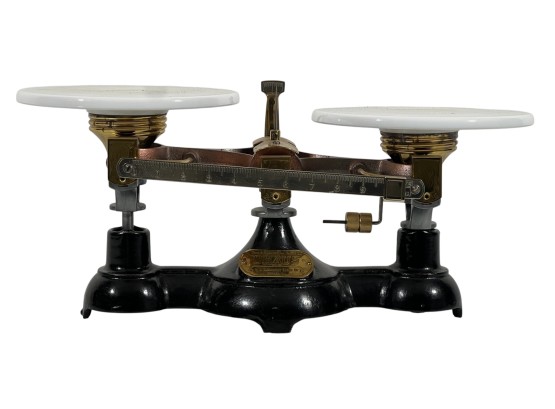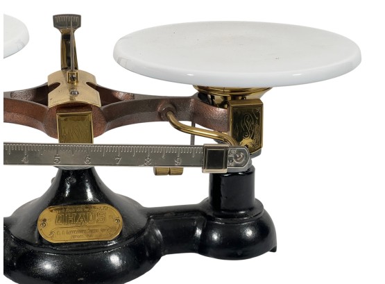 Newark Scale Works "Ohaus" apothecary balance scale with cast iron base, brass hardware, and porcelain trays. 6 x 14 x 6 inches. Condition: Good. Temp No 8831