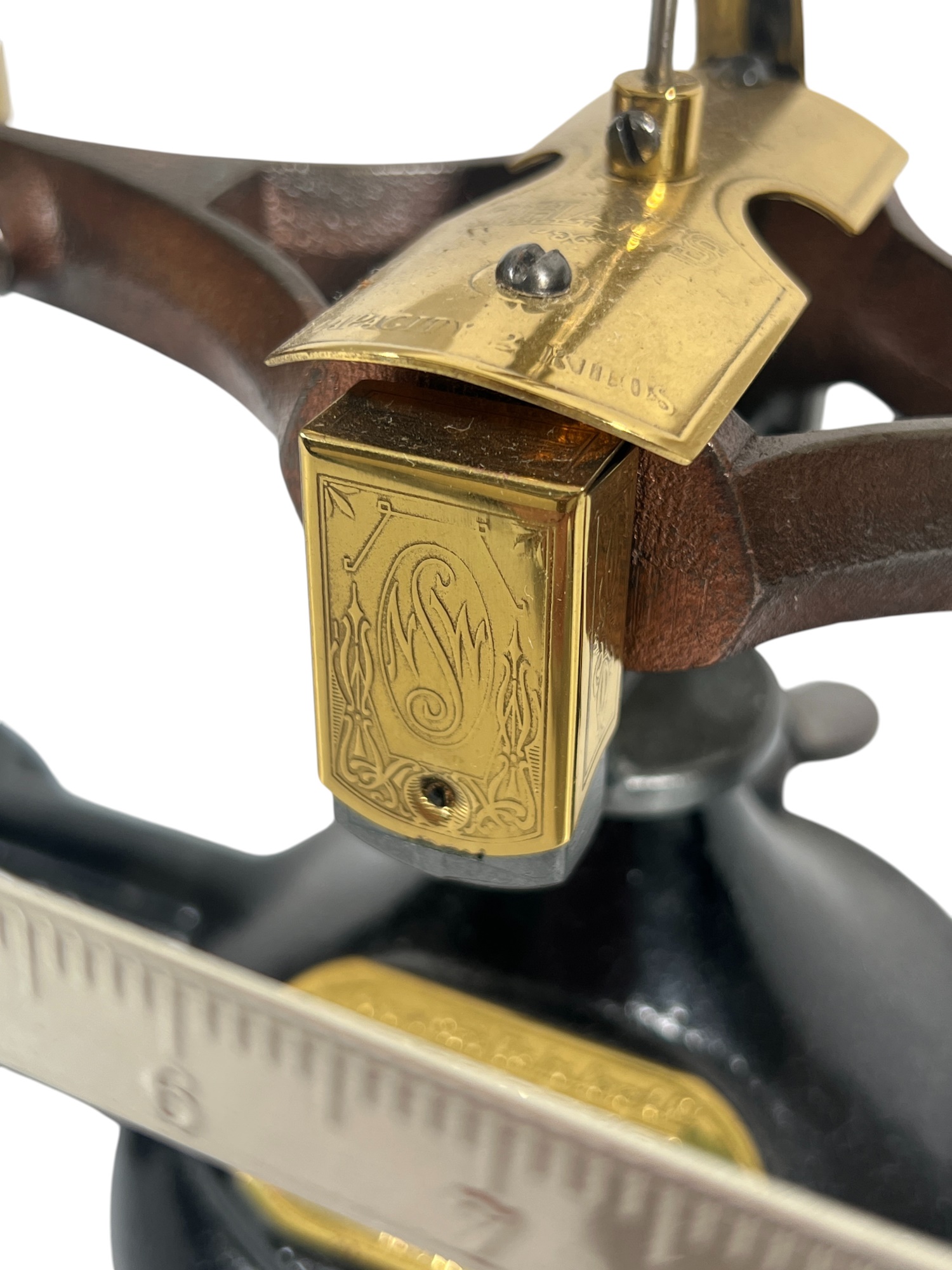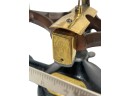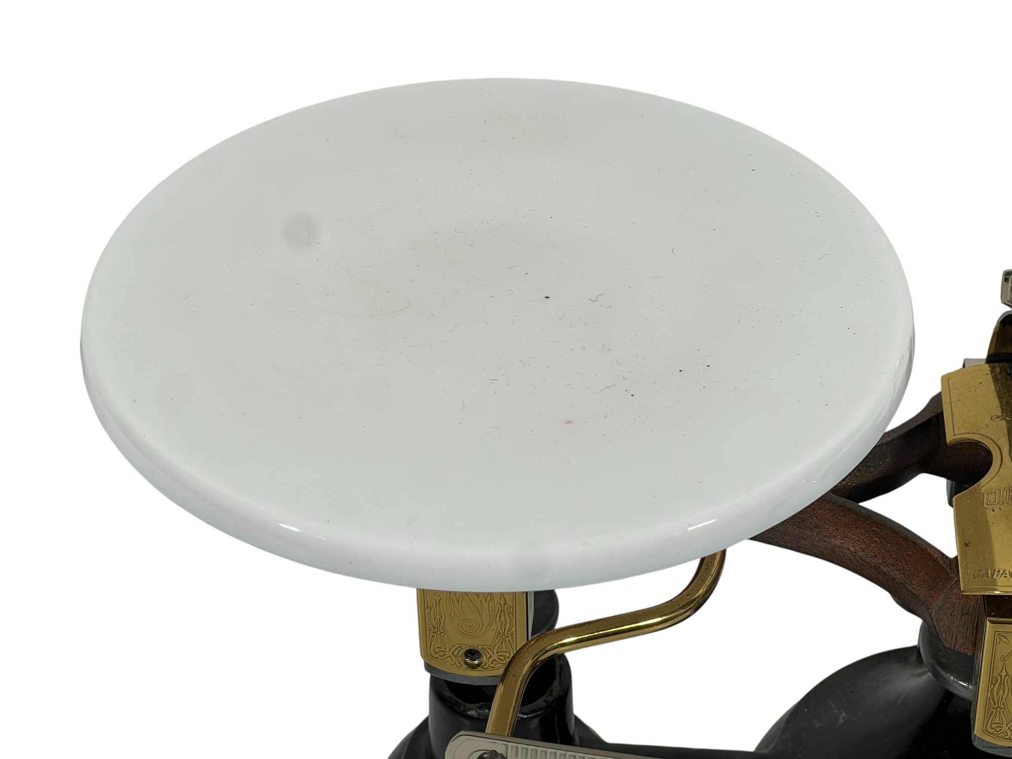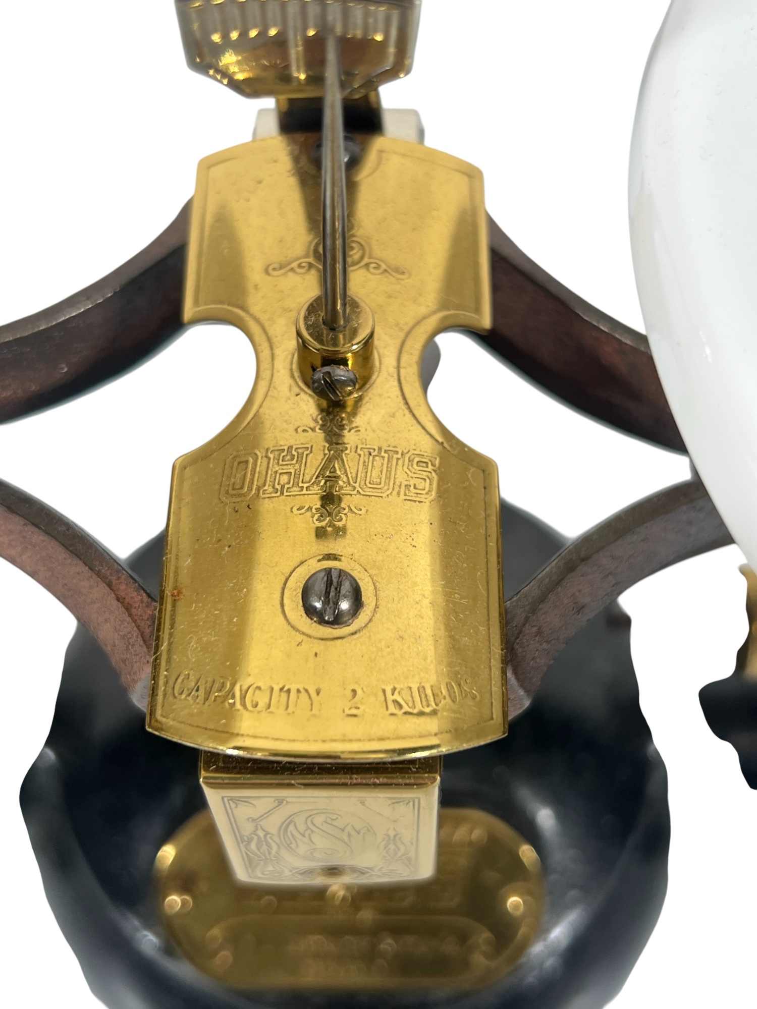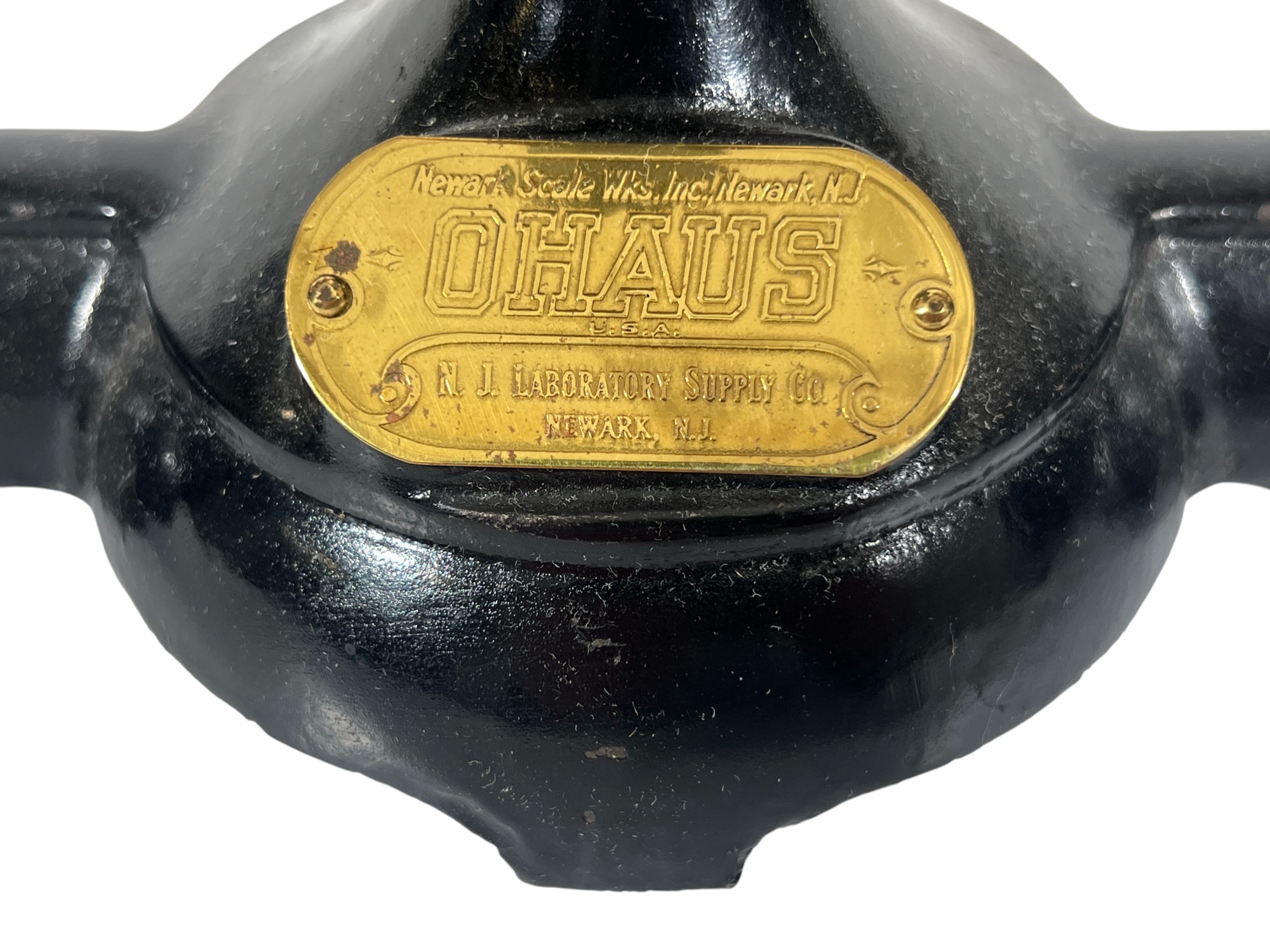 Newark Scale Works "Ohaus" apothecary balance scale with cast iron base, brass hardware, and porcelain trays. 6 x 14 x 6 inches. Condition: Good. Temp No 8831