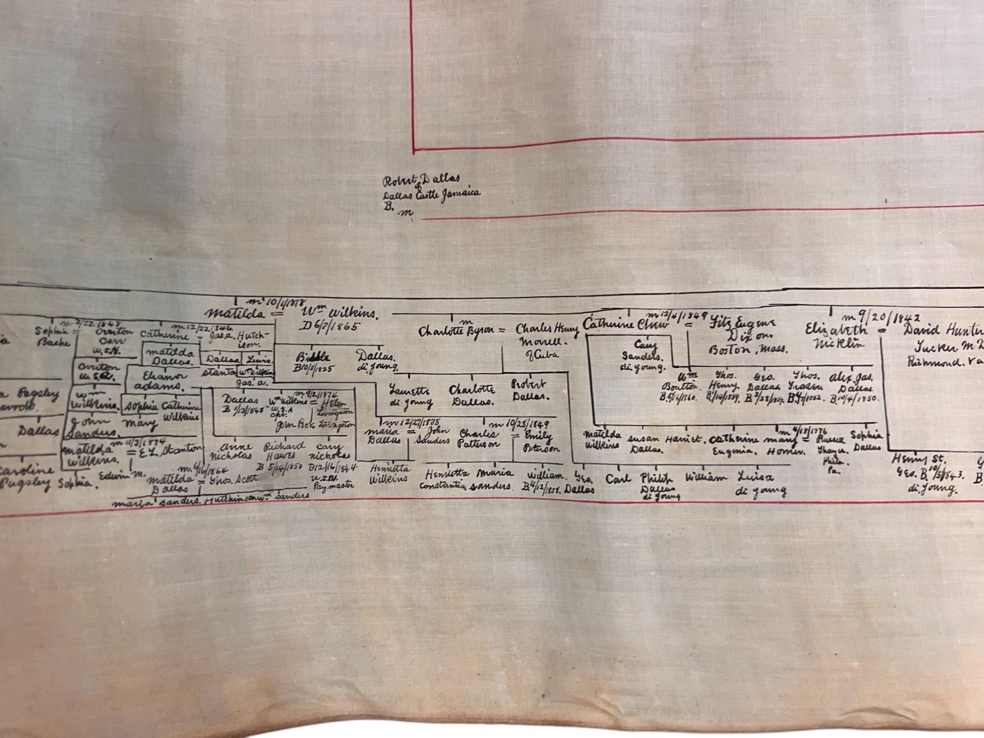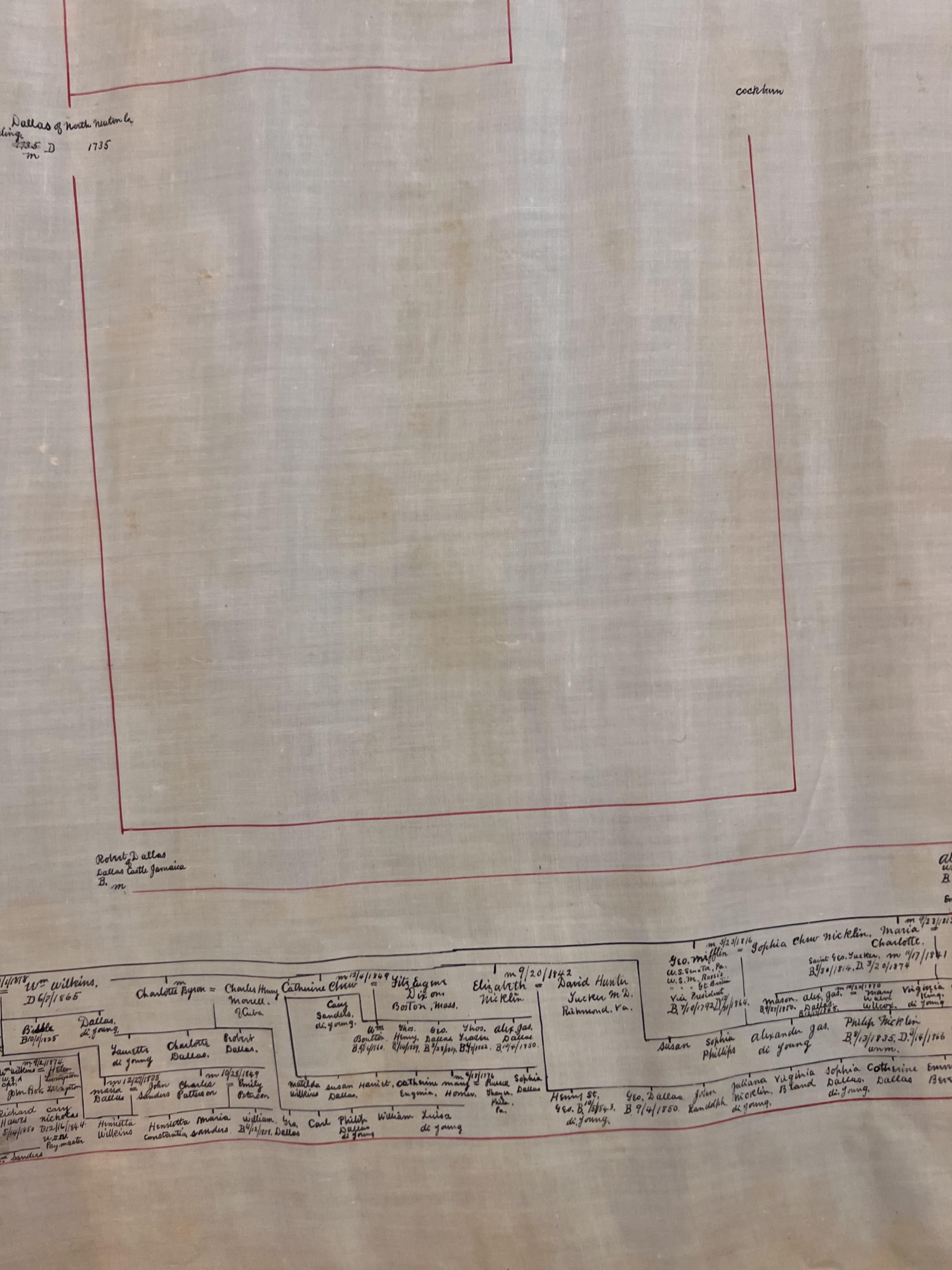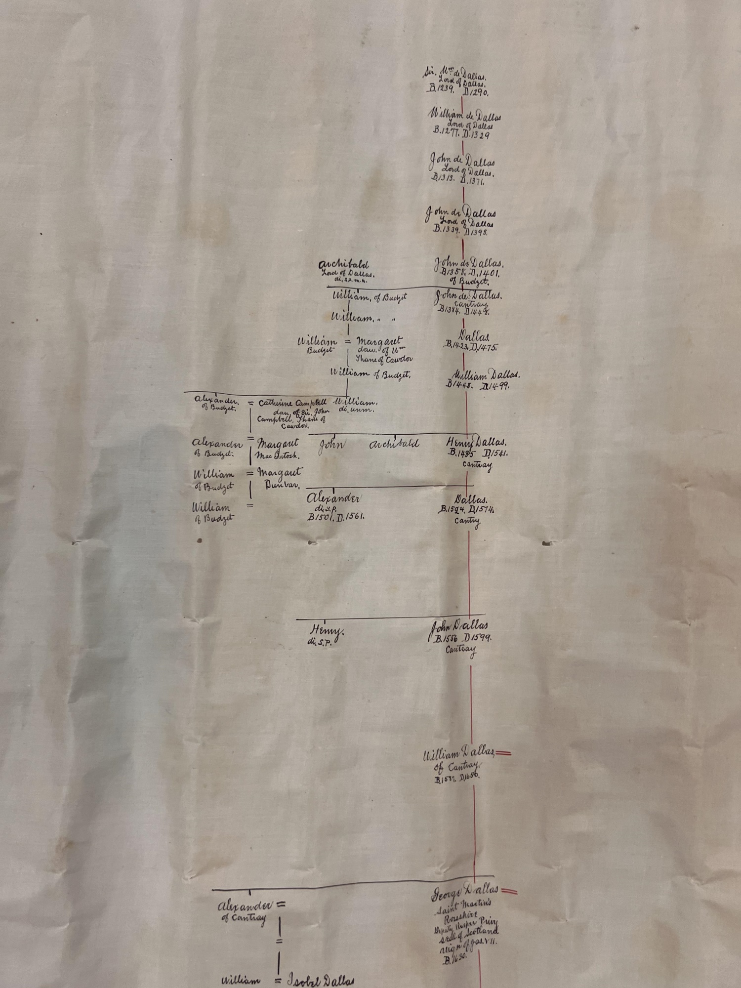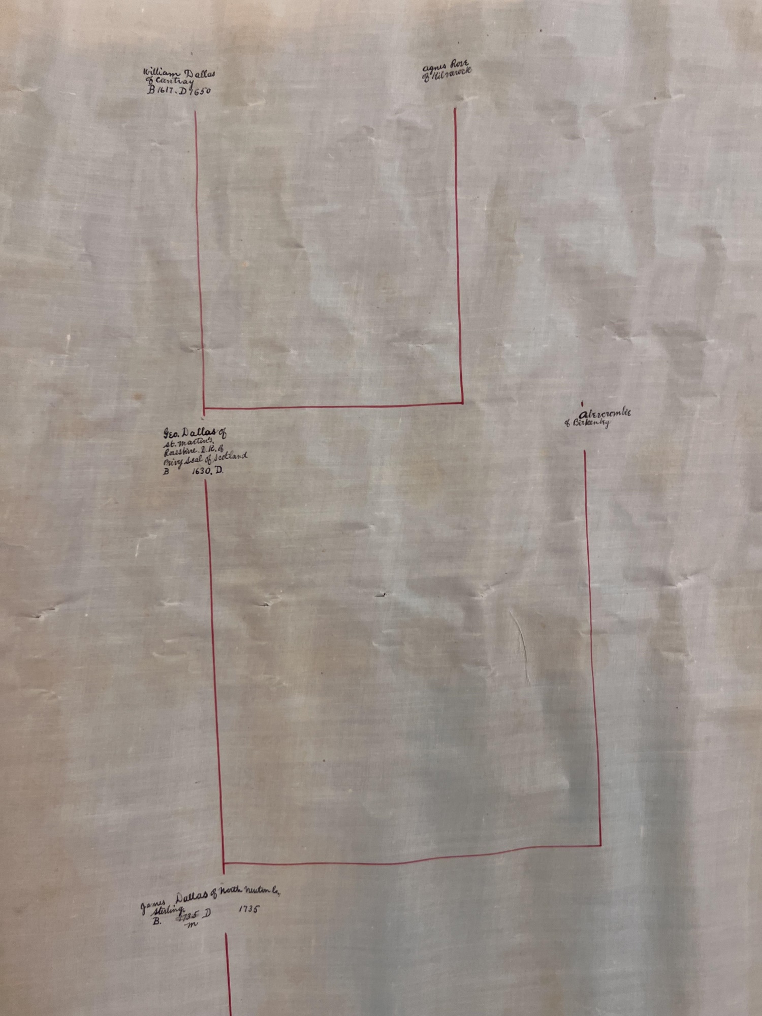 Recording begins with William? de Dallas, Lord of Dallas (1239-1290) and ending in the early 20th century. All hand written on what appears to be woven paper. (3) separate sheets of paper approx 36 x 68 inches. Provenance: by direct descent of the family of George M. Dallas, Vice President under James K. Polk.