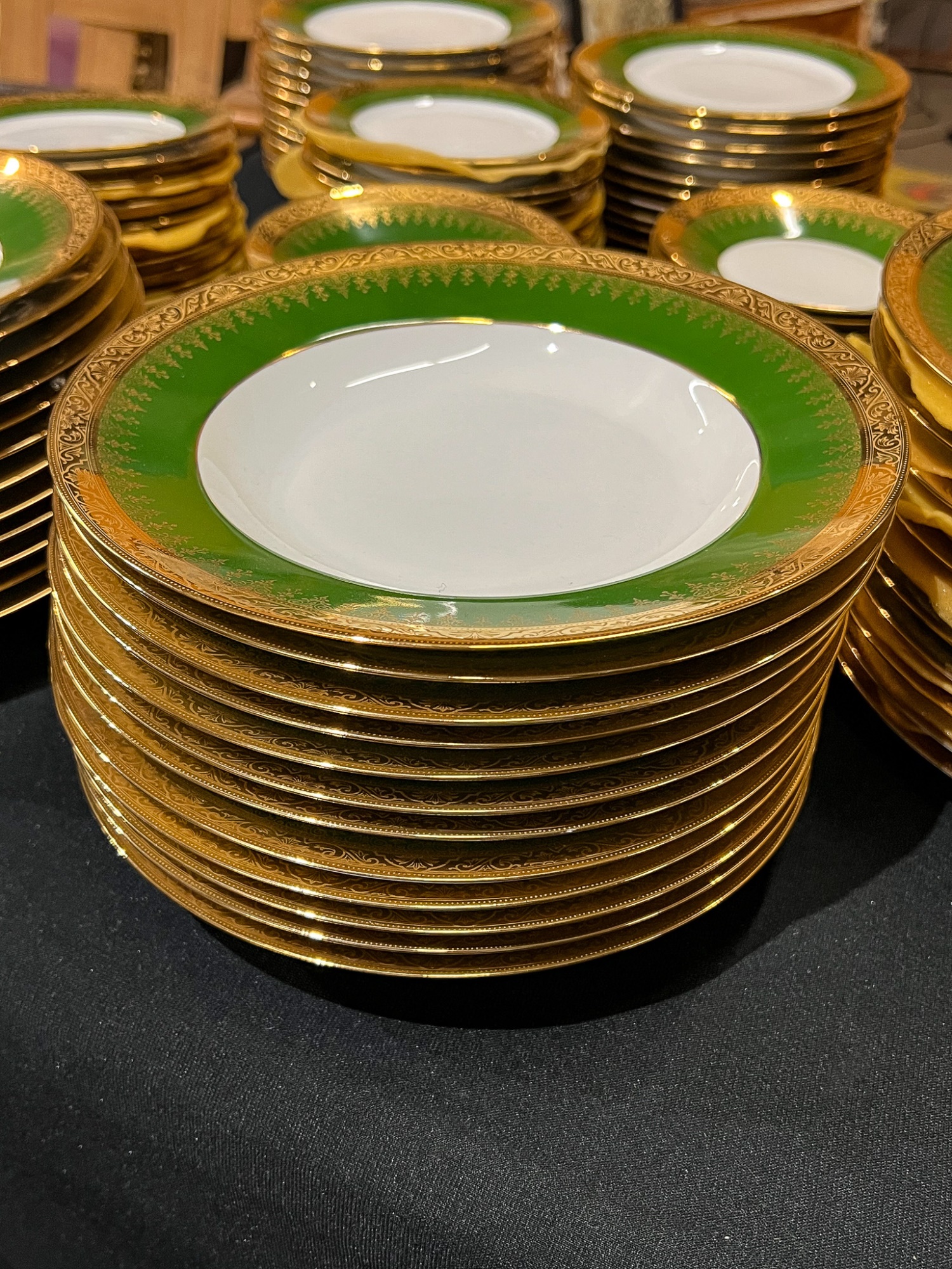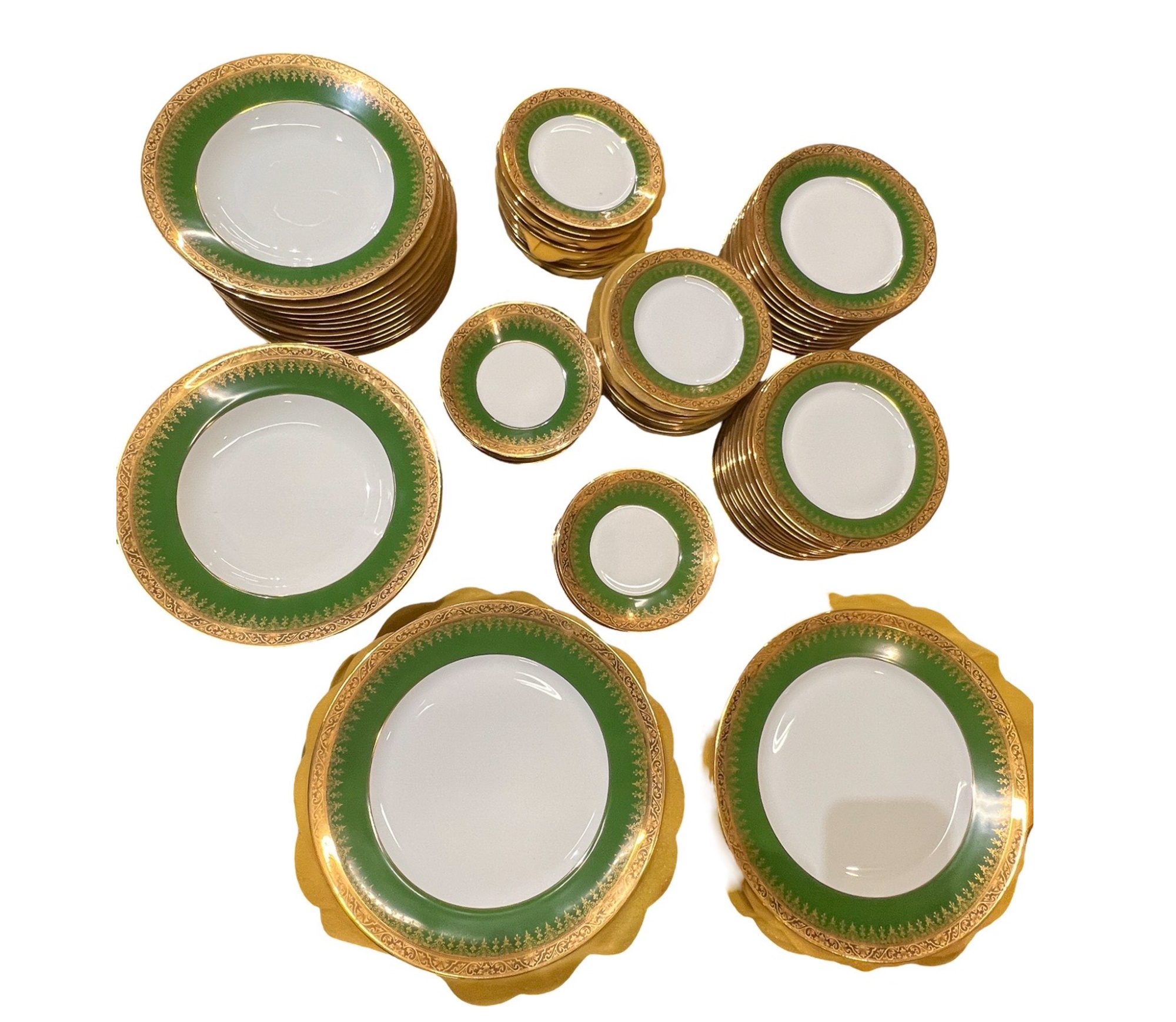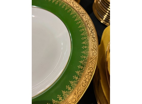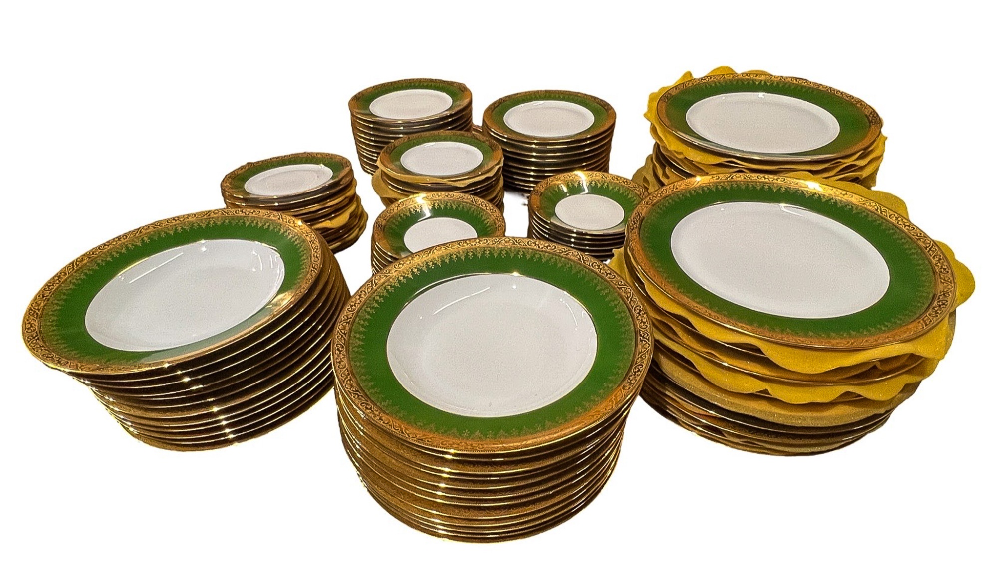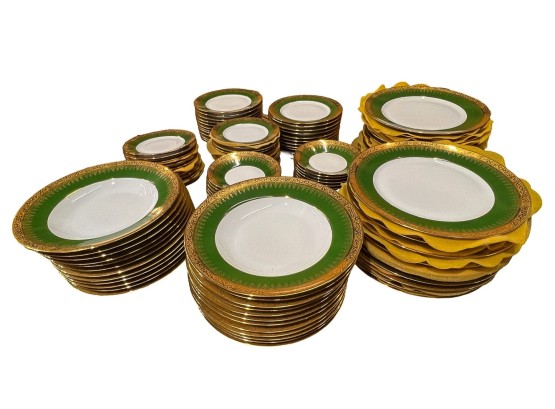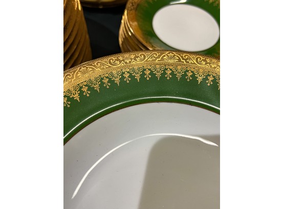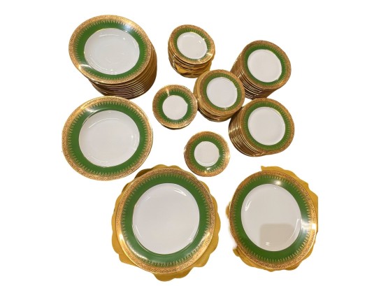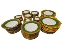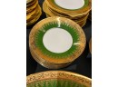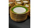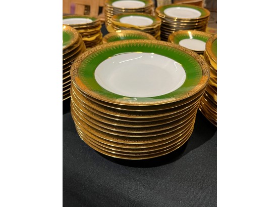 With green and gold encrusted border. (24) 10" plates, (24) 9 1/4" bowls, (24) 7 1/2" plates, (23) 6 1/4" plates, (24) 5 3/4" low bowls