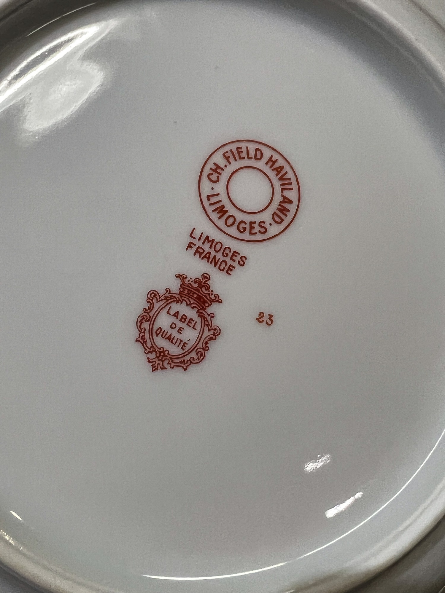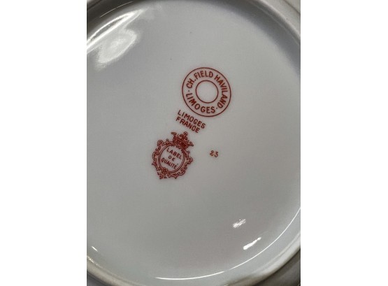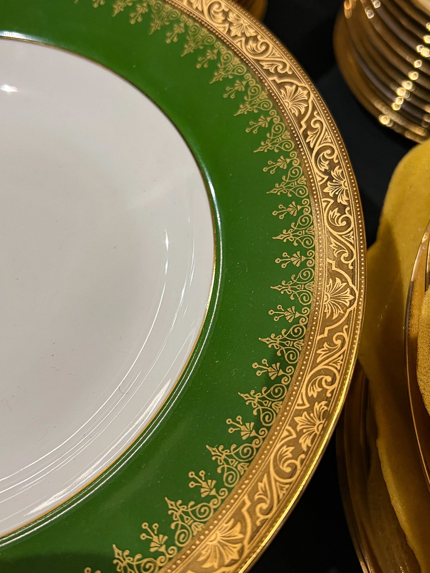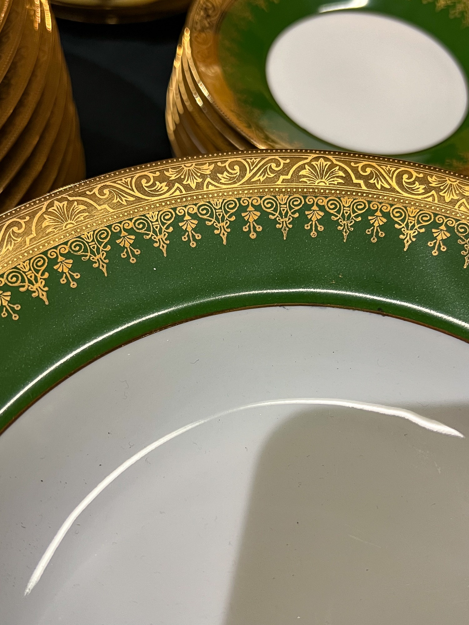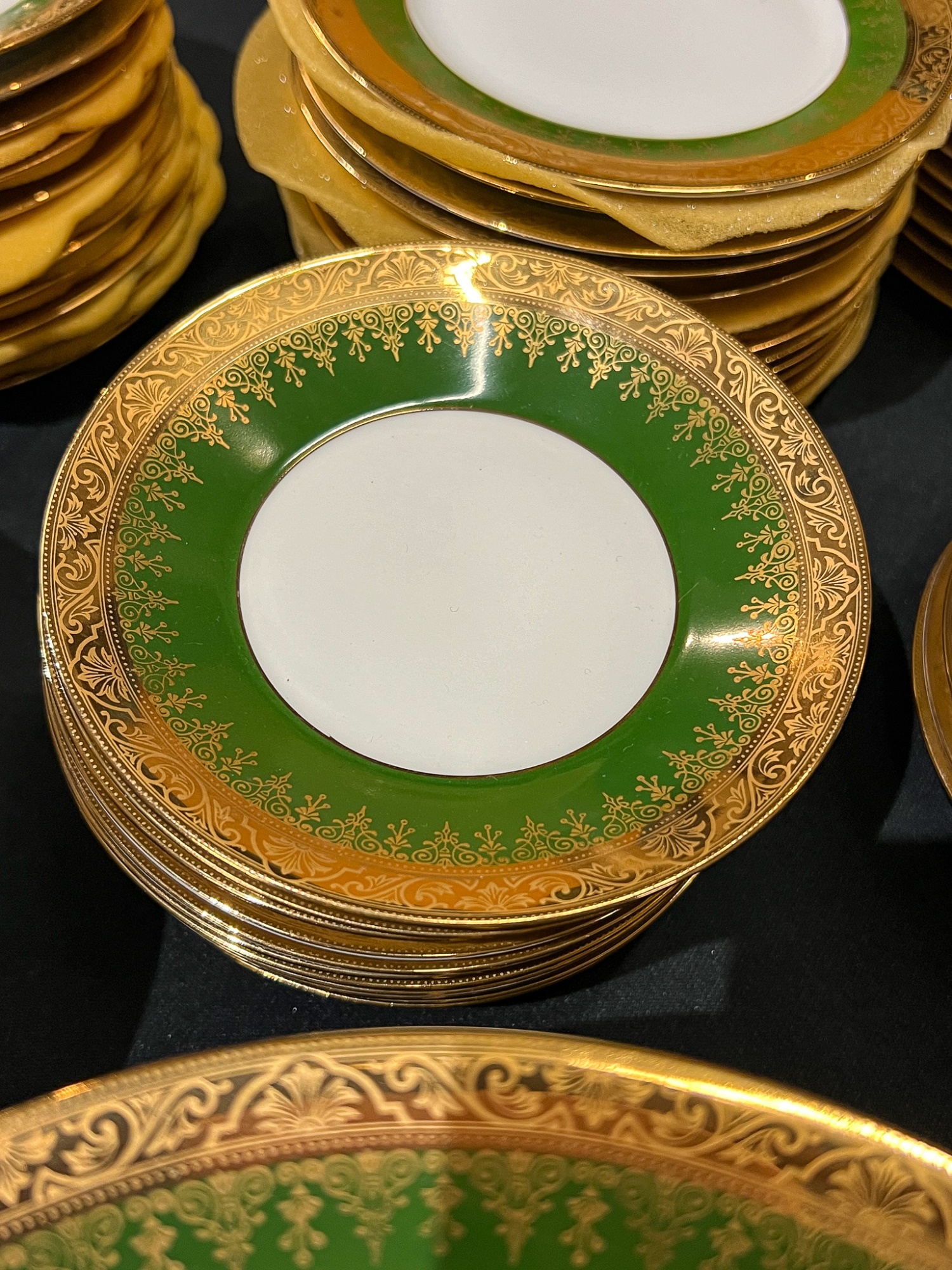 With green and gold encrusted border. (24) 10" plates, (24) 9 1/4" bowls, (24) 7 1/2" plates, (23) 6 1/4" plates, (24) 5 3/4" low bowls