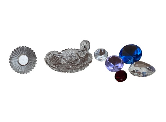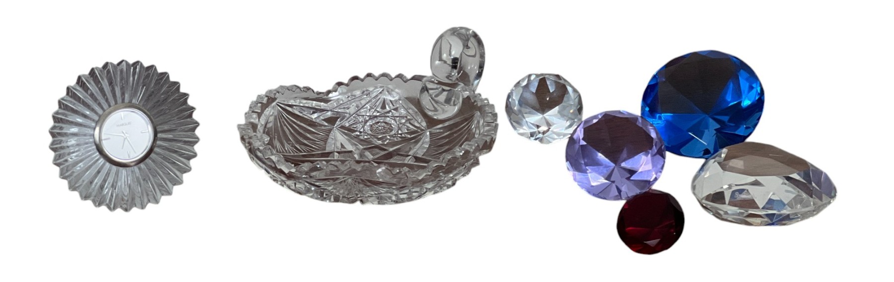 Including: (19th c) cut glass tray, Marquis clock and (2) clear faceted glass hearts signed Rosenthal