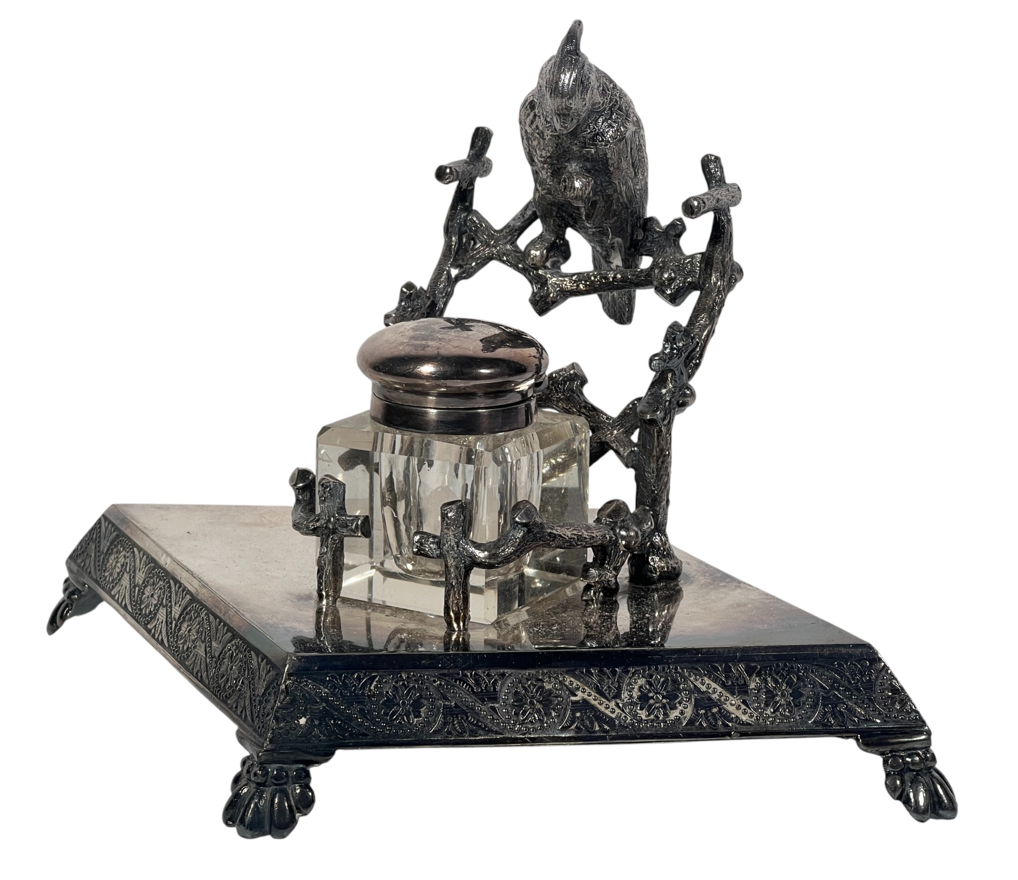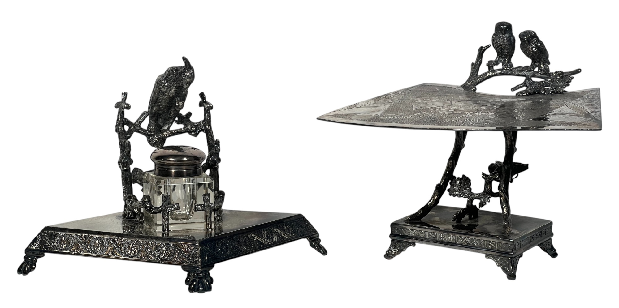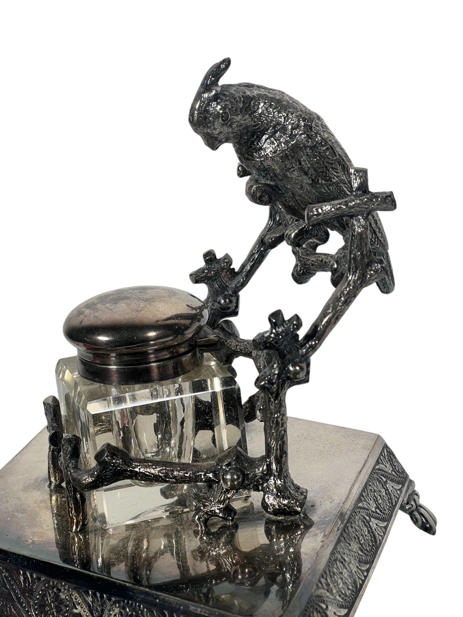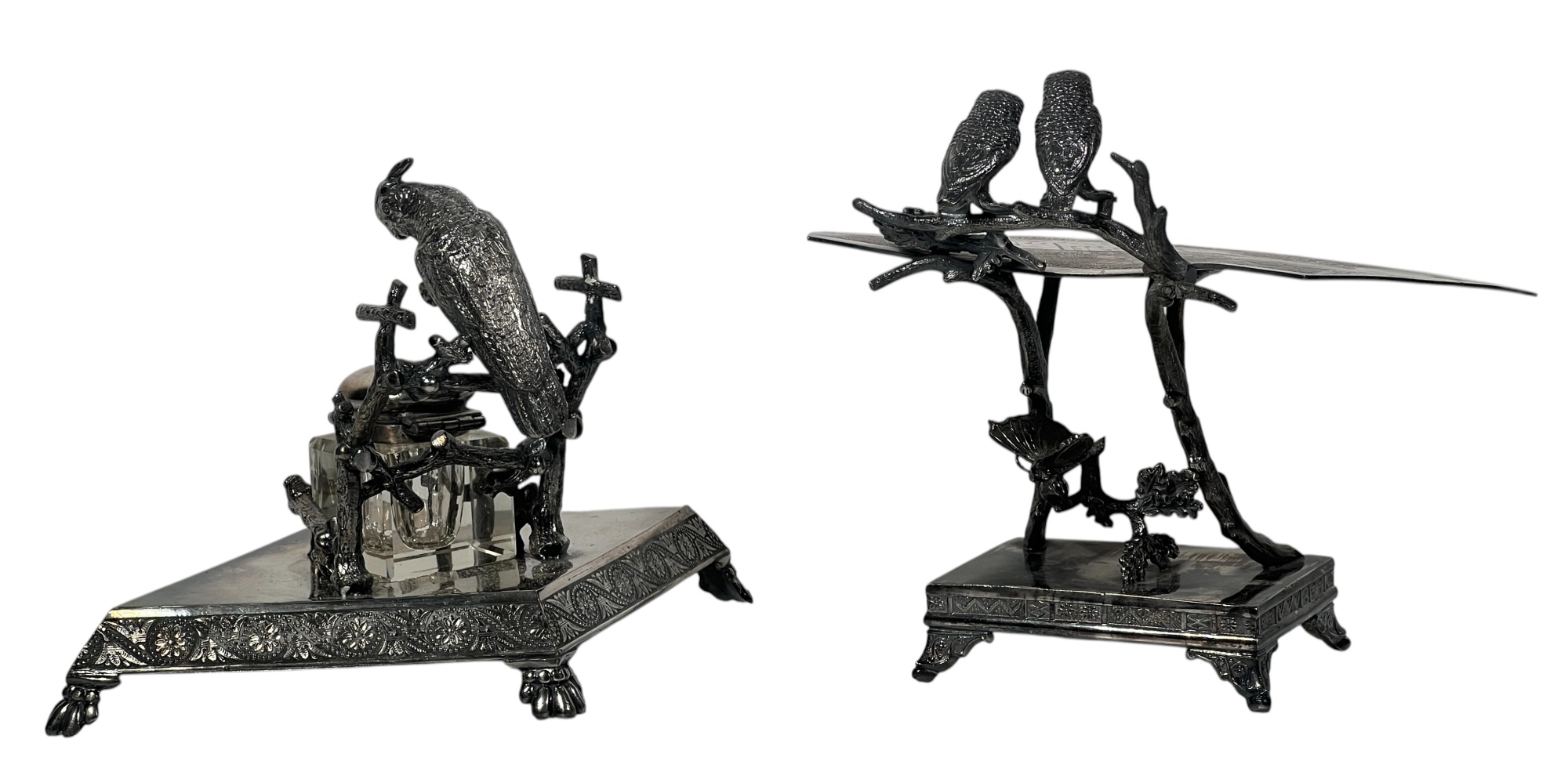 Figural Victorian silver plate letter stand with owls on branch form base, stand engraved with musical verse "Should Owl's Acquaintance be Forgot" and a diamond form silver plate inkwell with figural cockatoo on branch perch pen rest. 7x 8 1/2 x 6 inches.