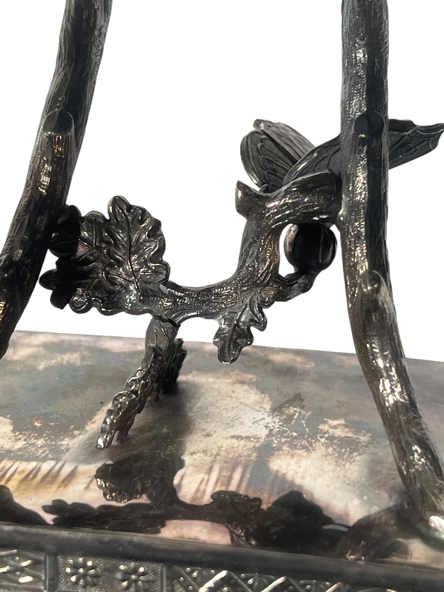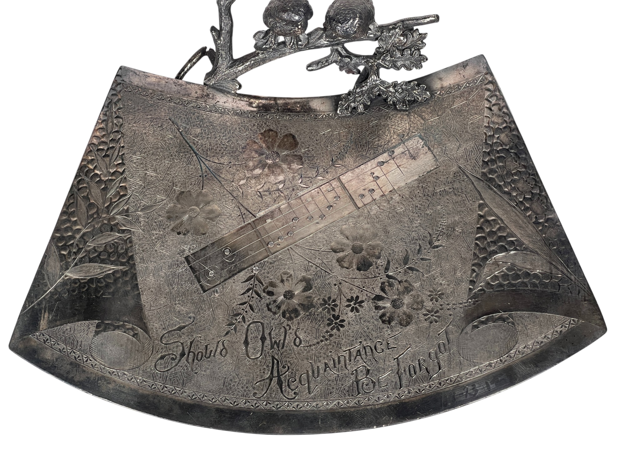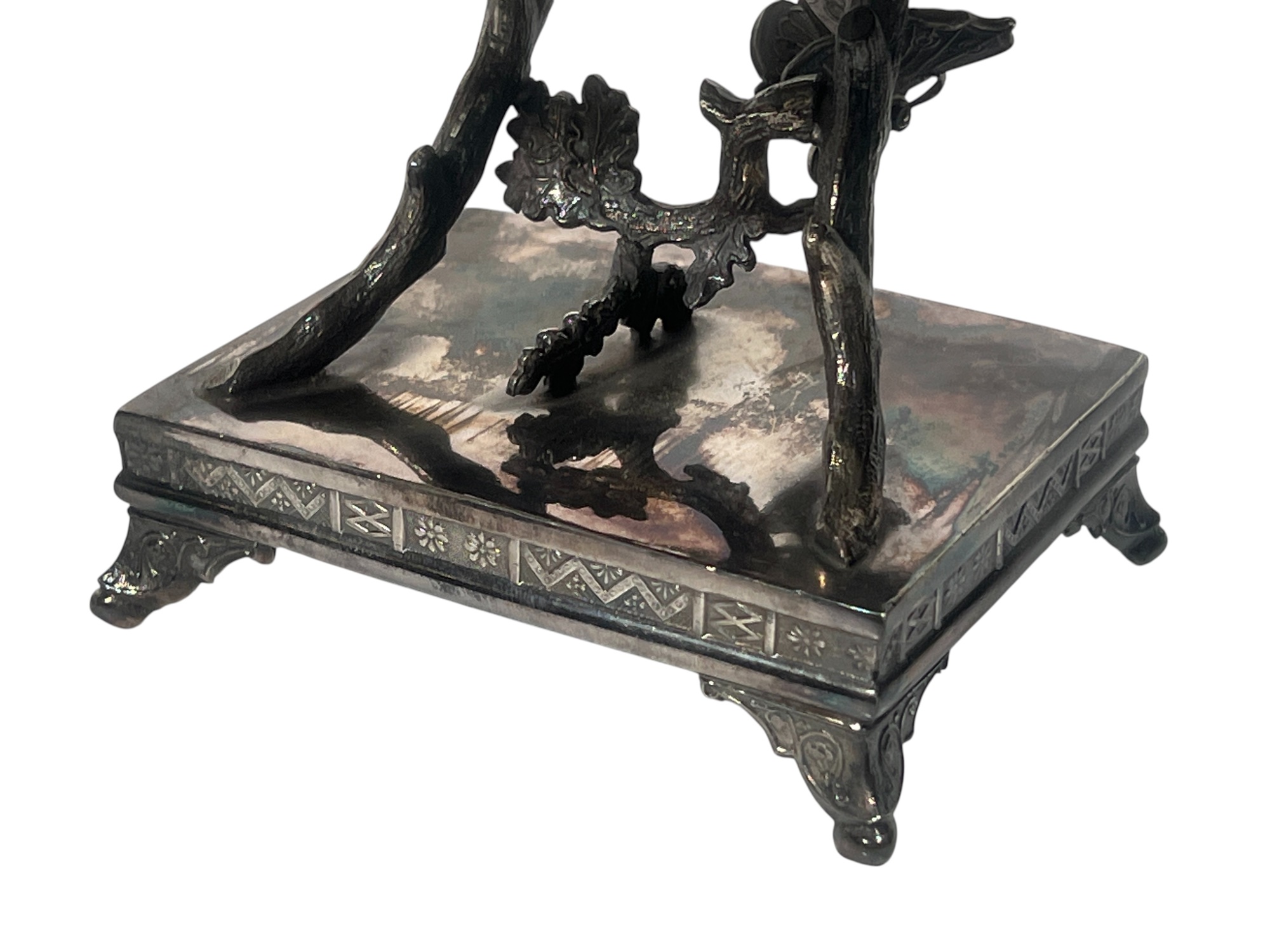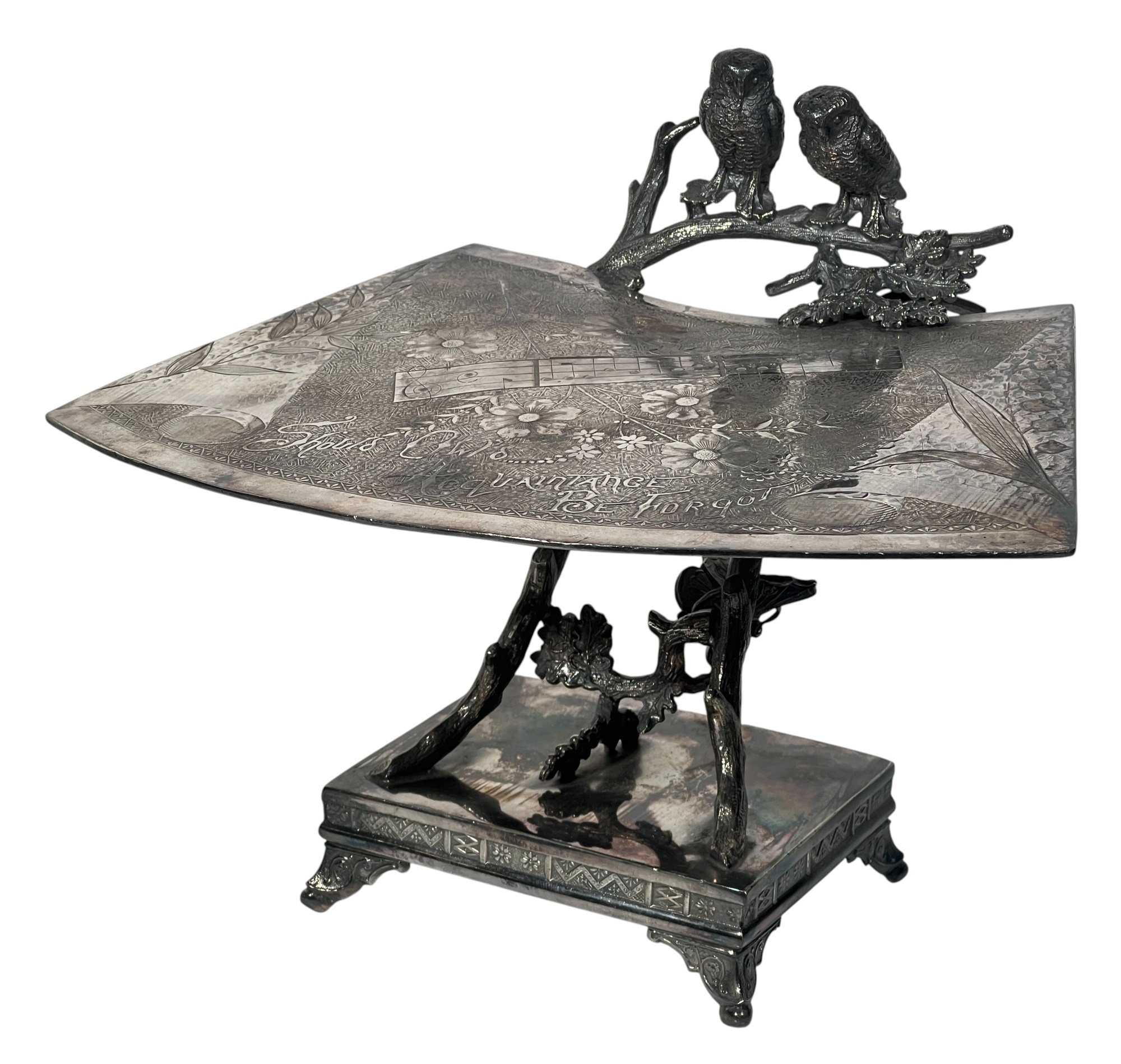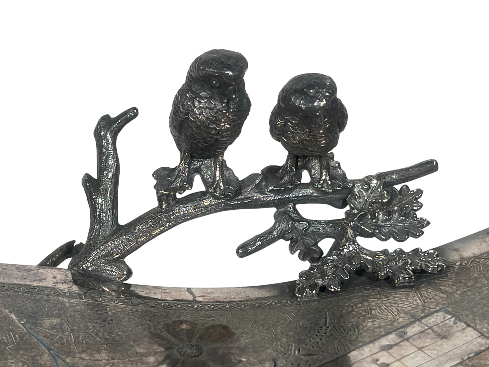 Figural Victorian silver plate letter stand with owls on branch form base, stand engraved with musical verse "Should Owl's Acquaintance be Forgot" and a diamond form silver plate inkwell with figural cockatoo on branch perch pen rest. 7x 8 1/2 x 6 inches.