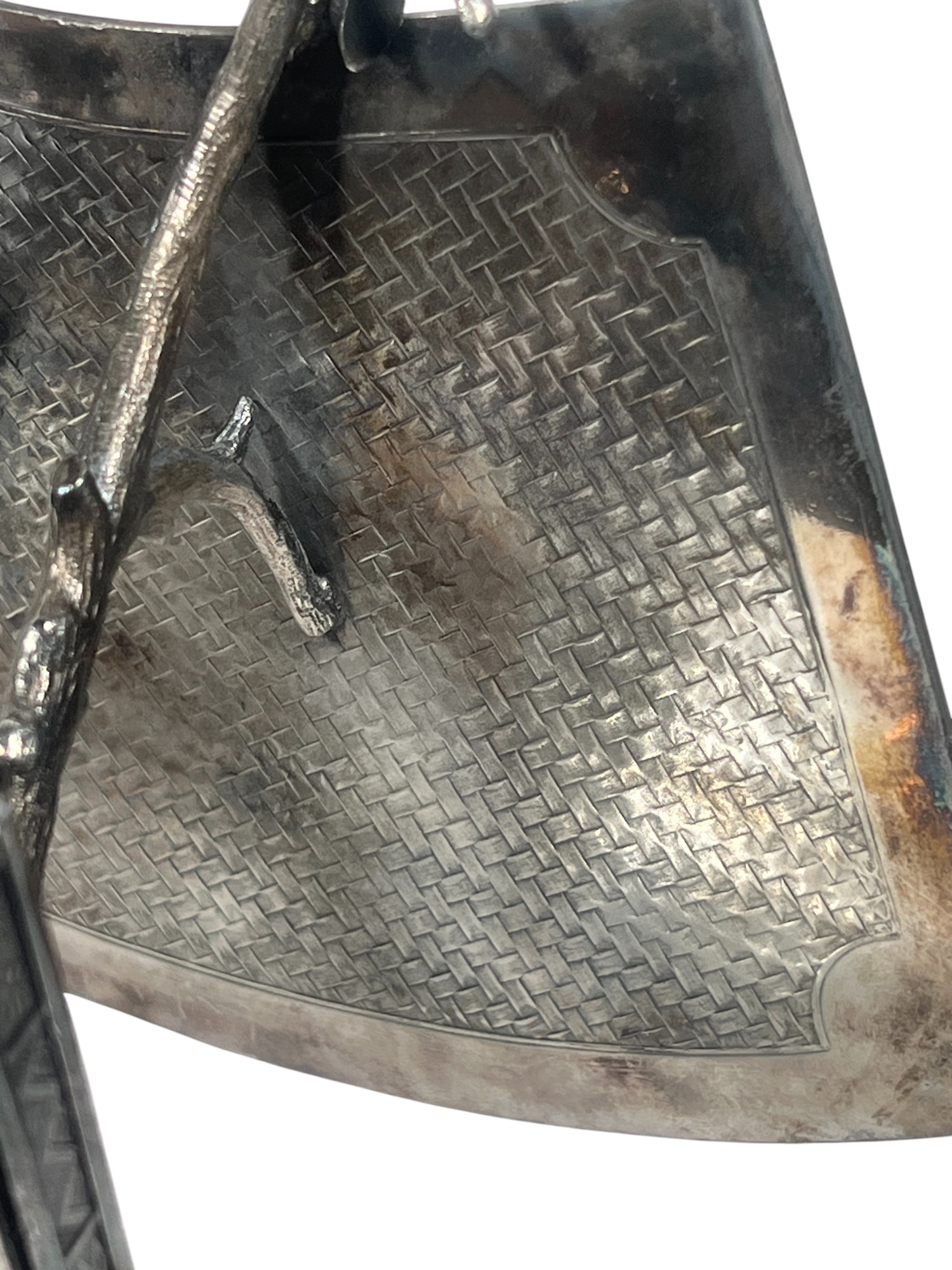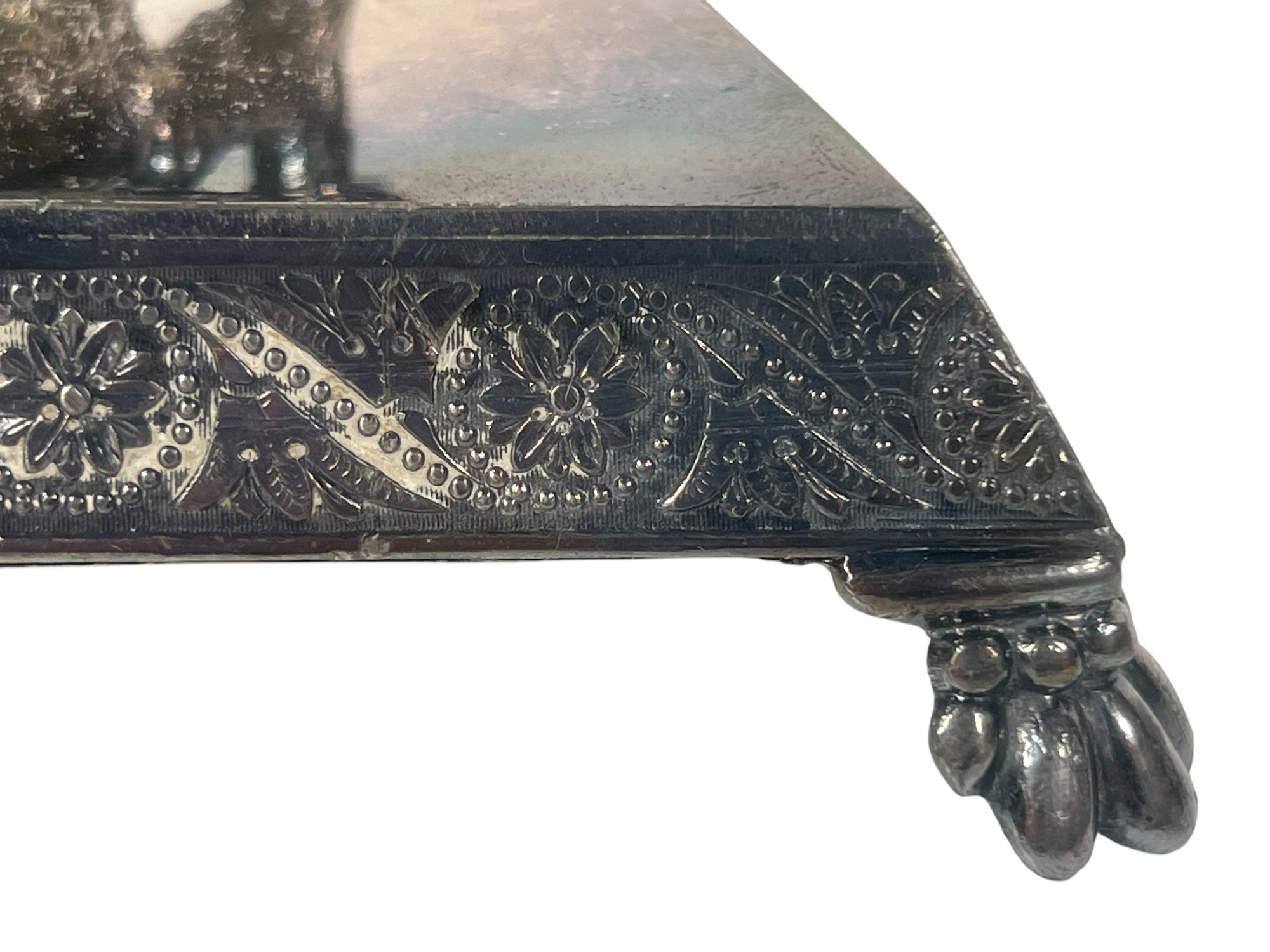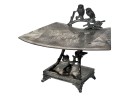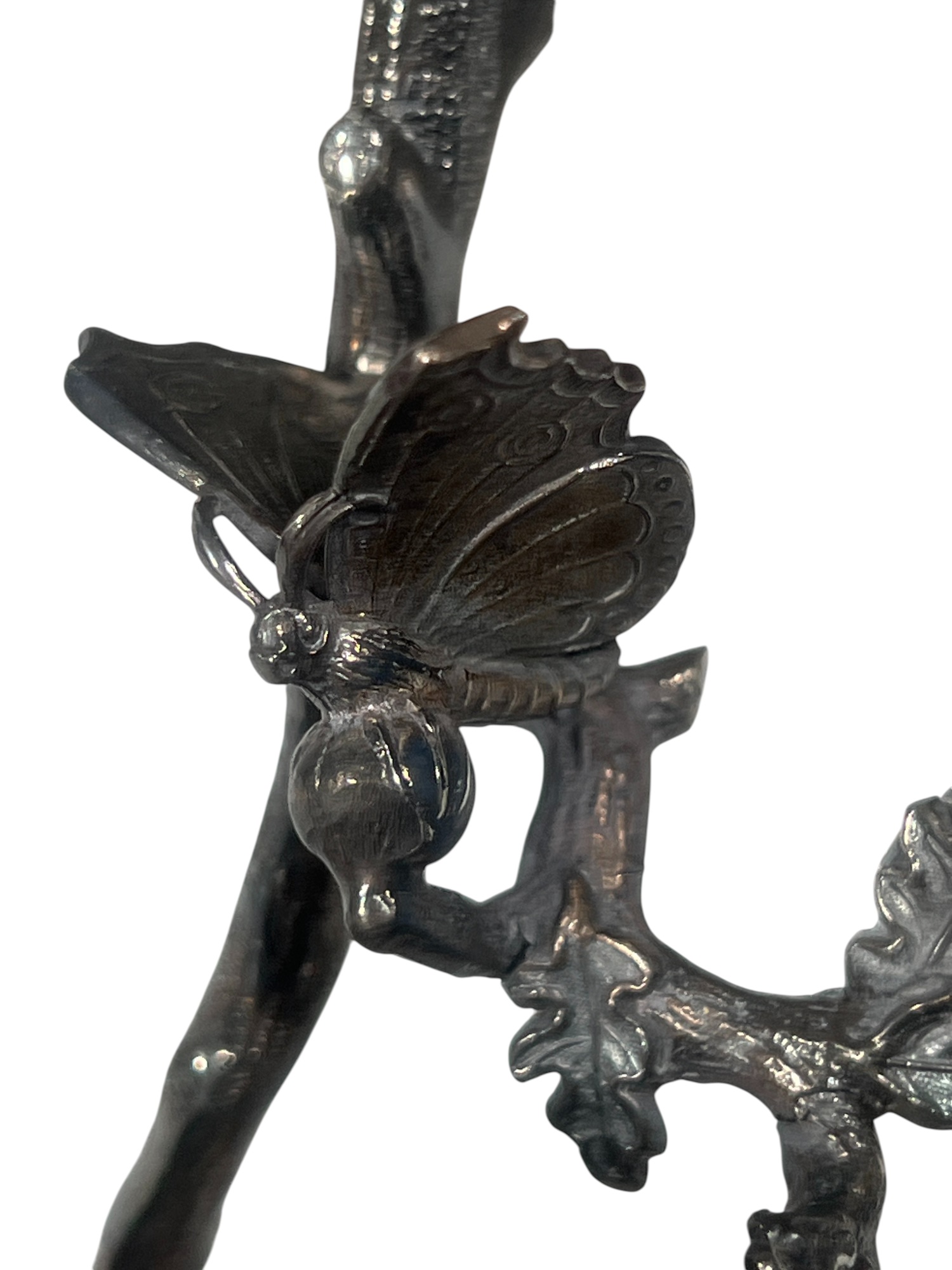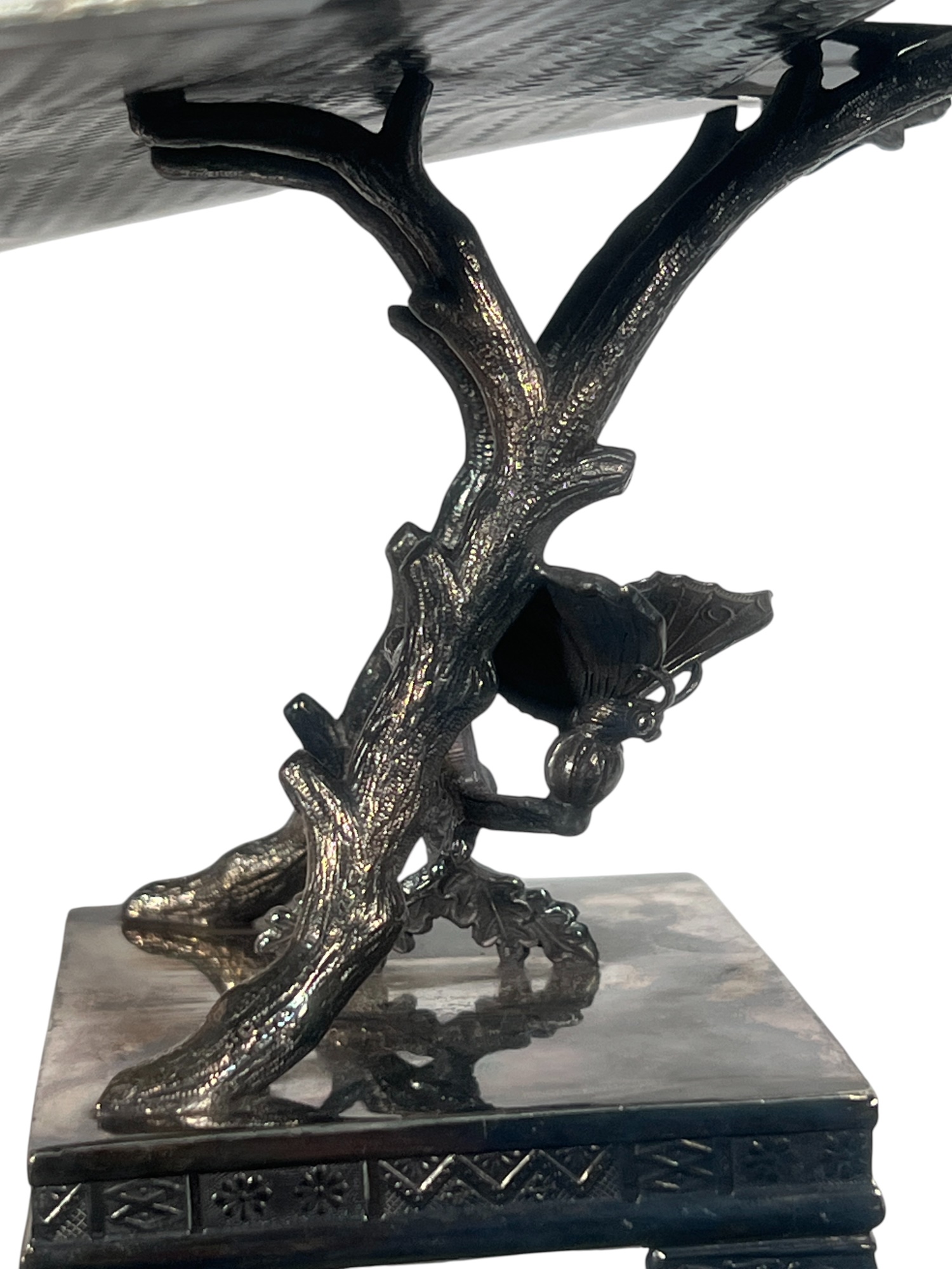 Figural Victorian silver plate letter stand with owls on branch form base, stand engraved with musical verse "Should Owl's Acquaintance be Forgot" and a diamond form silver plate inkwell with figural cockatoo on branch perch pen rest. 7x 8 1/2 x 6 inches.