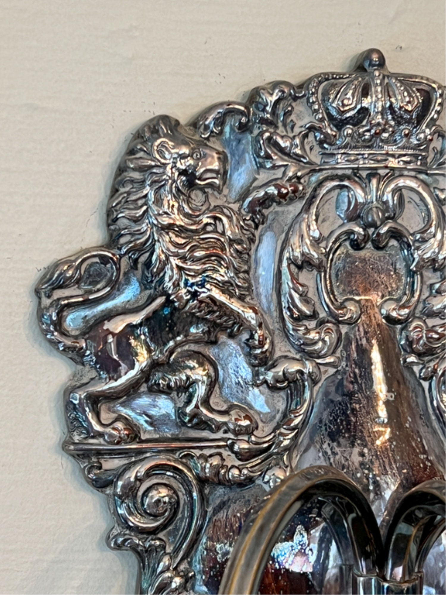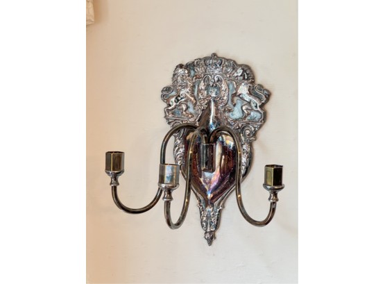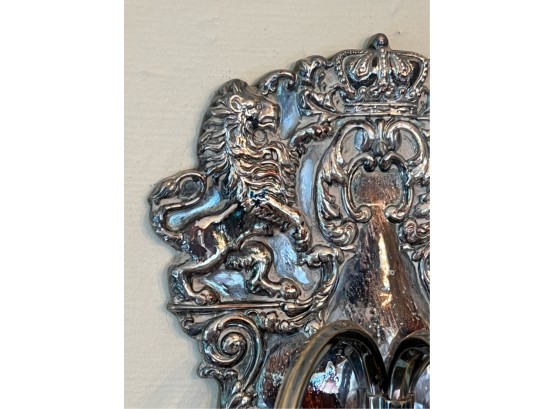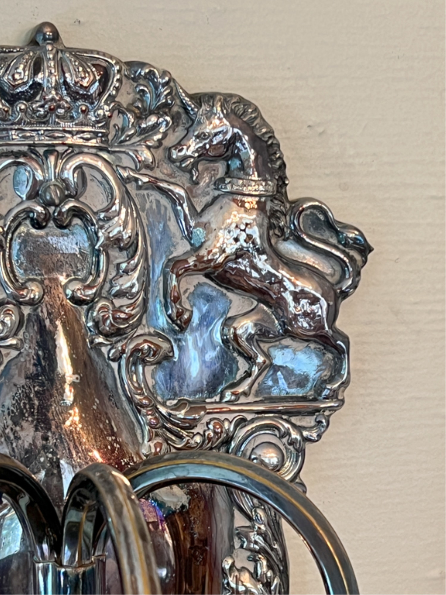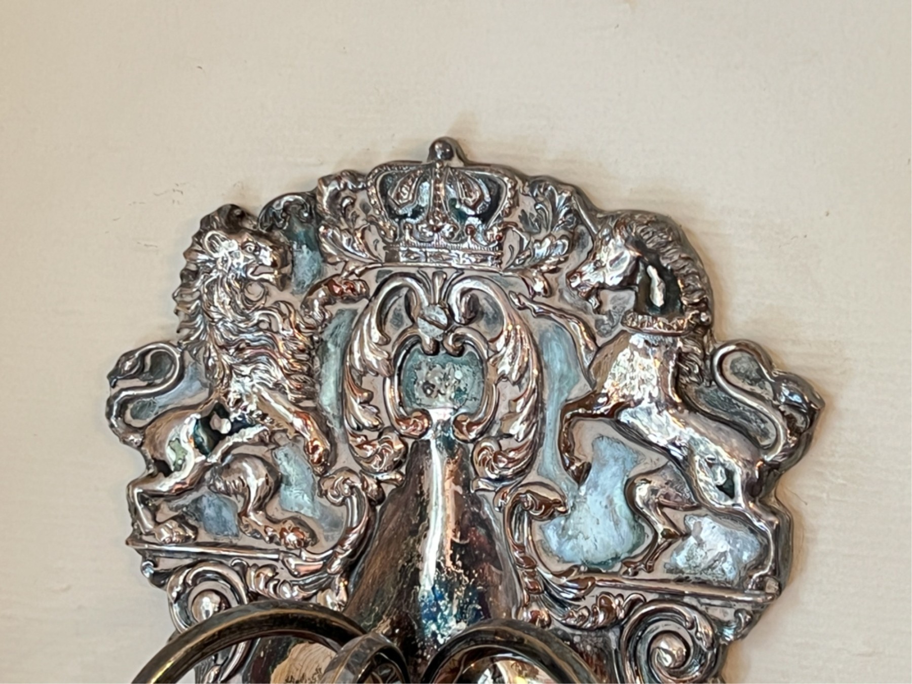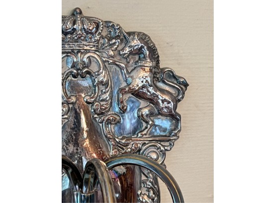 Silver plated with Lion and unicorn. Hallmarked. 12 1/2 x 7 1/2 x 7 1/2 inches.