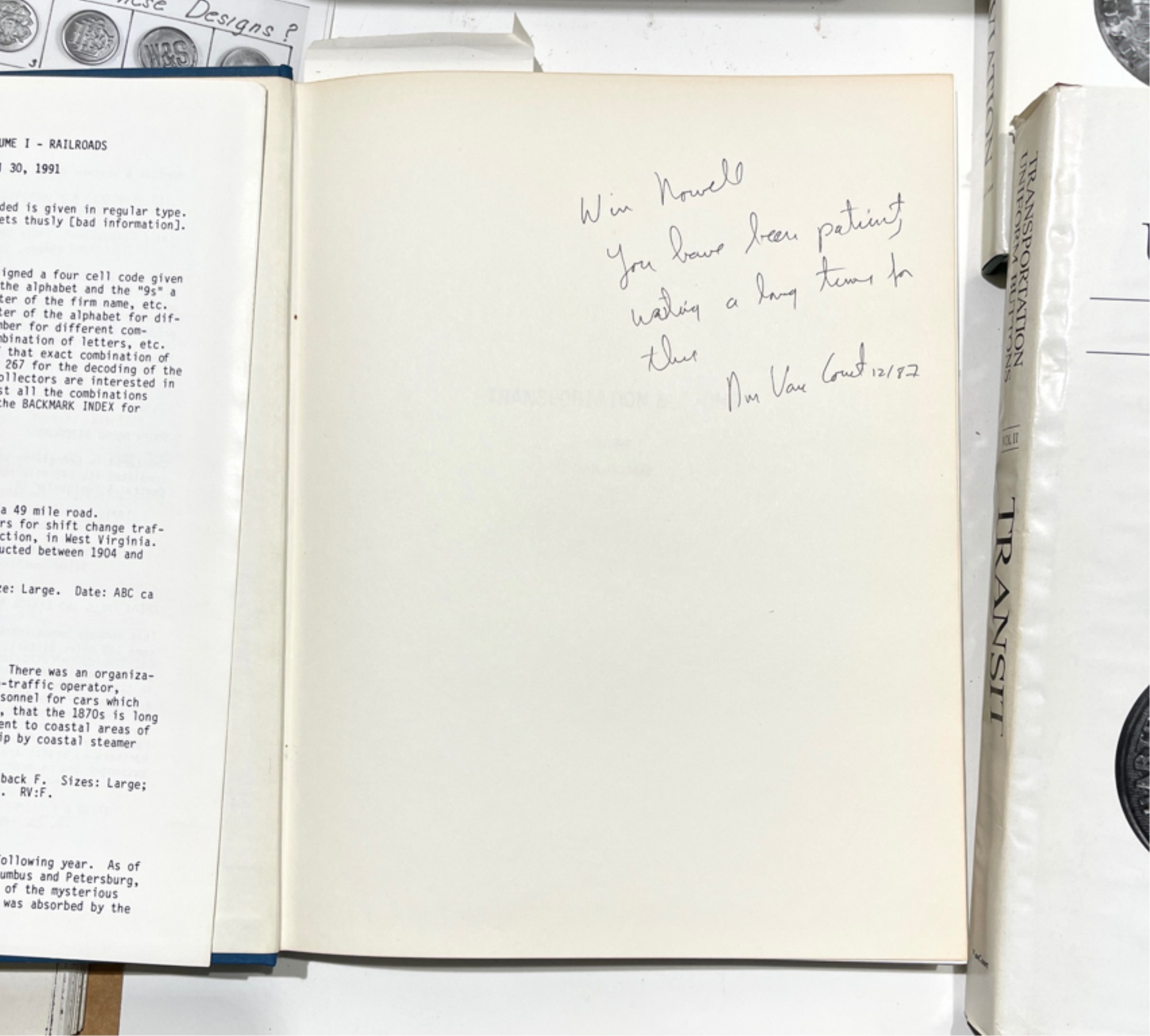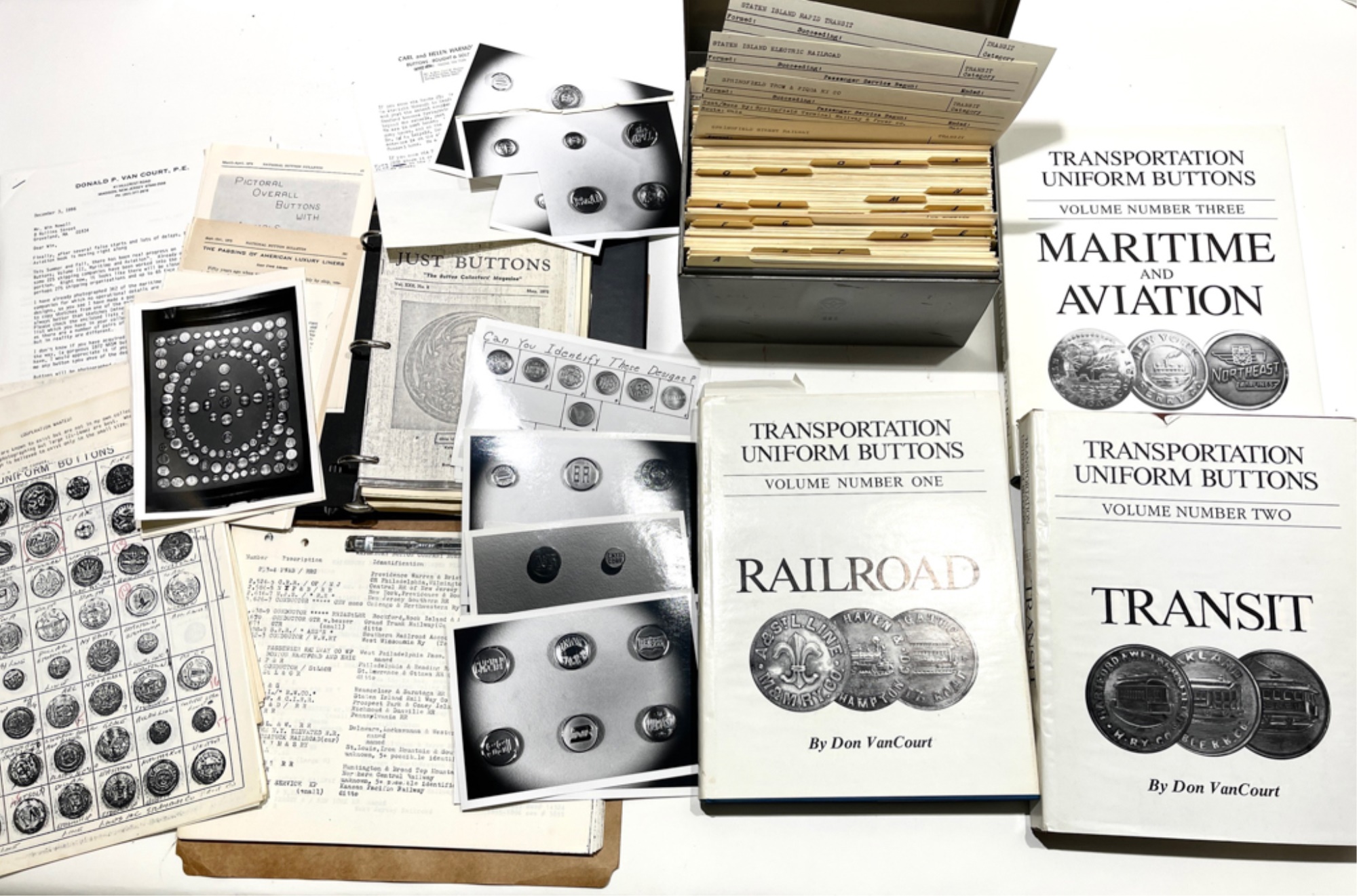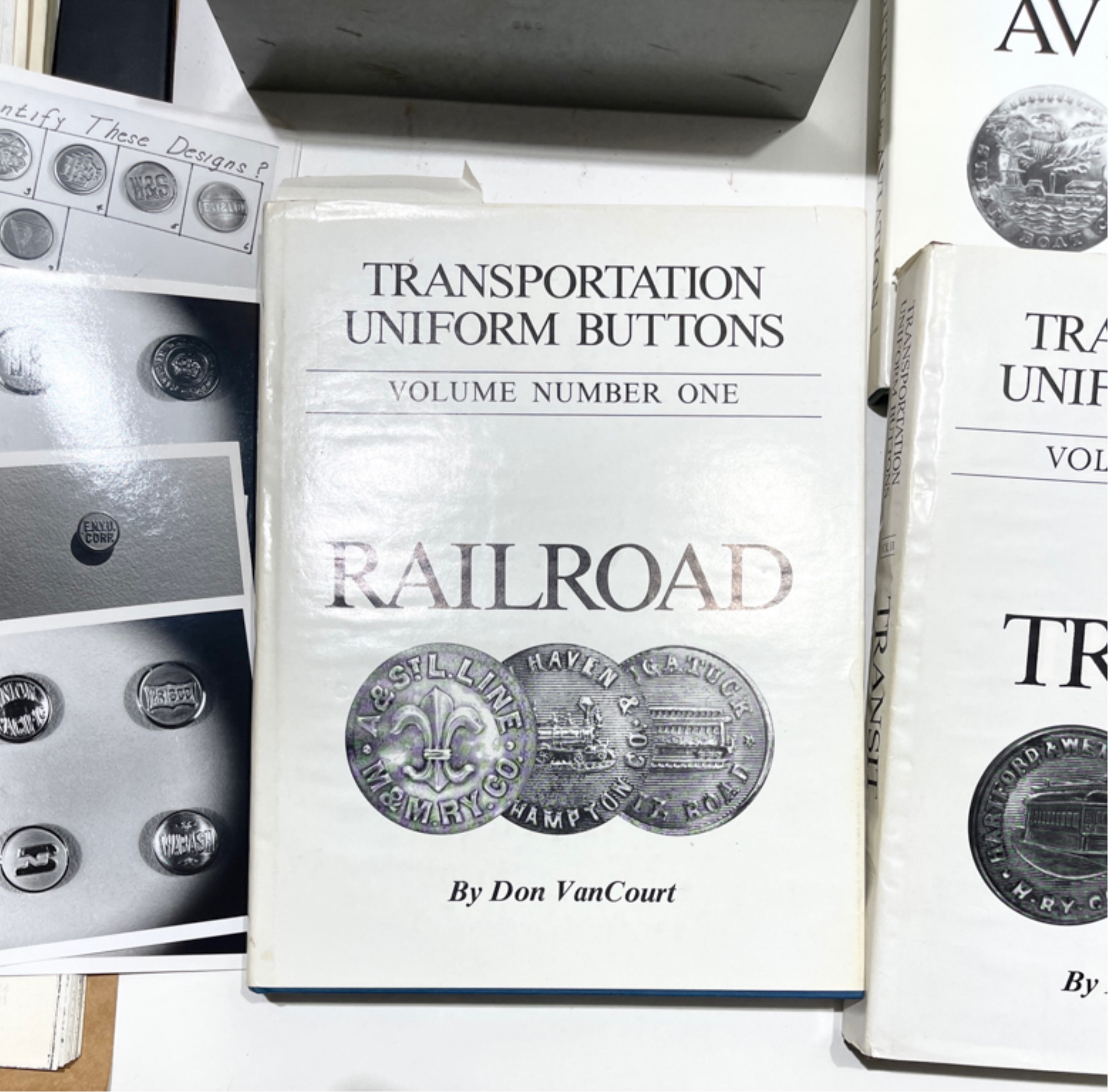 Including (3) volume set by Dan Van Court signed by the author Railroad 1987, Transit 1991 and Maritime and Aviation 1998, index card file on rail lines and other button information. Card file 5 1/2" x 8 1/2" x 6"