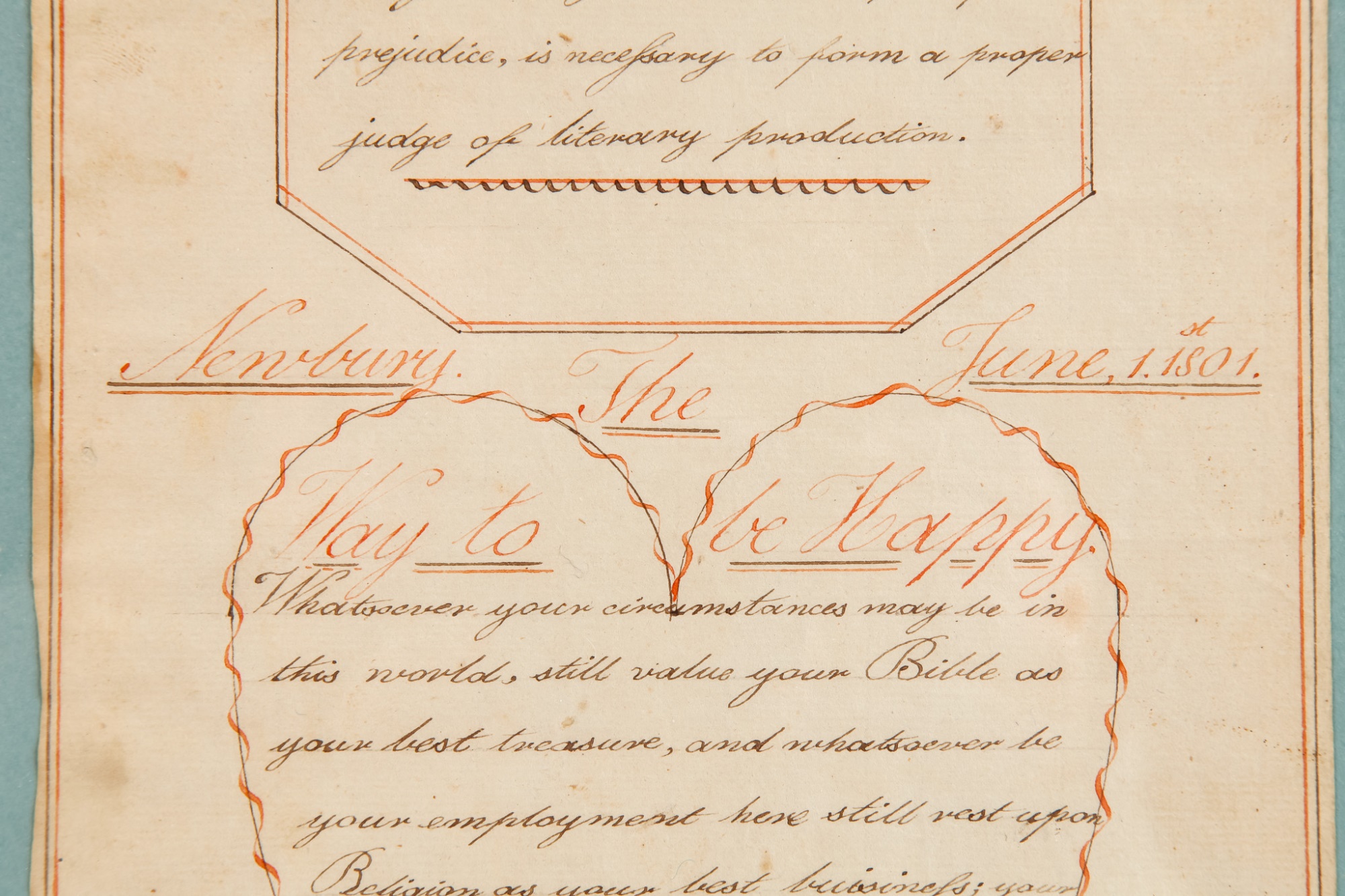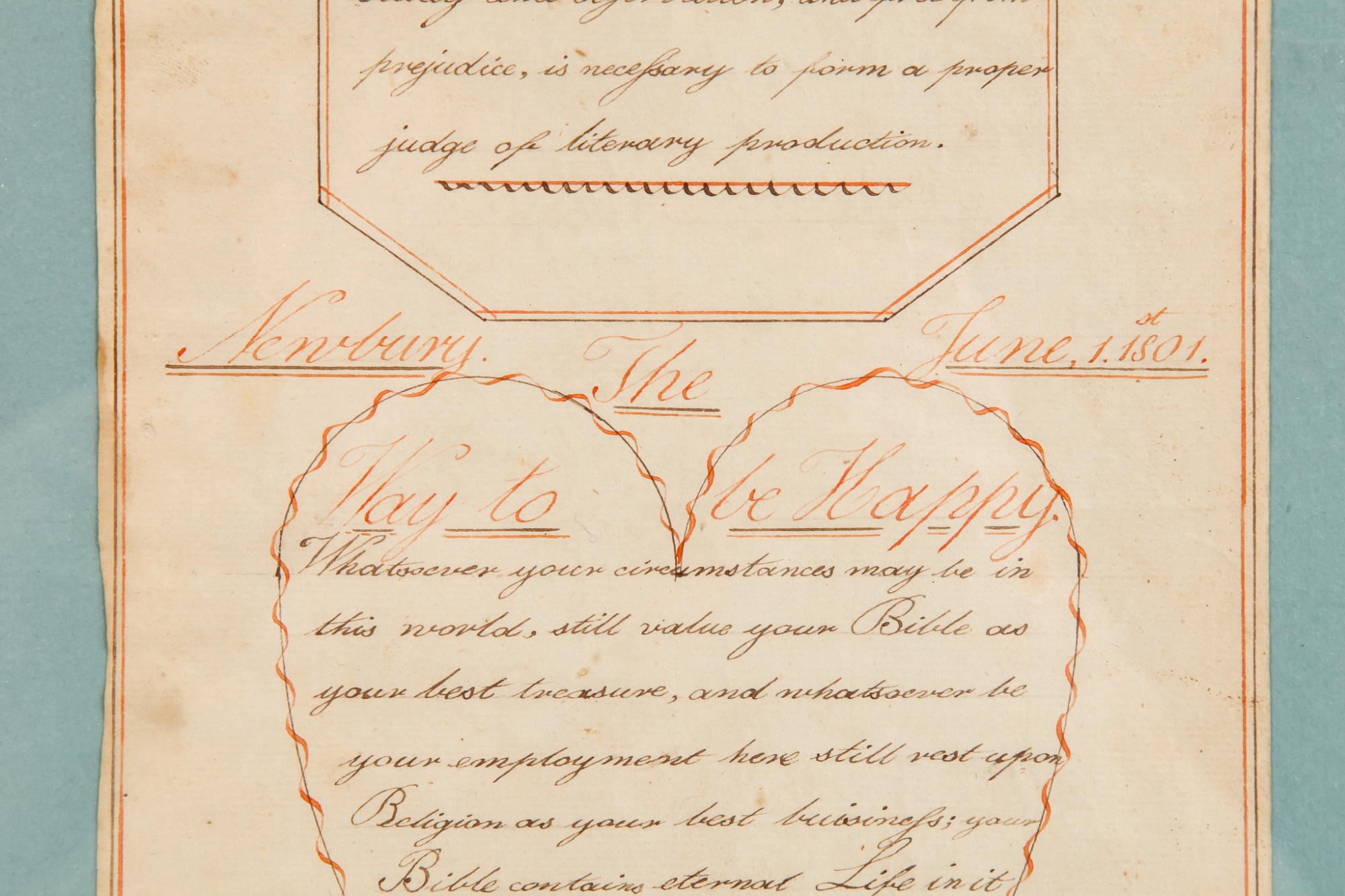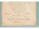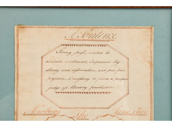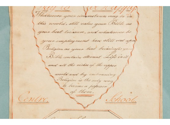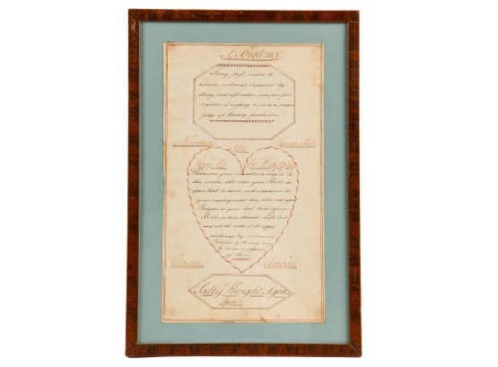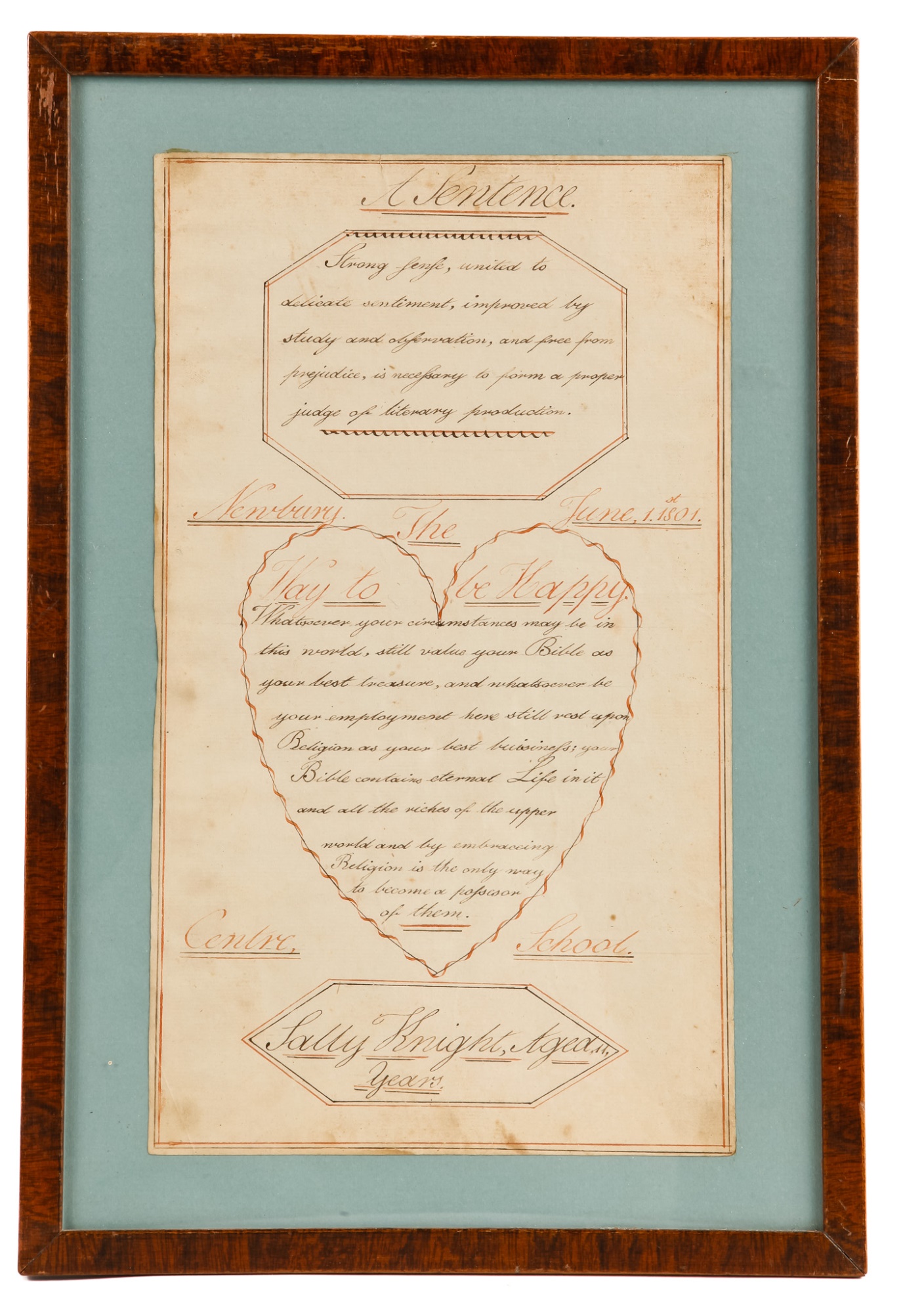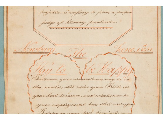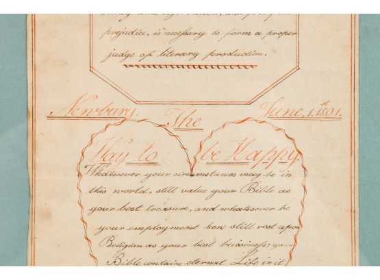 Hand-written script on laid paper, featuring "The Key to be Happy" within a heart-shaped figure. "Newbury Center School, June 1, 1801" In a grain-painted frame, 14 3/4 x 10 inches overall.