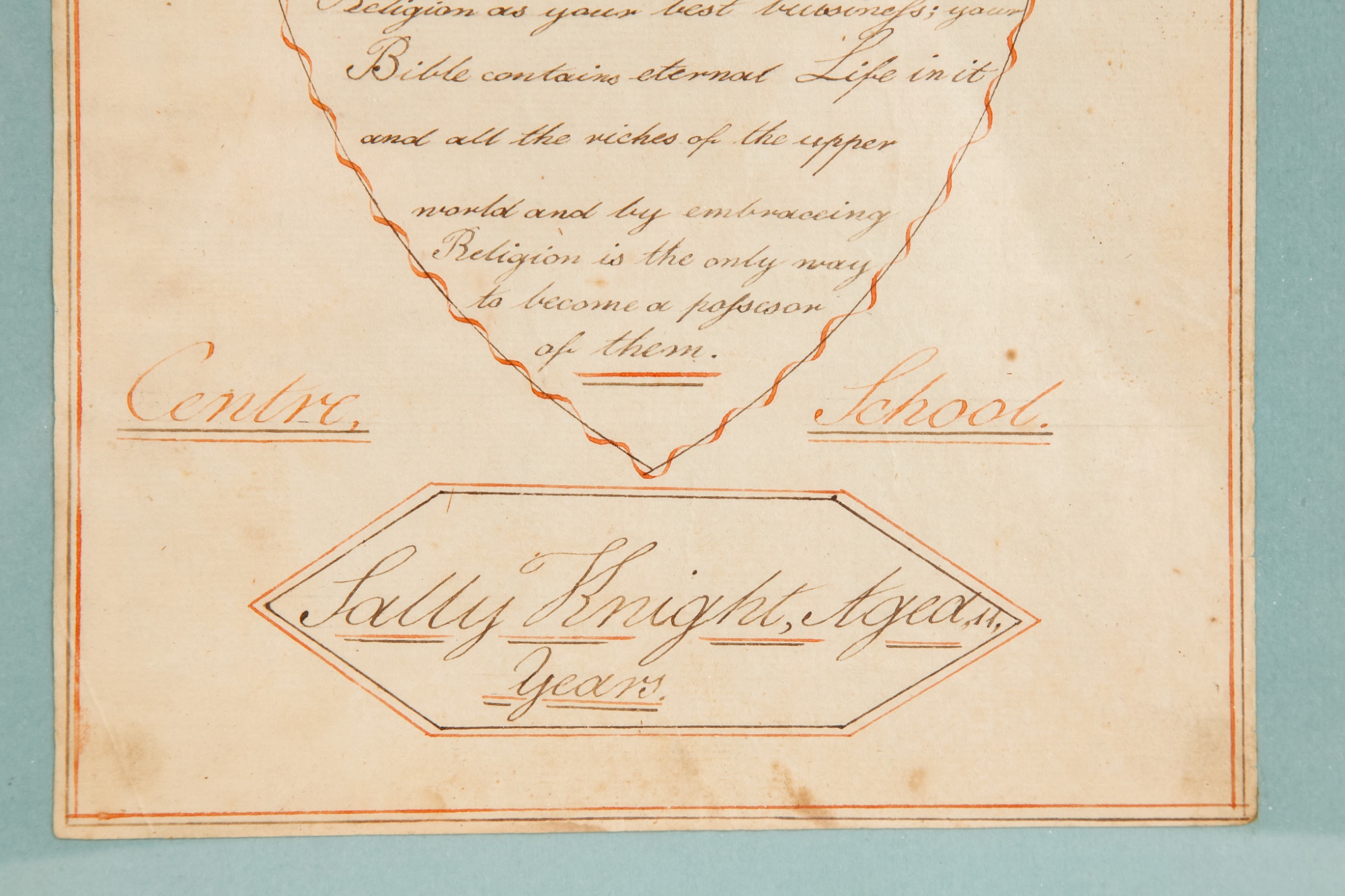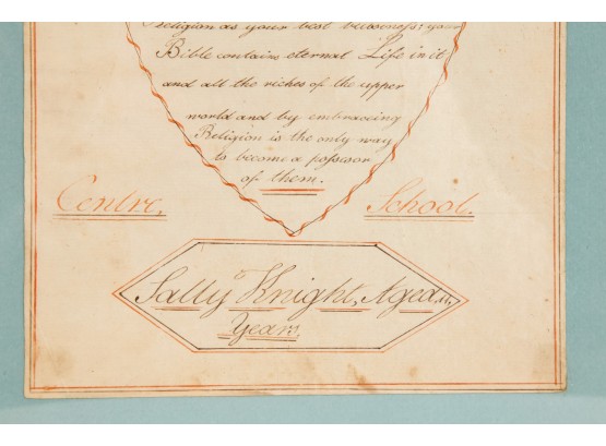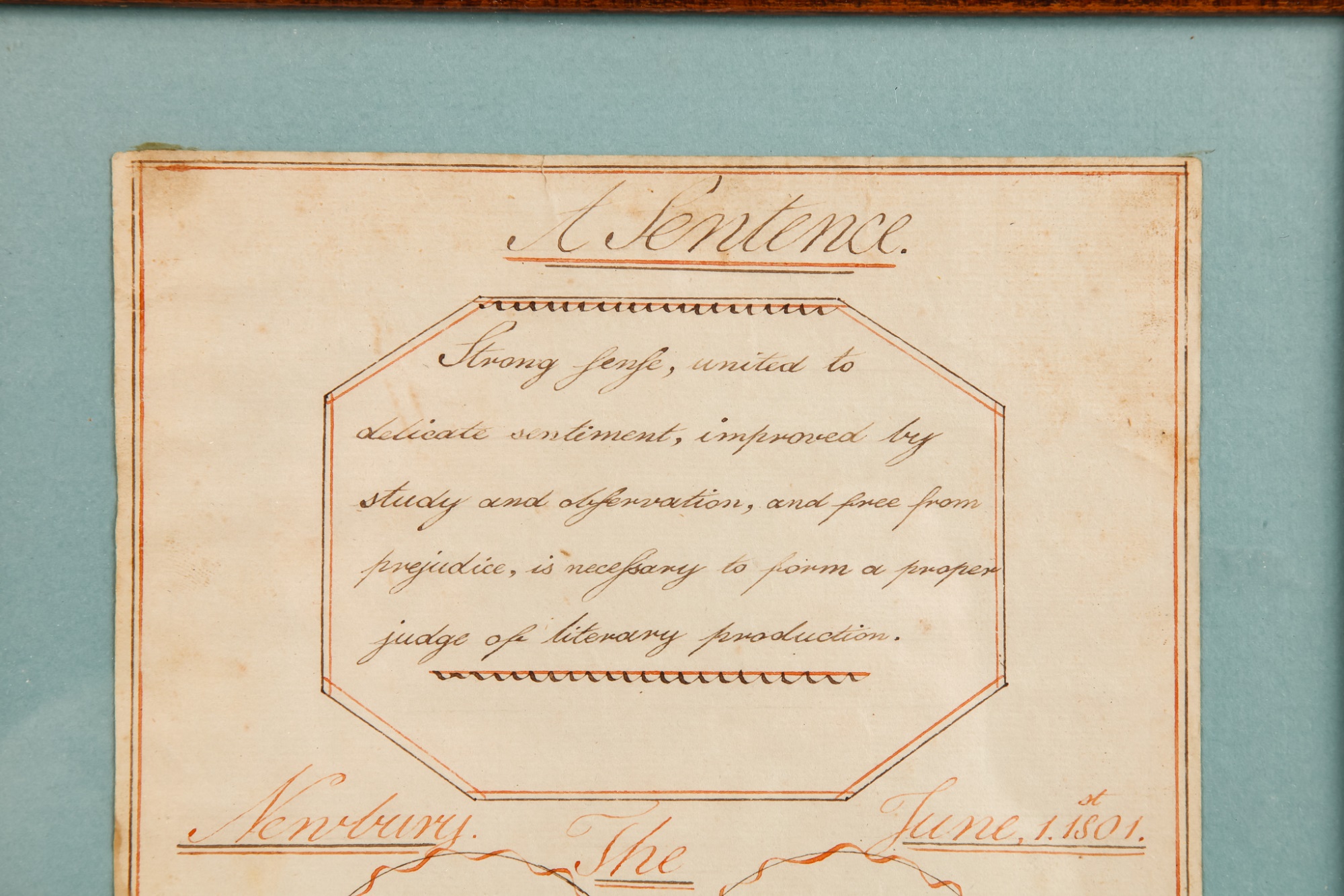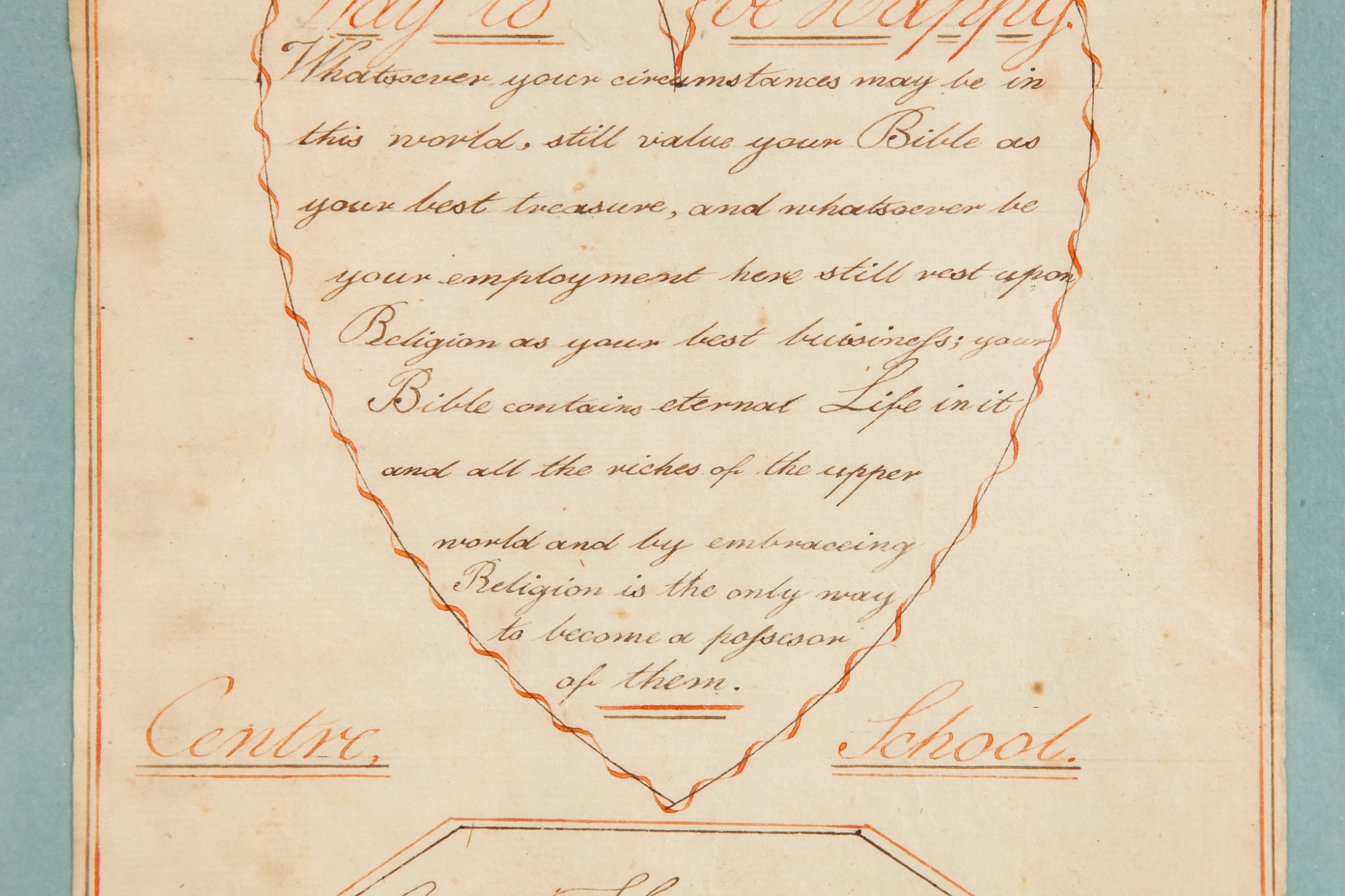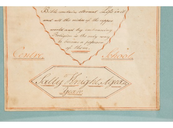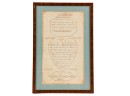 Hand-written script on laid paper, featuring "The Key to be Happy" within a heart-shaped figure. "Newbury Center School, June 1, 1801" In a grain-painted frame, 14 3/4 x 10 inches overall.
