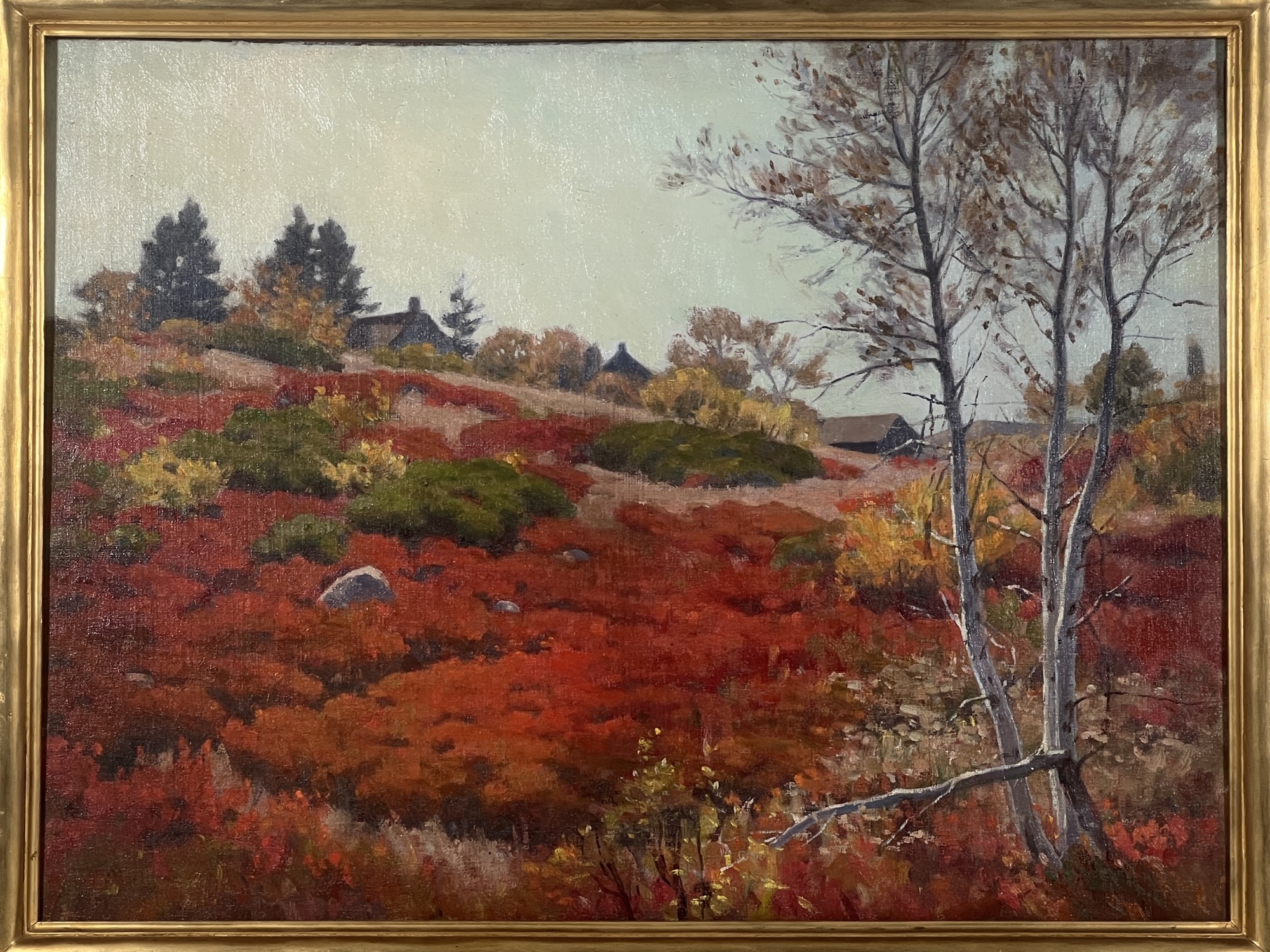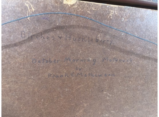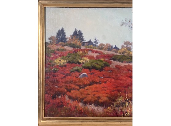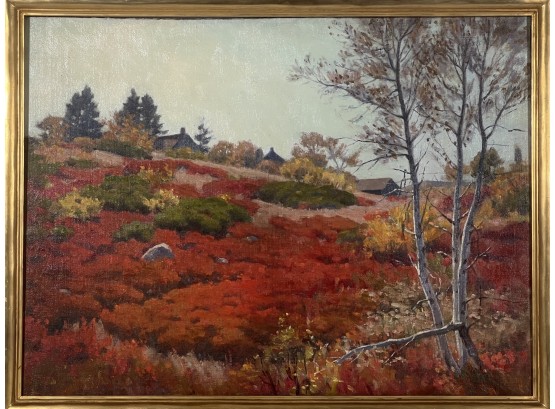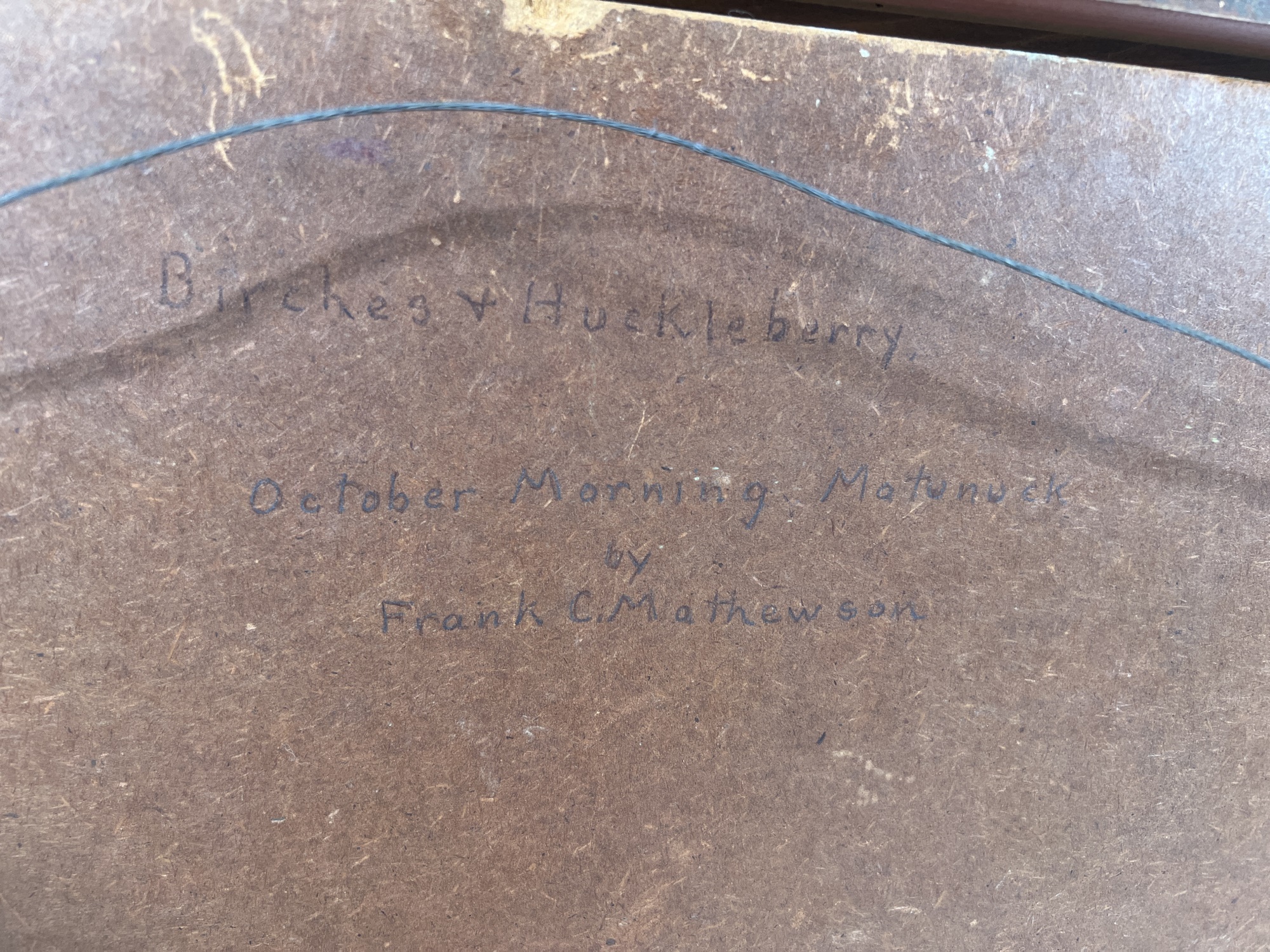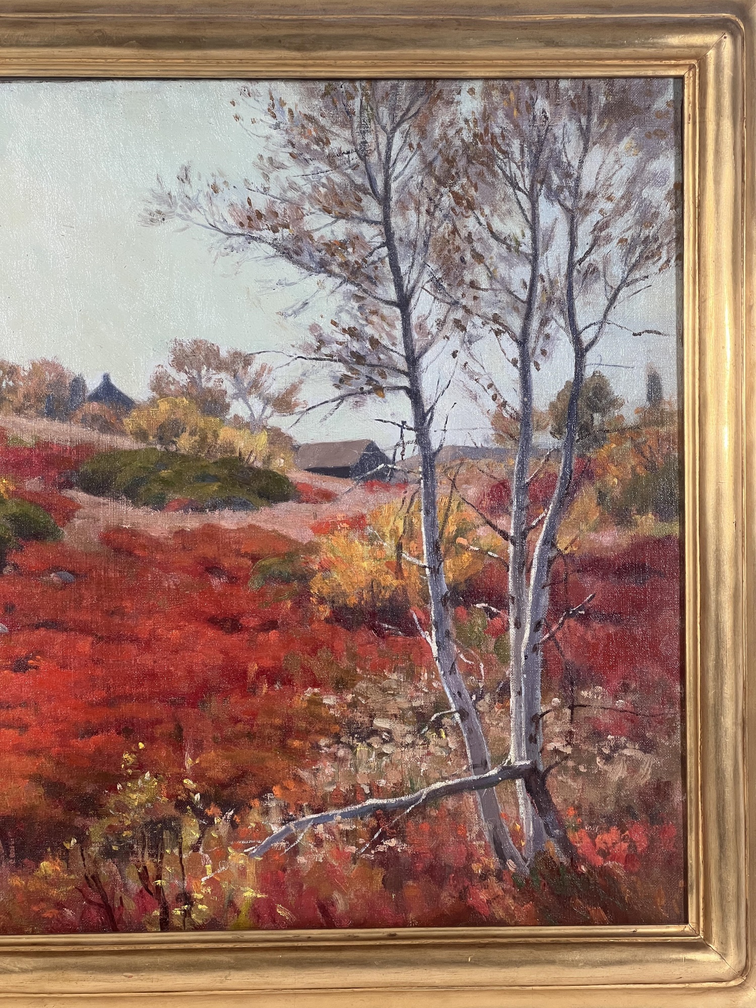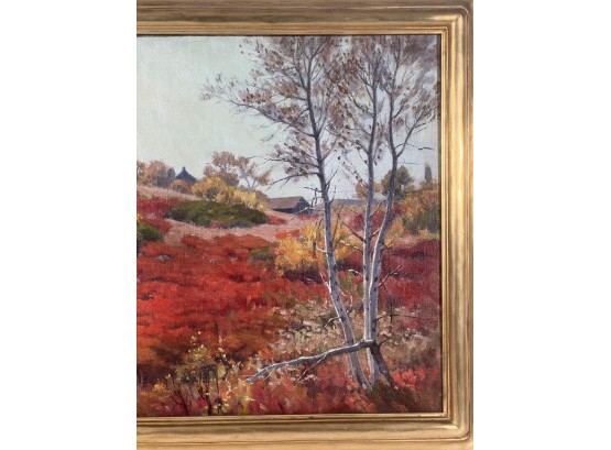 "Birches & Huckleberry - October Morning Matunuck", oil on board 18 x 24 inches, signed & titled verso. 22 x 26 inches overall. Condition: Good, loose in frame. Temp No 8846