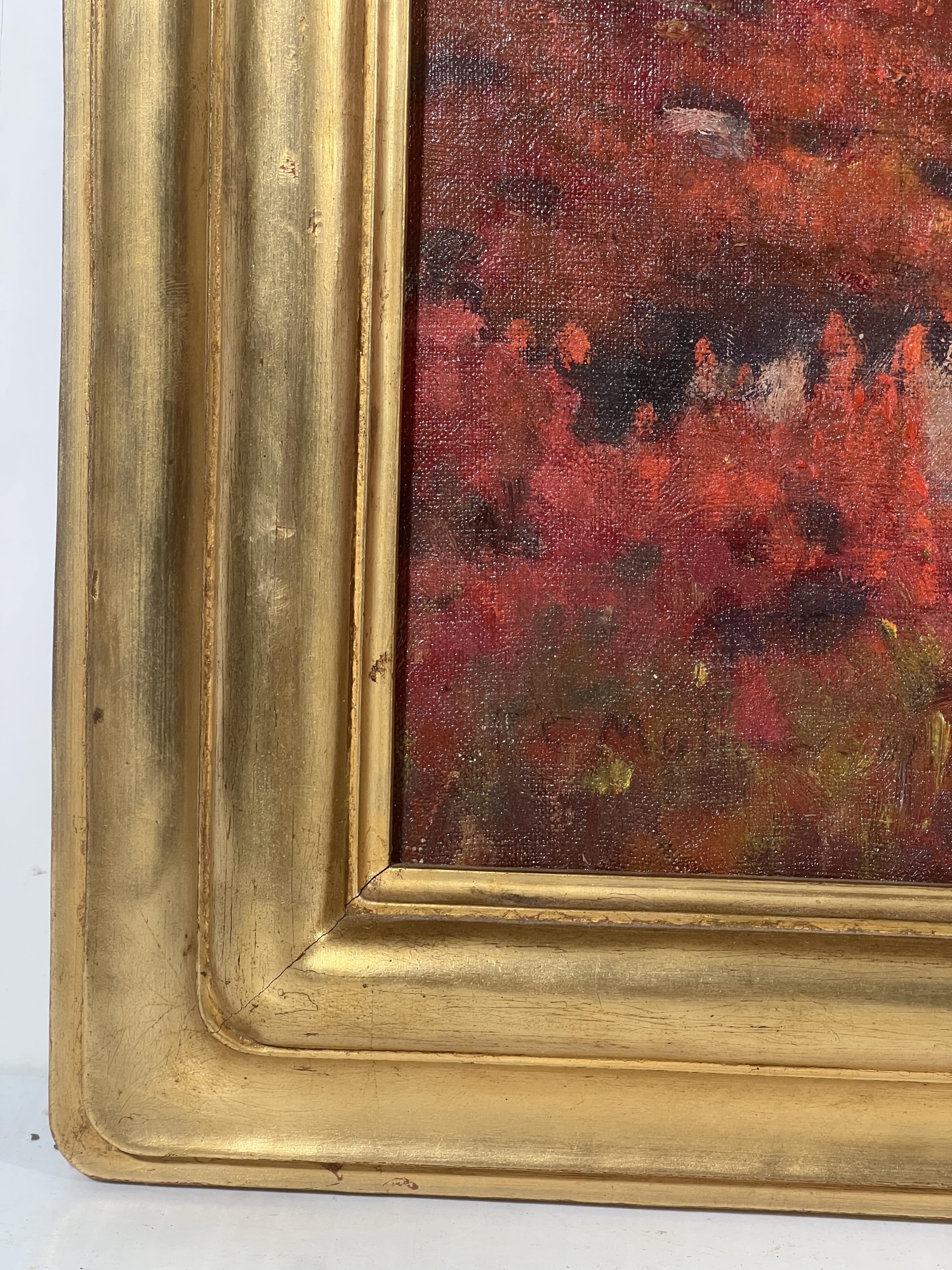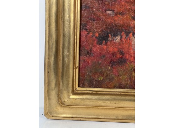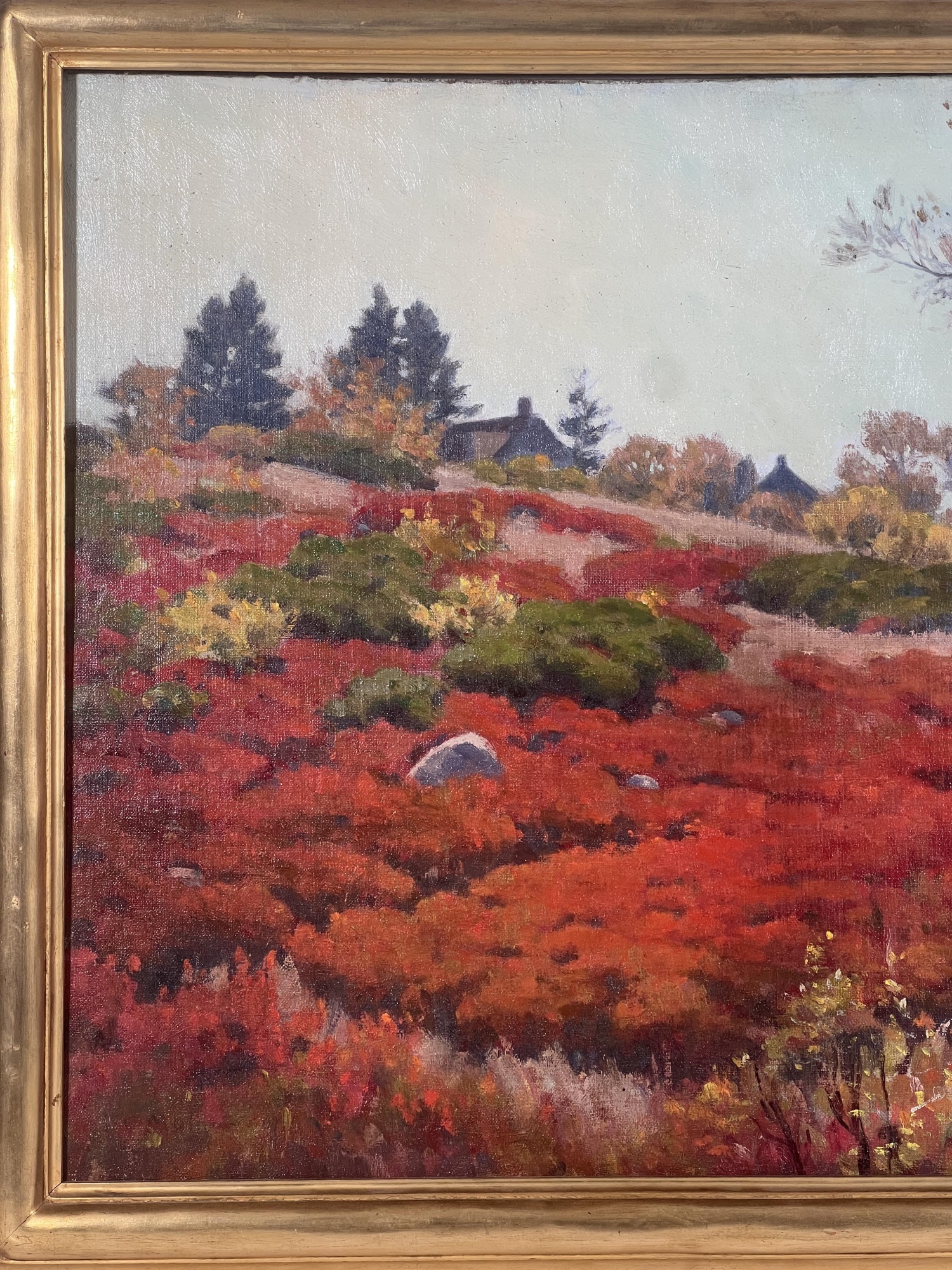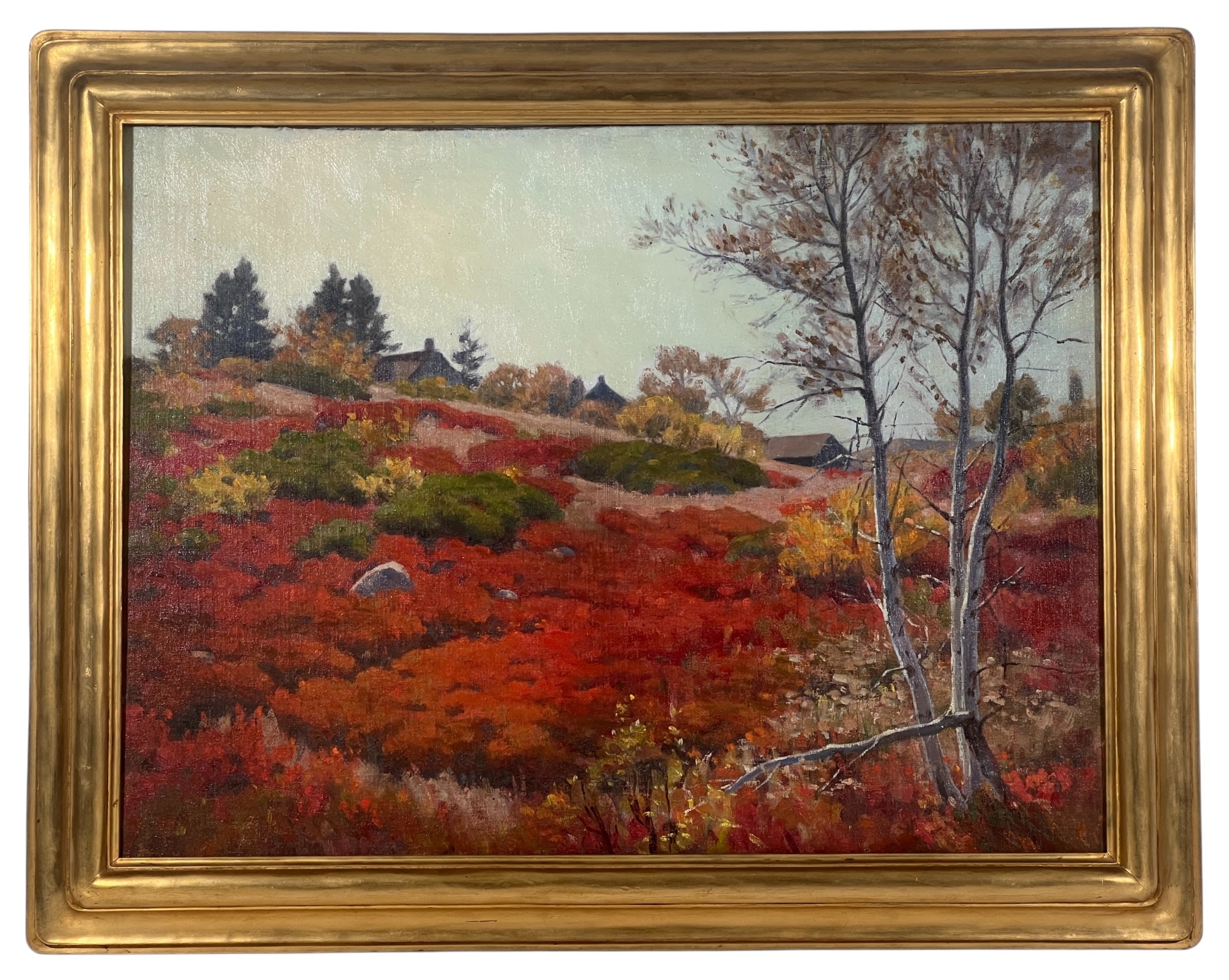 "Birches & Huckleberry - October Morning Matunuck", oil on board 18 x 24 inches, signed & titled verso. 22 x 26 inches overall. Condition: Good, loose in frame. Temp No 8846