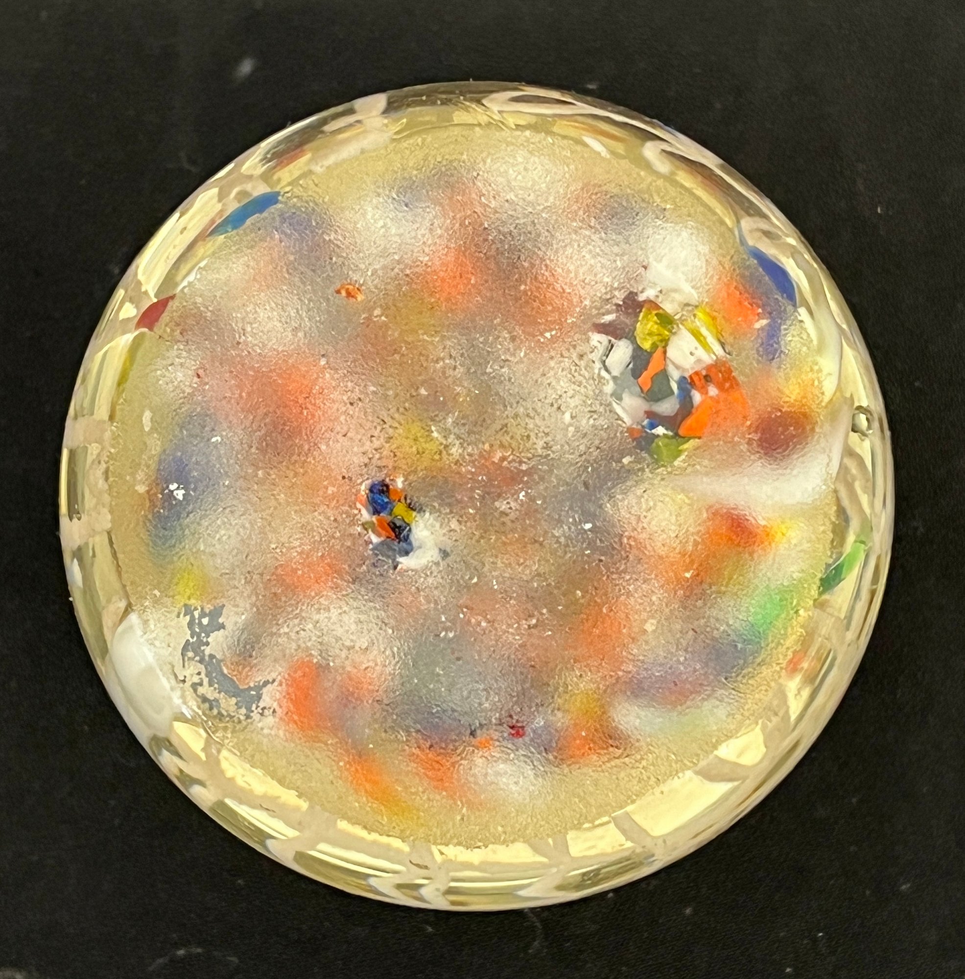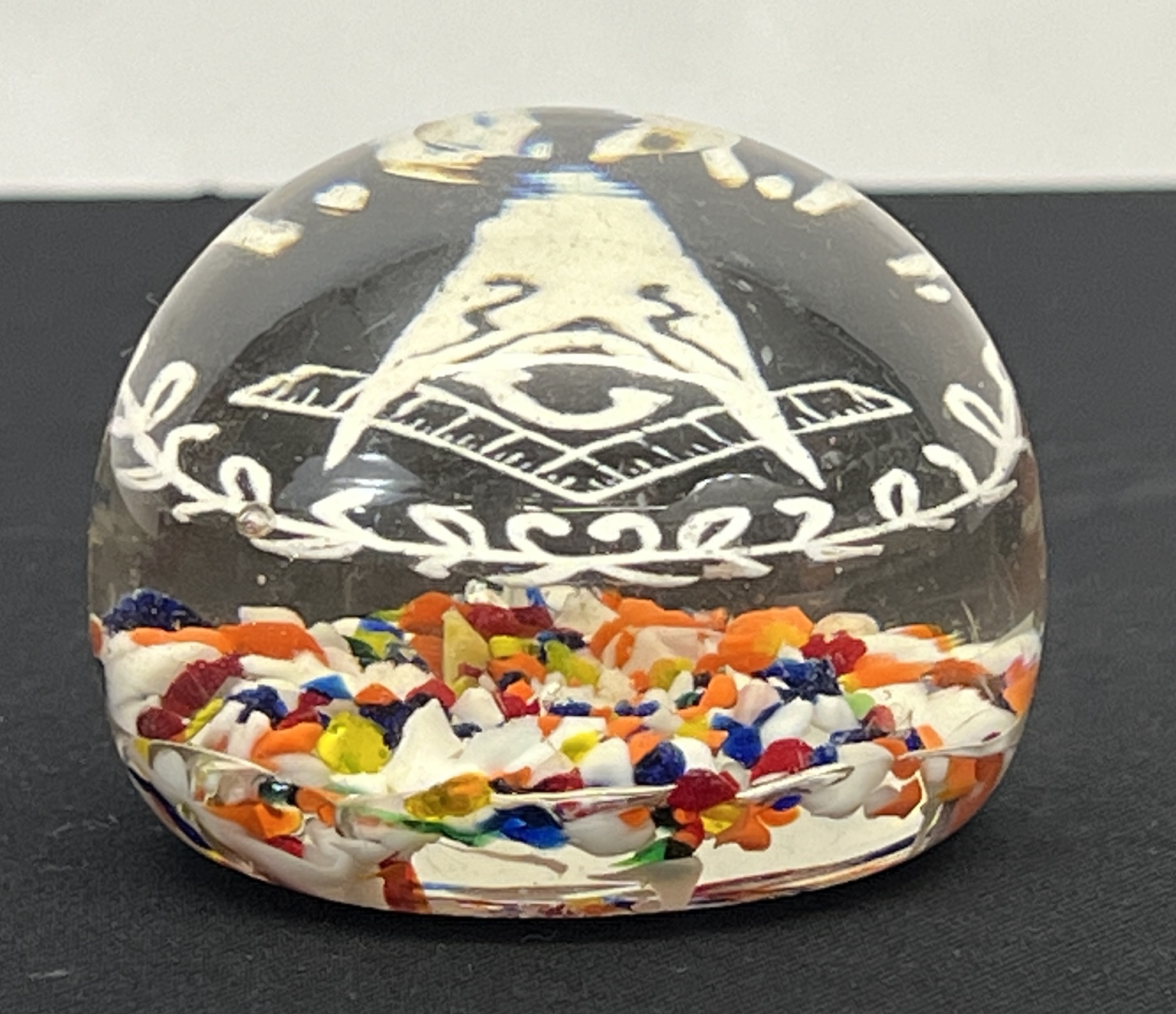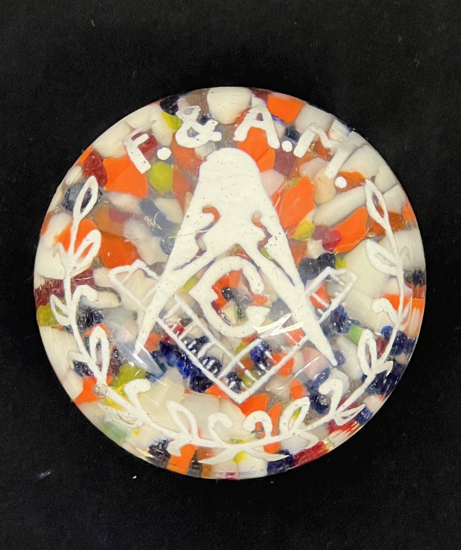 Scramble glass floor with floating insignia of the Free & Accepted Masons. 1 3/4 x 2 3/4 inches.