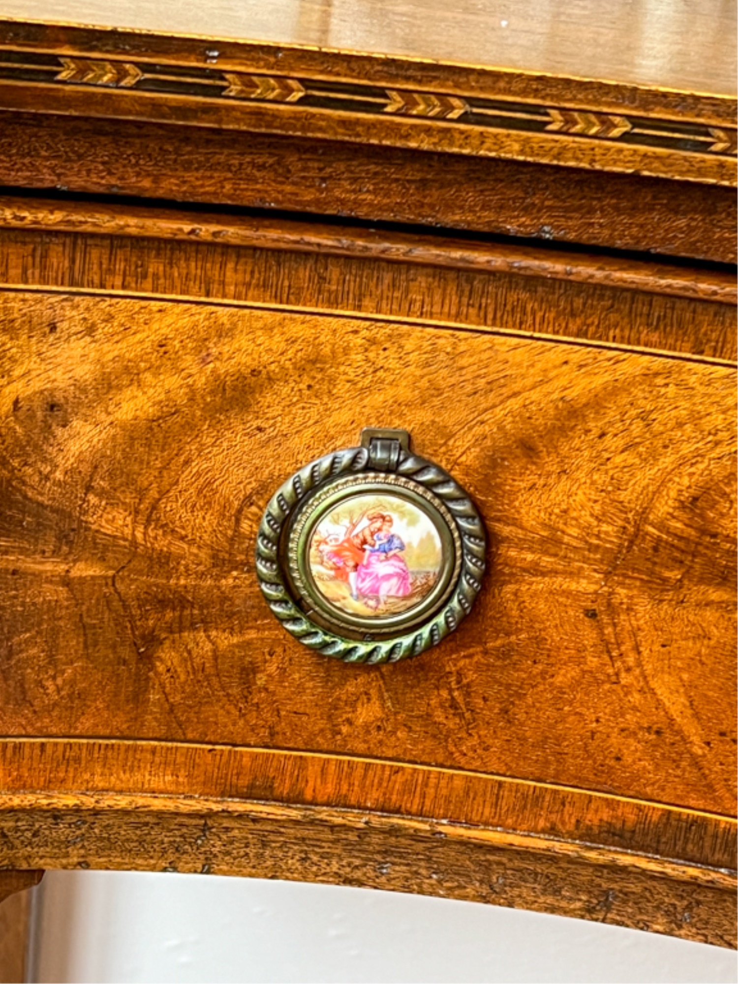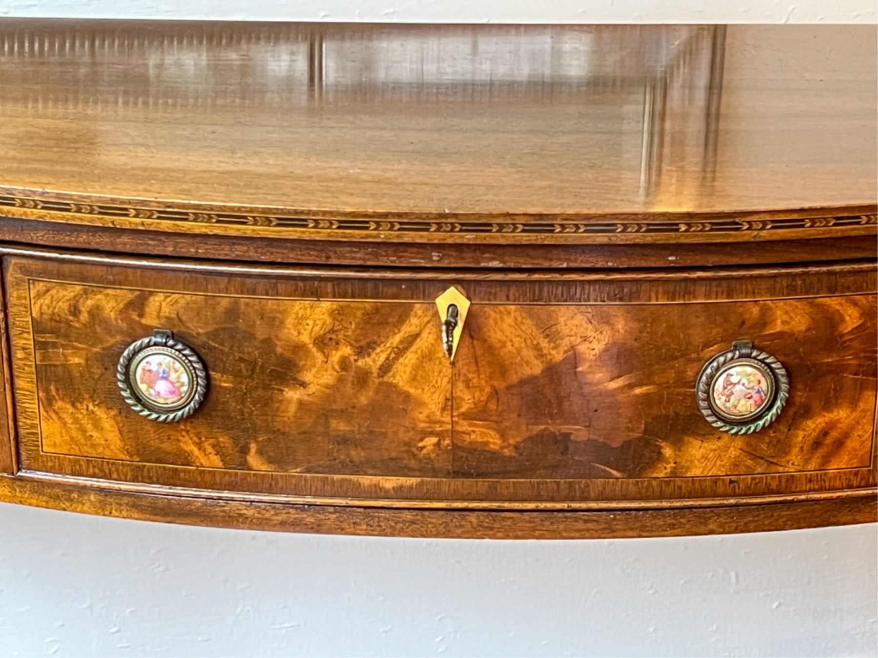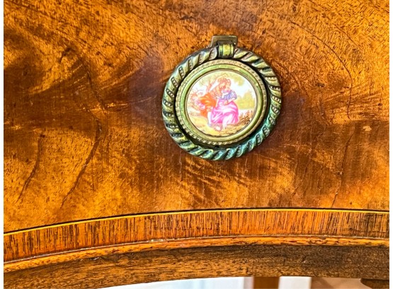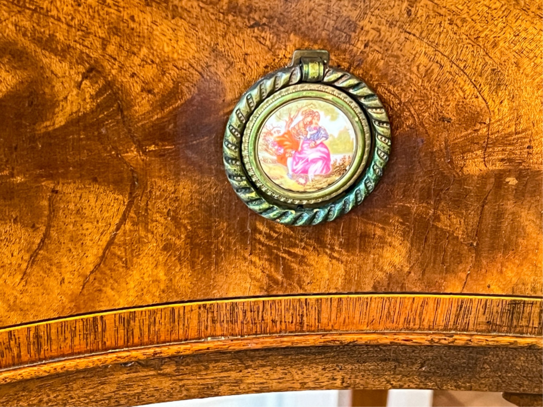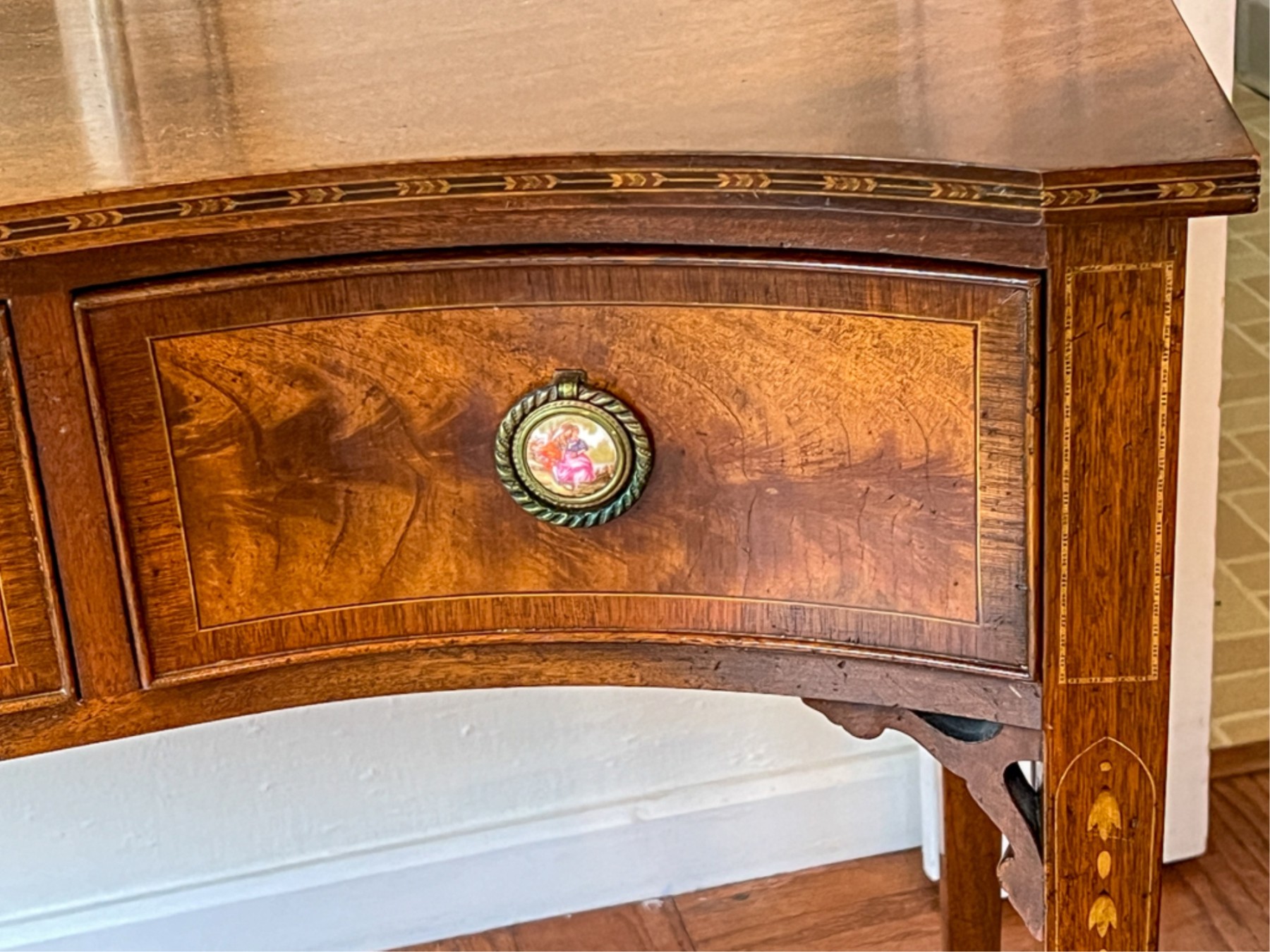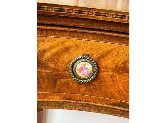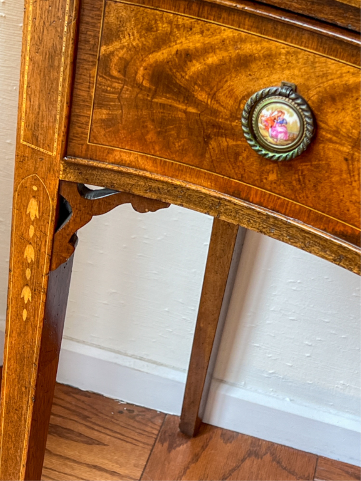 Serpentine console table With bellflower inlay, painted porcelain pulls with romantic French scenes on tapered legs with pierced accents. 32 1/2 x 52 x 19 1/2 inches.