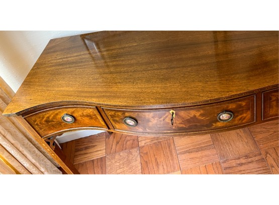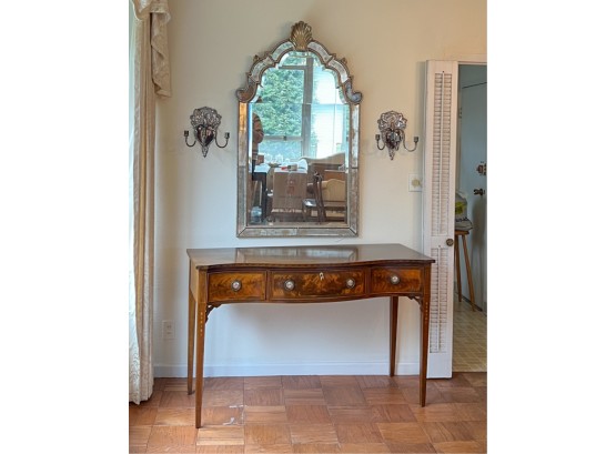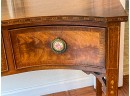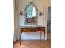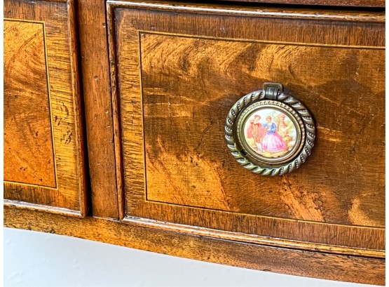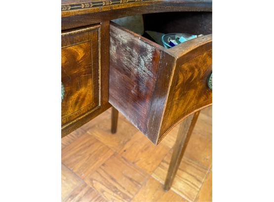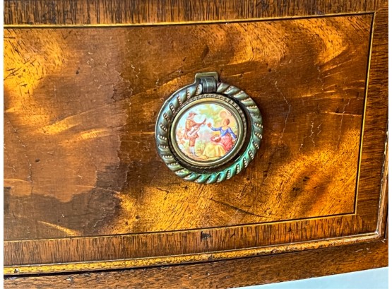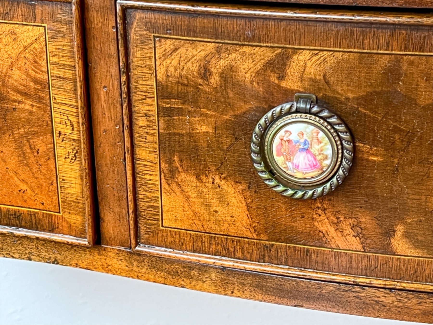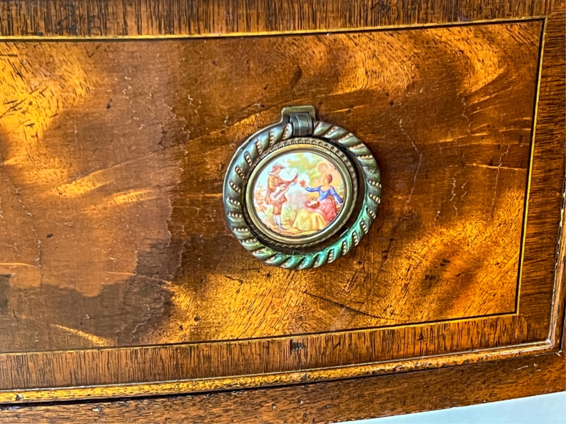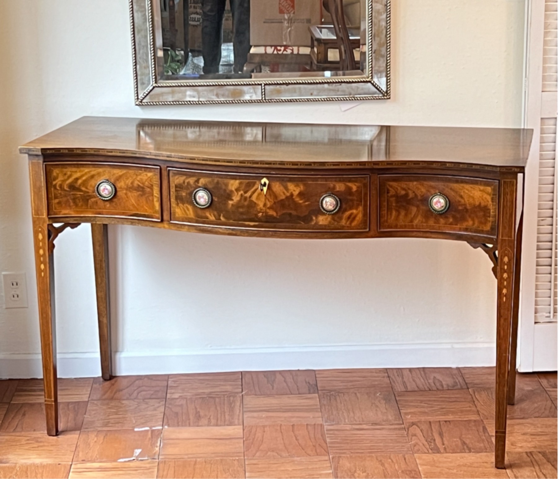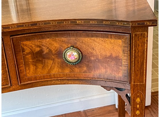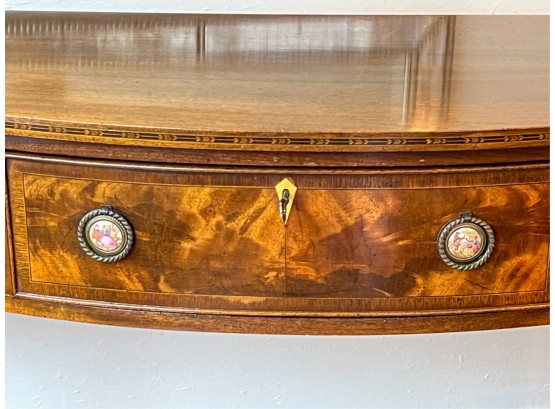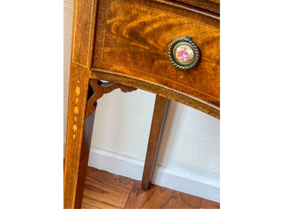 Serpentine console table With bellflower inlay, painted porcelain pulls with romantic French scenes on tapered legs with pierced accents. 32 1/2 x 52 x 19 1/2 inches.