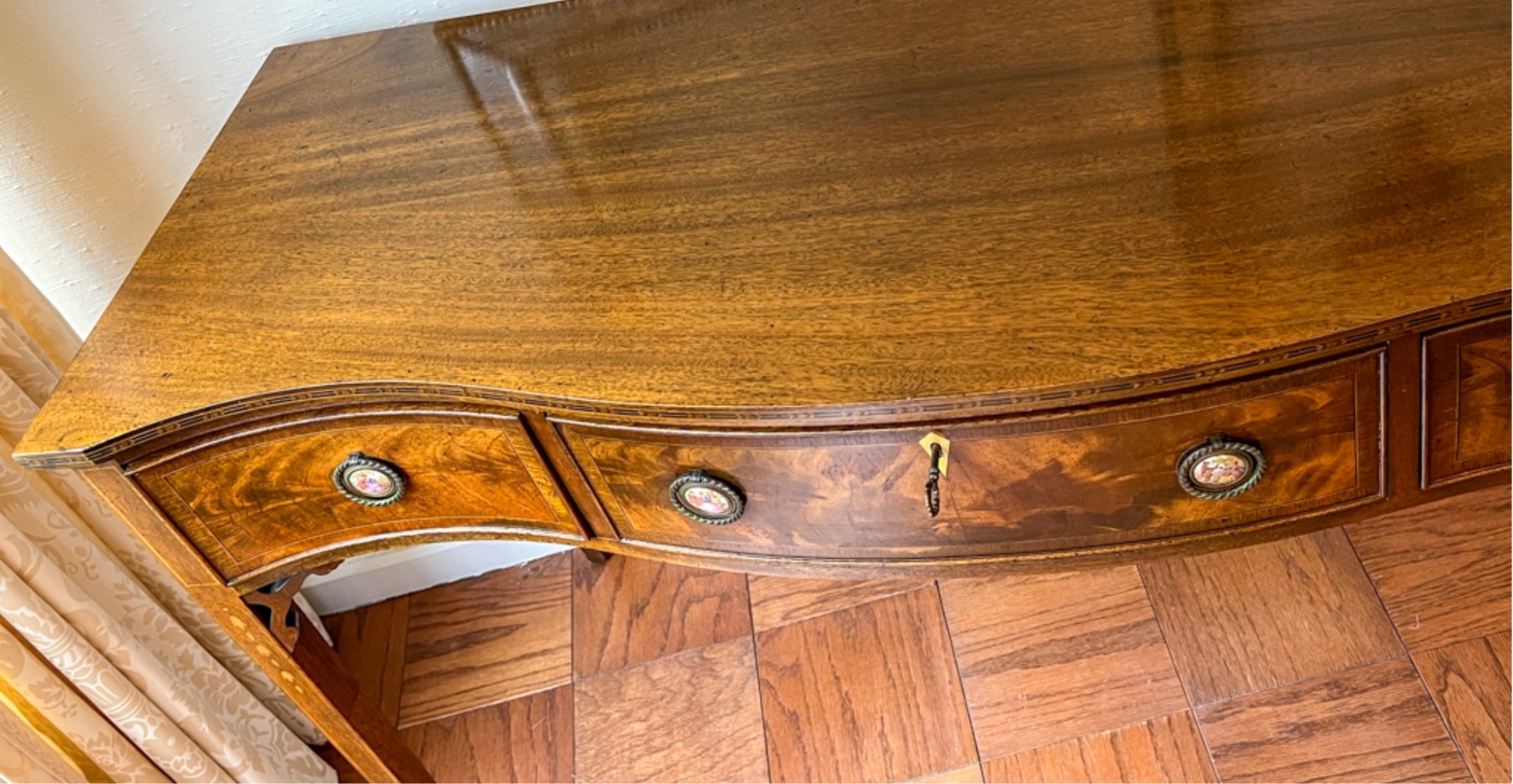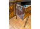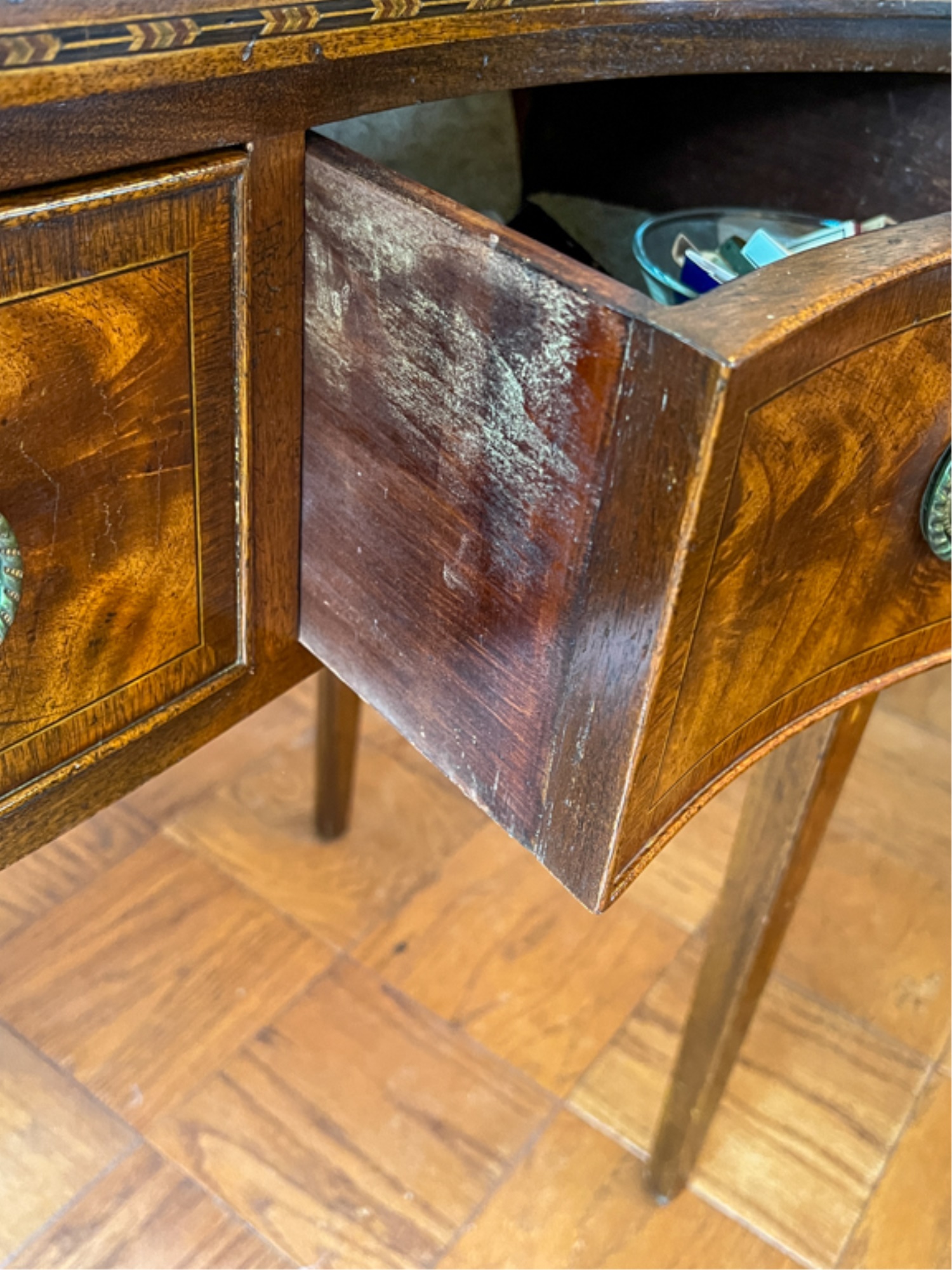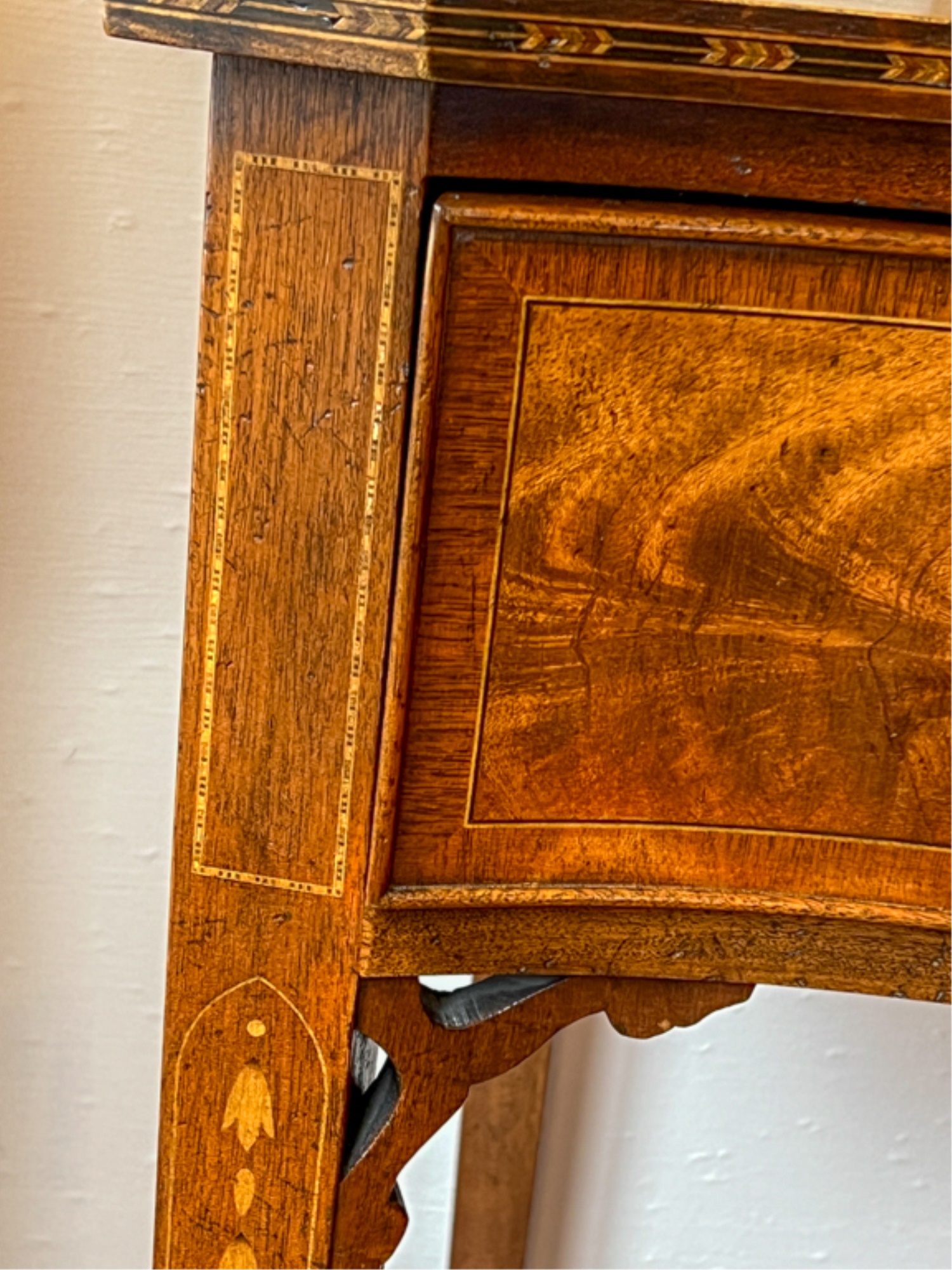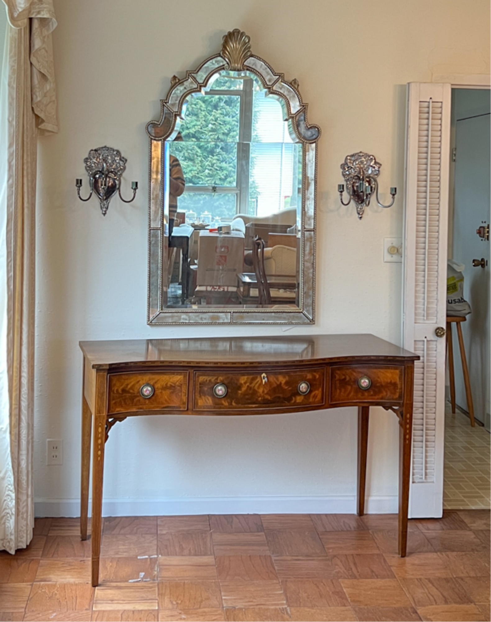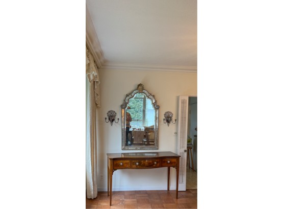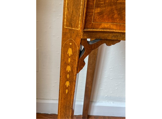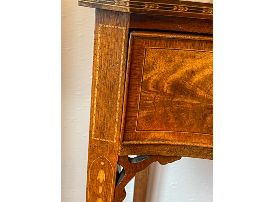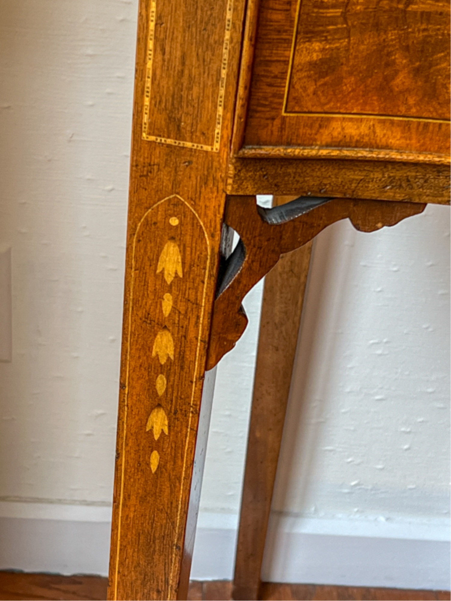 Serpentine console table With bellflower inlay, painted porcelain pulls with romantic French scenes on tapered legs with pierced accents. 32 1/2 x 52 x 19 1/2 inches.