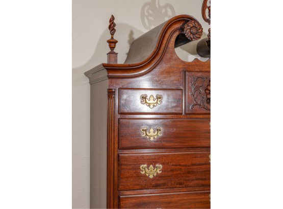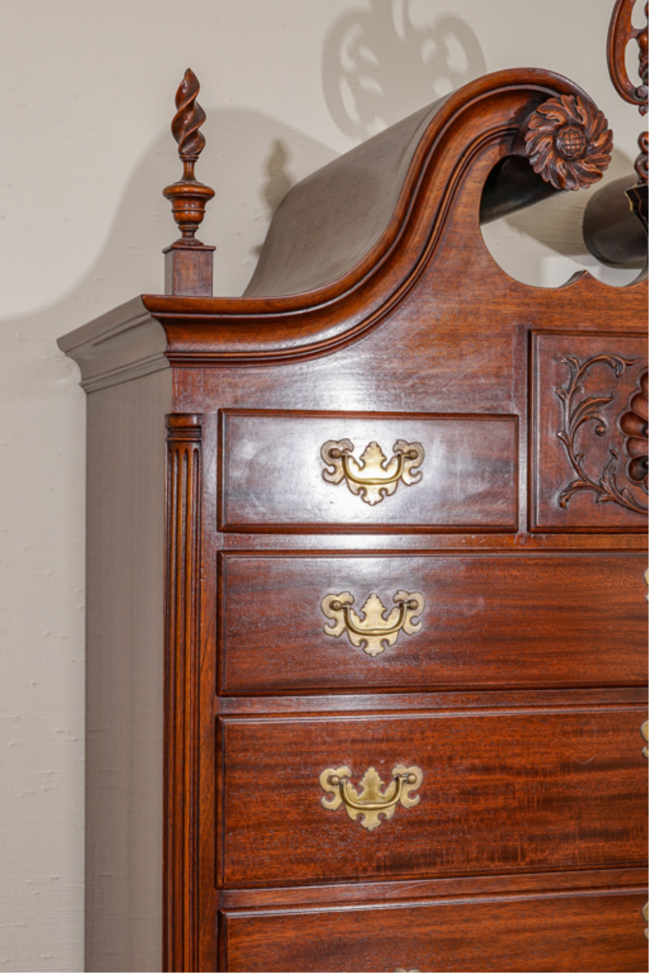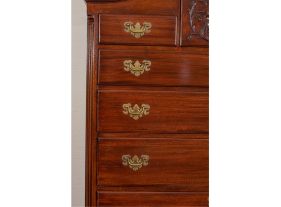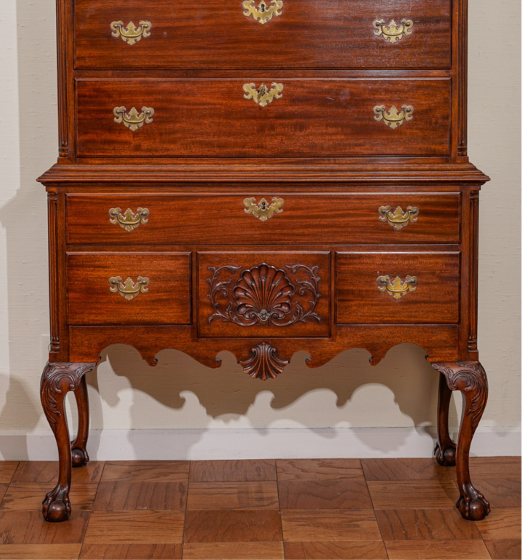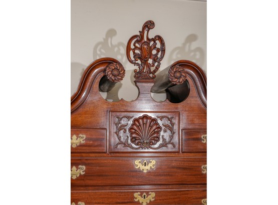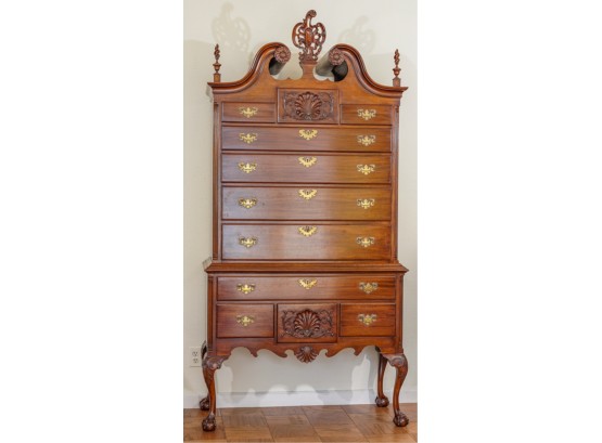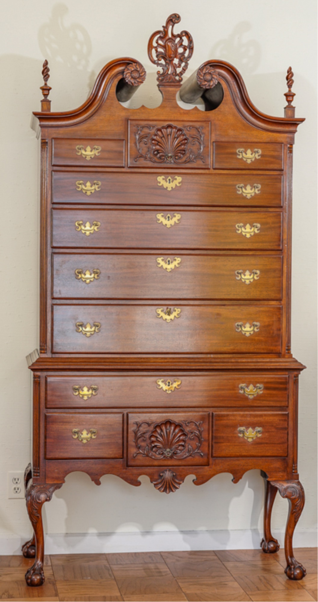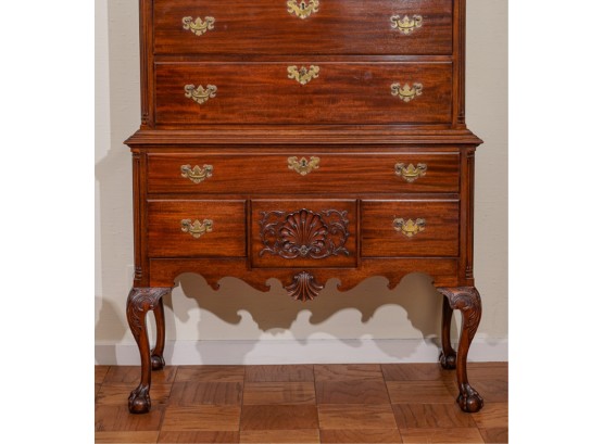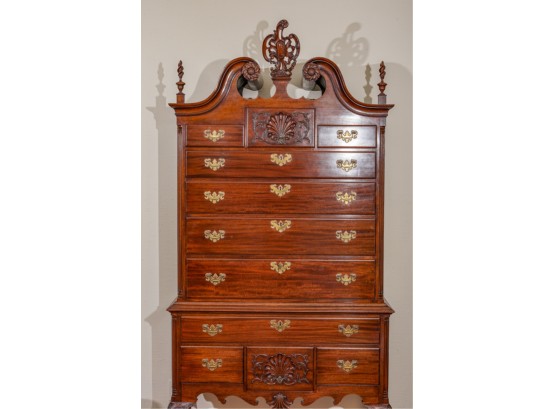 Chippendale style highboys with carved and pierced finial, shell design and brass pulls. On ball and claw feet. 81 x 41 1/2 x 20 inches.