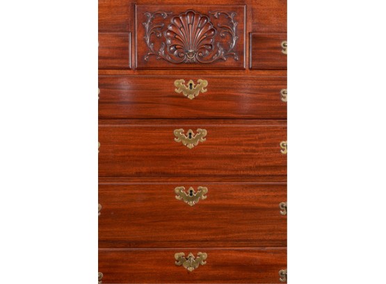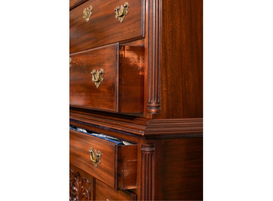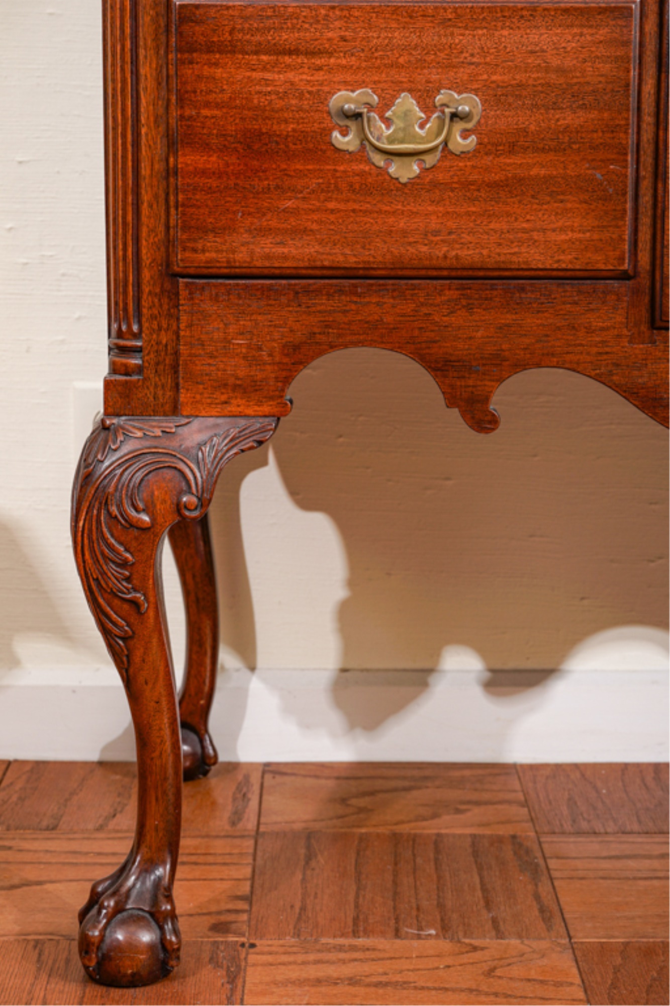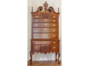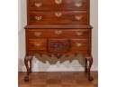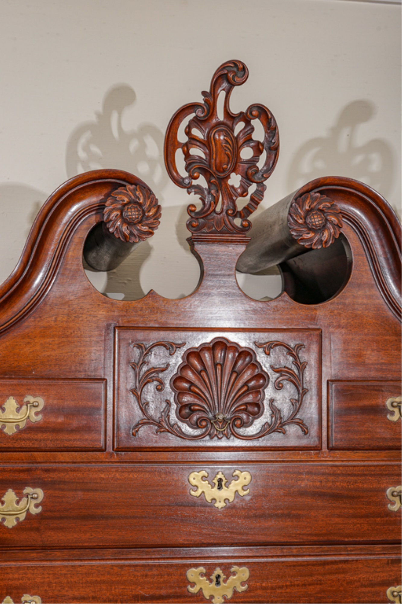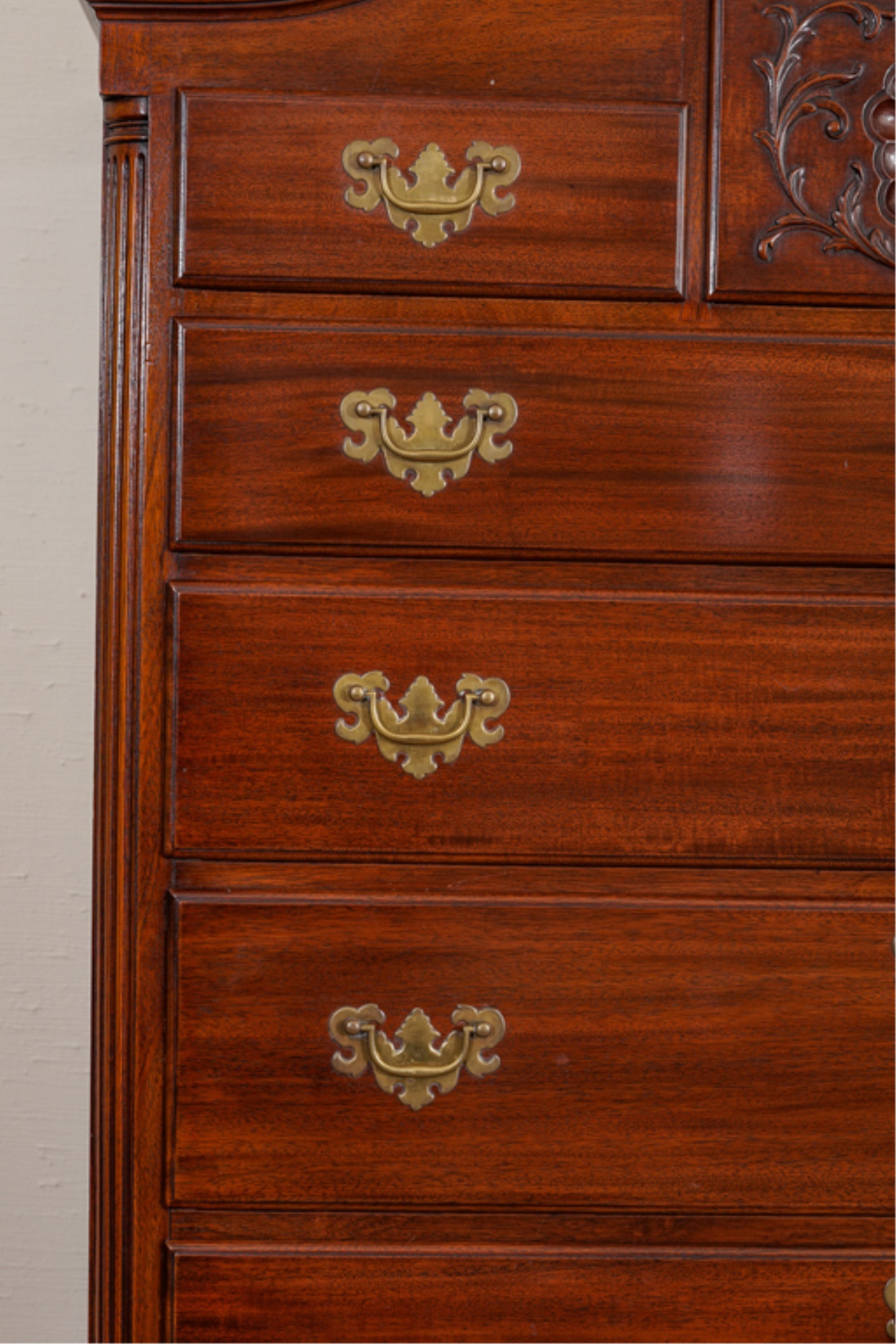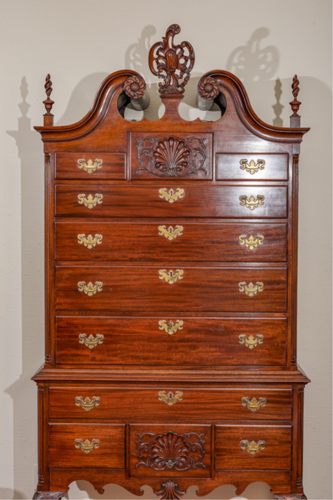 Chippendale style highboys with carved and pierced finial, shell design and brass pulls. On ball and claw feet. 81 x 41 1/2 x 20 inches.