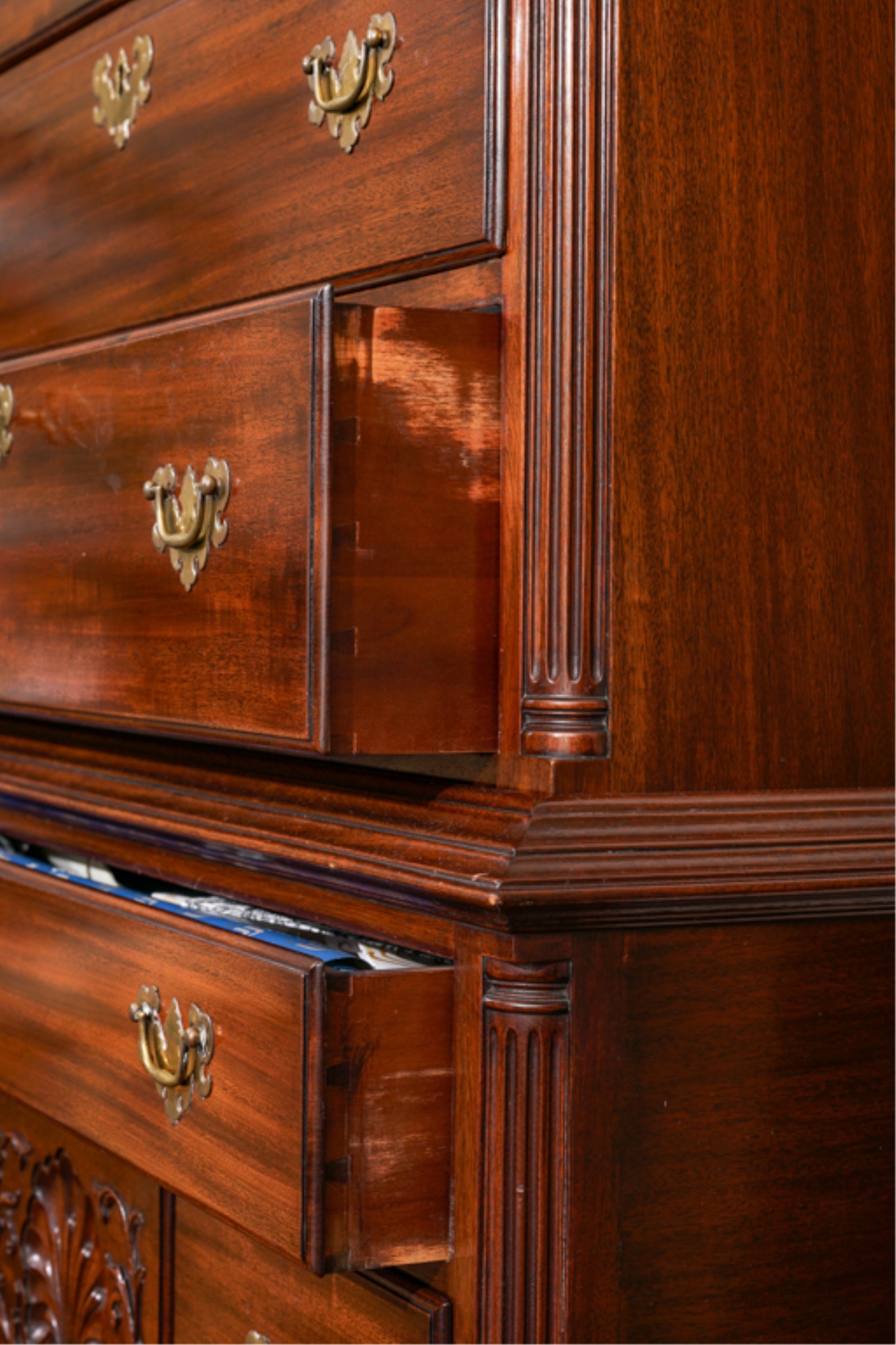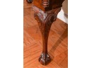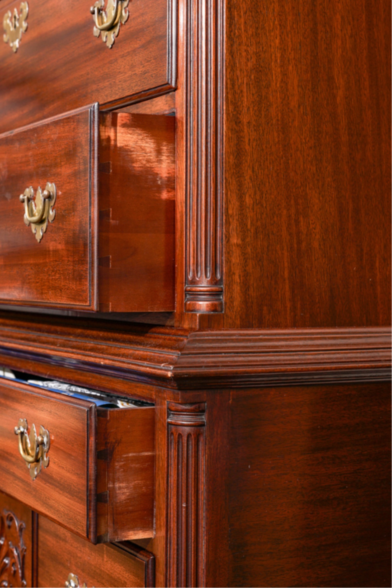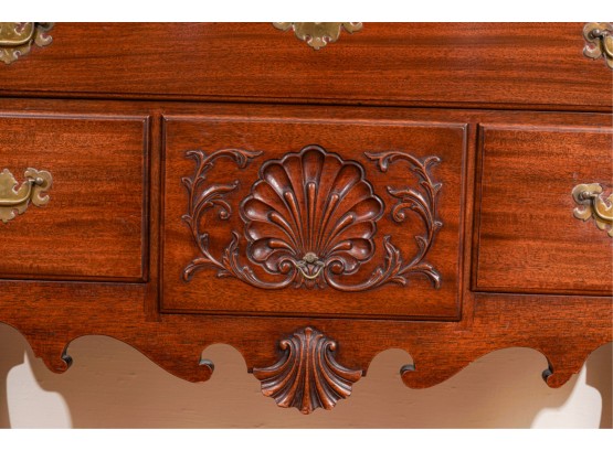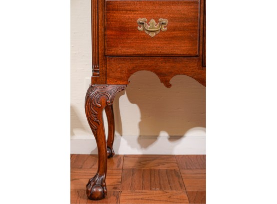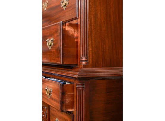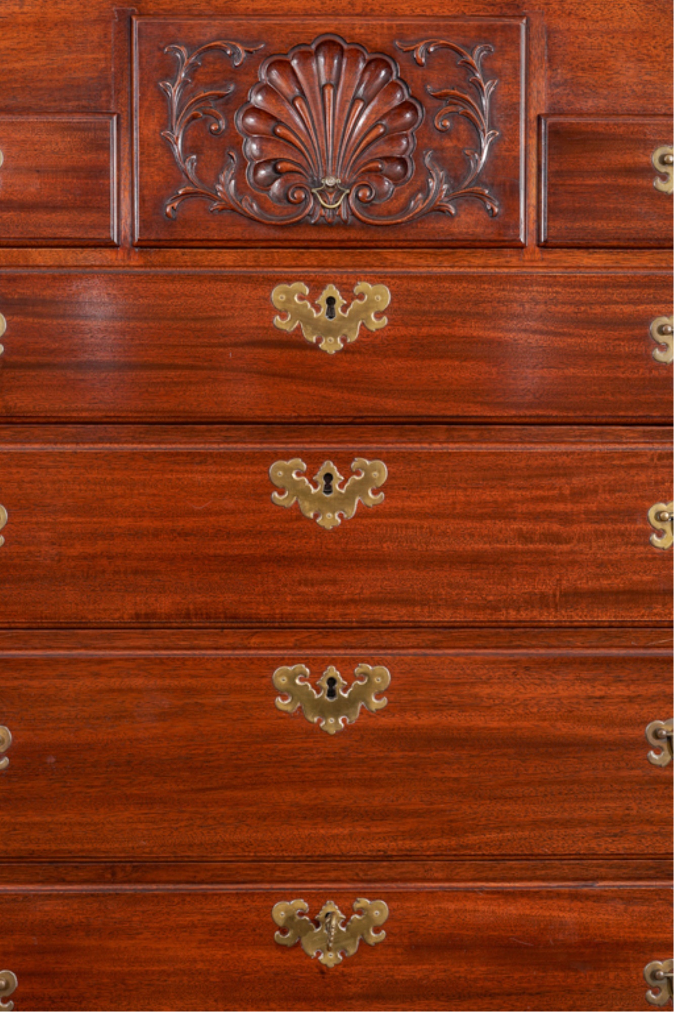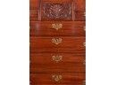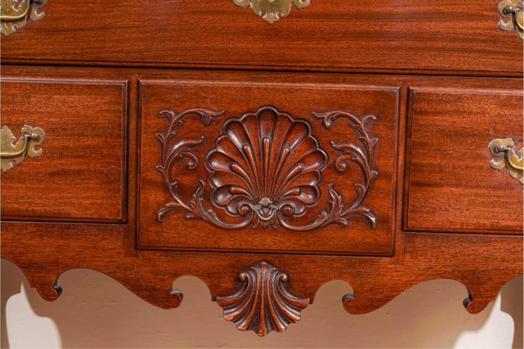 Chippendale style highboys with carved and pierced finial, shell design and brass pulls. On ball and claw feet. 81 x 41 1/2 x 20 inches.