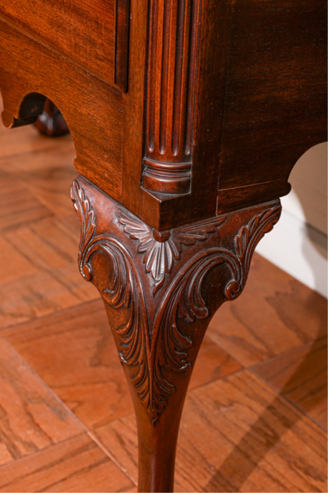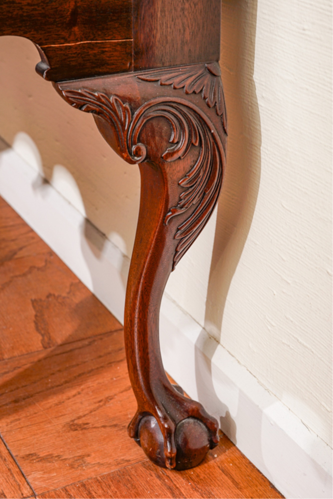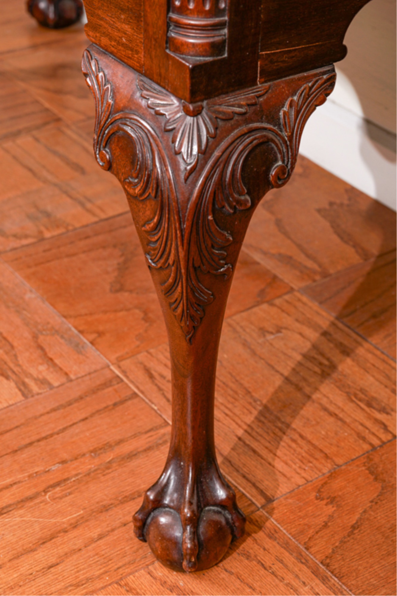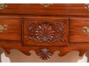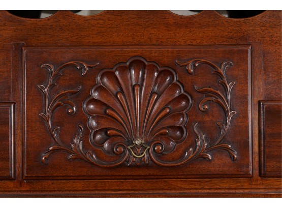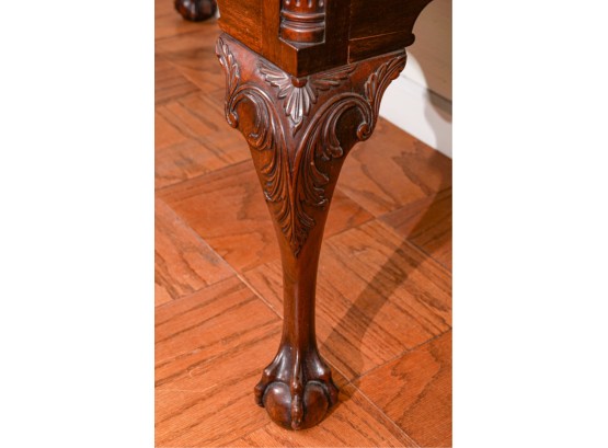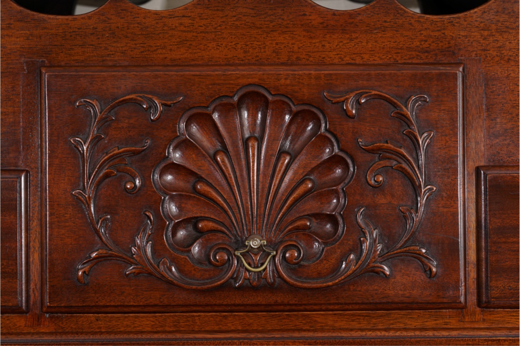 Chippendale style highboys with carved and pierced finial, shell design and brass pulls. On ball and claw feet. 81 x 41 1/2 x 20 inches.