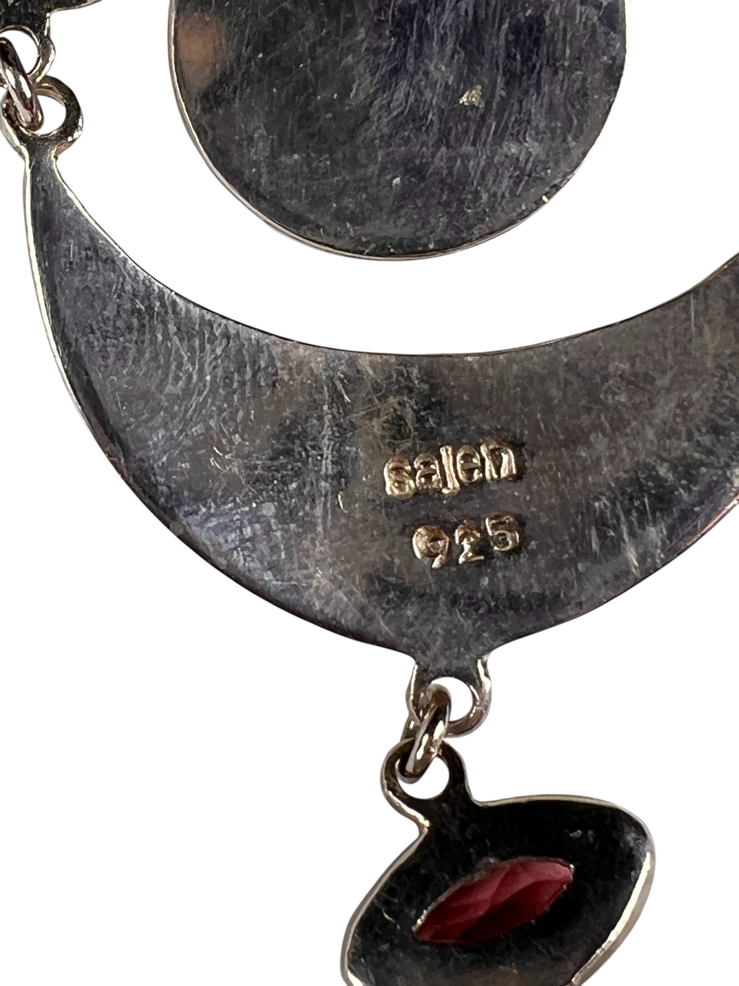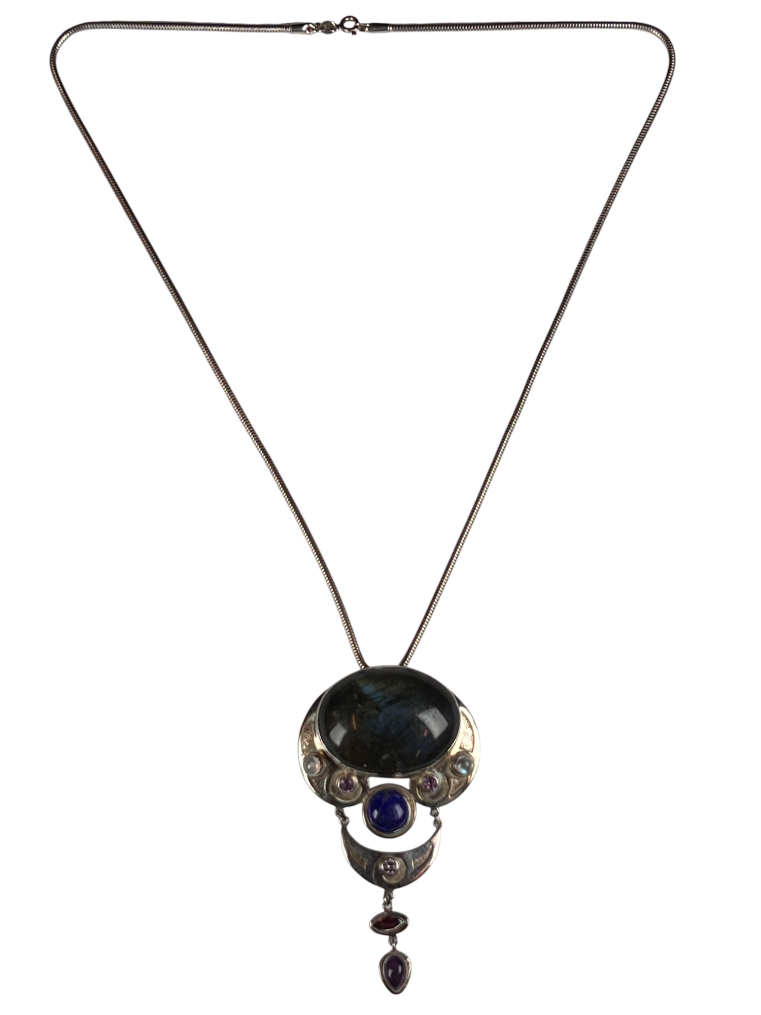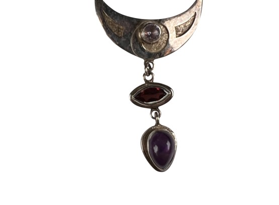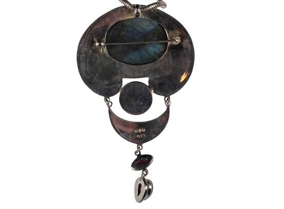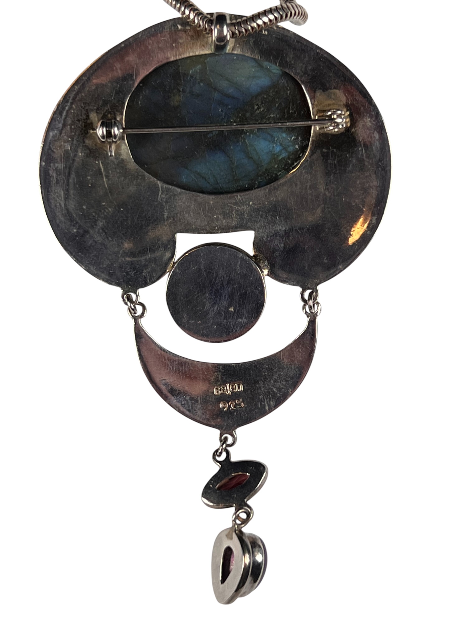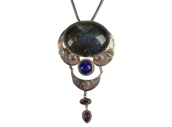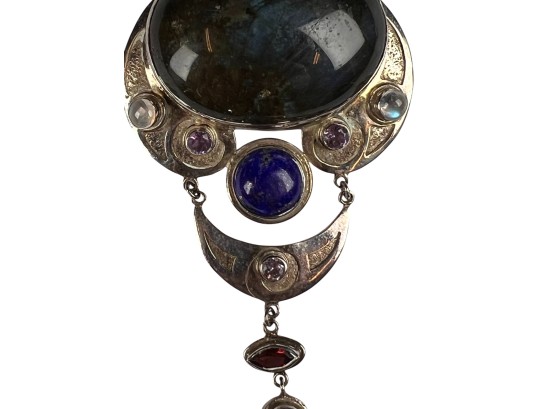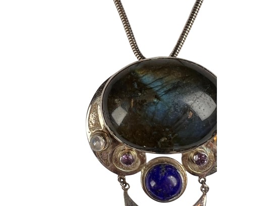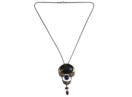 Sterling silver chain and pendant with interesting mounted stones. Marked Sajen 925. Pendant 3 5/8" total length Condition: Good, used