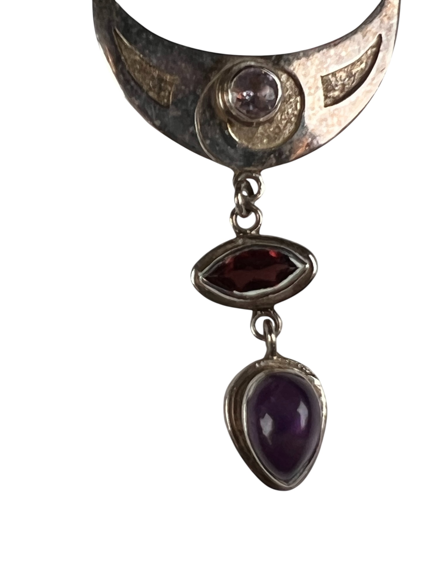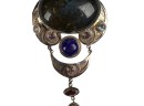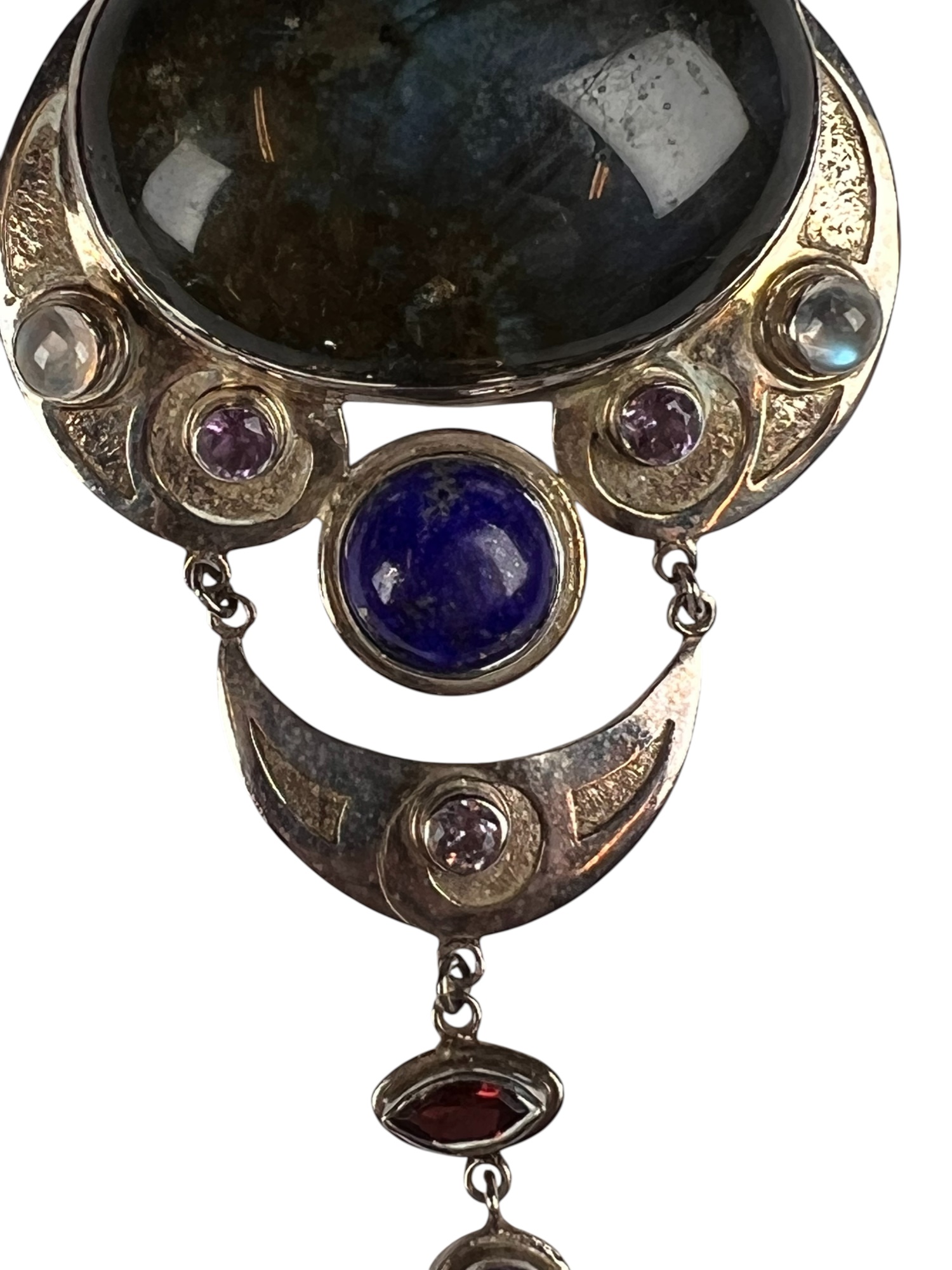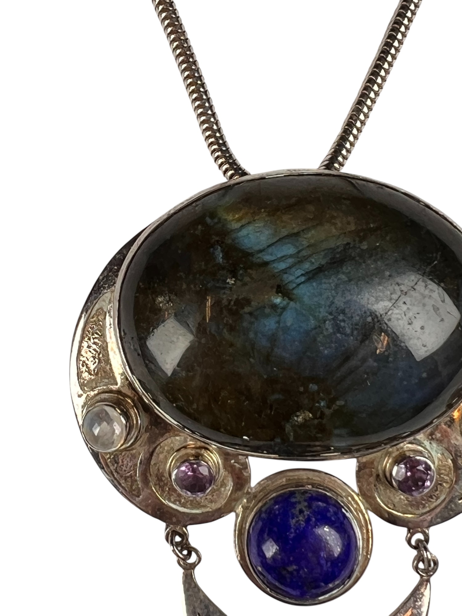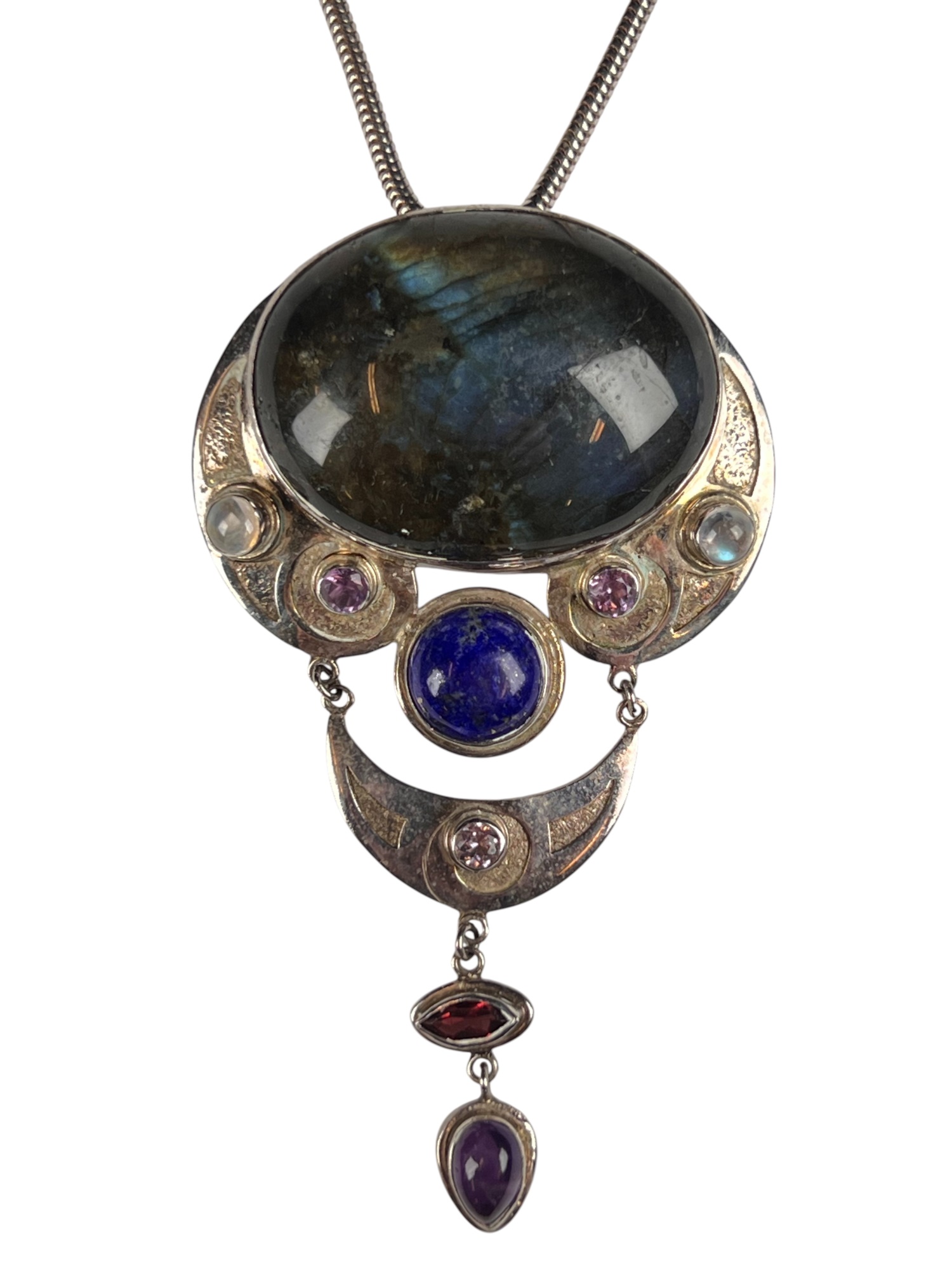 Sterling silver chain and pendant with interesting mounted stones. Marked Sajen 925. Pendant 3 5/8" total length Condition: Good, used