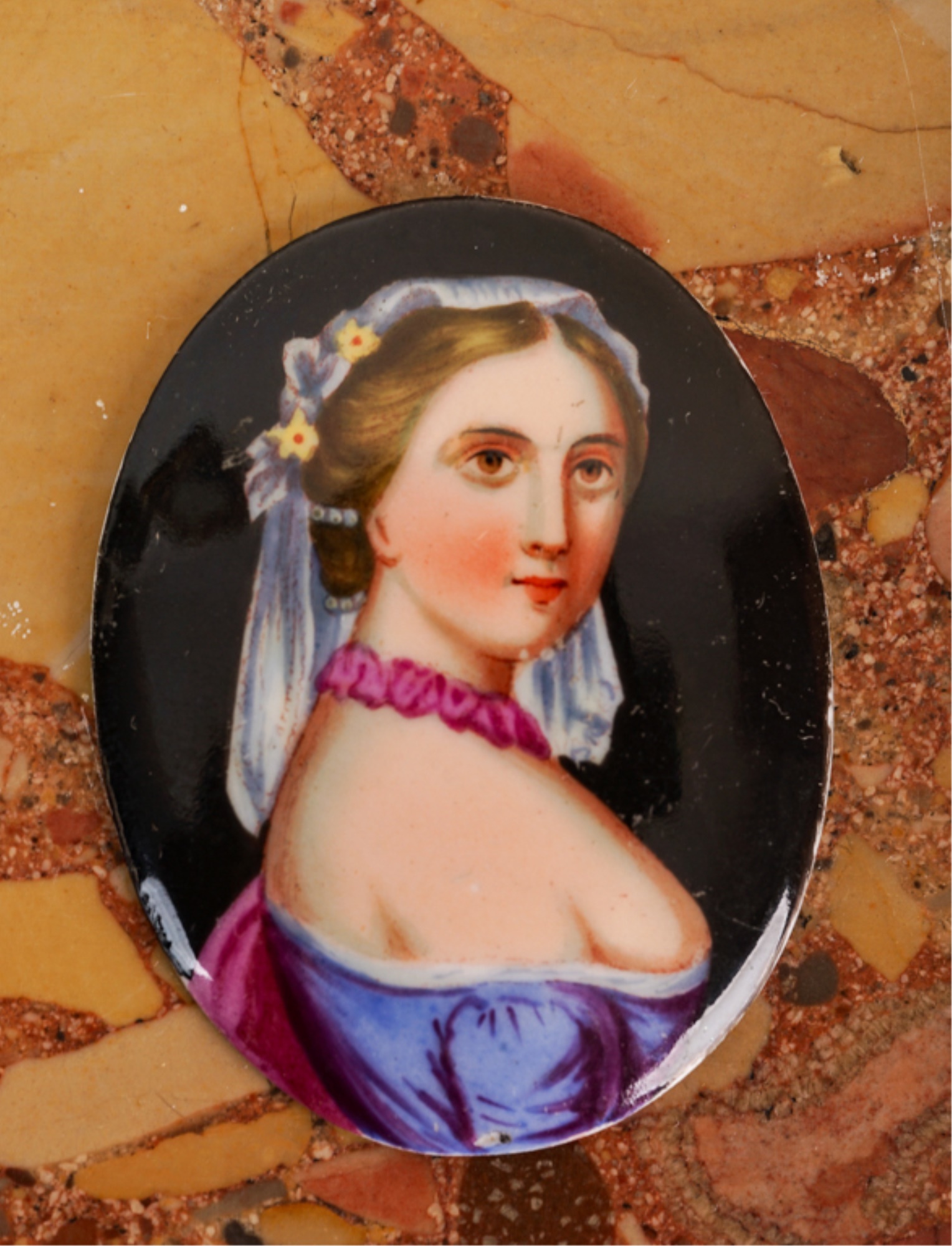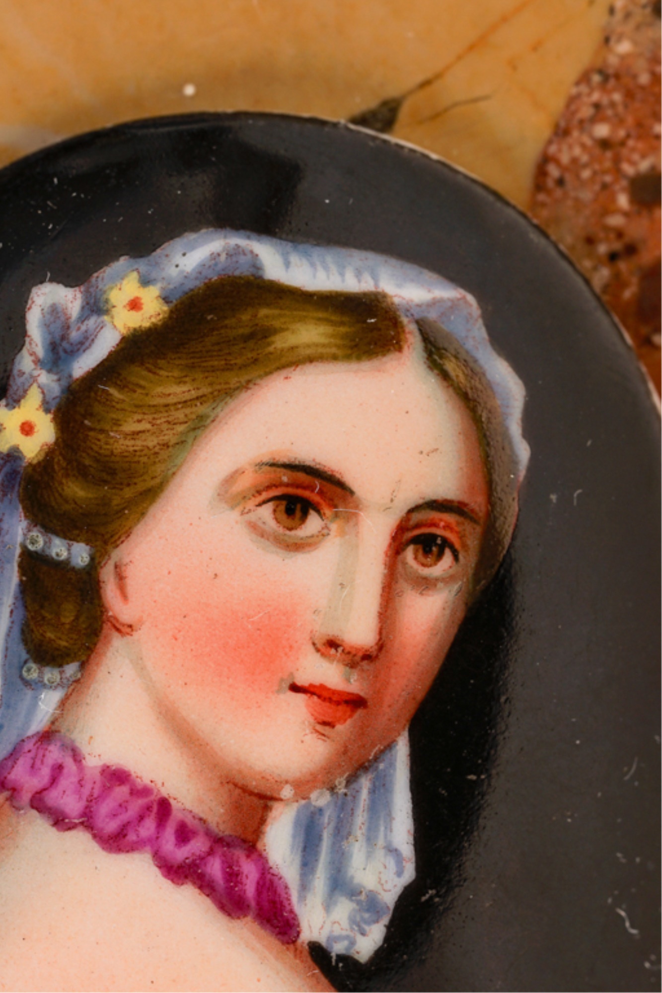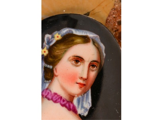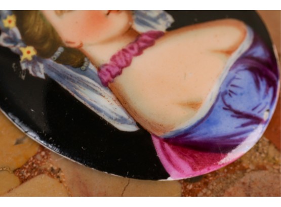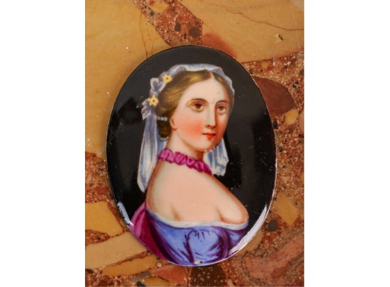 On porcelain. "Refined Lady" . 2 x 1 1/2 inches.