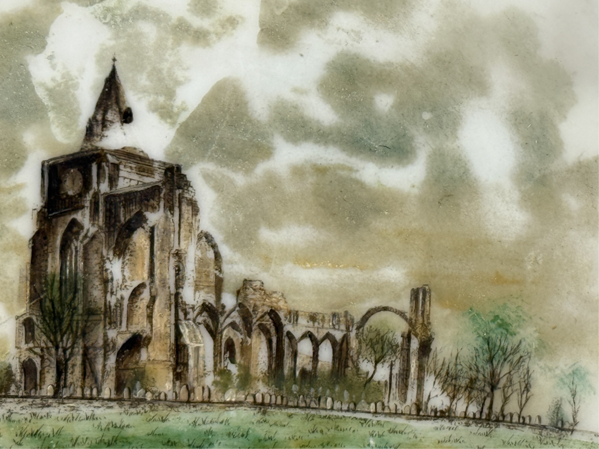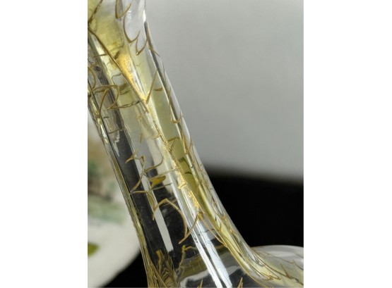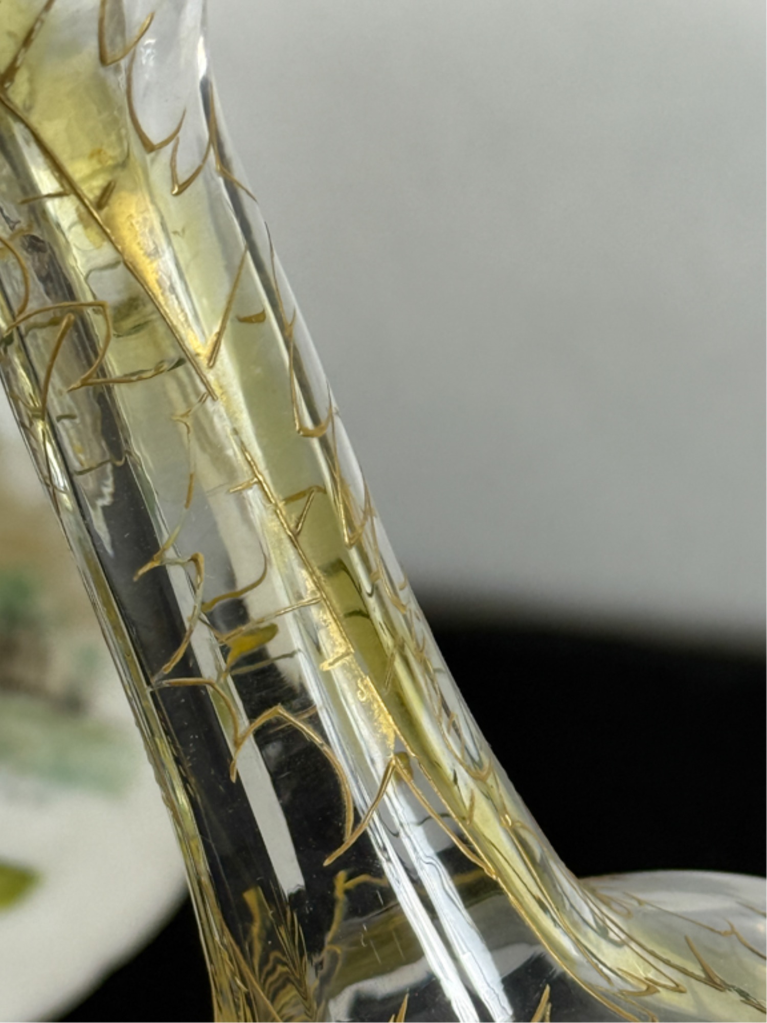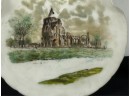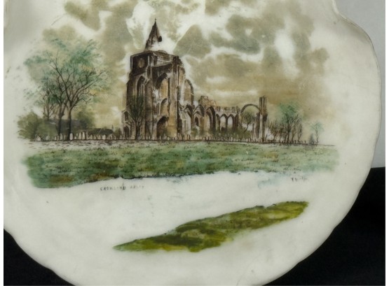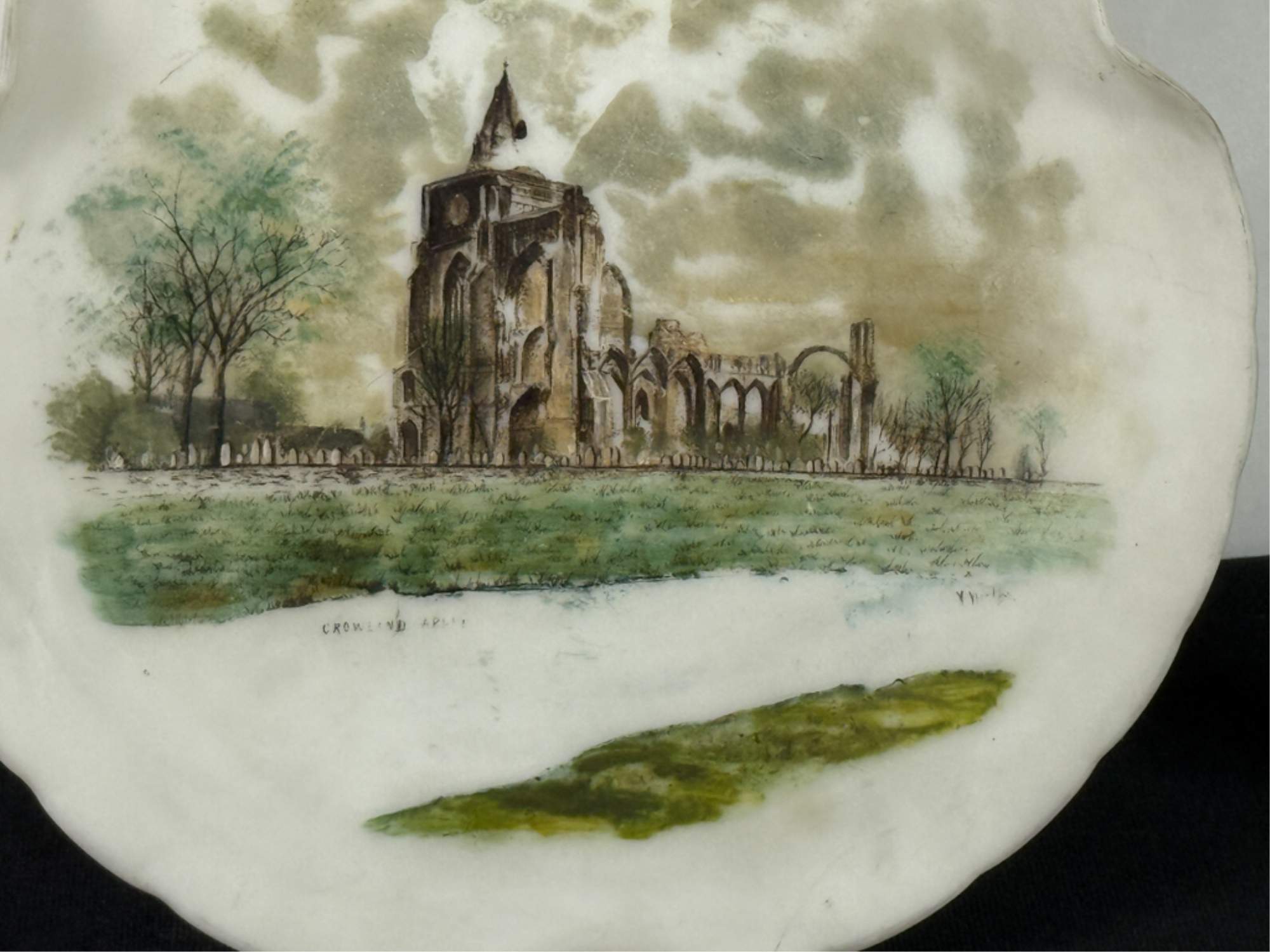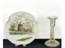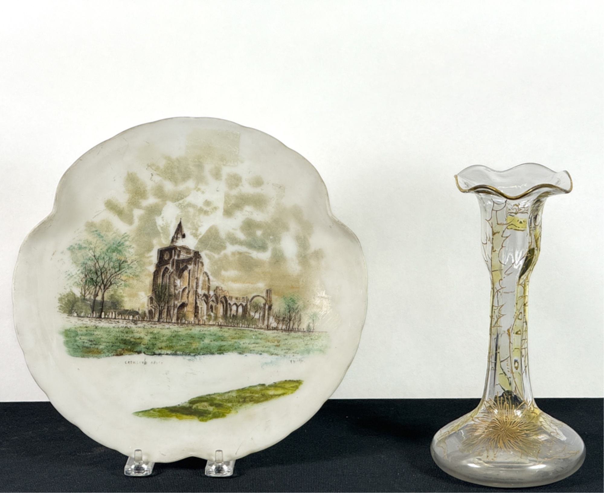Mt. Washington satin glass plate with hand painted Crowland Abbey scene & Mt. Washington "Verona" vase with gilt thistle design. 8 1/4 inches. Condition: Non-displaced crack to vase, wear to paint on plate.