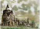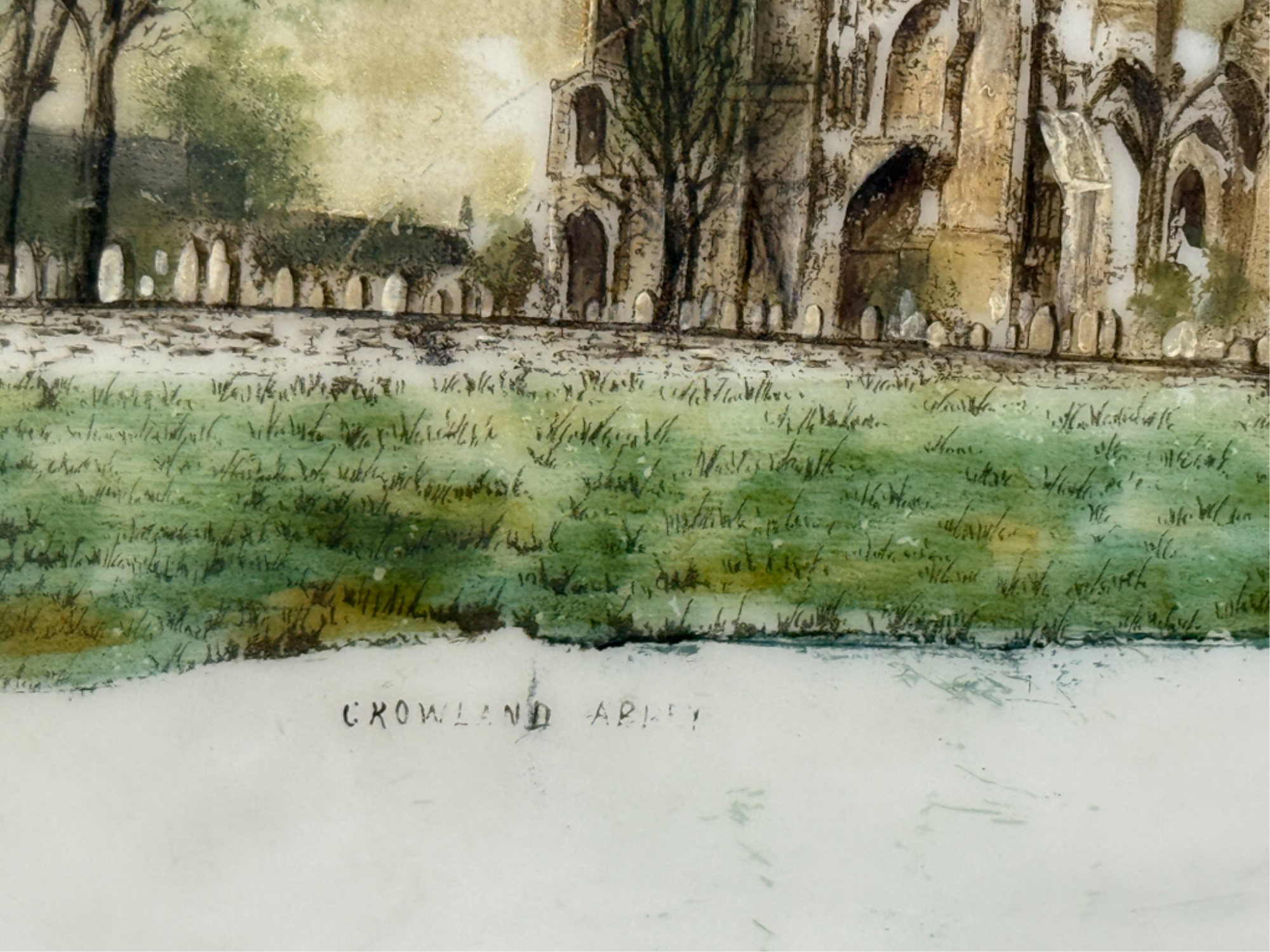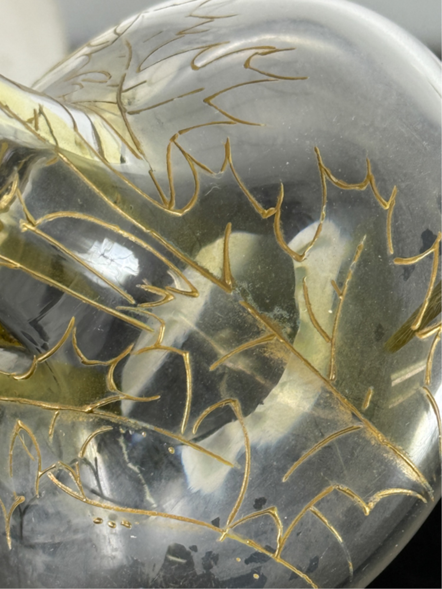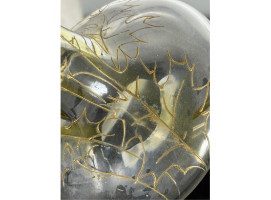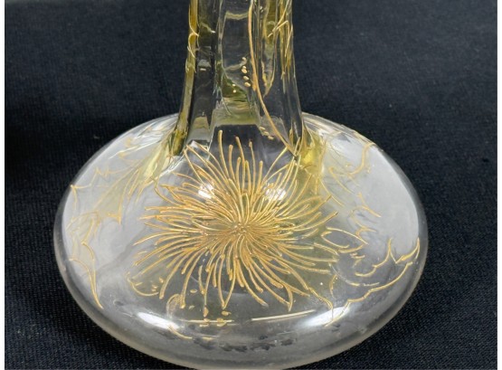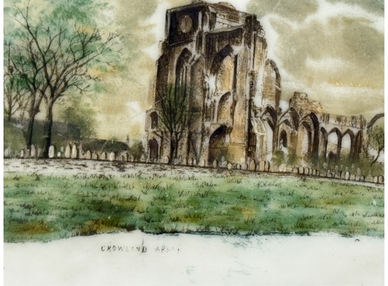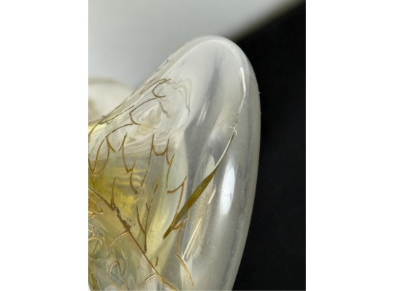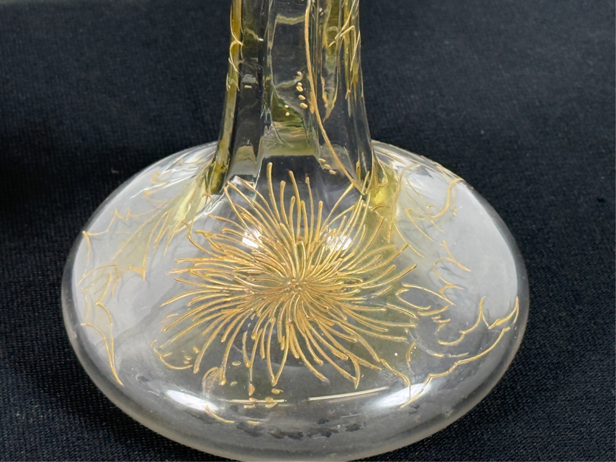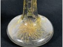 Mt. Washington satin glass plate with hand painted Crowland Abbey scene & Mt. Washington "Verona" vase with gilt thistle design. 8 1/4 inches. Condition: Non-displaced crack to vase, wear to paint on plate.