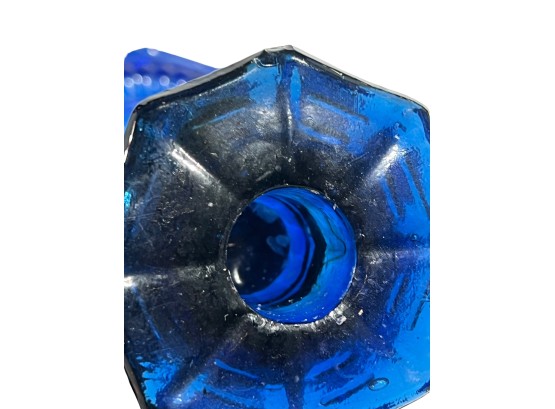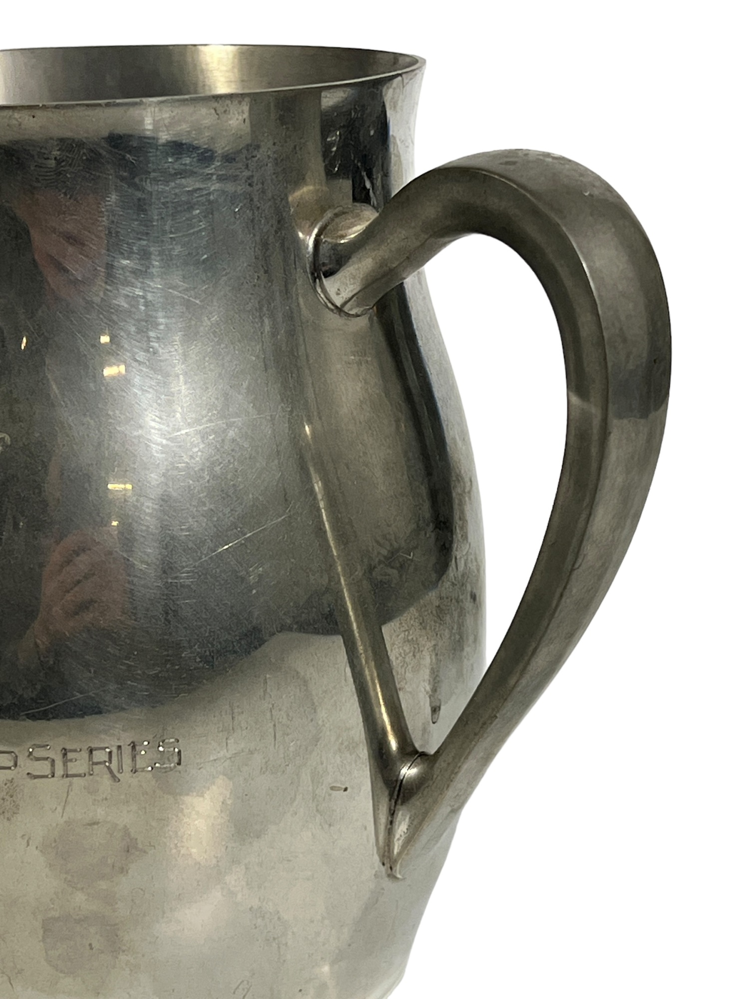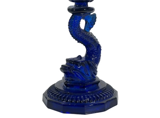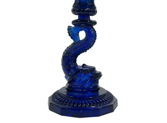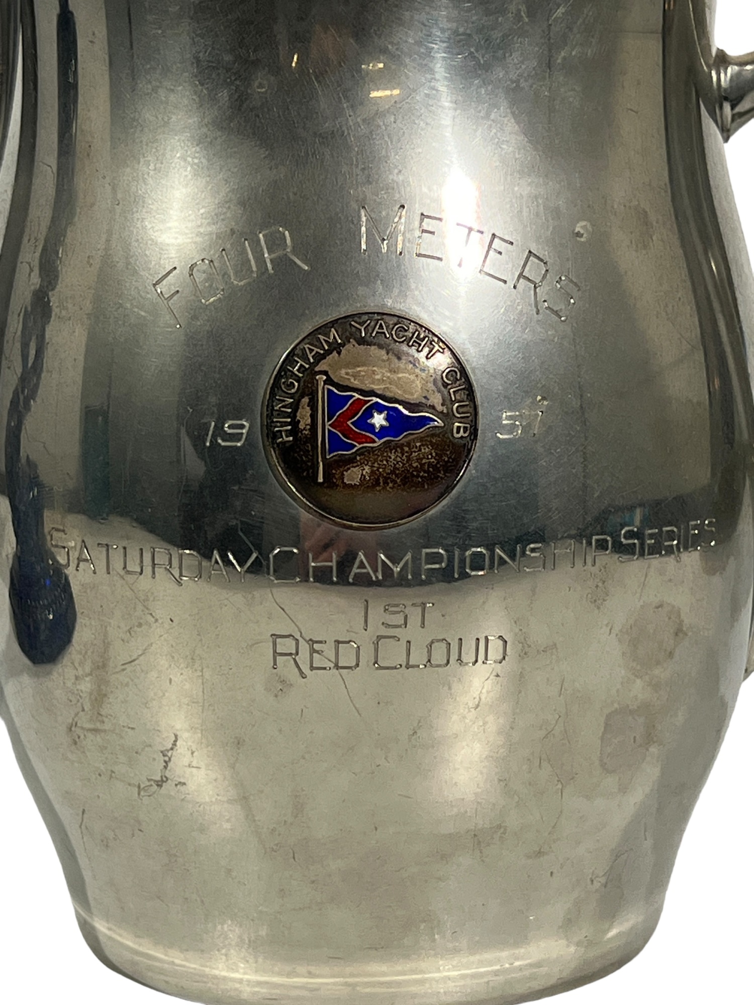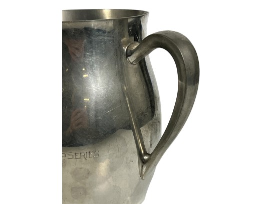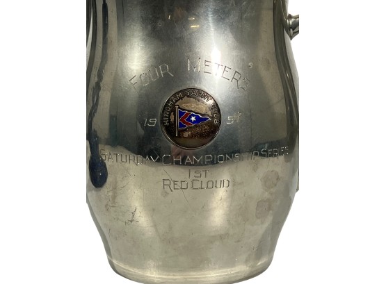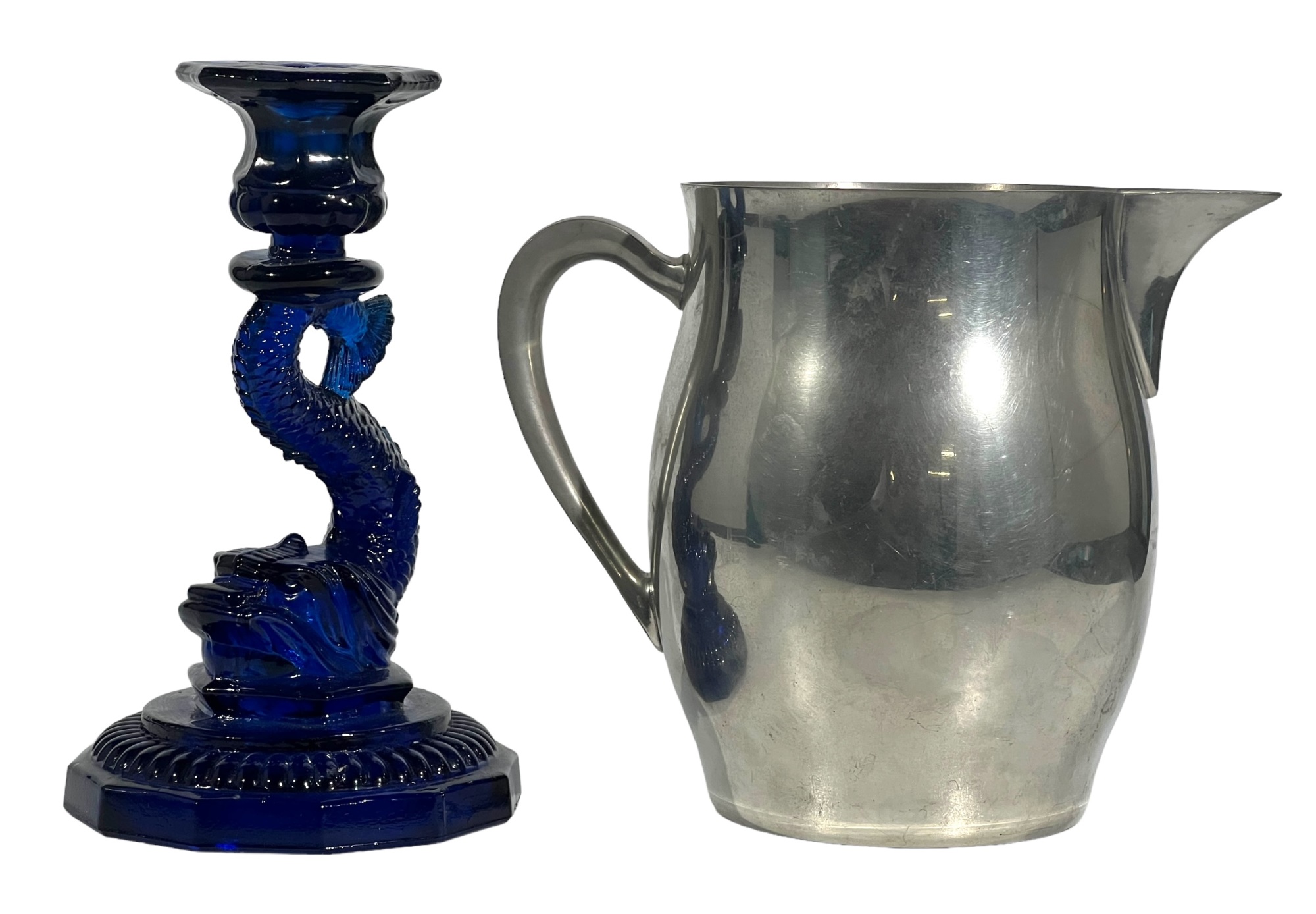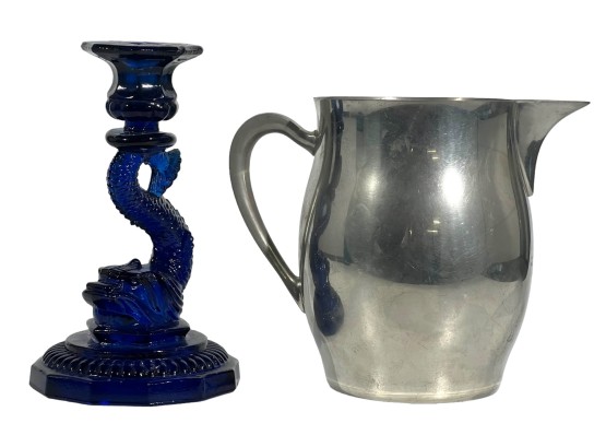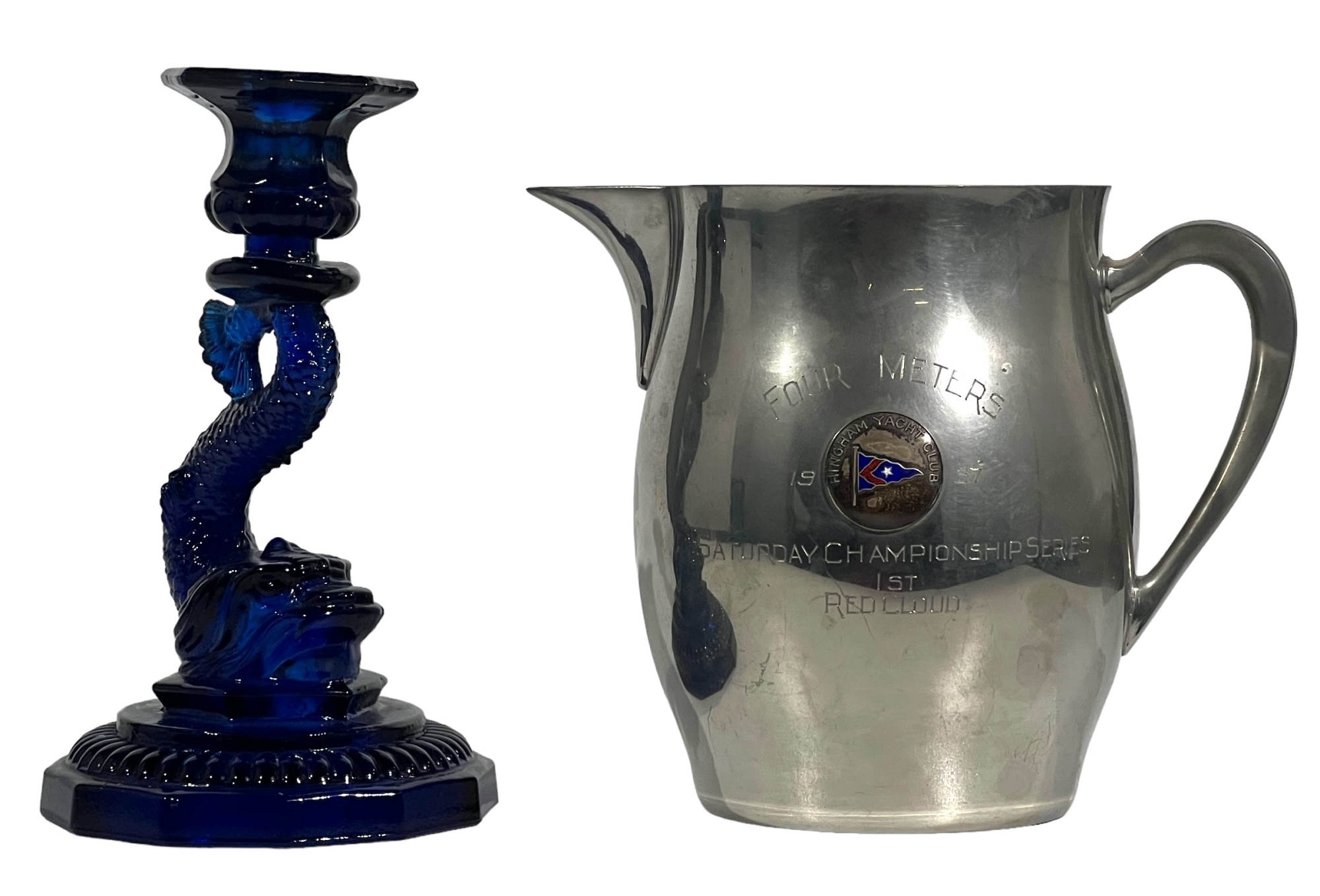 1957 Four Meters, 1st Prize to Red Cloud, pewter pitcher form 7 x 8 1/2 with a Cobalt Dolphin Glass Candlestick, 8 1/4 inches