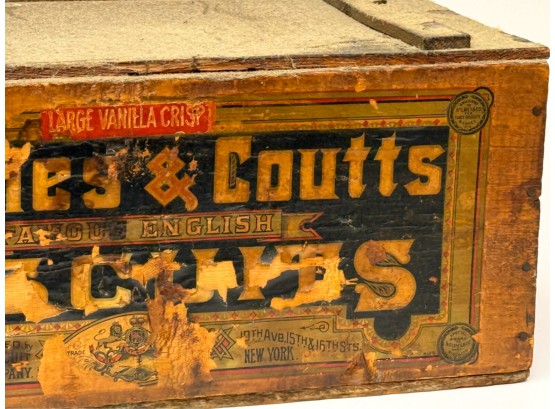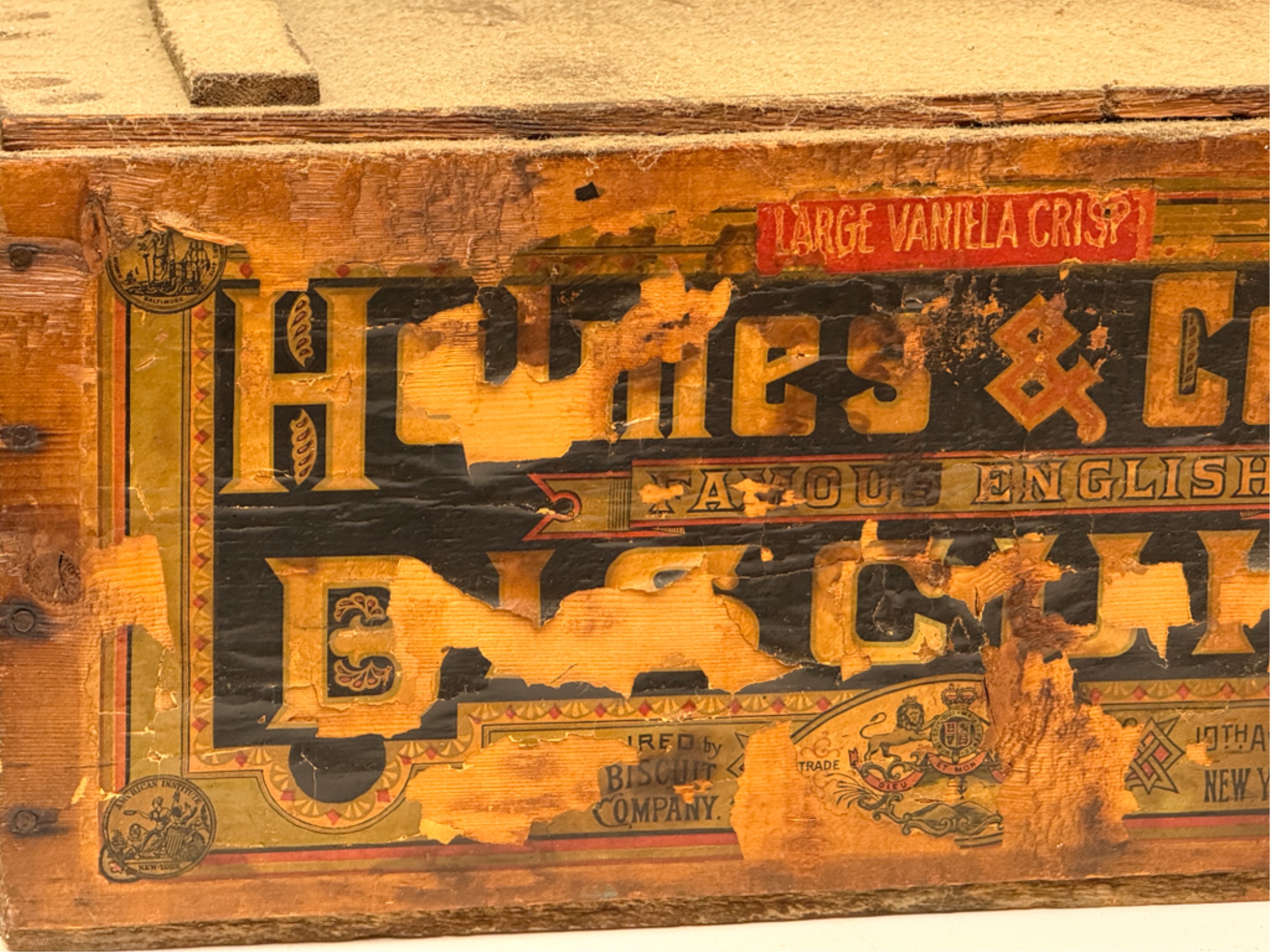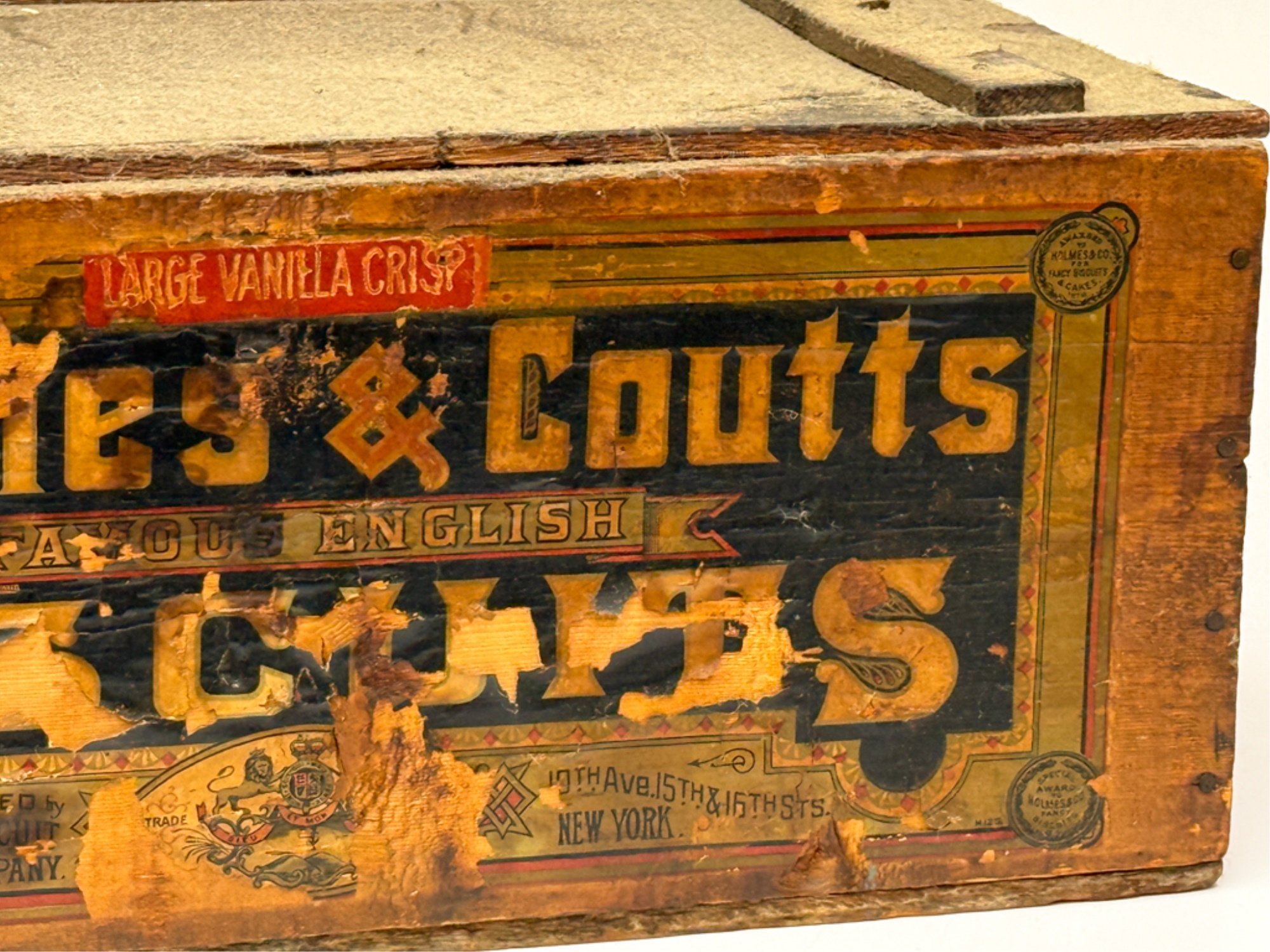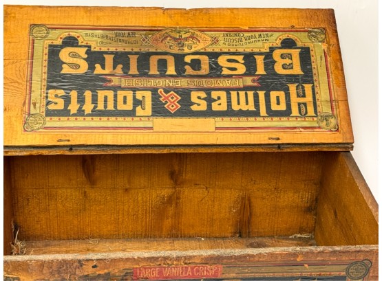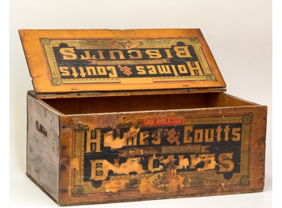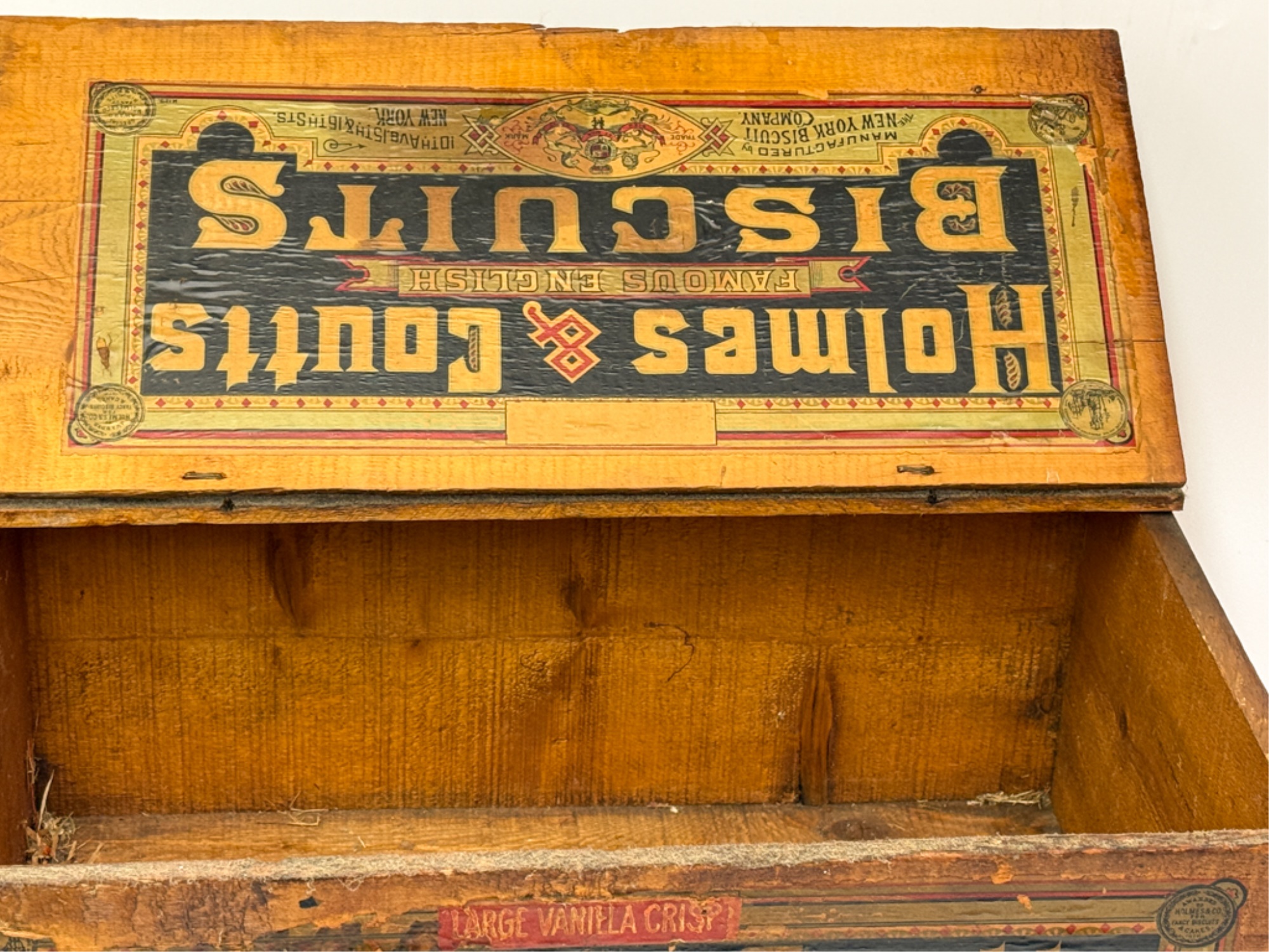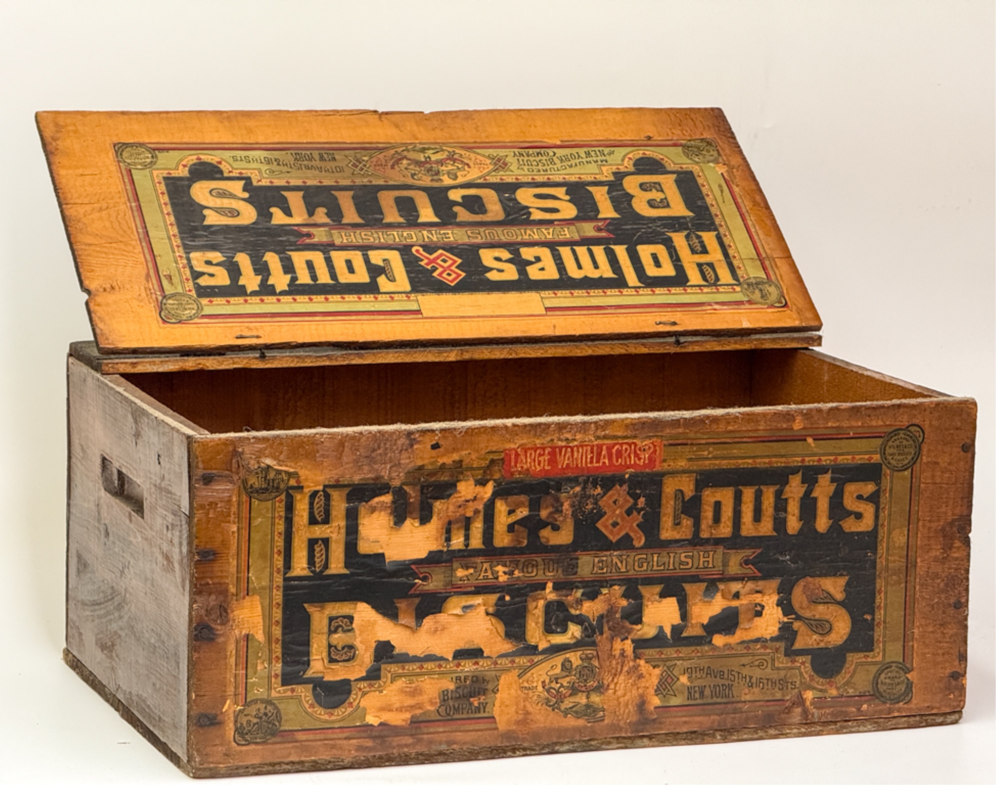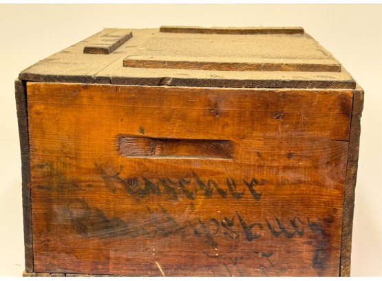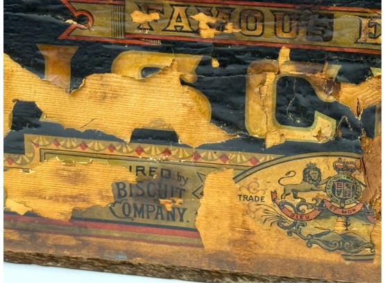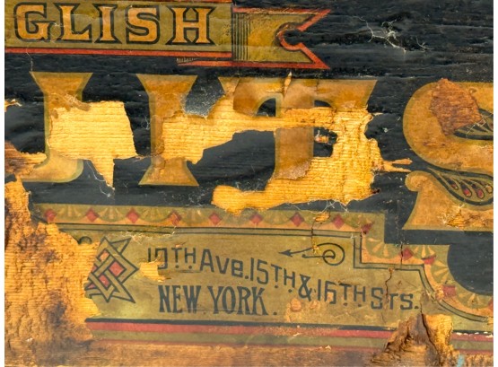 Lift top. 9 1/2 x 21 1/2 x 14 inches. Condition: Losses to label. See photos.