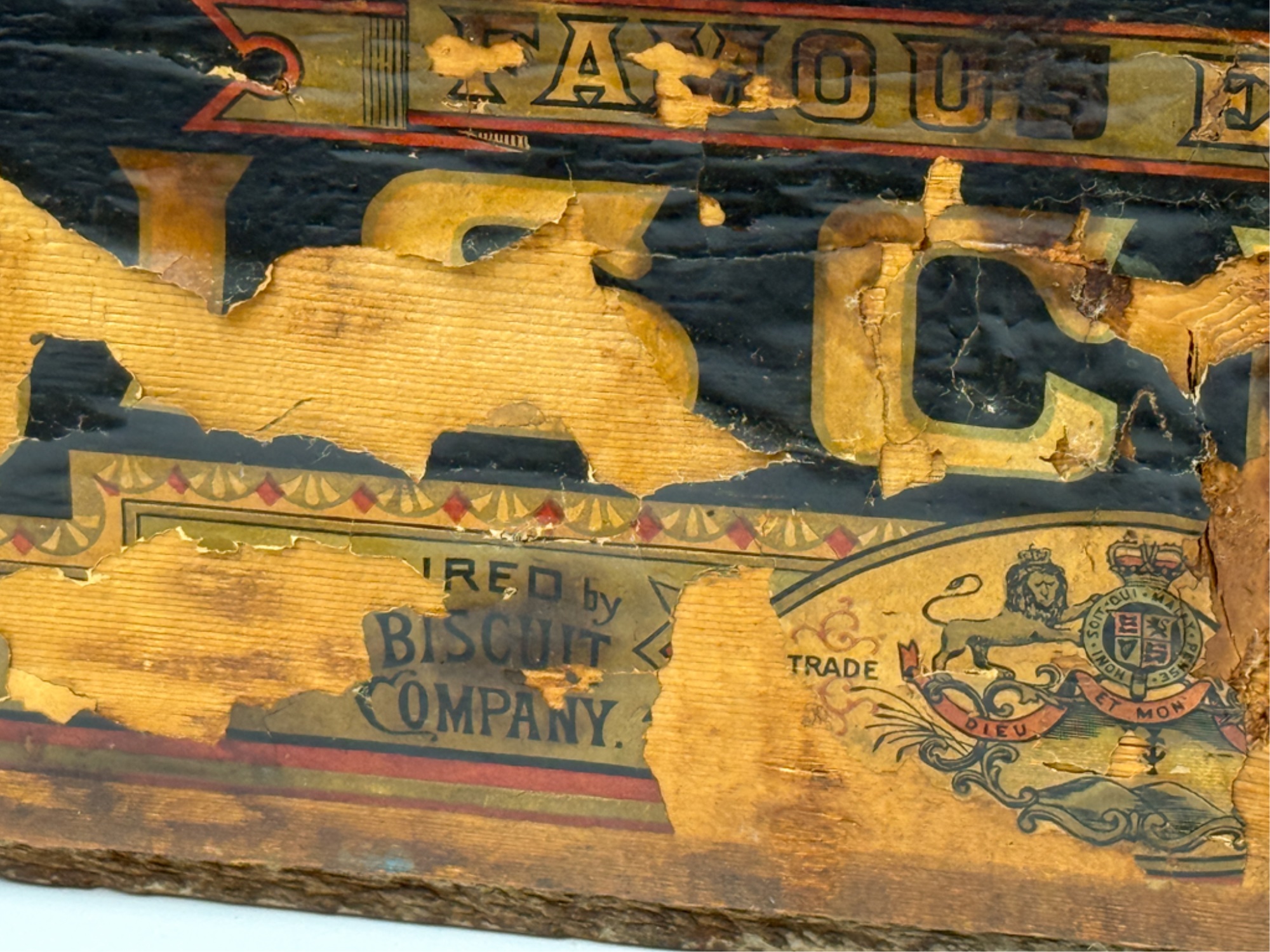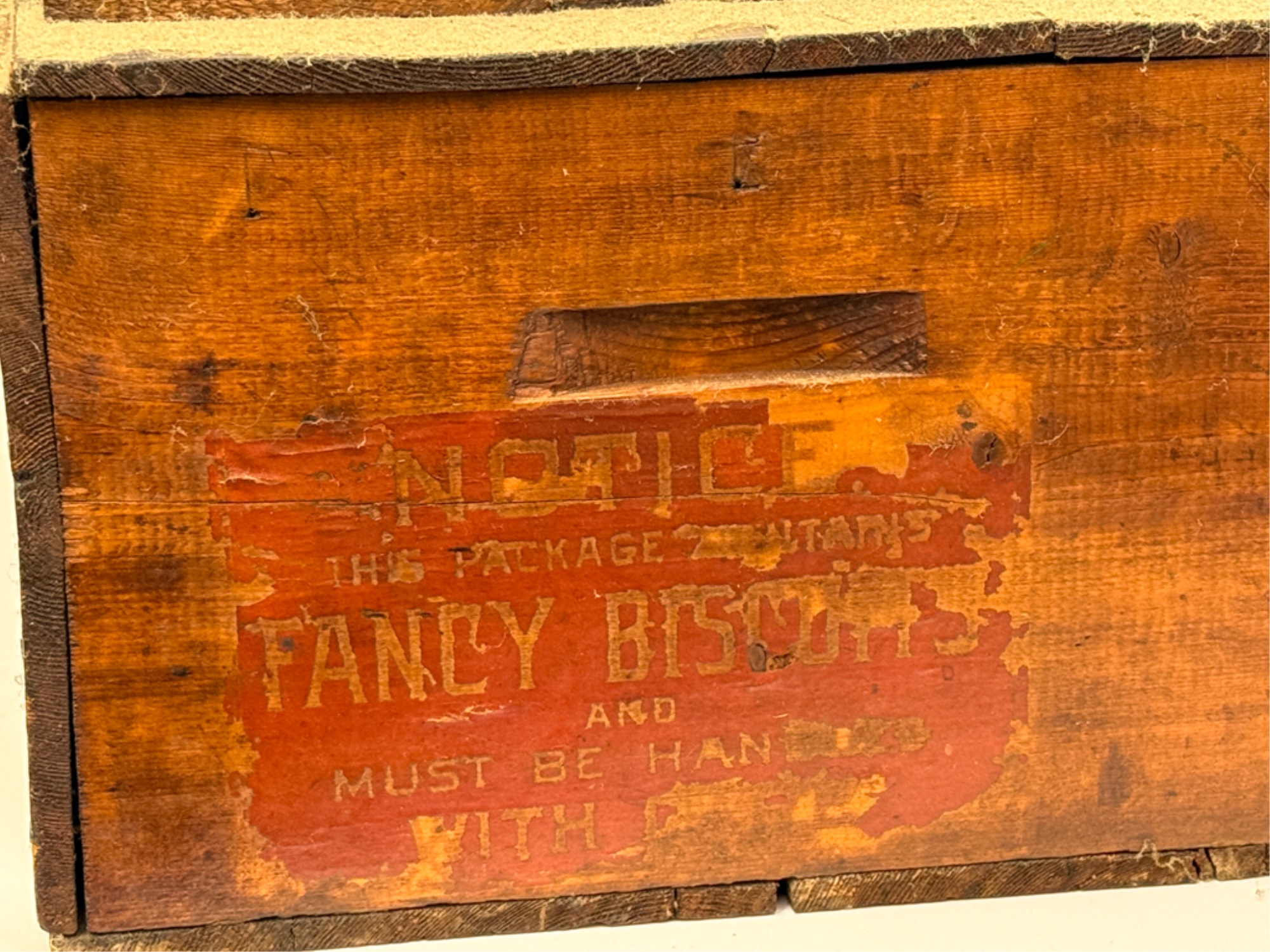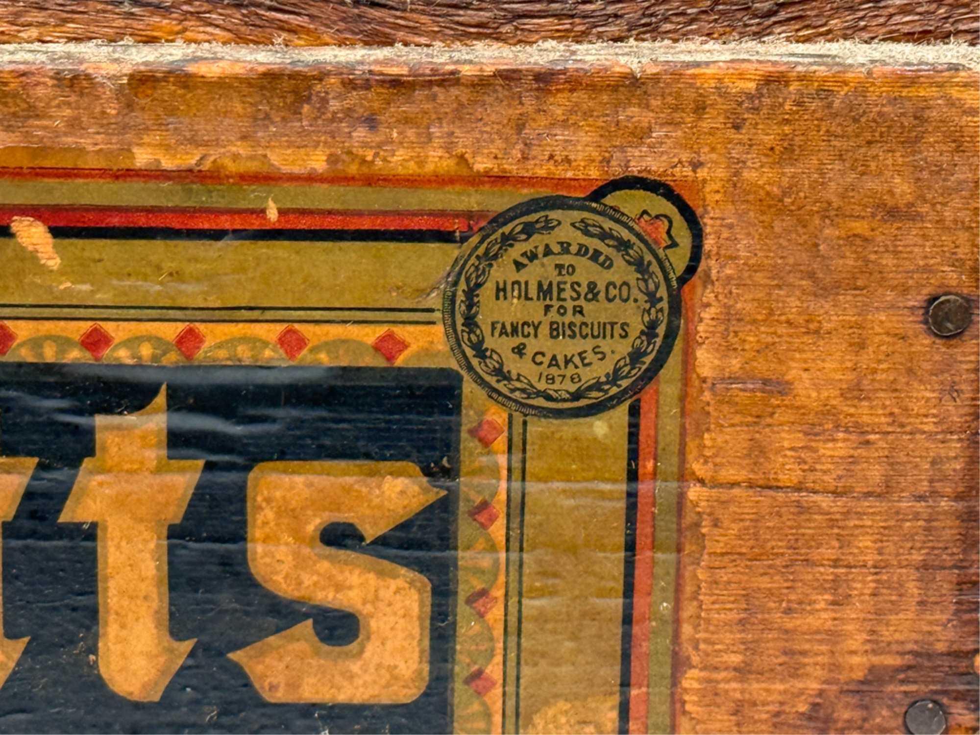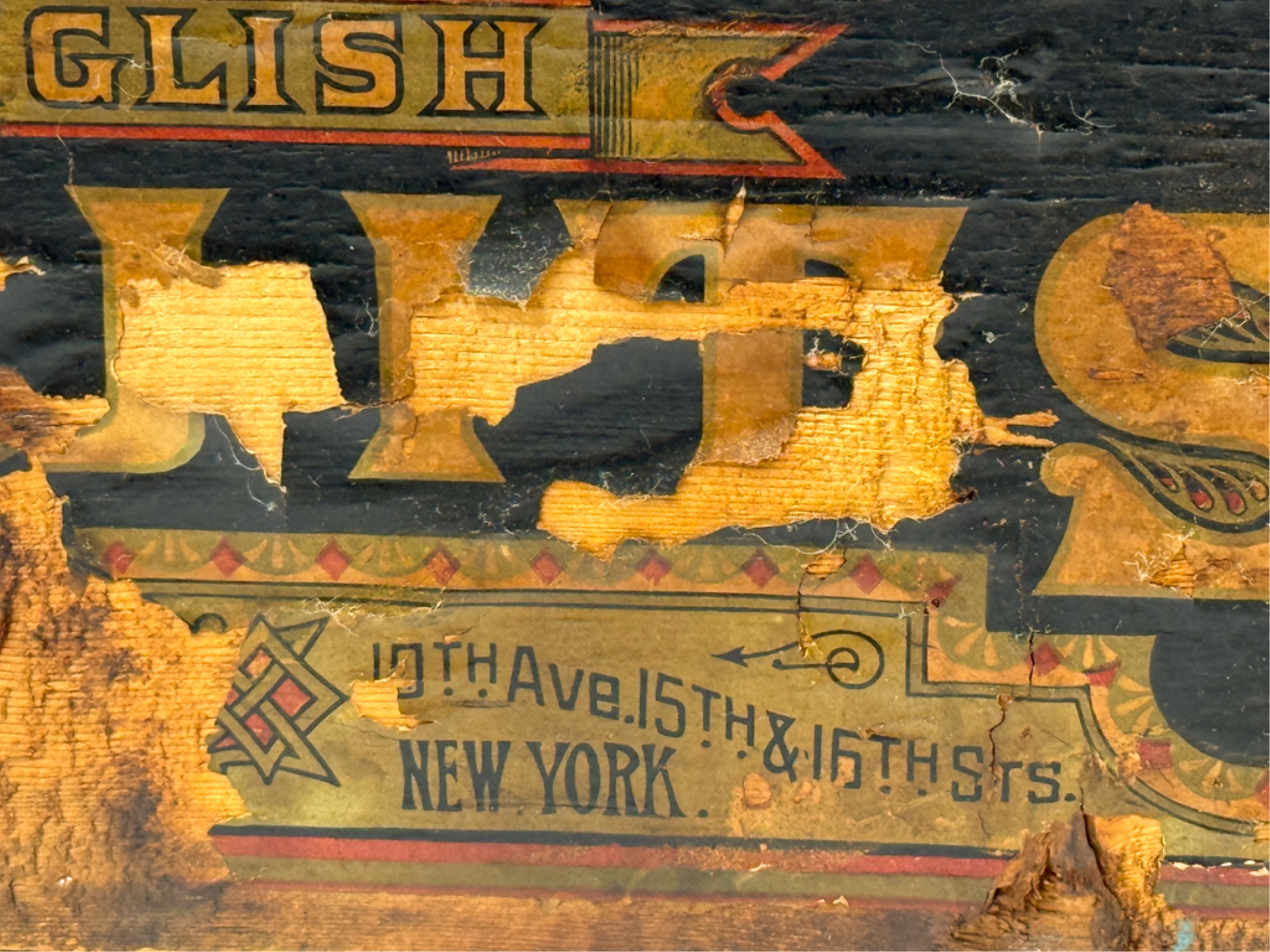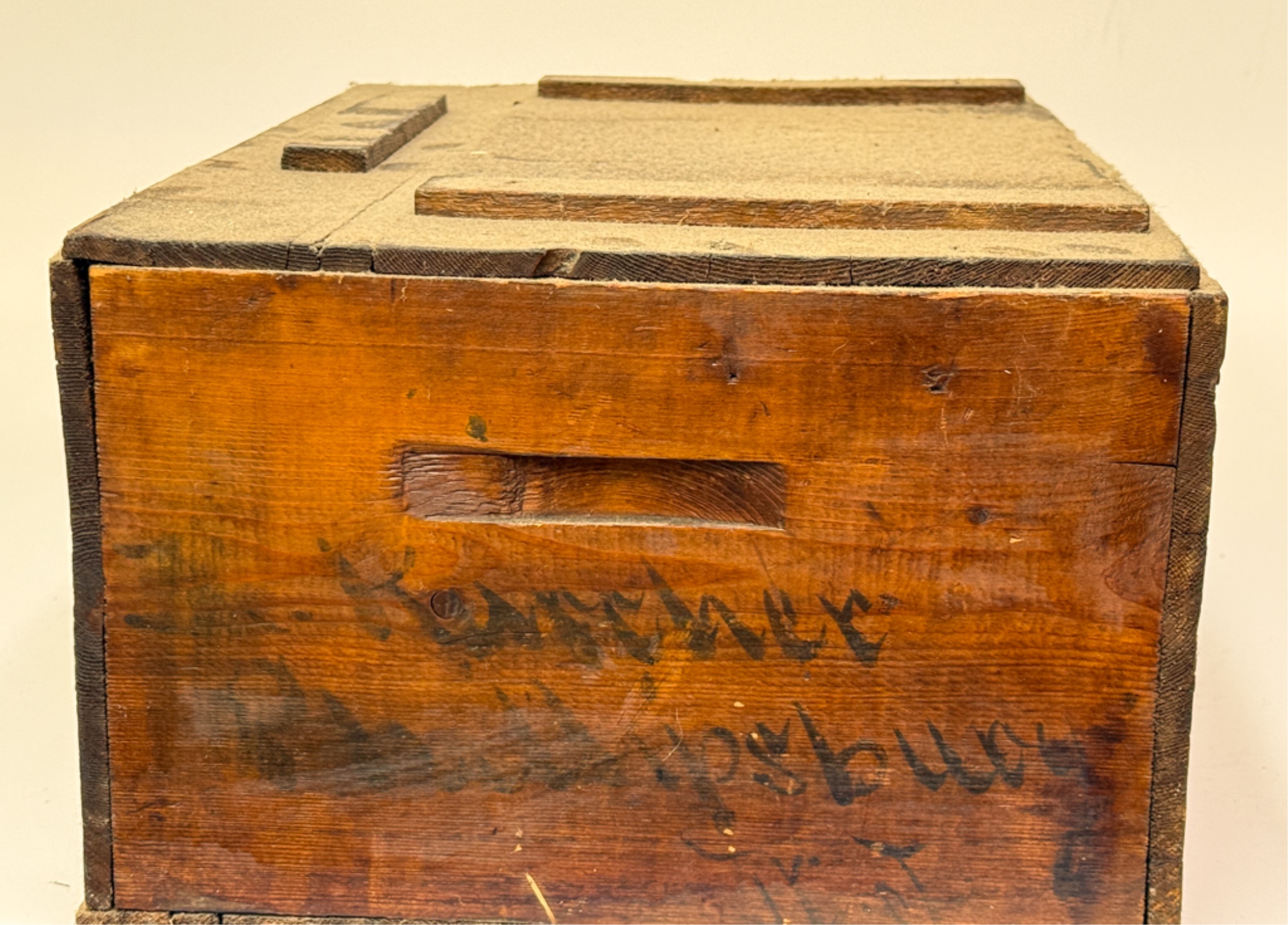 Lift top. 9 1/2 x 21 1/2 x 14 inches. Condition: Losses to label. See photos.