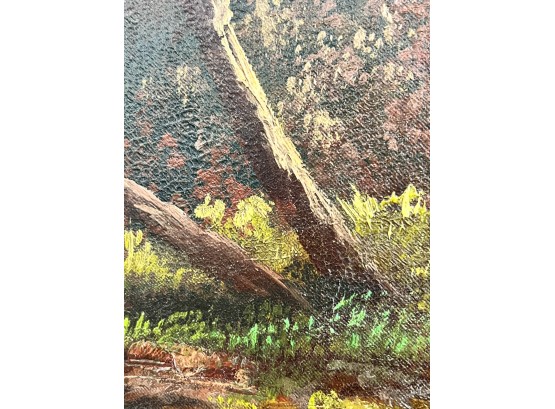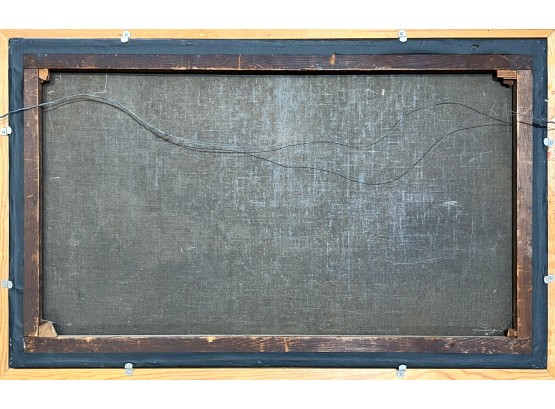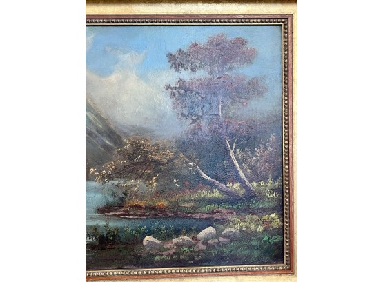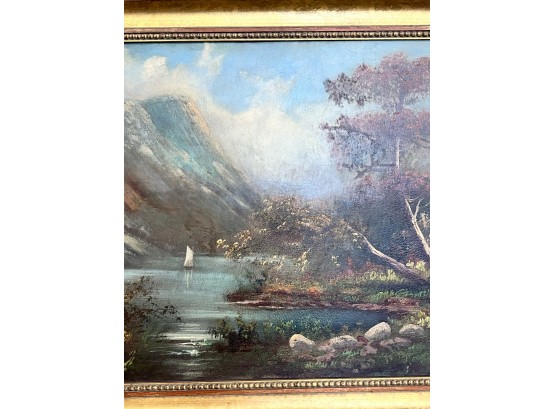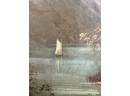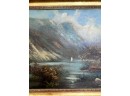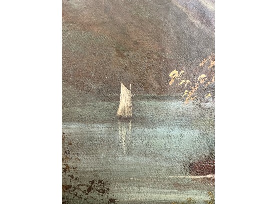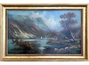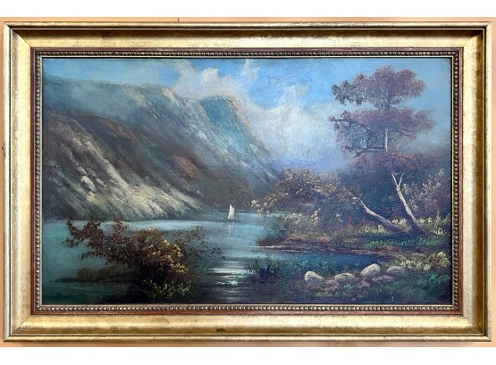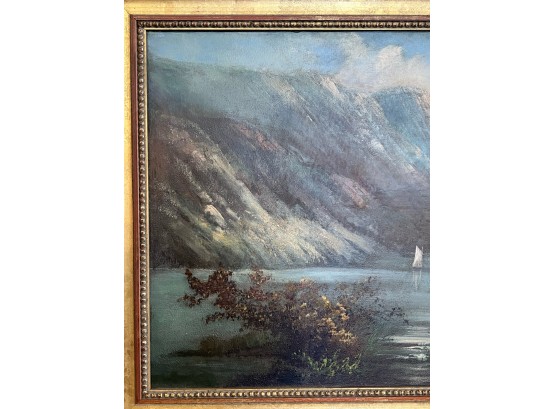 Mountainous Landscape with Boat - oil on canvas 22 x 36 inches. unsigned. framed 28 x 42 inches (overall) Condition: Good, lined Temp No 6228