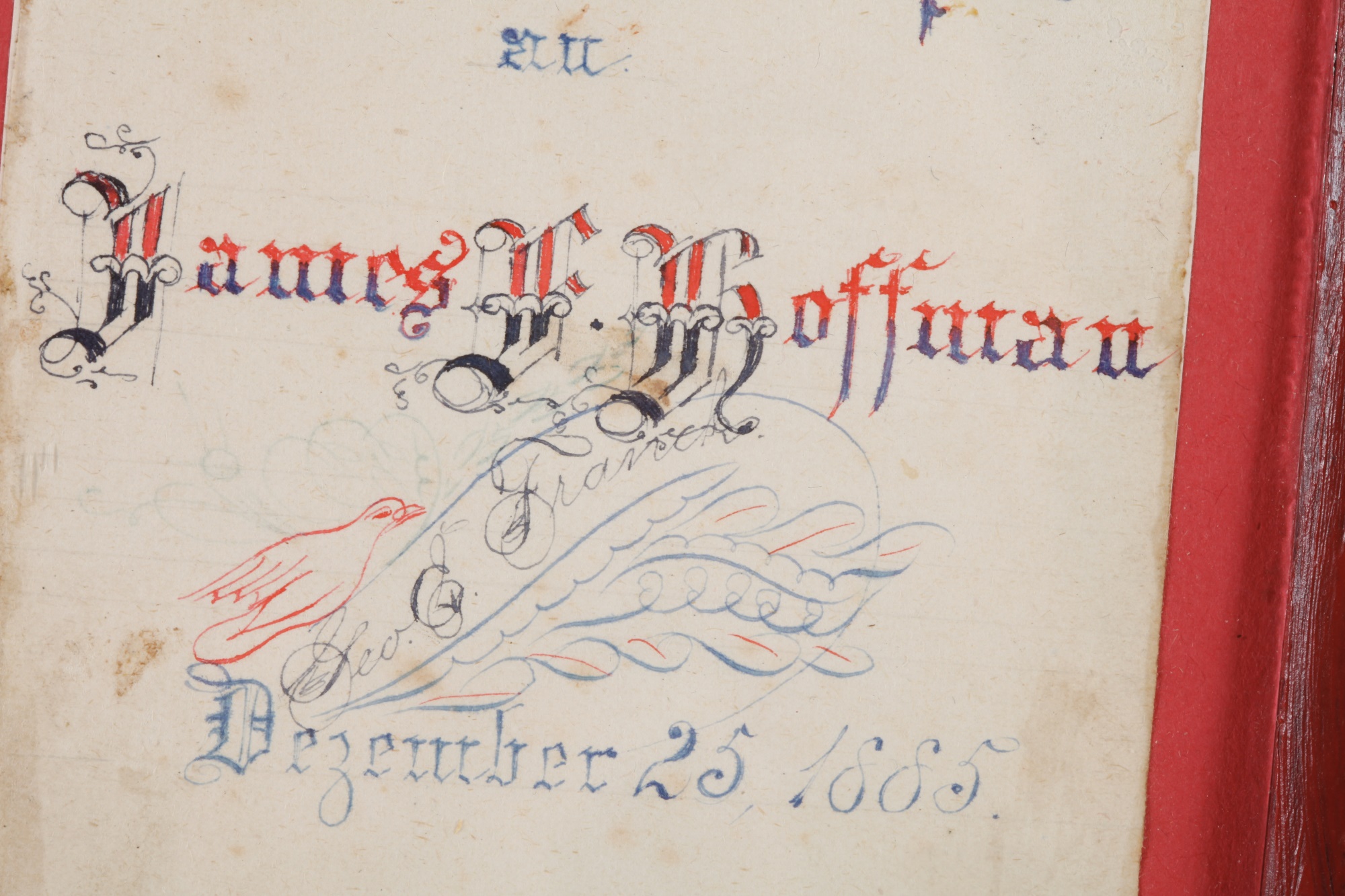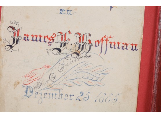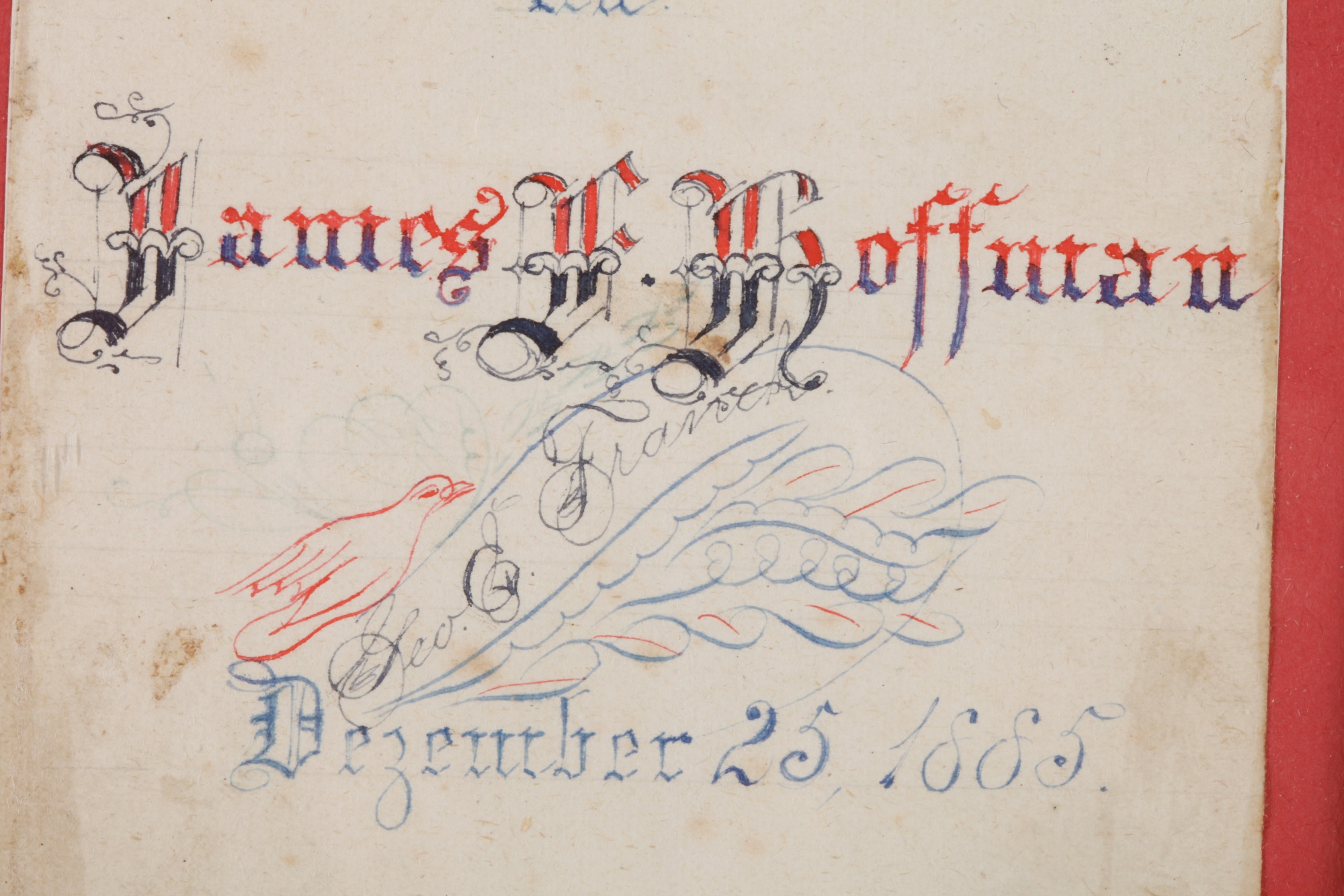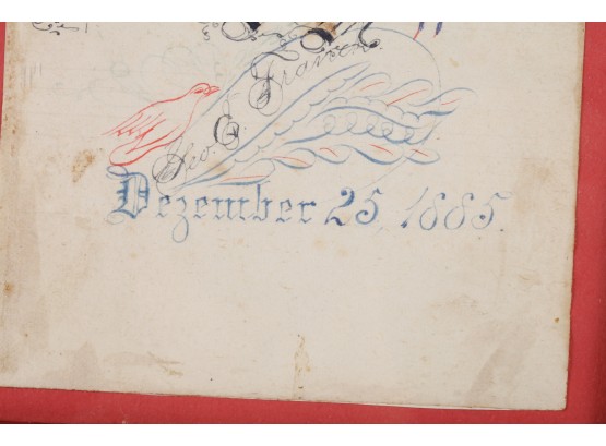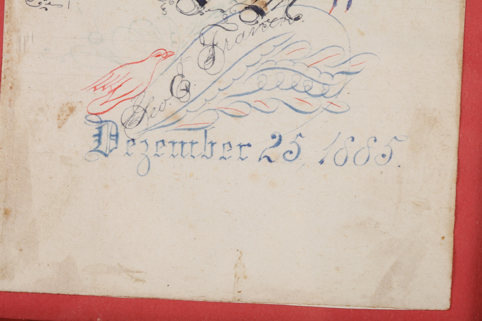 Colored hand-lettering with date of December 25, 1885. Set in a red frame 6 1/2 x 5 inches overall. Note on back: "J. George E. Franck Scrivener-- See Earnestt, P. 153-- George Franck worked as a scrivener from the end of the Civil War thru the 1900's. His works are recognized by the Decorative Art below his handwriting."
