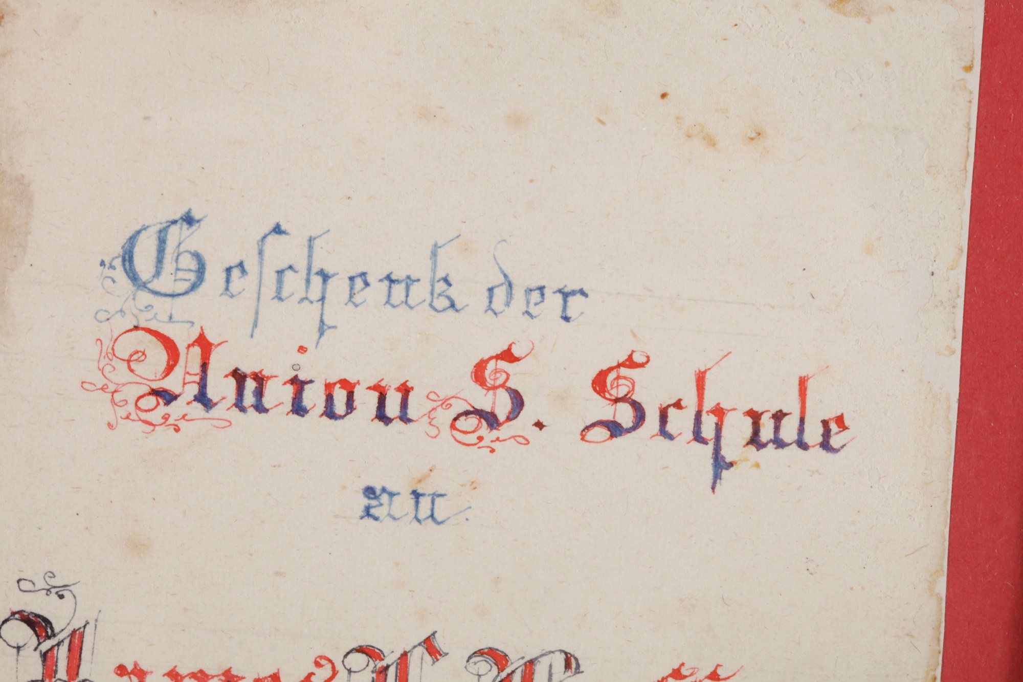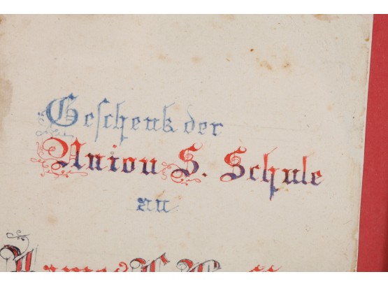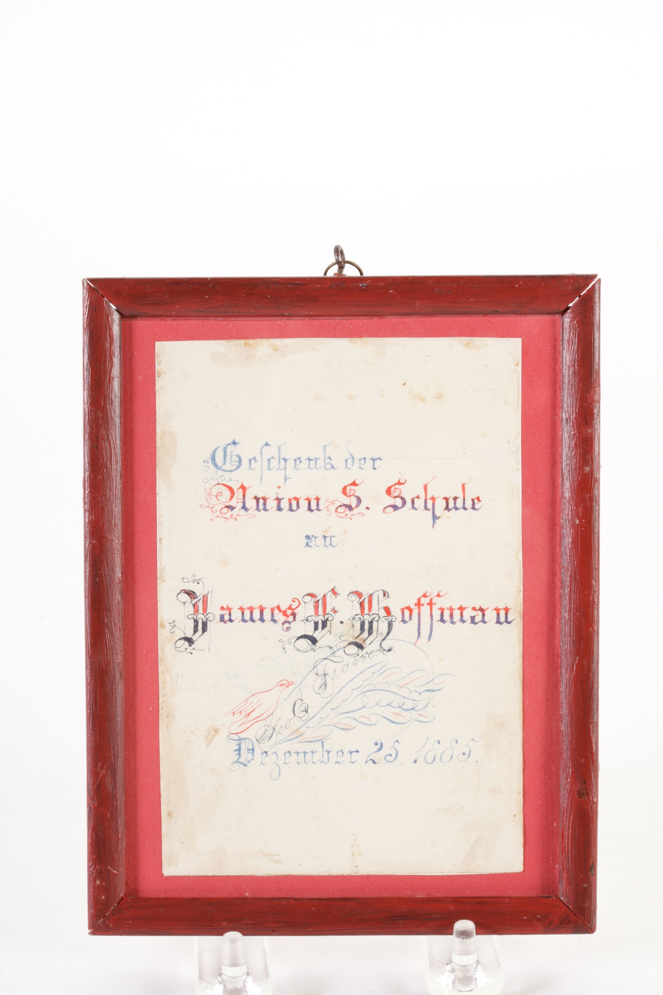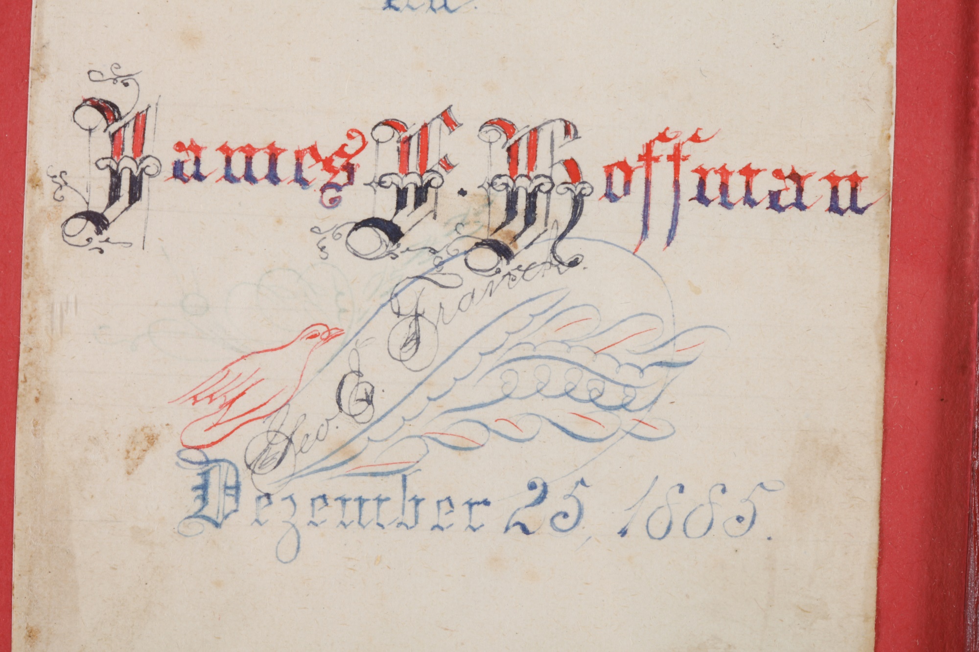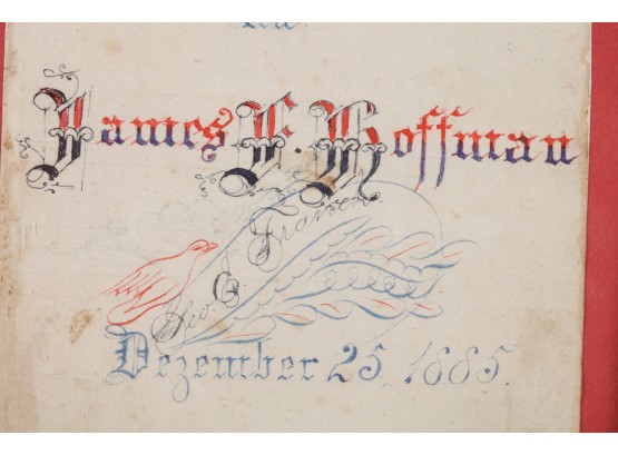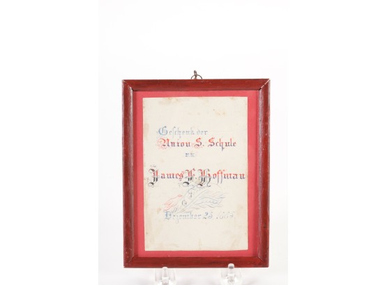 Colored hand-lettering with date of December 25, 1885. Set in a red frame 6 1/2 x 5 inches overall. Note on back: "J. George E. Franck Scrivener-- See Earnestt, P. 153-- George Franck worked as a scrivener from the end of the Civil War thru the 1900's. His works are recognized by the Decorative Art below his handwriting."