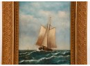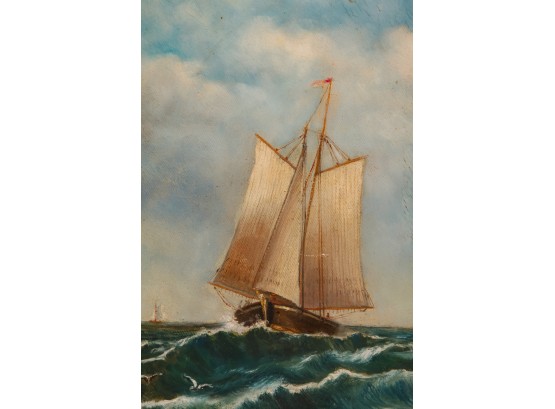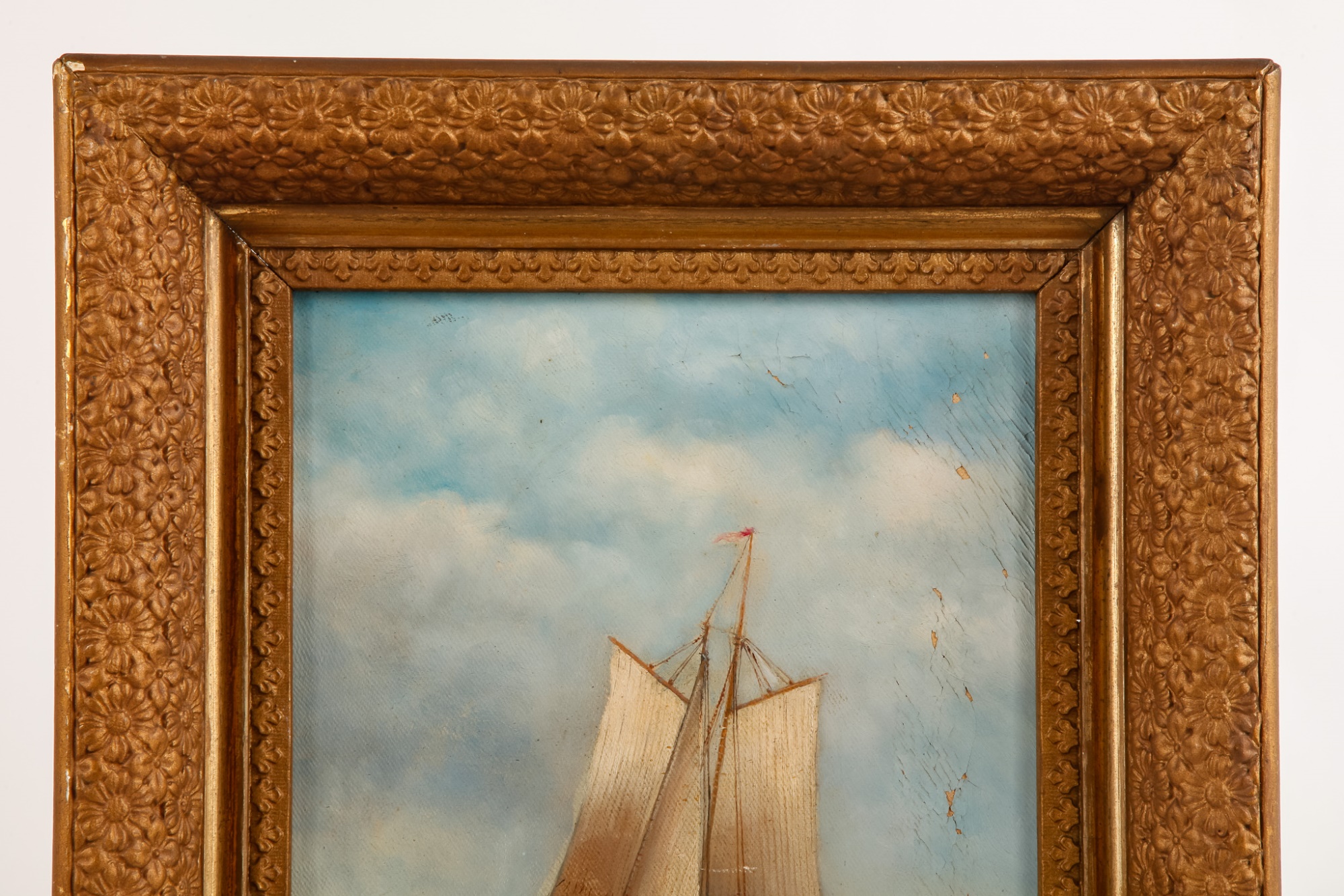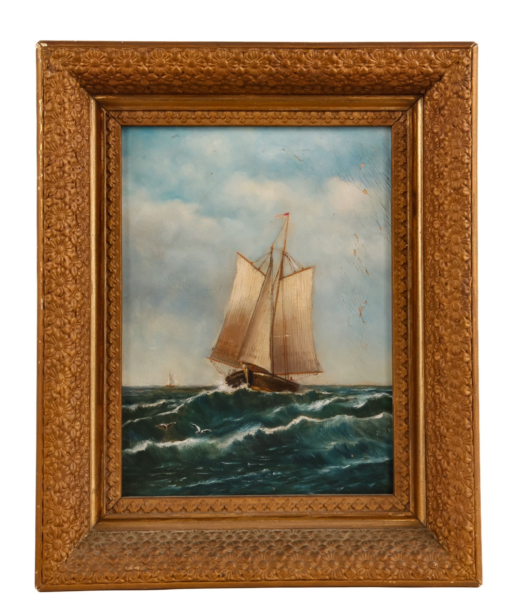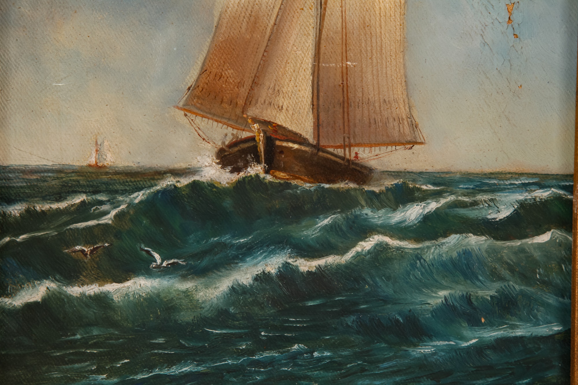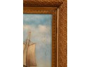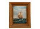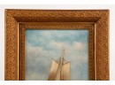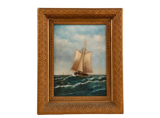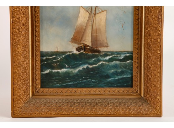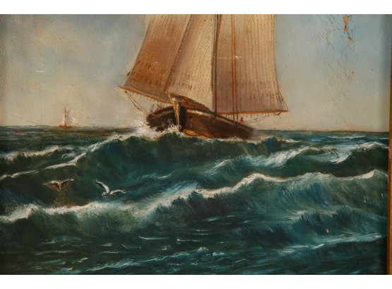 Oil on Canvas, Ship at Sea, Boston Back Bay Artist in Victorian frame. Unsigned, note on reverse. 16 1/2 x 13 1/2 inches framed.