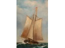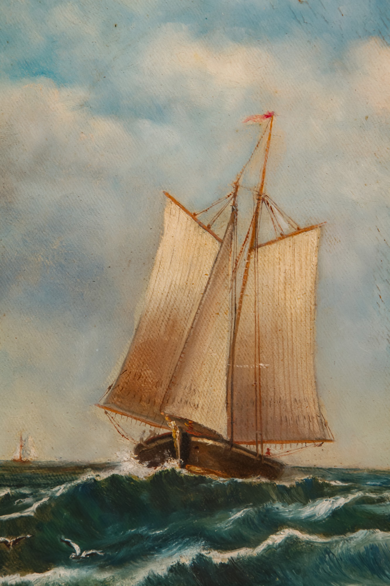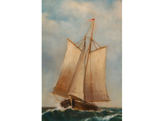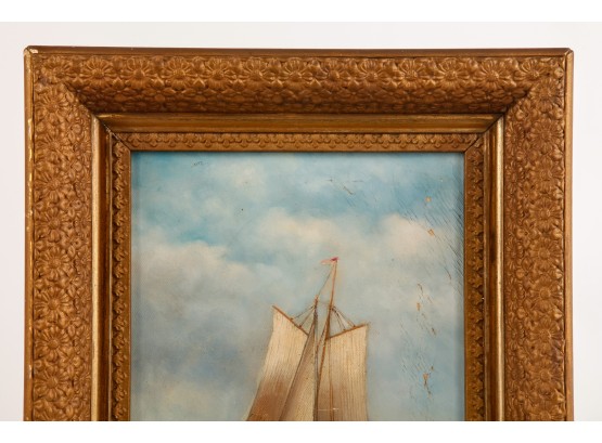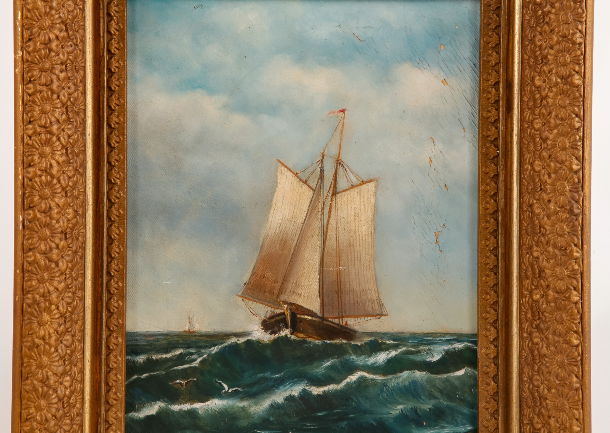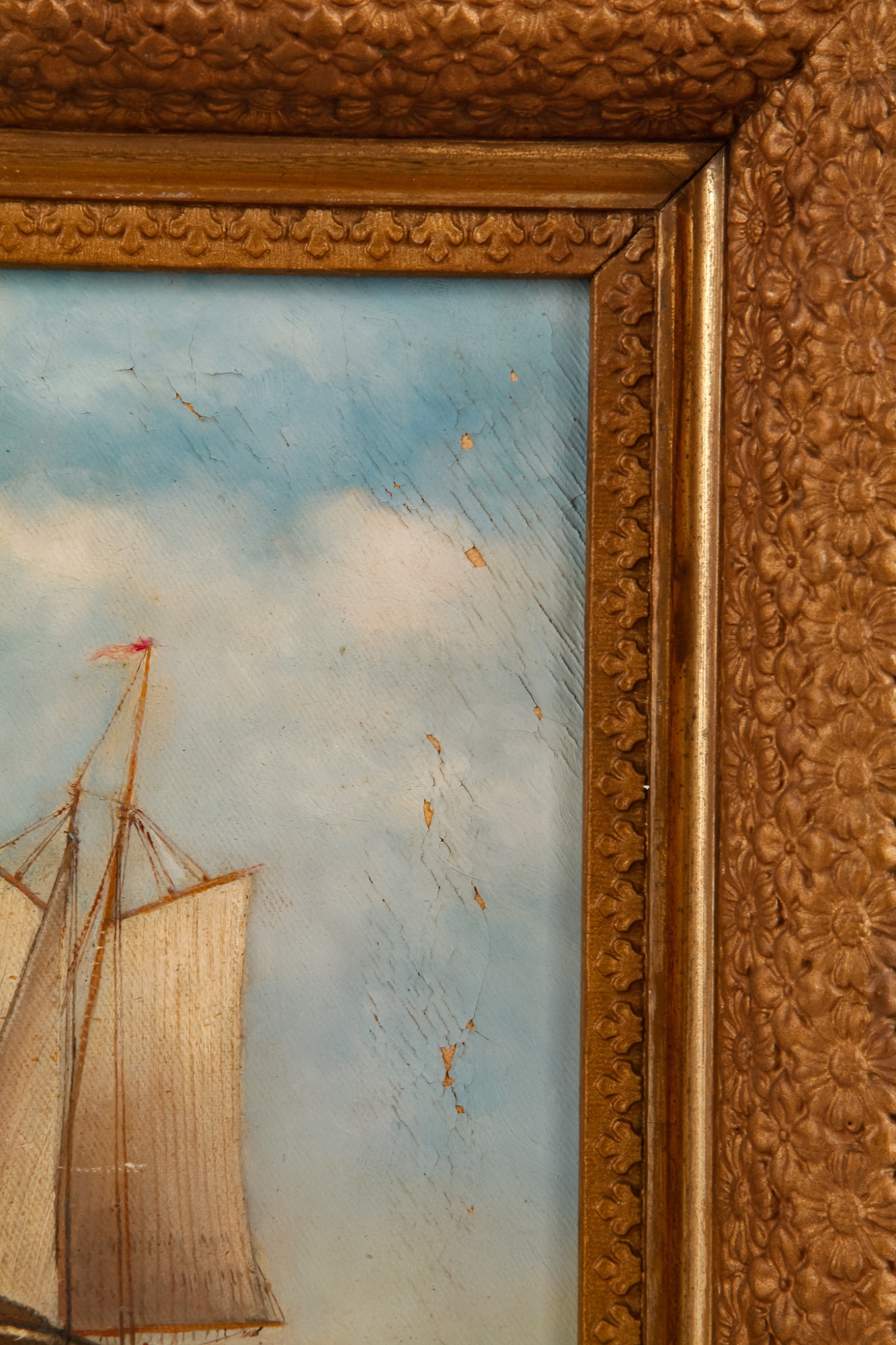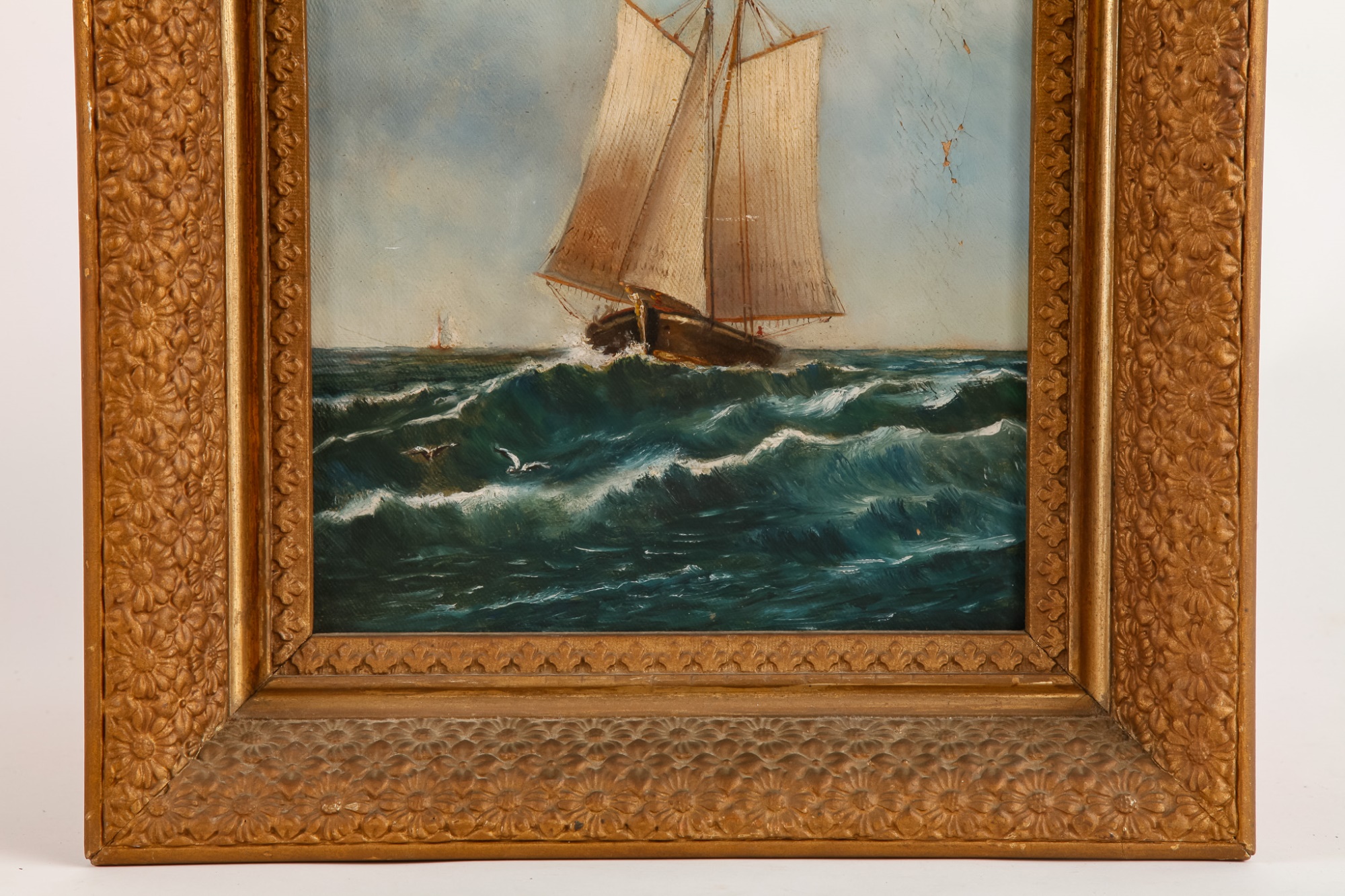 Oil on Canvas, Ship at Sea, Boston Back Bay Artist in Victorian frame. Unsigned, note on reverse. 16 1/2 x 13 1/2 inches framed.