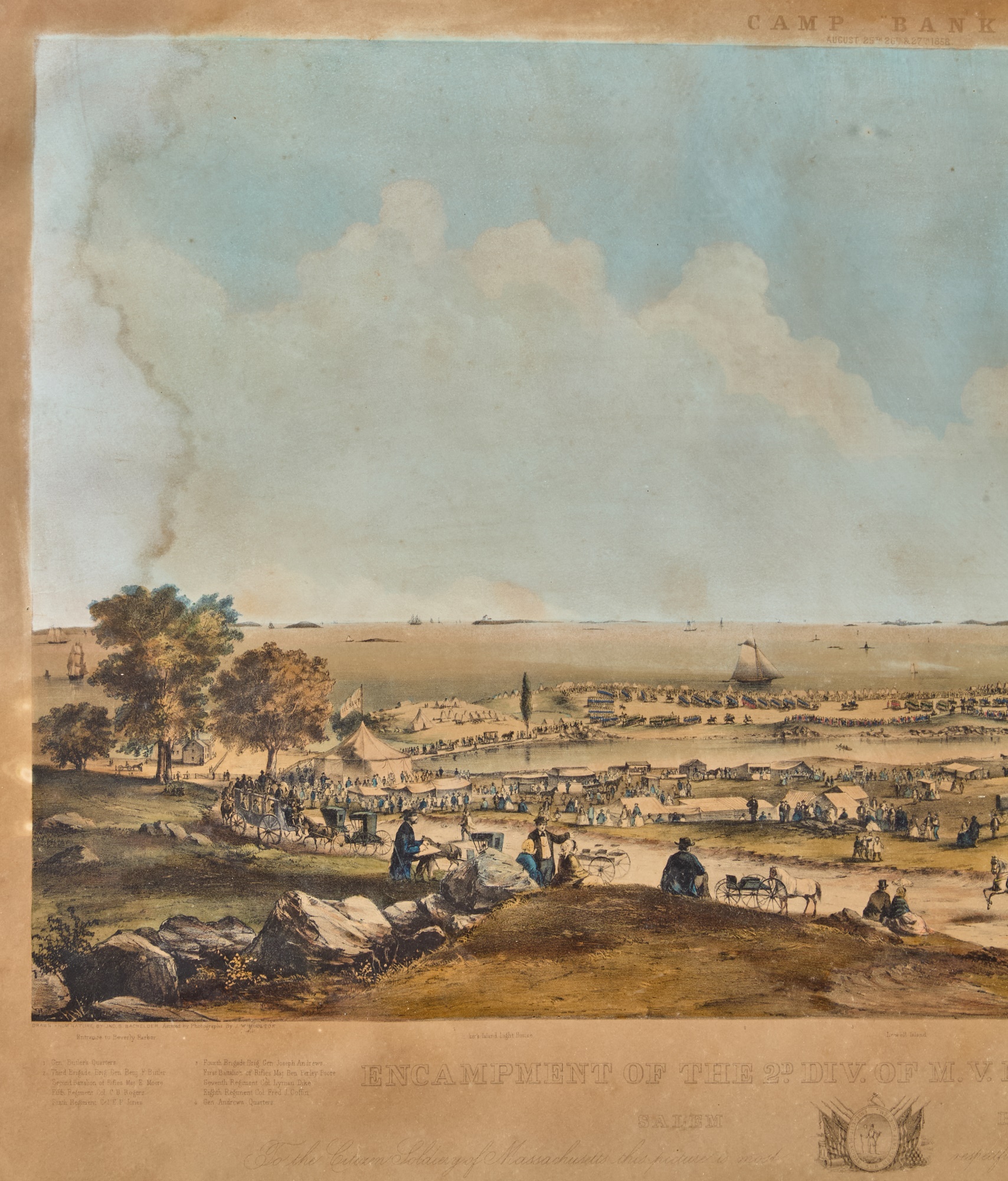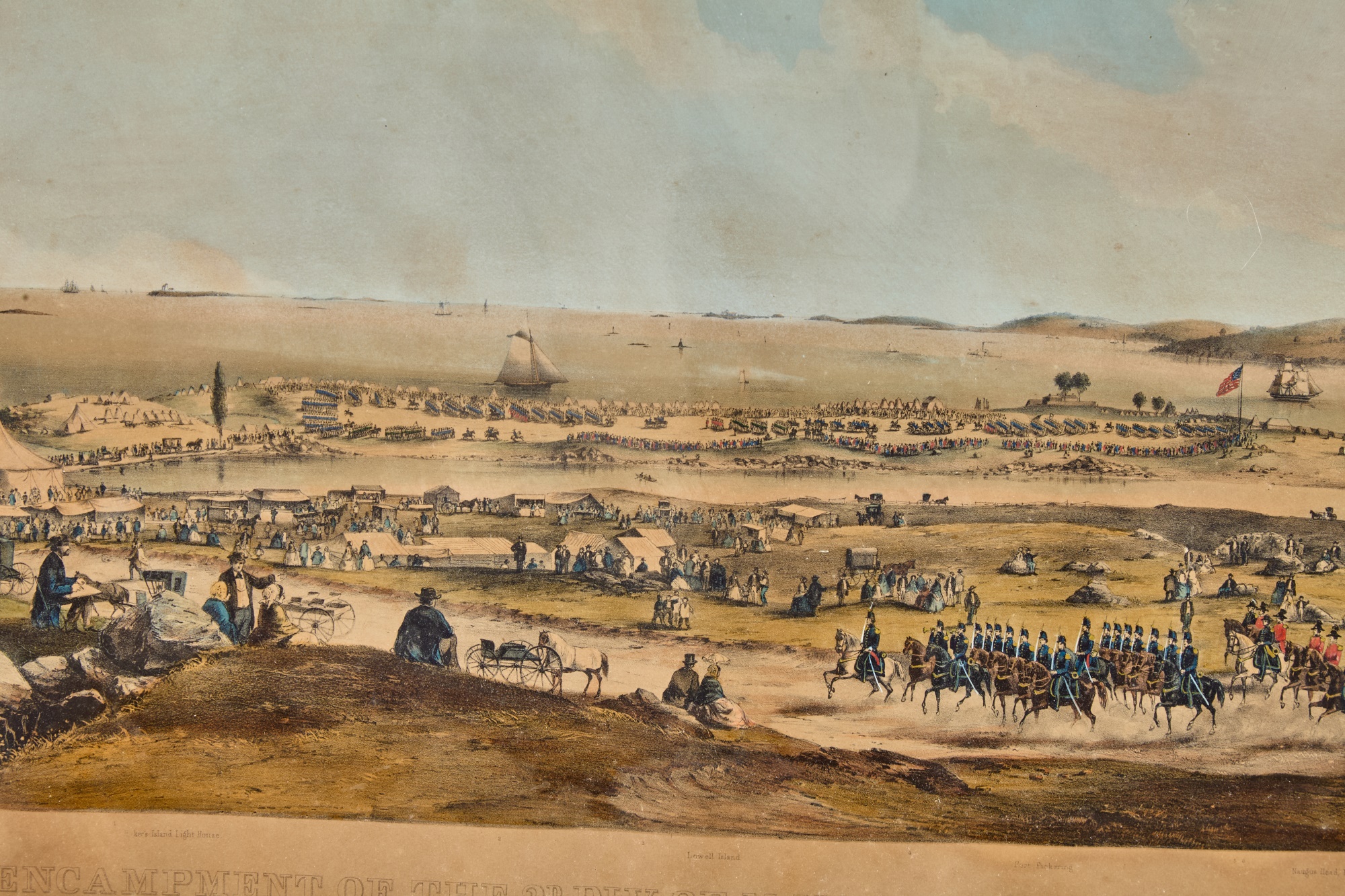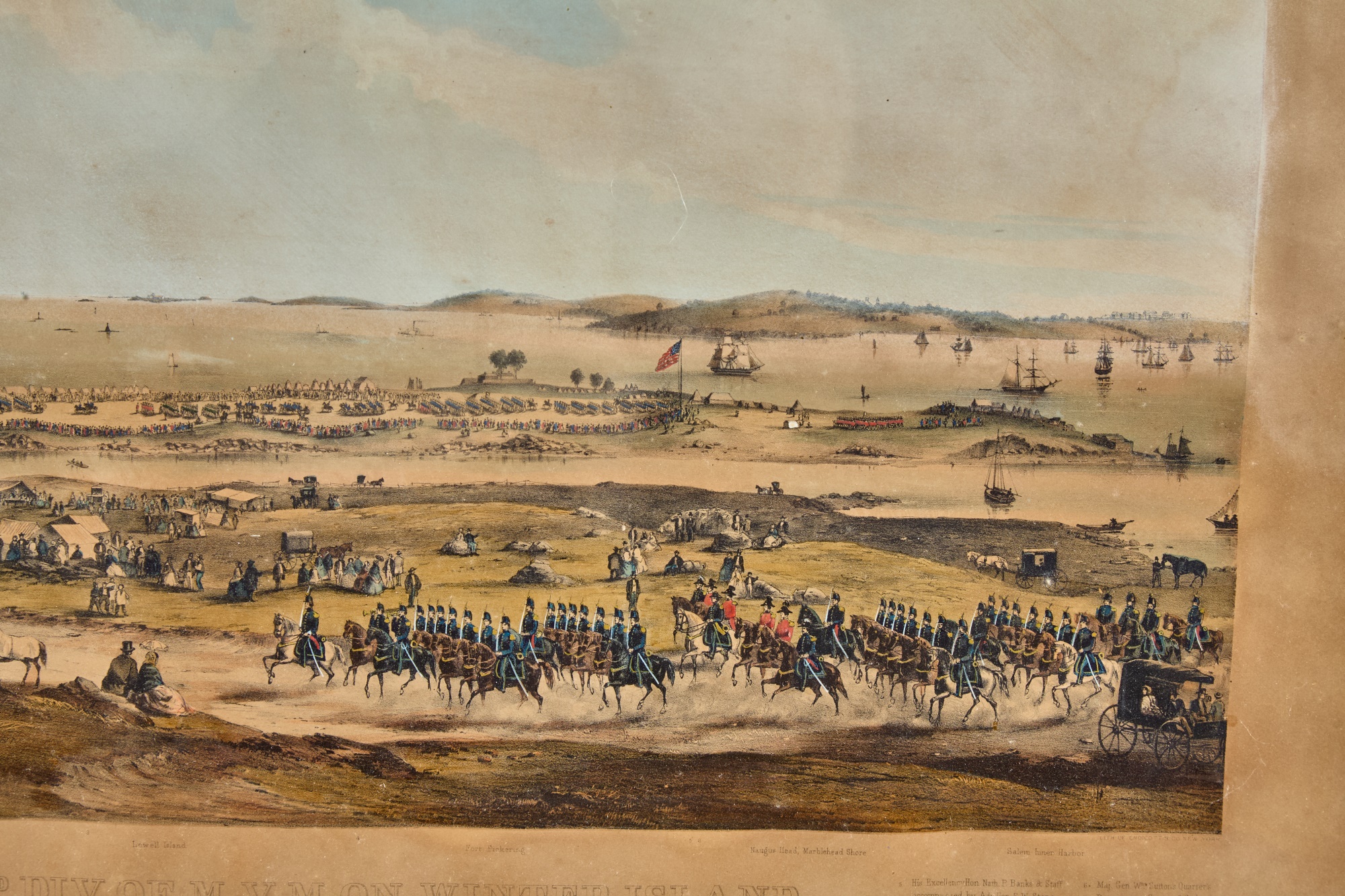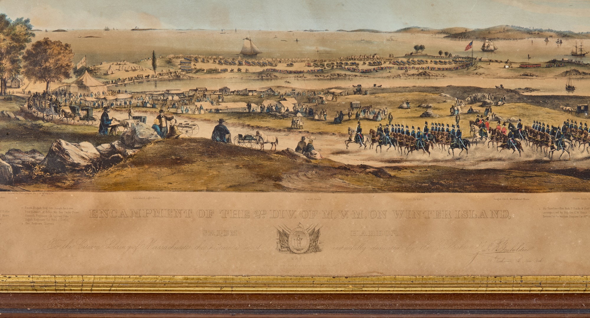 "August 25th, 26th & 27th, 1858. Encampment of the 2d. Div. of M. V. M. on Winter Island, Salem Harbor" Colored lithograph. Housed in walnut frame. 28 1/4 x 39 inches. Provenance: by direct decent of the family of George M. Dallas, Vice President under James K. Polk.