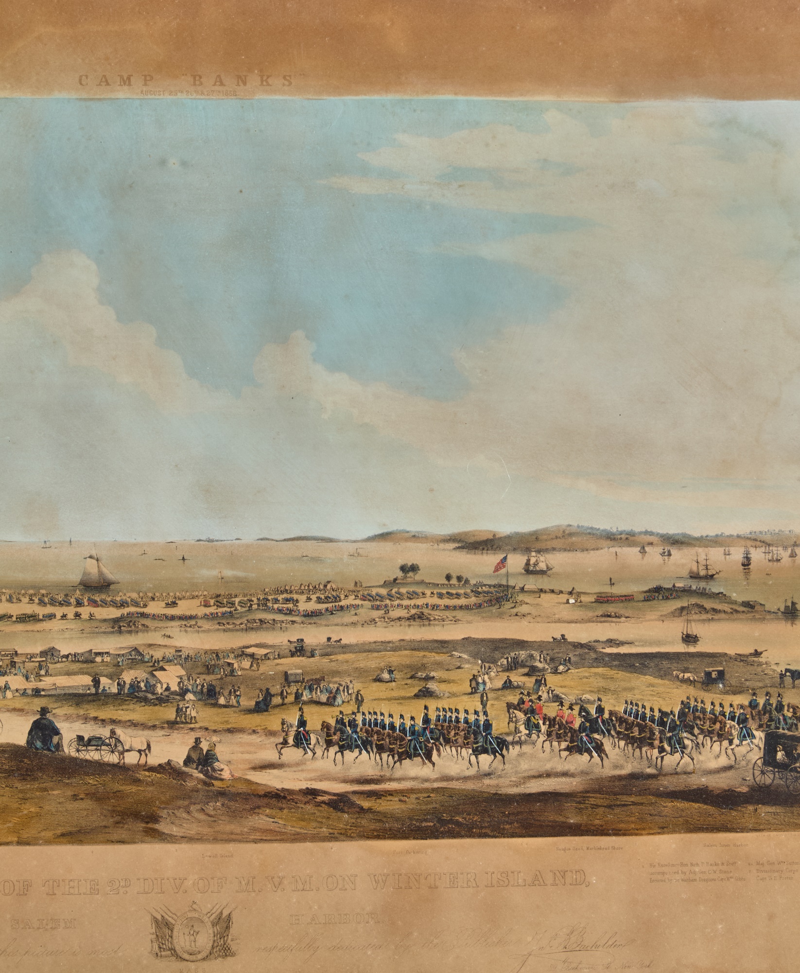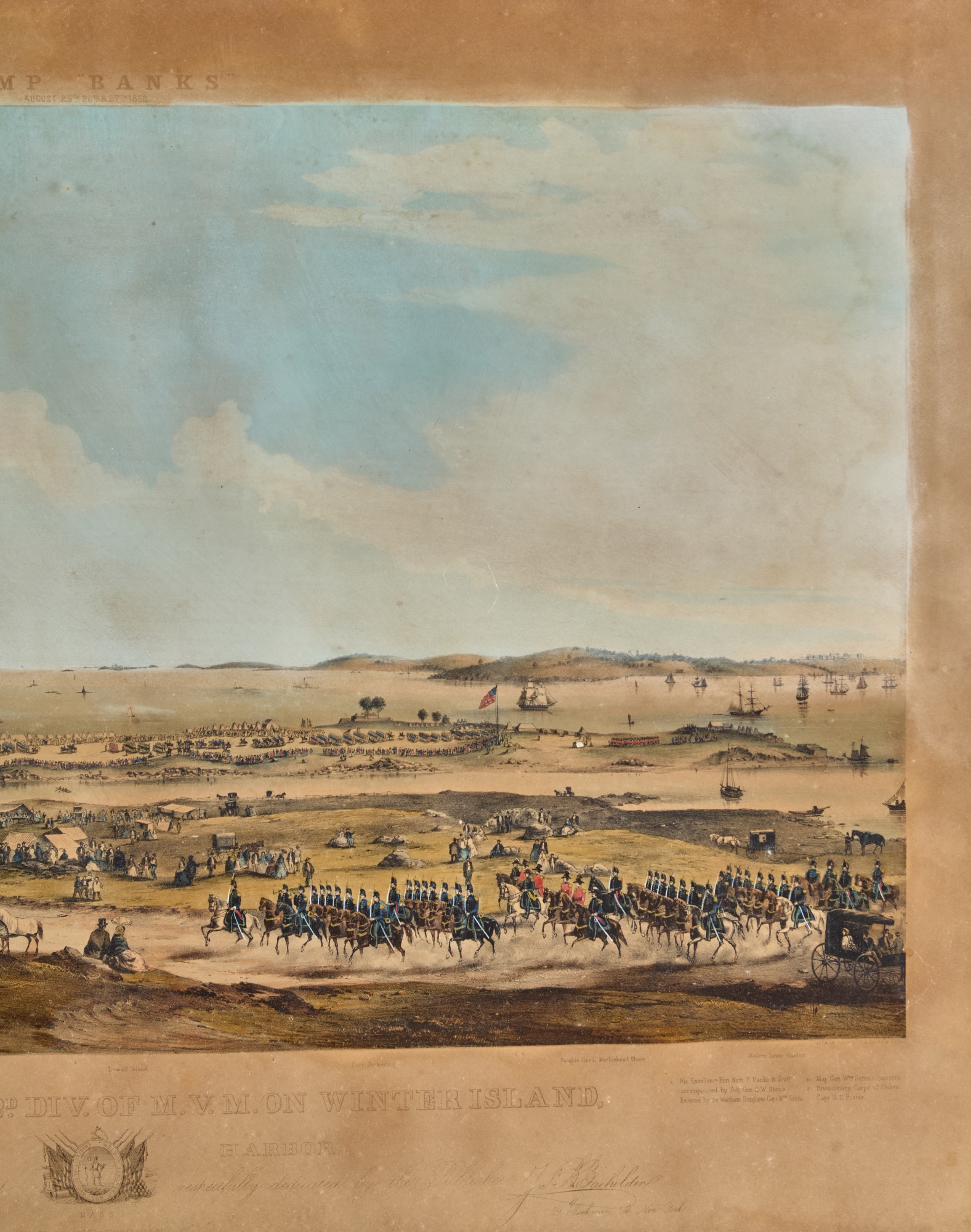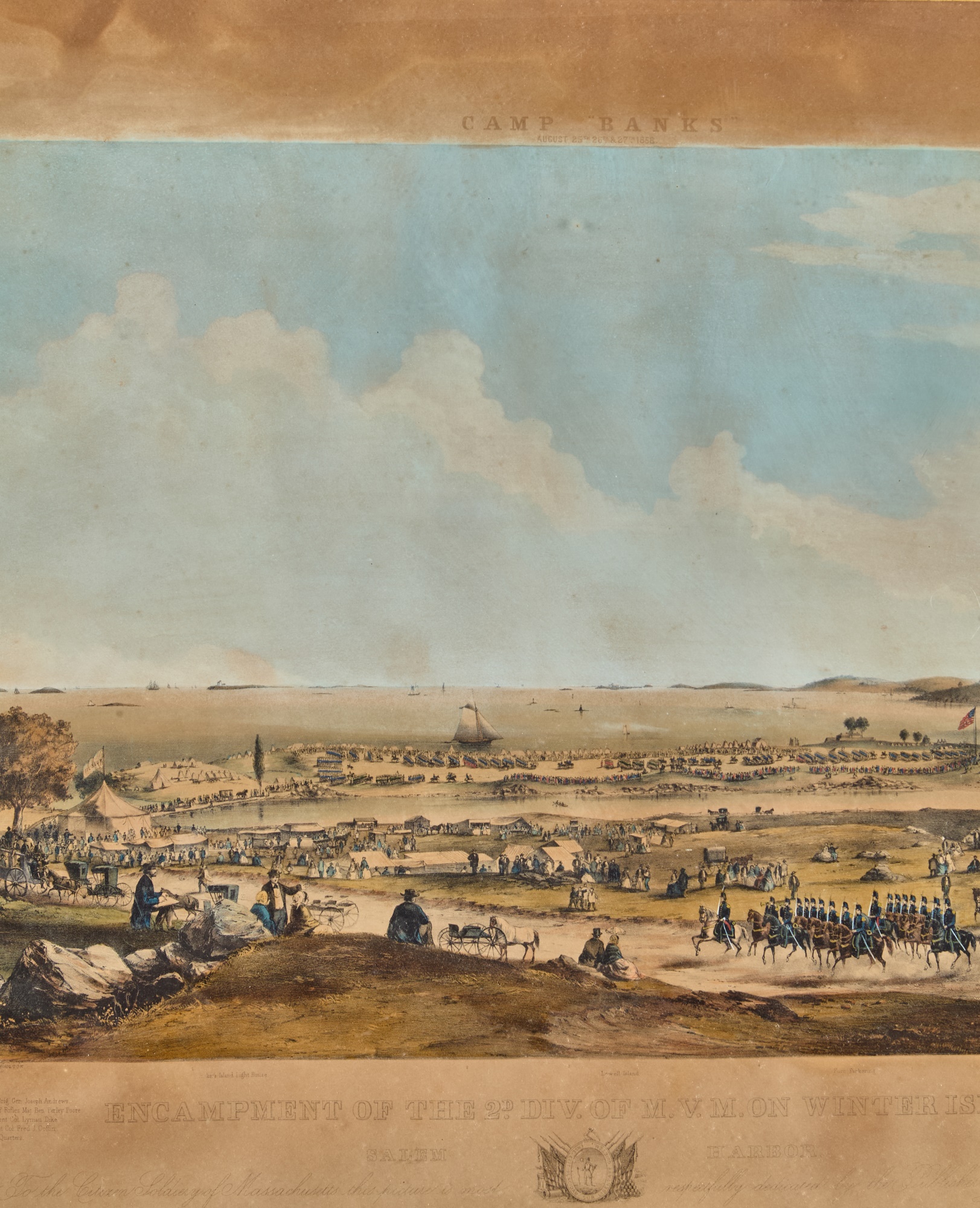 "August 25th, 26th & 27th, 1858. Encampment of the 2d. Div. of M. V. M. on Winter Island, Salem Harbor" Colored lithograph. Housed in walnut frame. 28 1/4 x 39 inches. Provenance: by direct decent of the family of George M. Dallas, Vice President under James K. Polk.