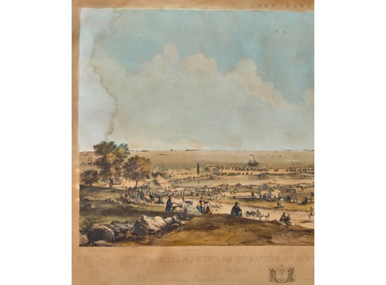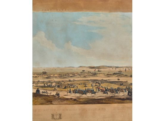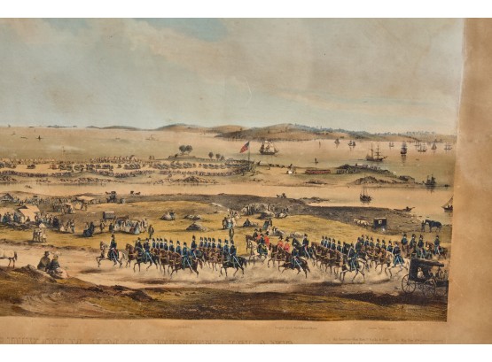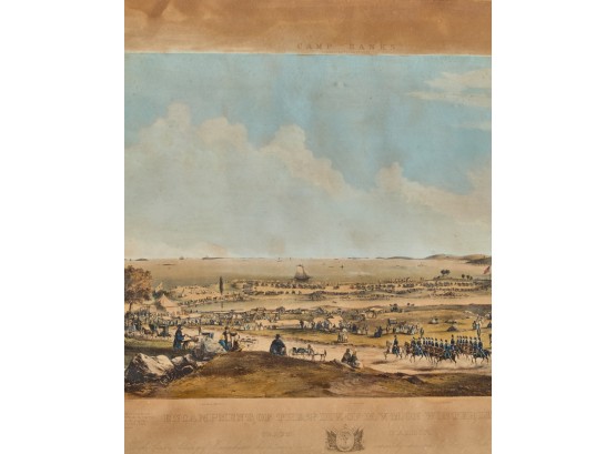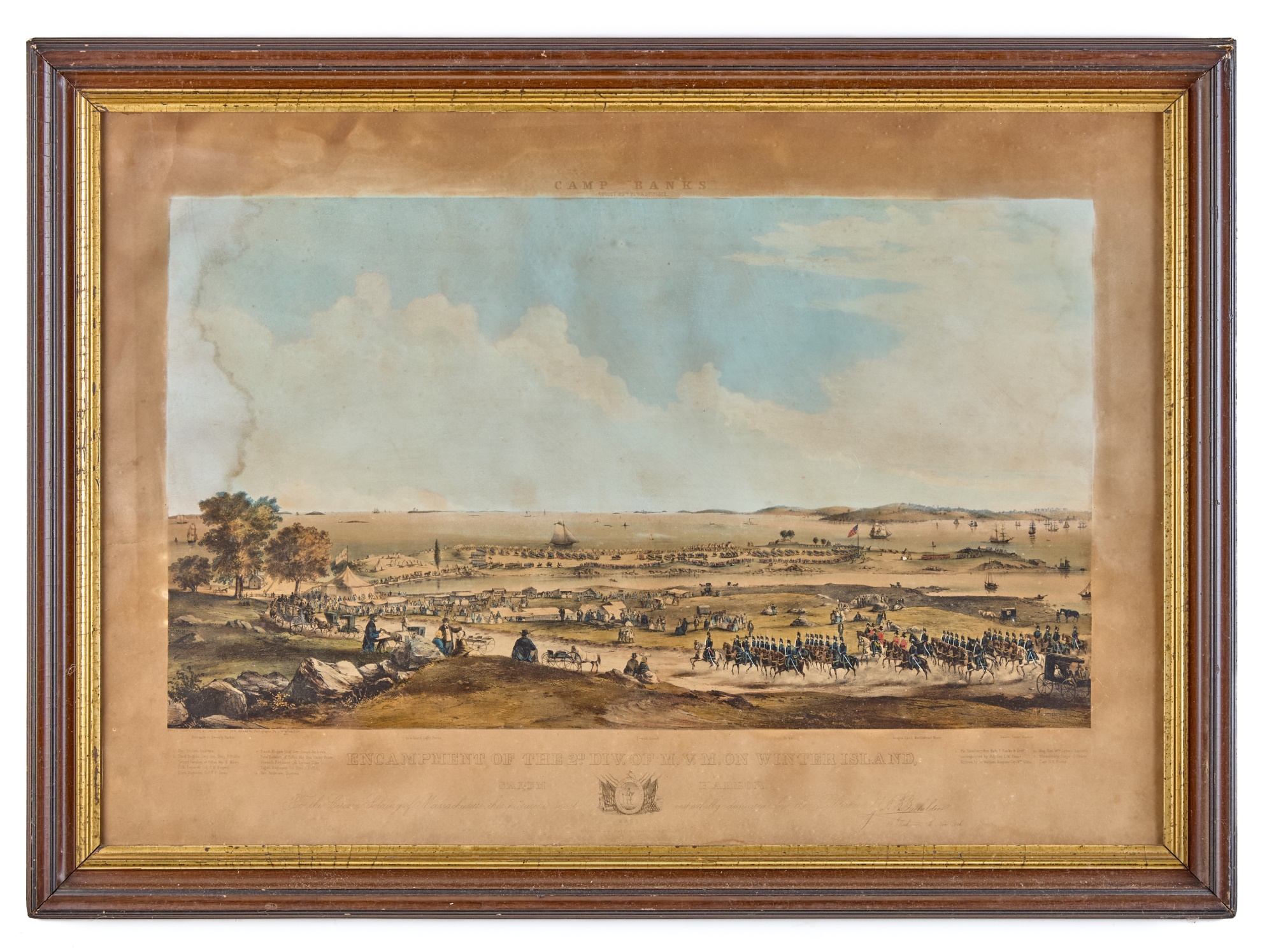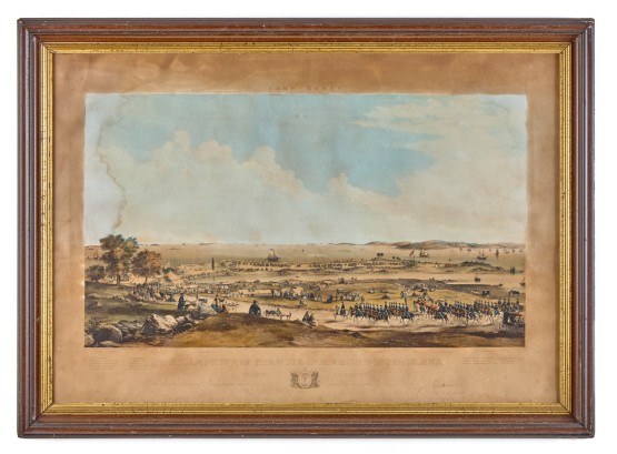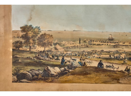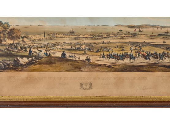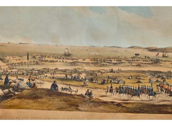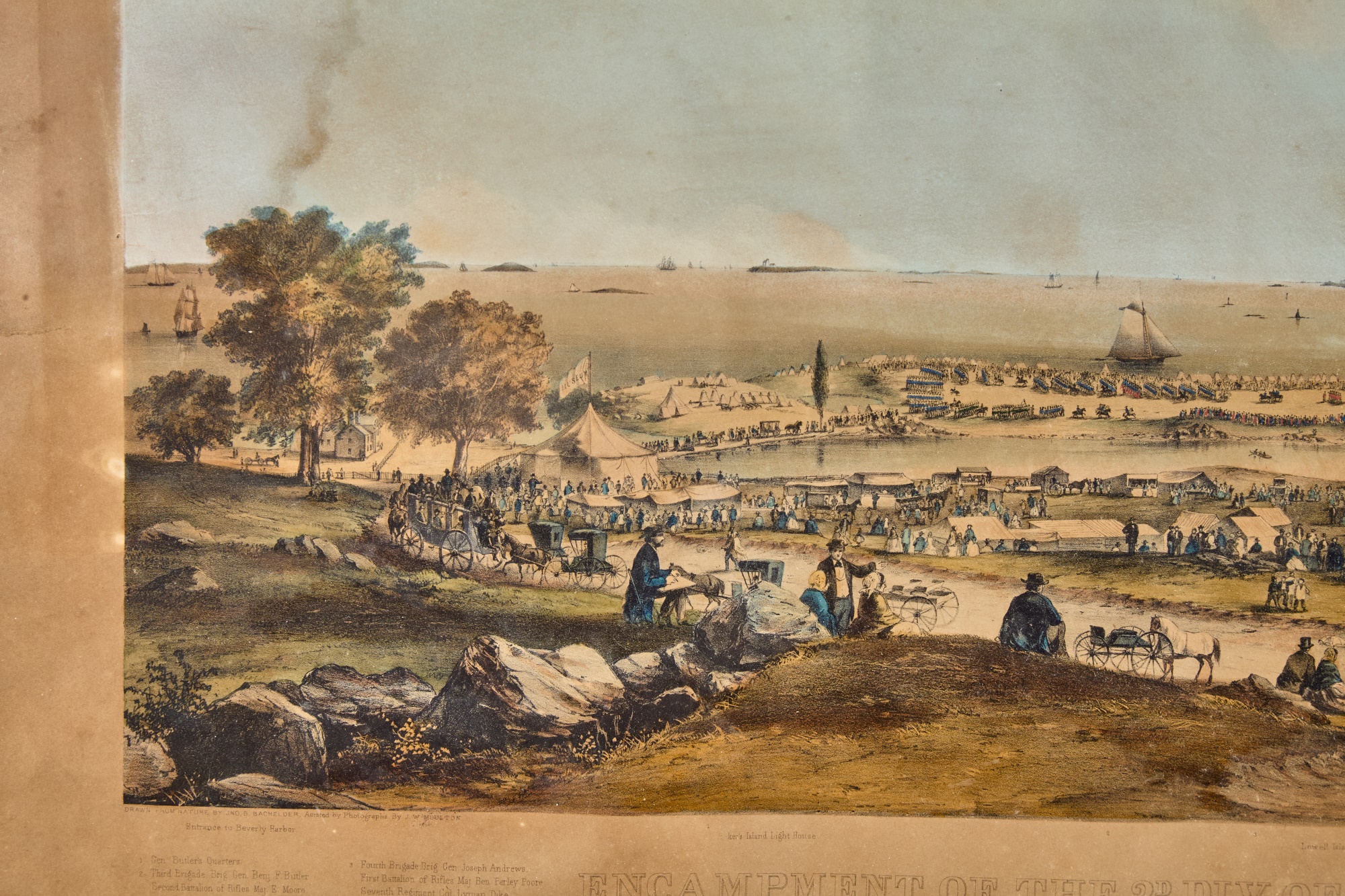 "August 25th, 26th & 27th, 1858. Encampment of the 2d. Div. of M. V. M. on Winter Island, Salem Harbor" Colored lithograph. Housed in walnut frame. 28 1/4 x 39 inches. Provenance: by direct decent of the family of George M. Dallas, Vice President under James K. Polk.