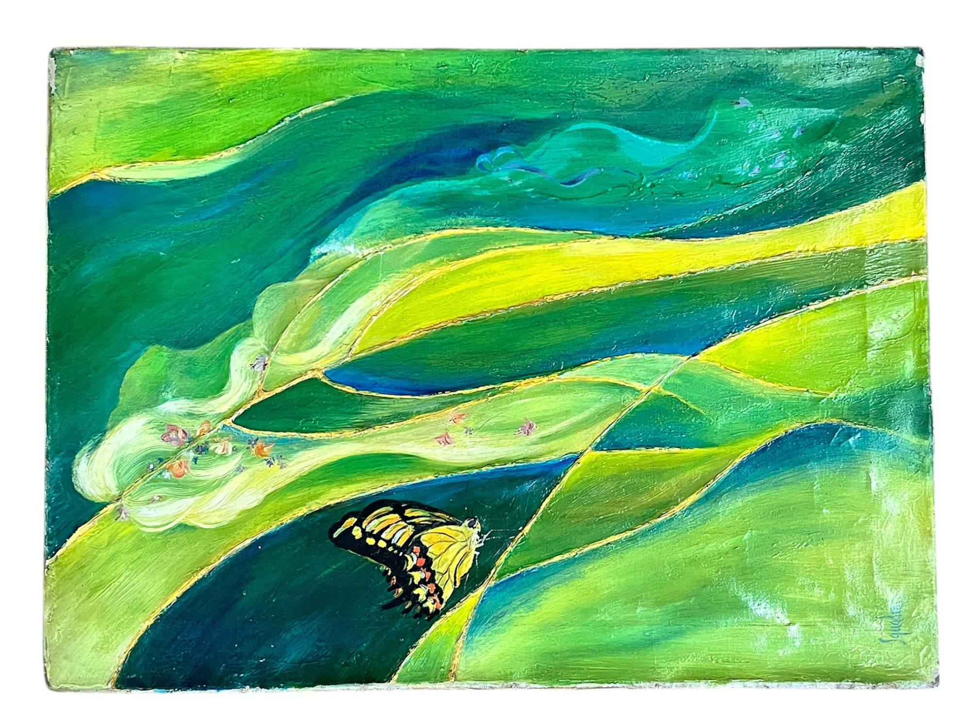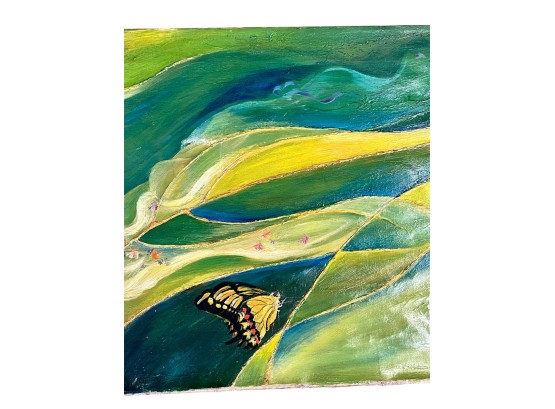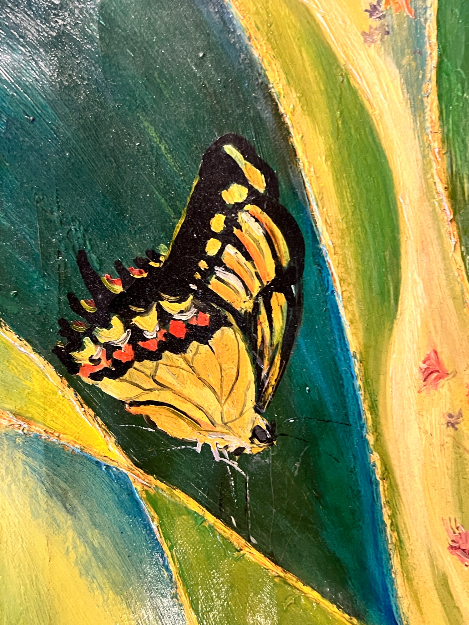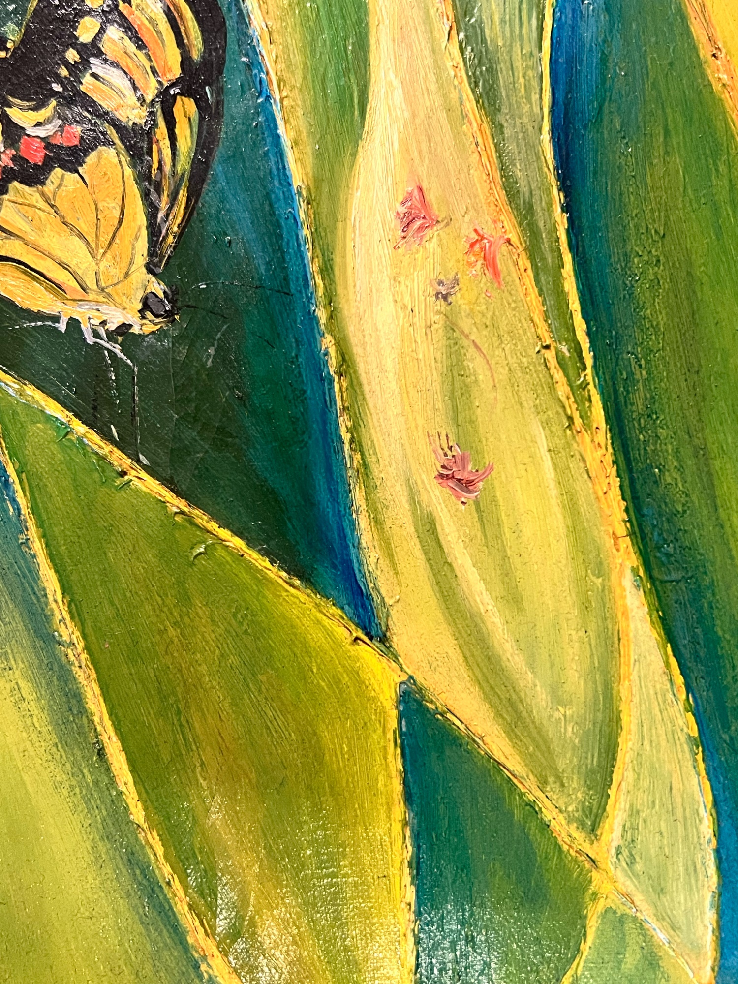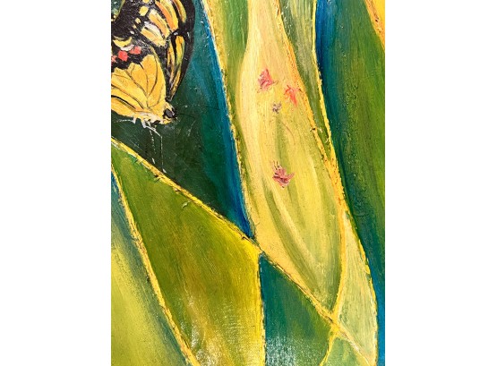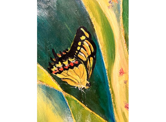 (Butterfly on Flower) oil on canvas 22 x 16 inches. signed Condition: Good, minor paint loss near edges Temp No 6101