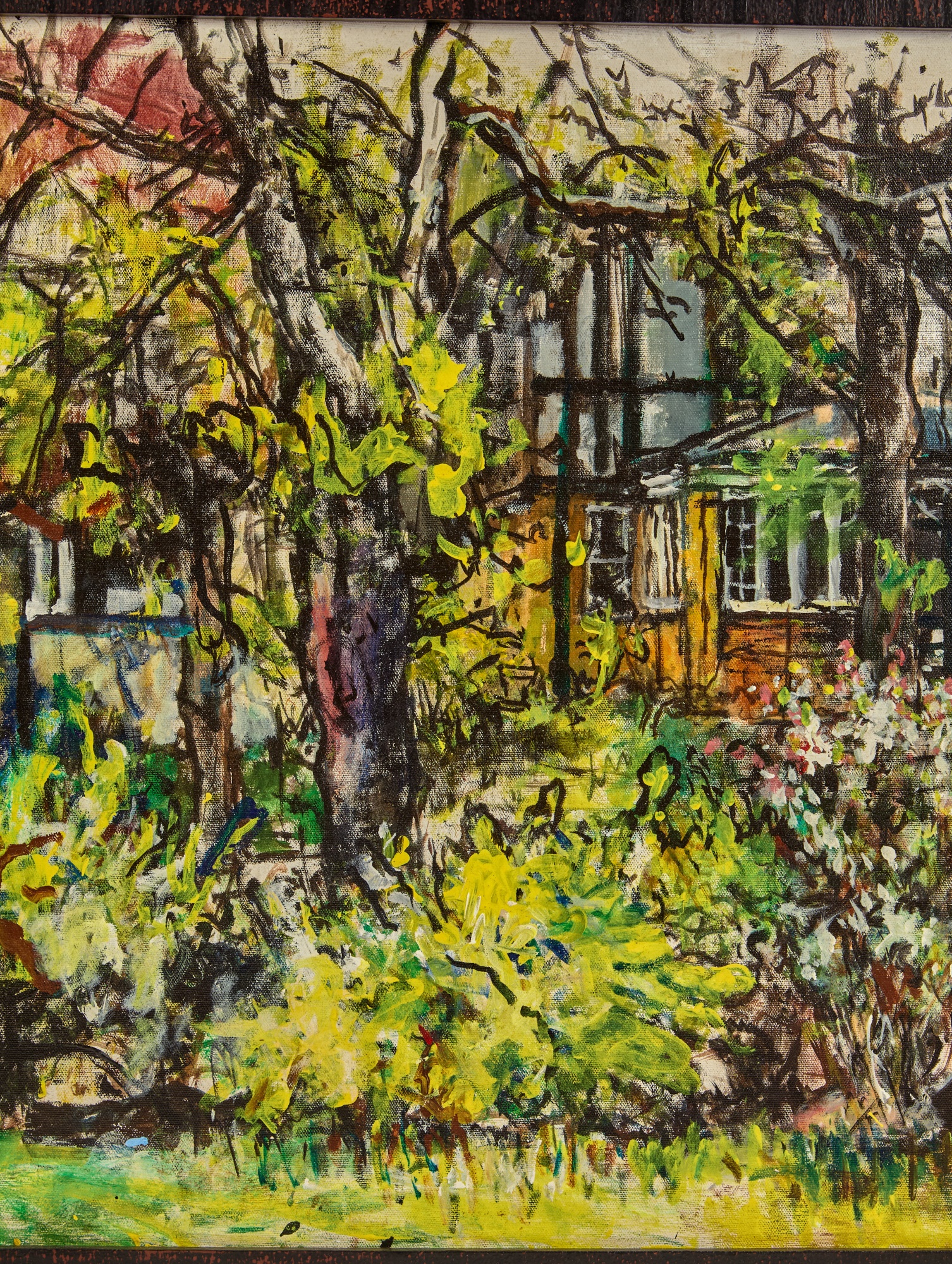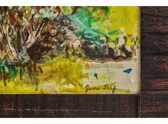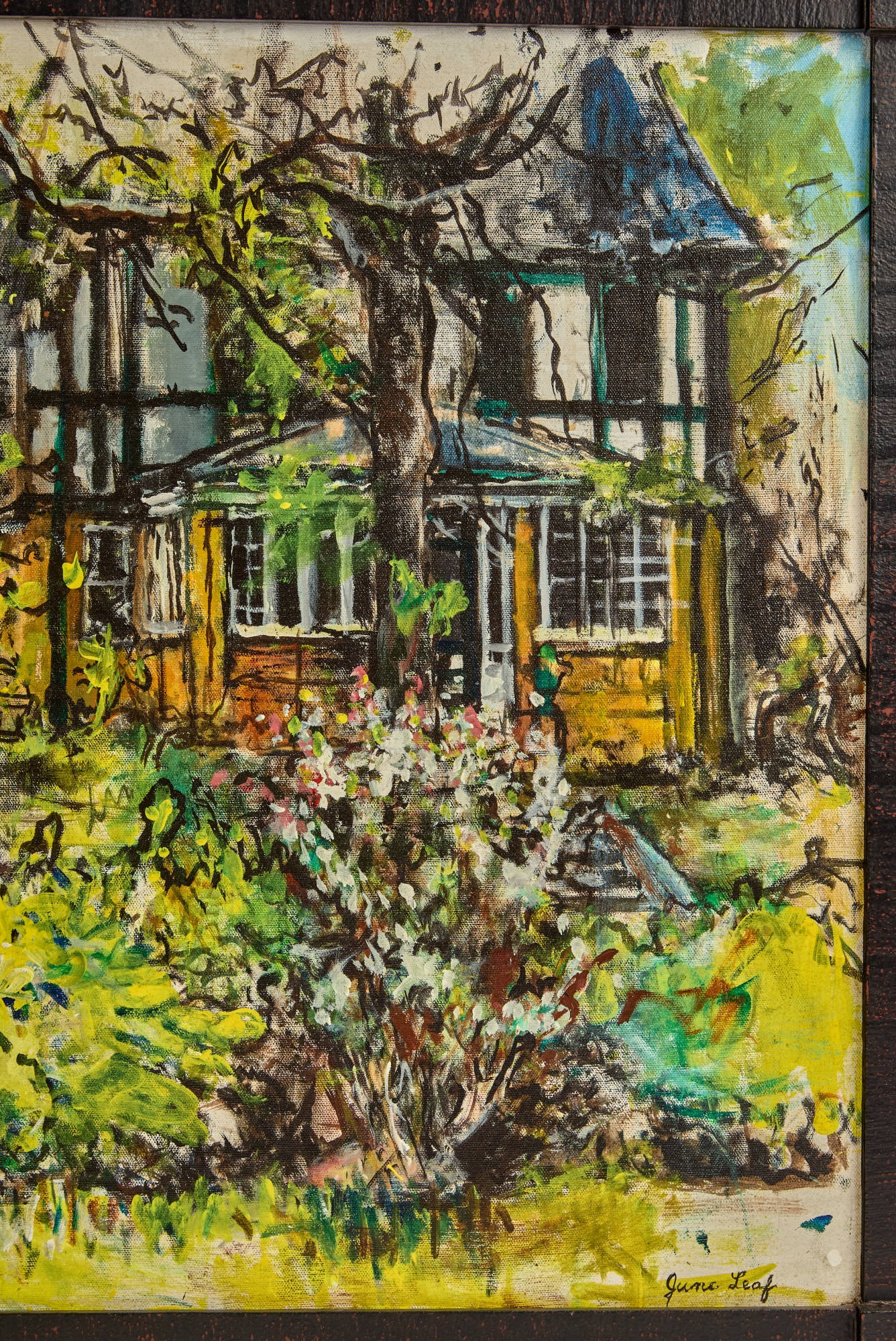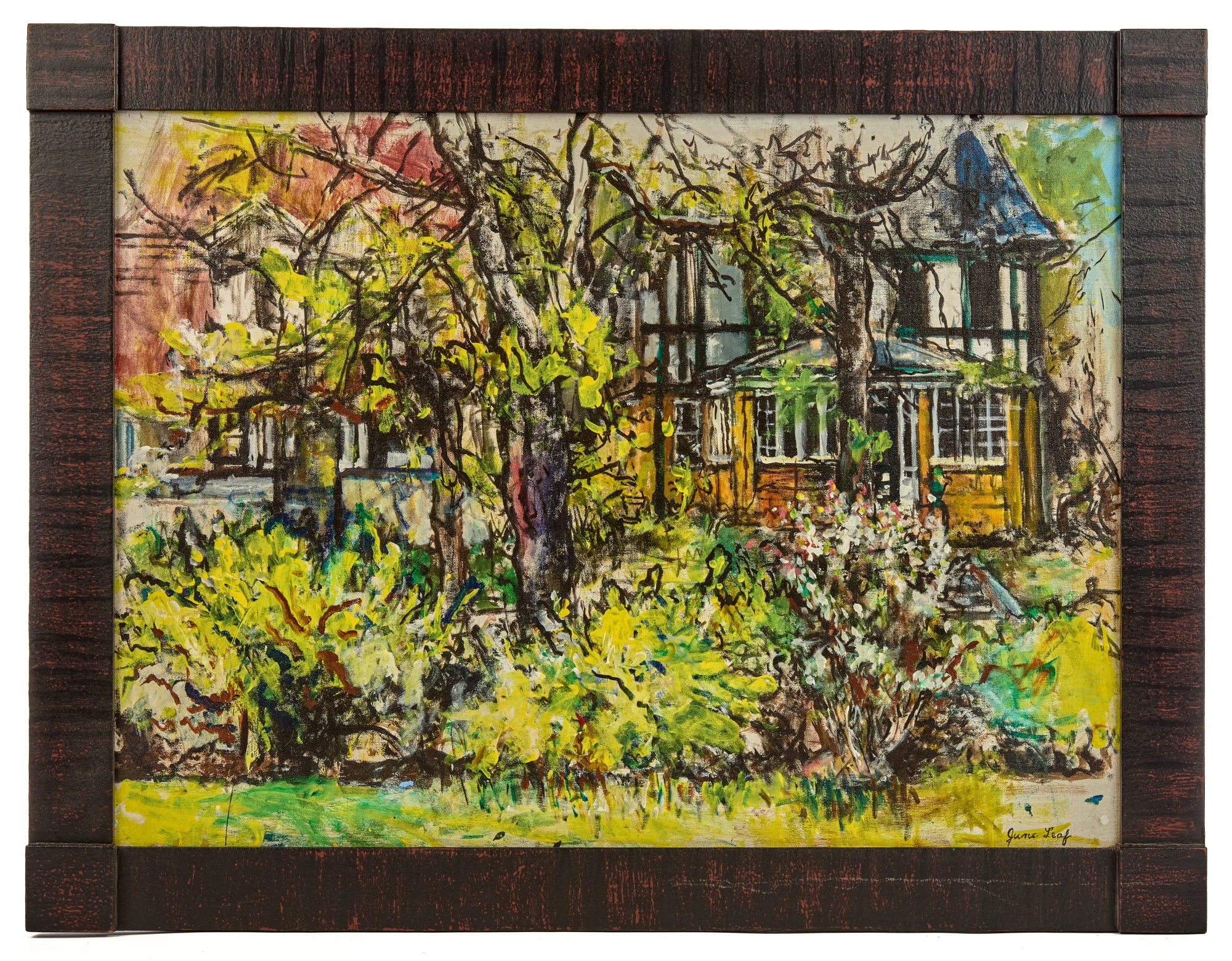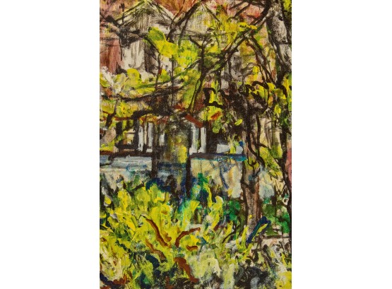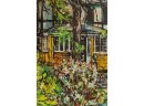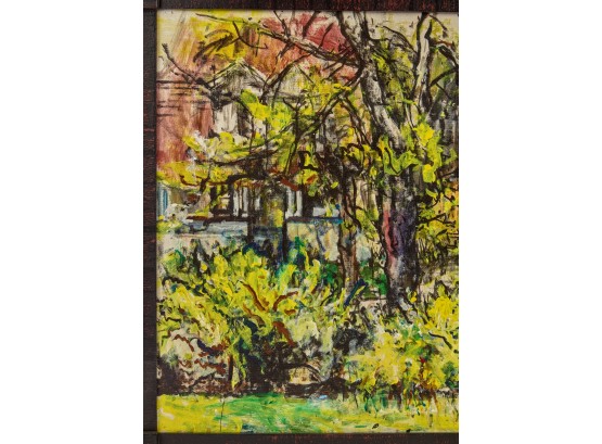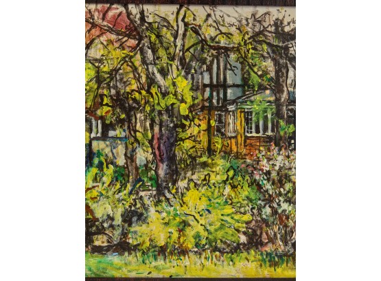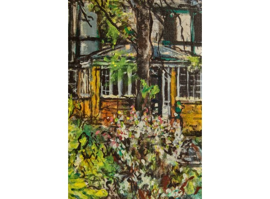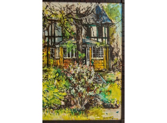 Framed oil on canvas of a cottage exterior signed lower right. 26 5/8" x 34 5/8" framed Condition: Good Temp No 2350