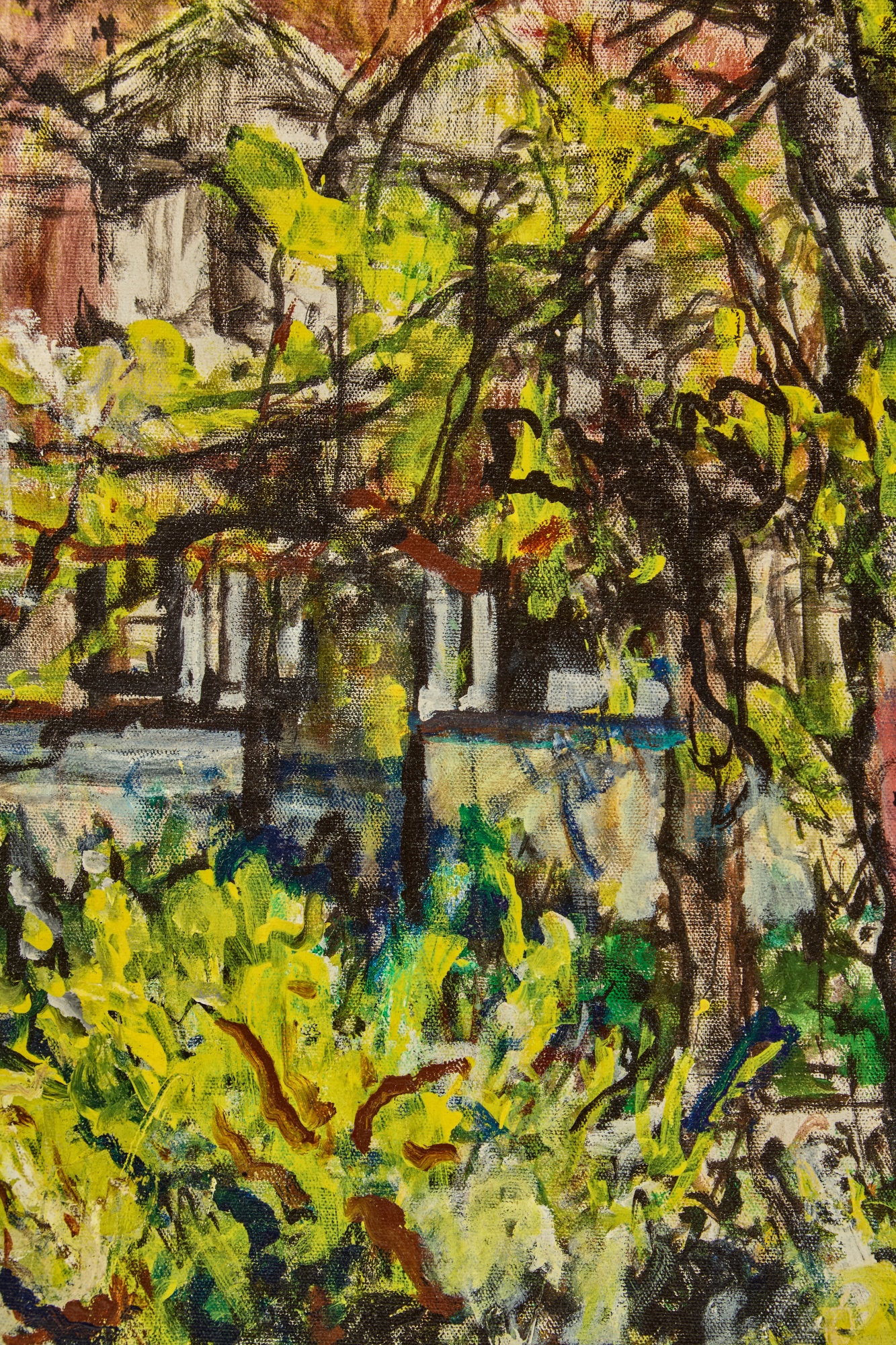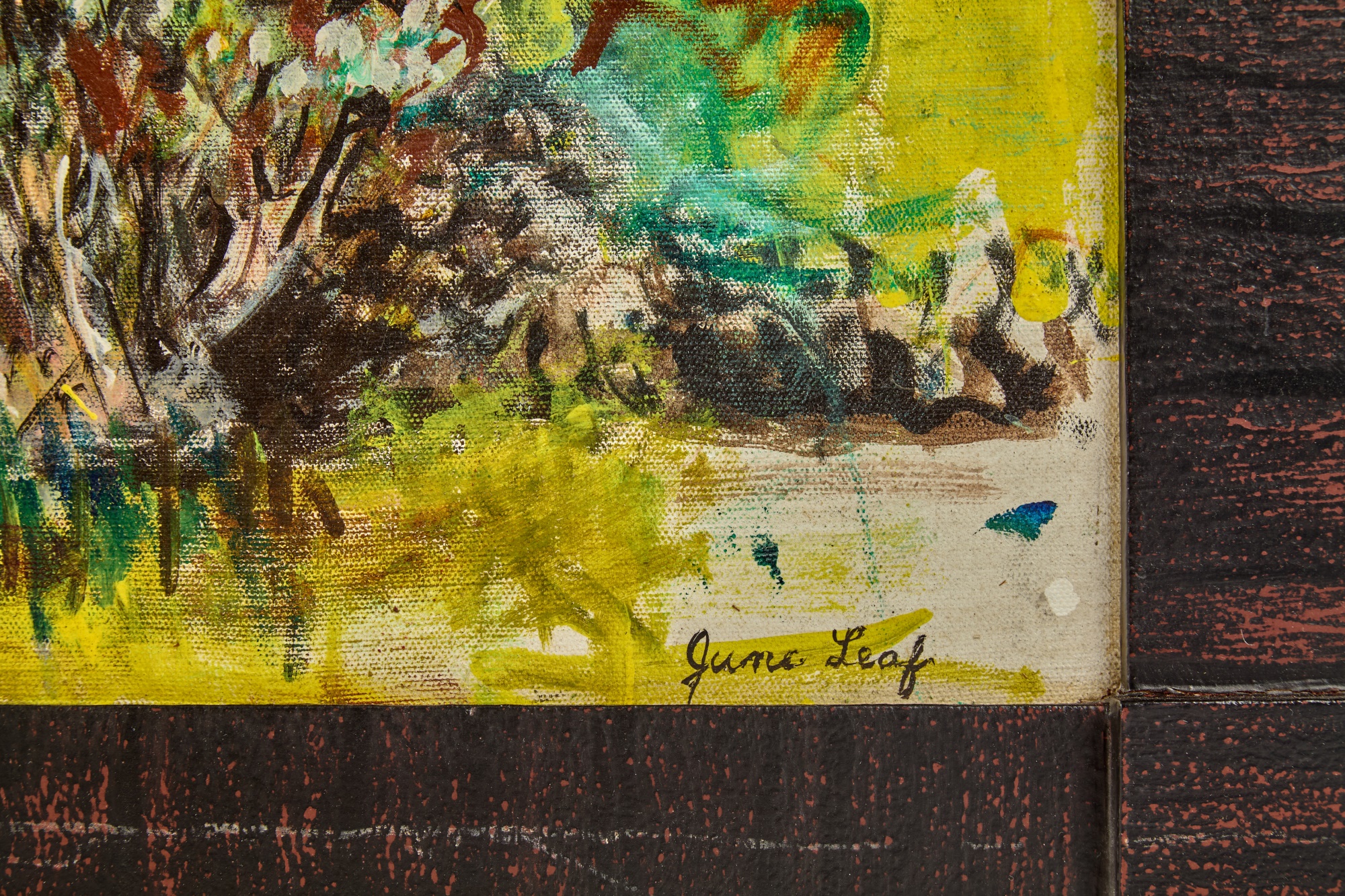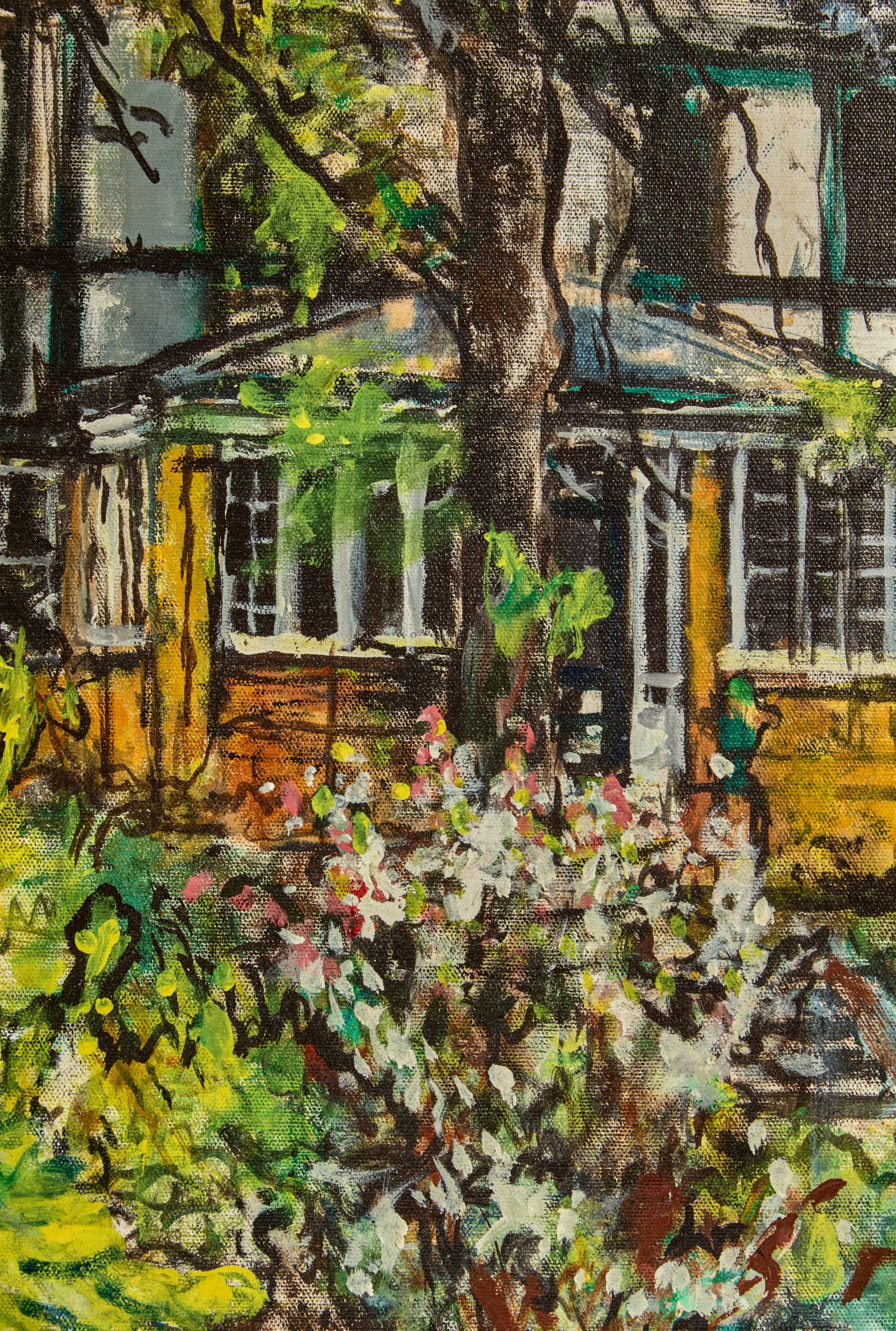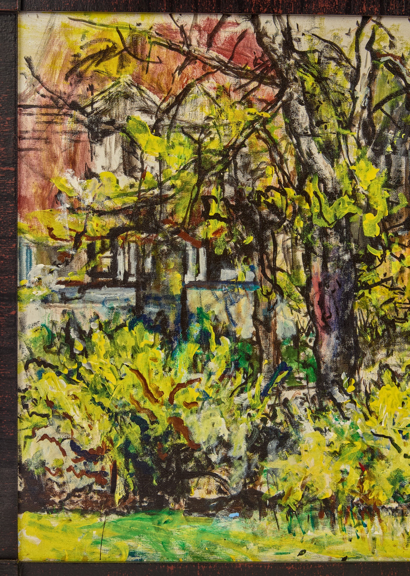 Framed oil on canvas of a cottage exterior signed lower right. 26 5/8" x 34 5/8" framed Condition: Good Temp No 2350