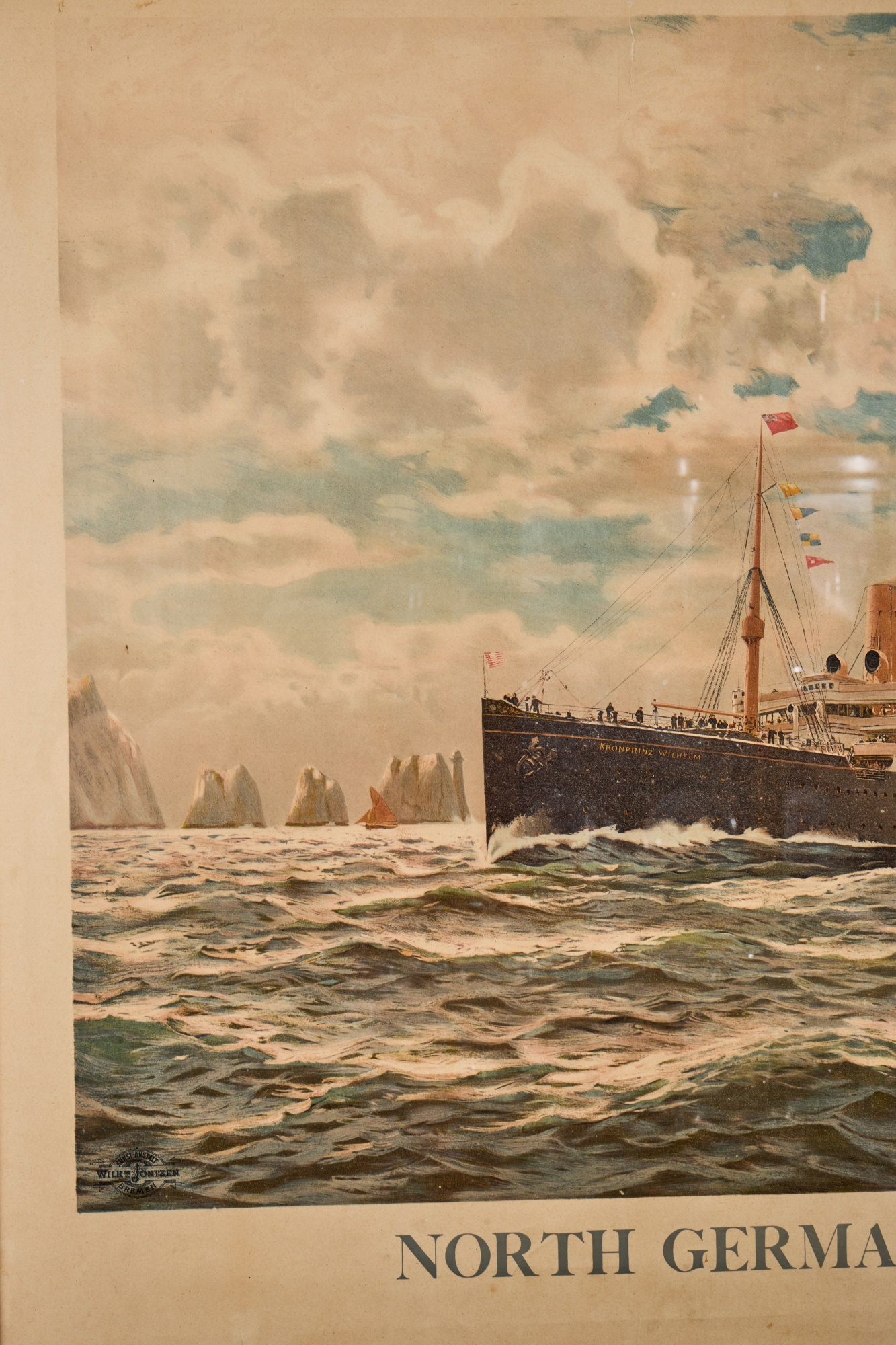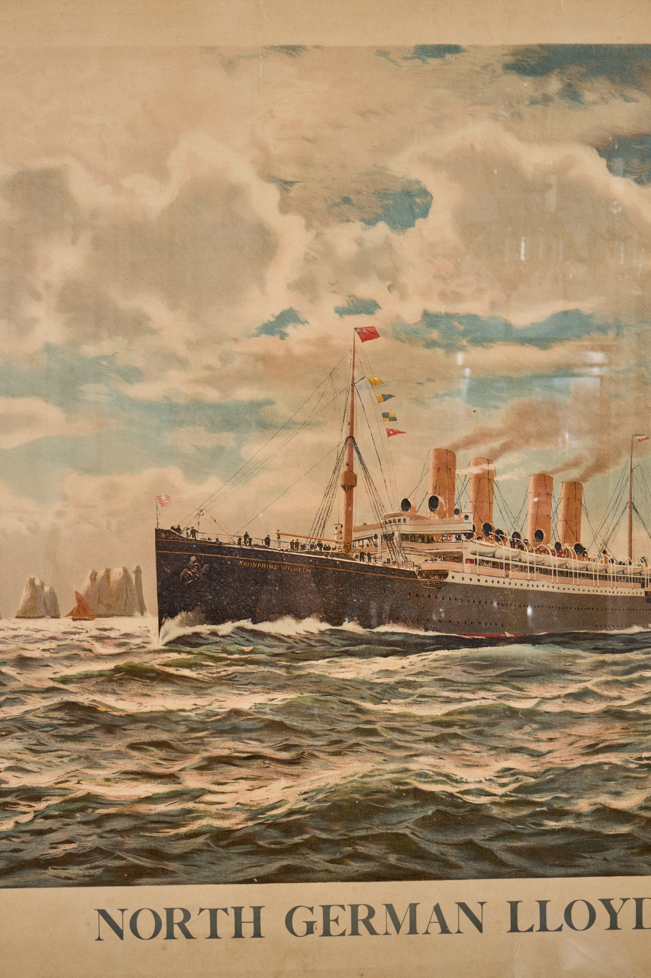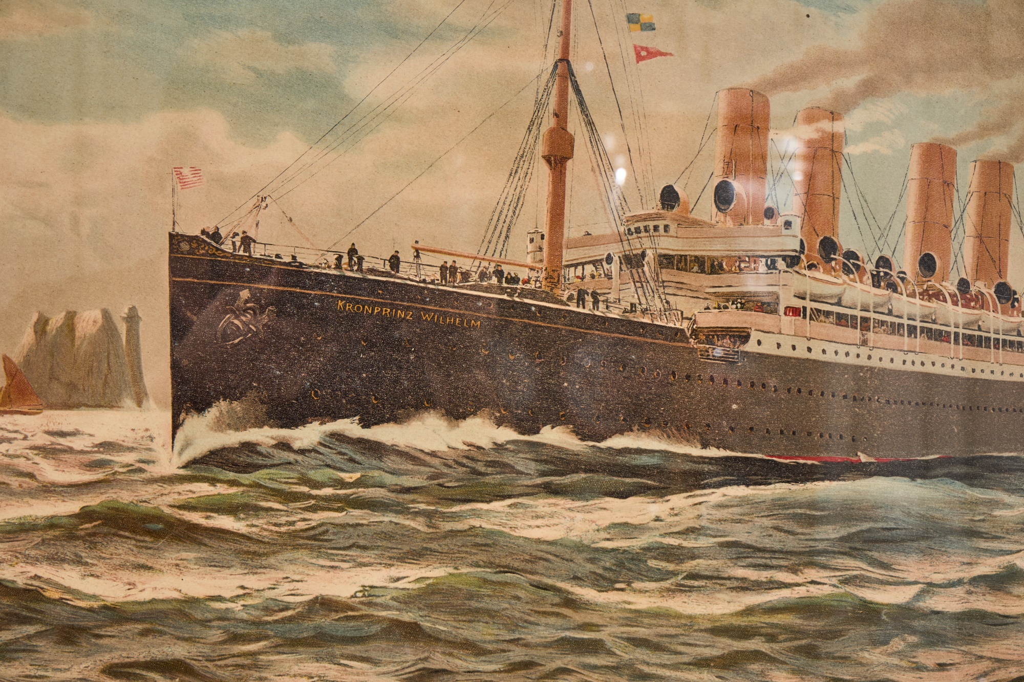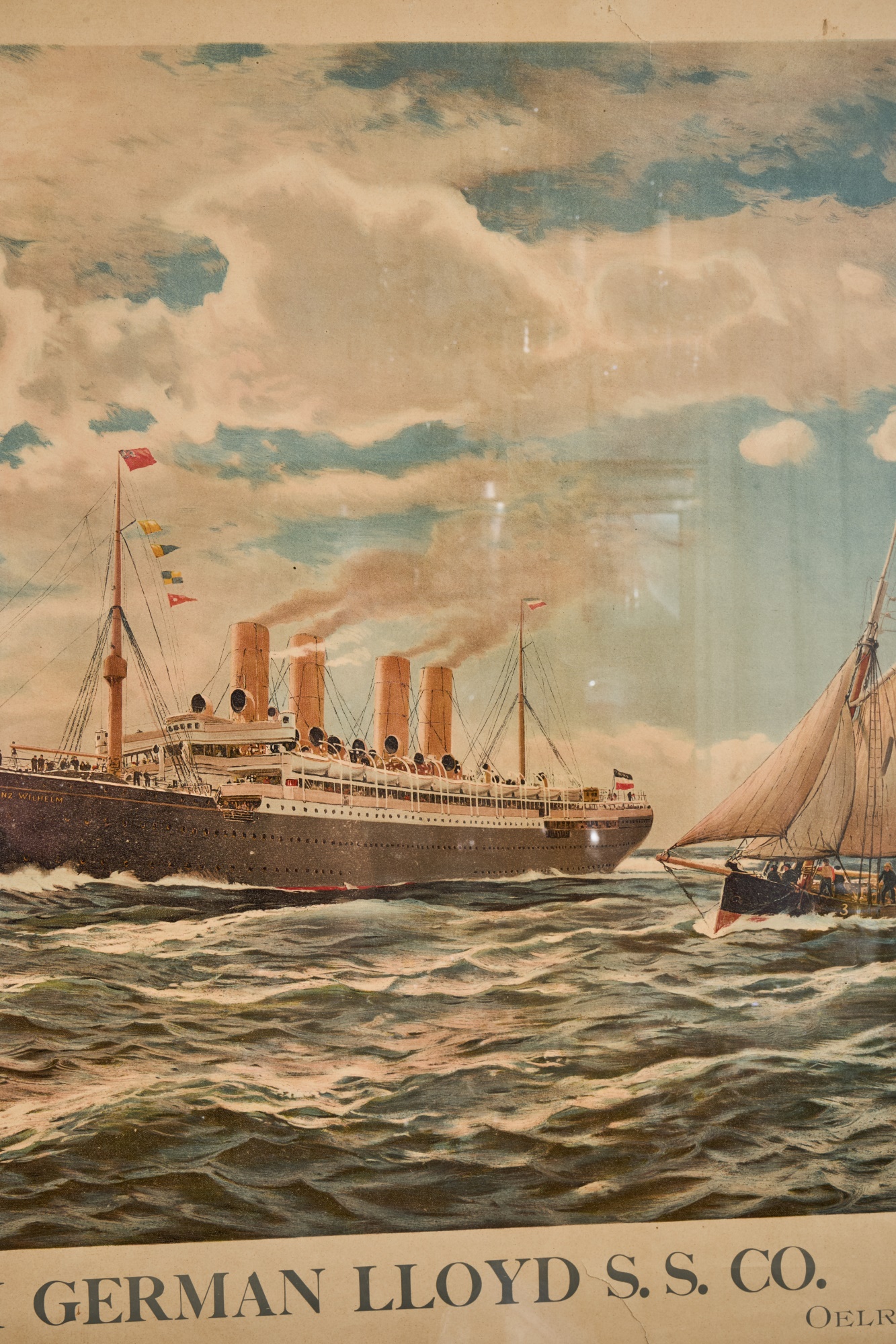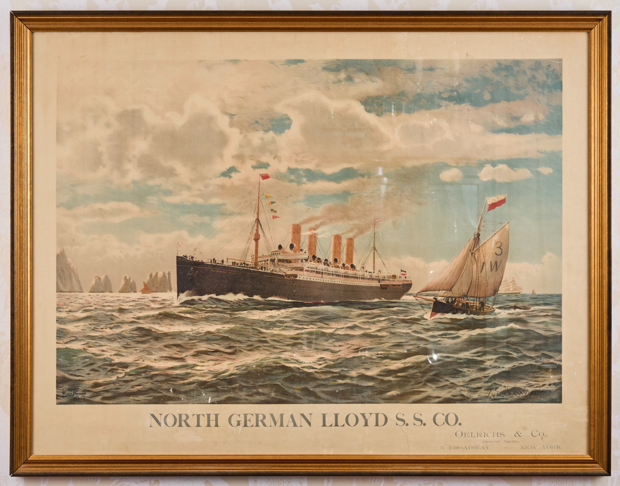 North German Lloyd Steam Ship Co. lithograph by Wilh Jontzen, Breman. 34 x 44 inches (overall including frame). Together with (3) Copies of The Cruise of the Kronprinz Wilhelm by Alfred von Niezychowski, Doubleday 1929 hardcover clothbound.